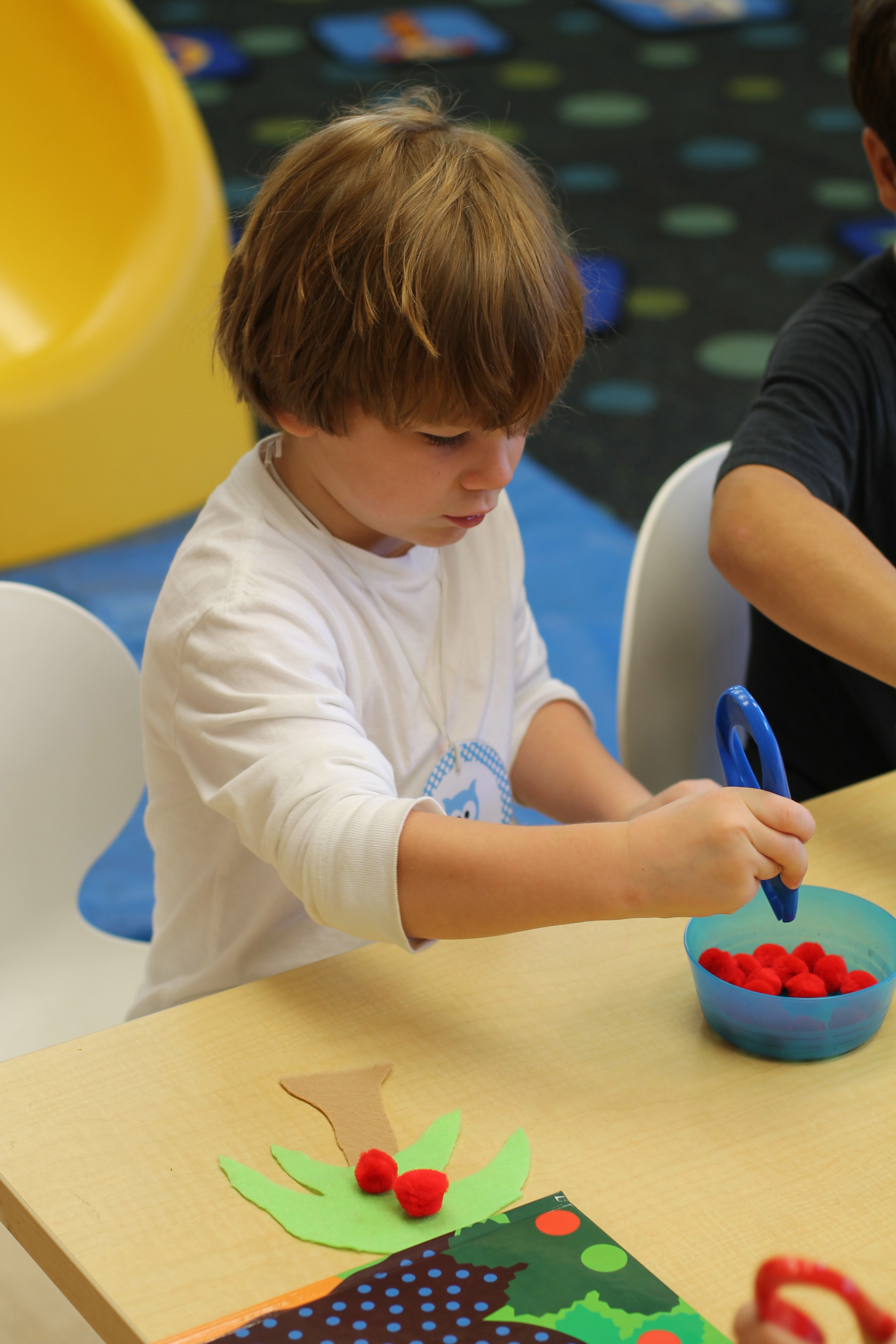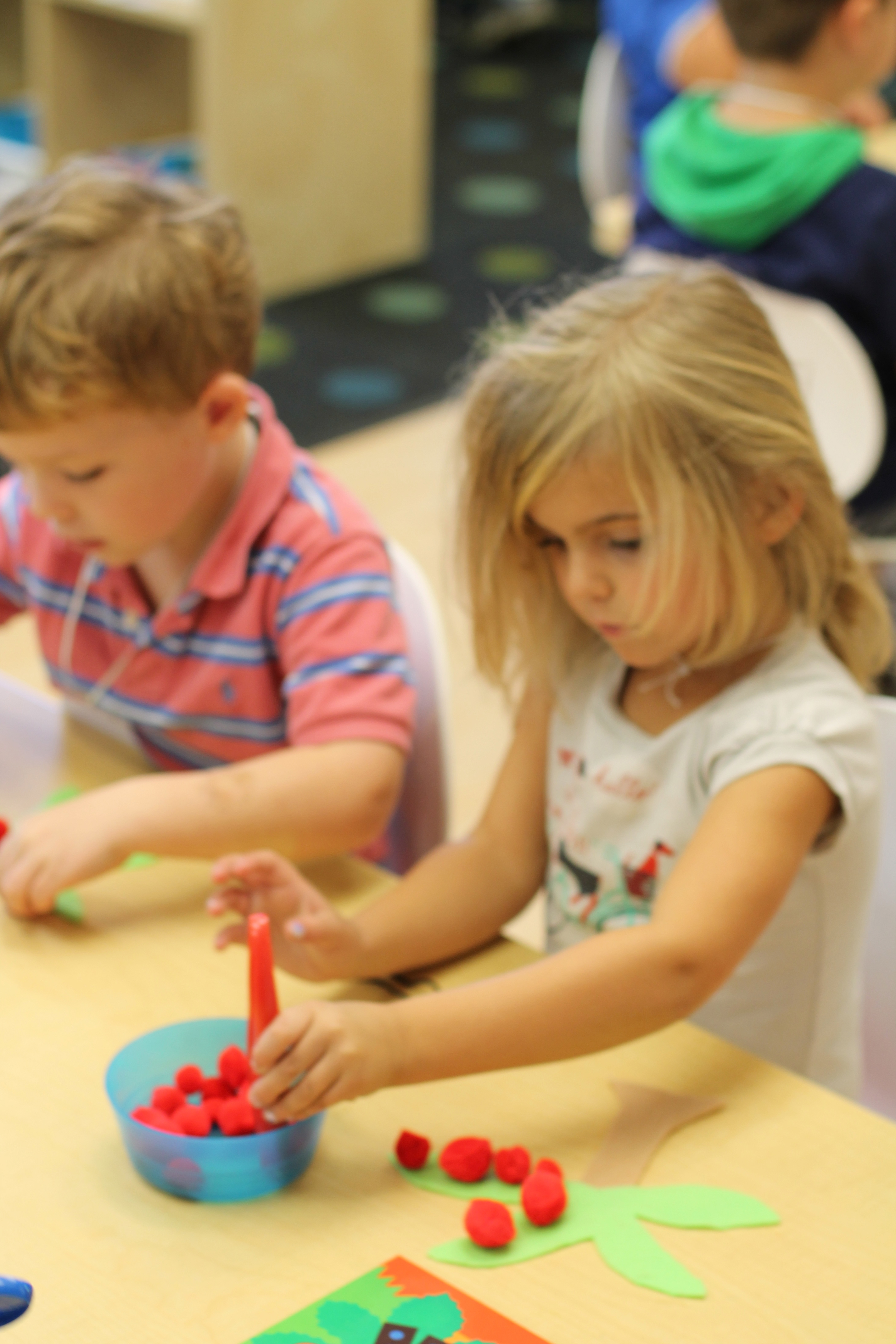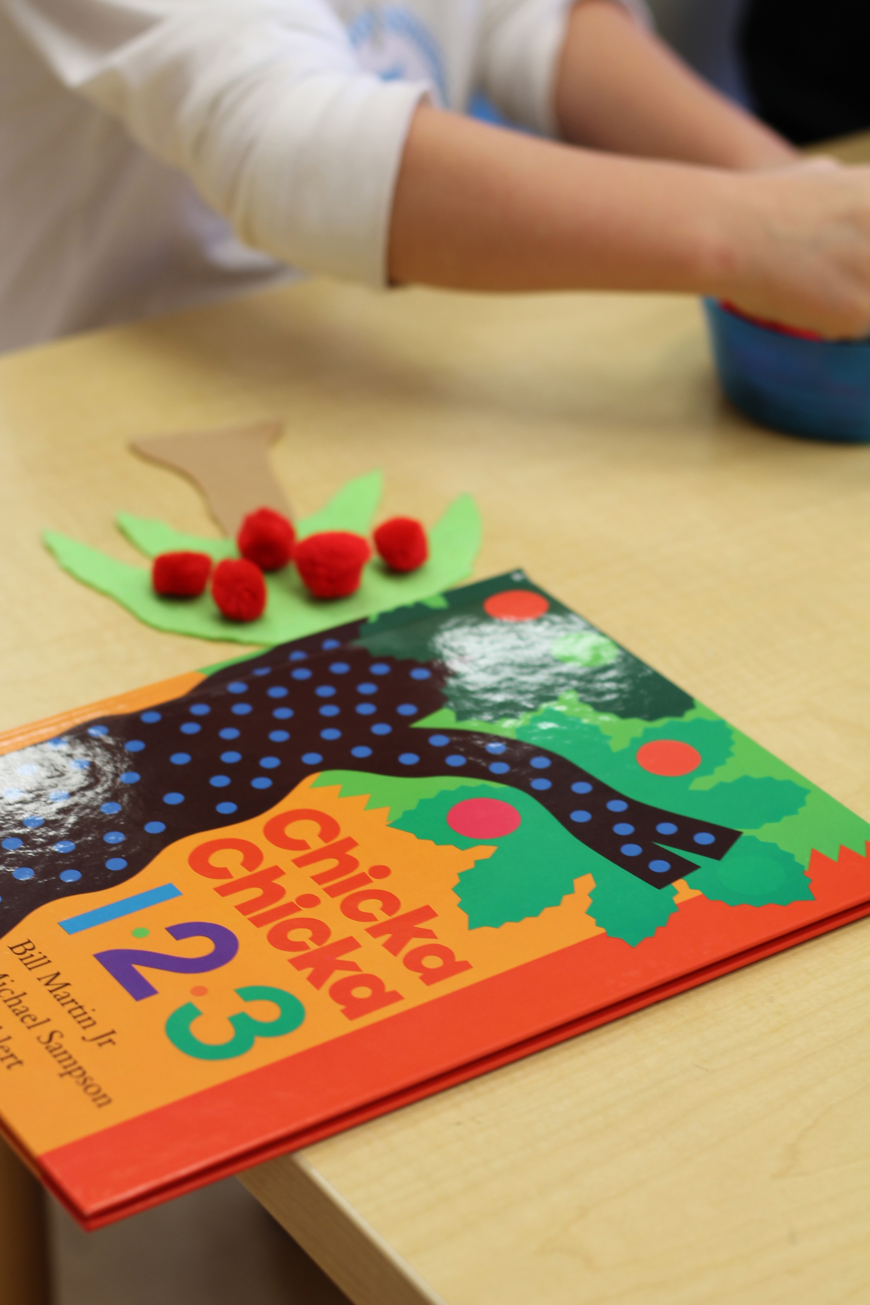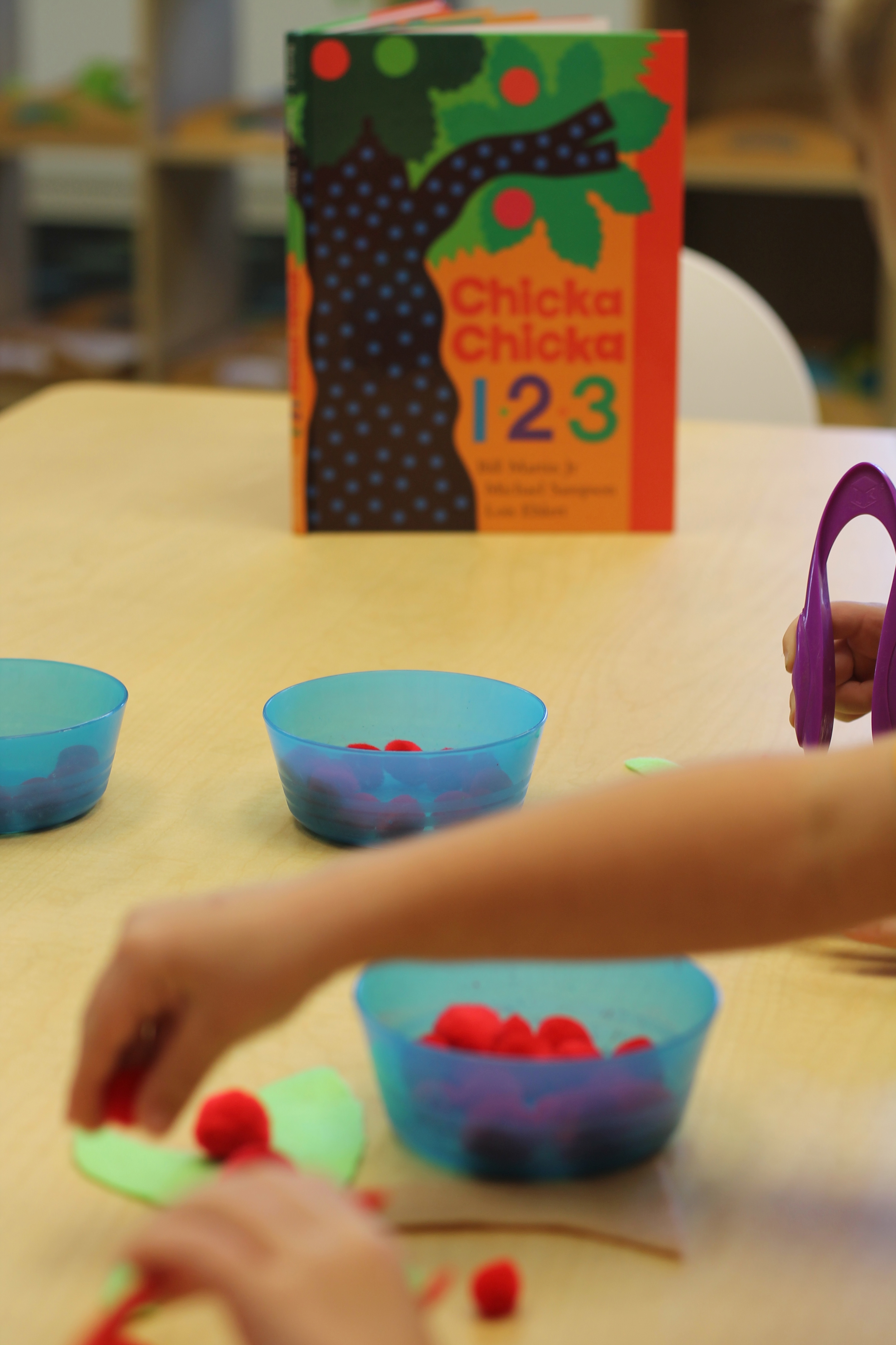 We did a fun math/literacy lesson this week. We read the book, “Chicka, Chicka, 1, 2, 3” as a whole group. The book is about different numbers climbing up an apple tree. It was only fitting that the kids would be able to snack on tasty, sliced apples during the reading! Afterwards, in small groups the students counted certain numbers of “apples” and used tongs to place them onto their felt apple trees! Another good fine motor activity!