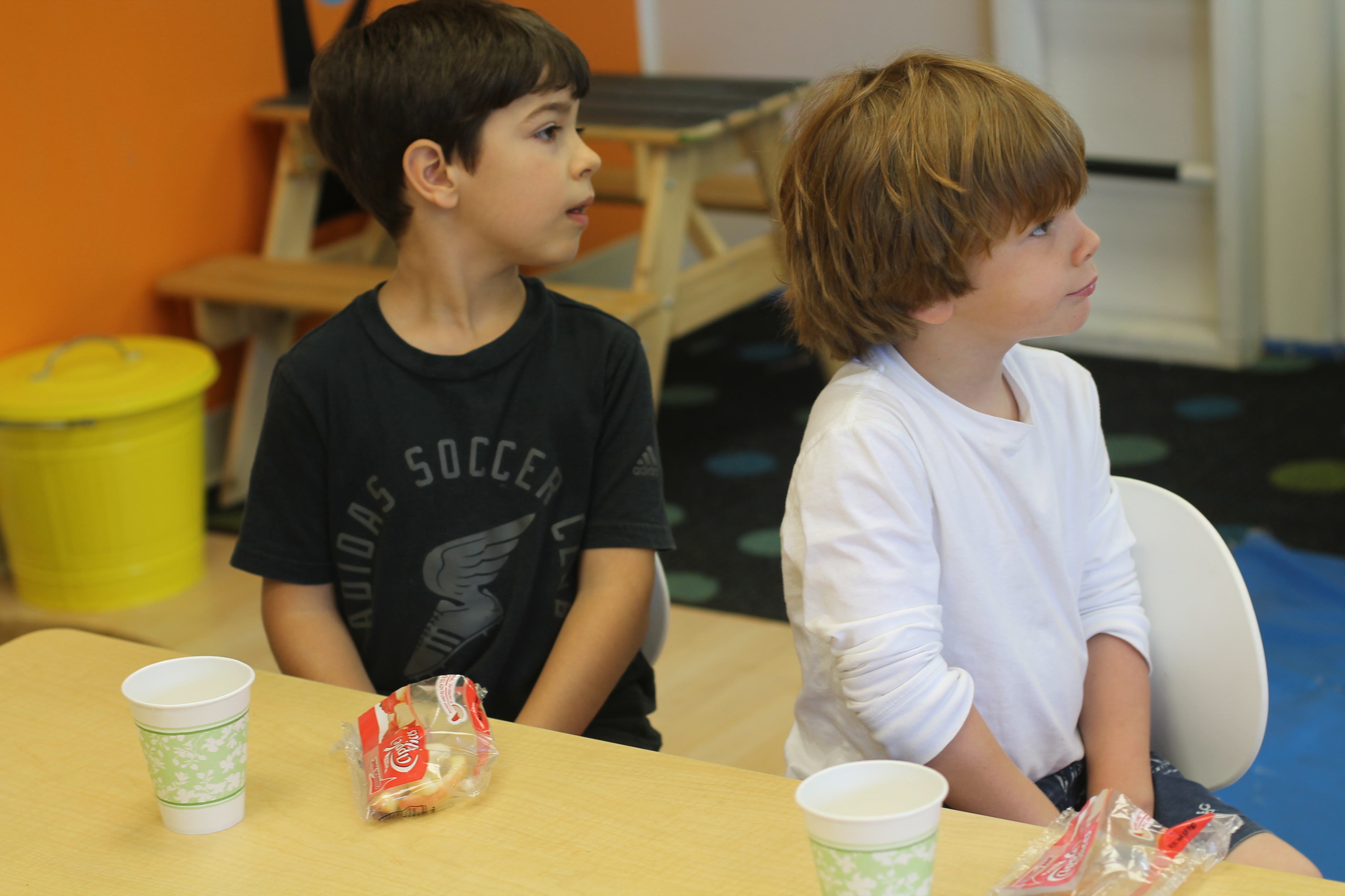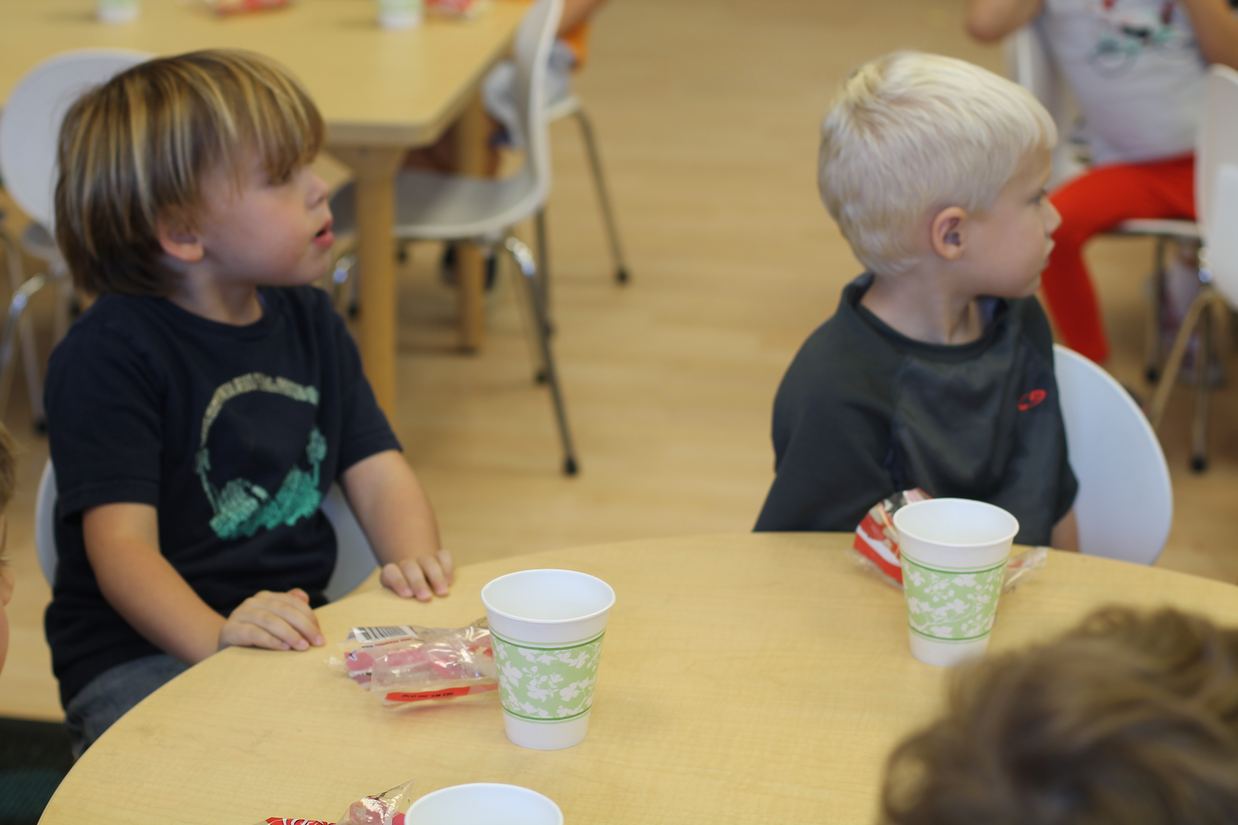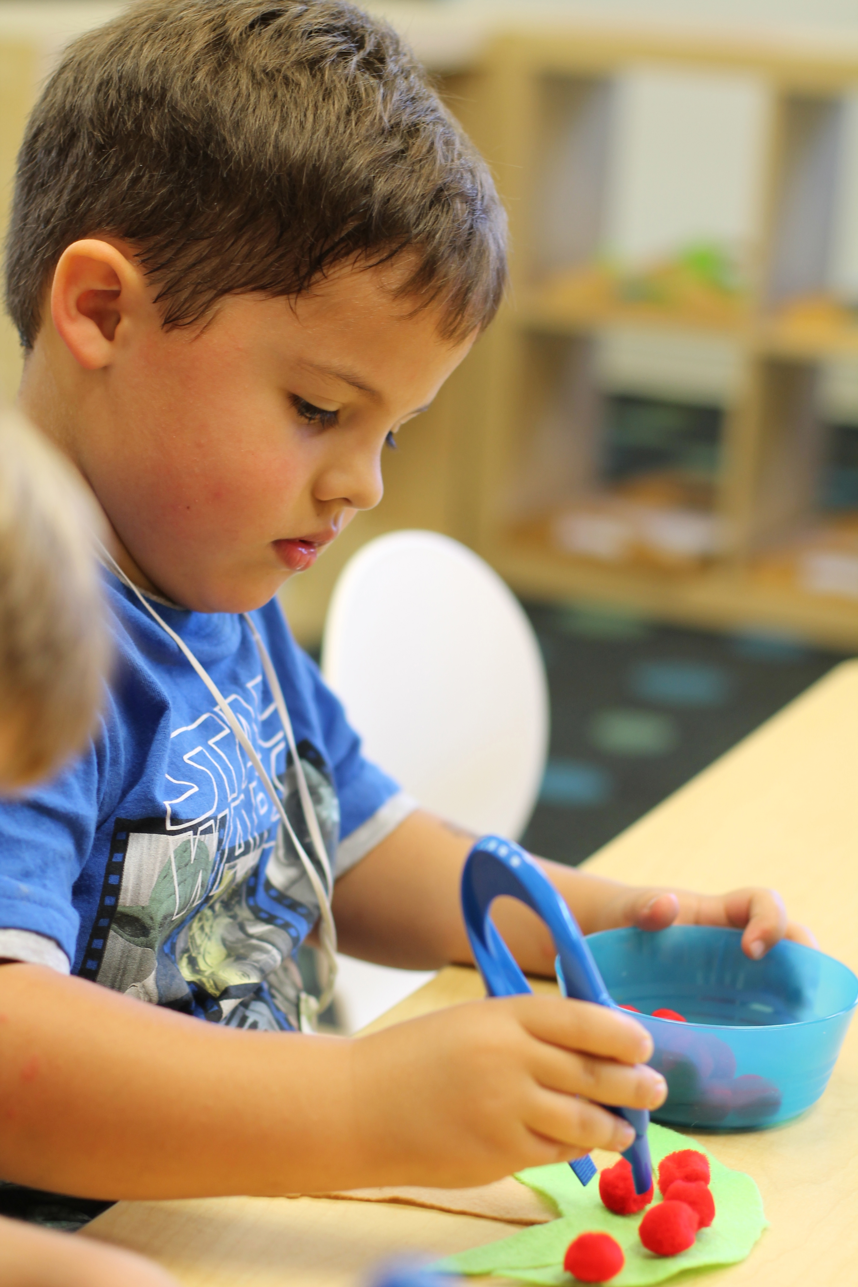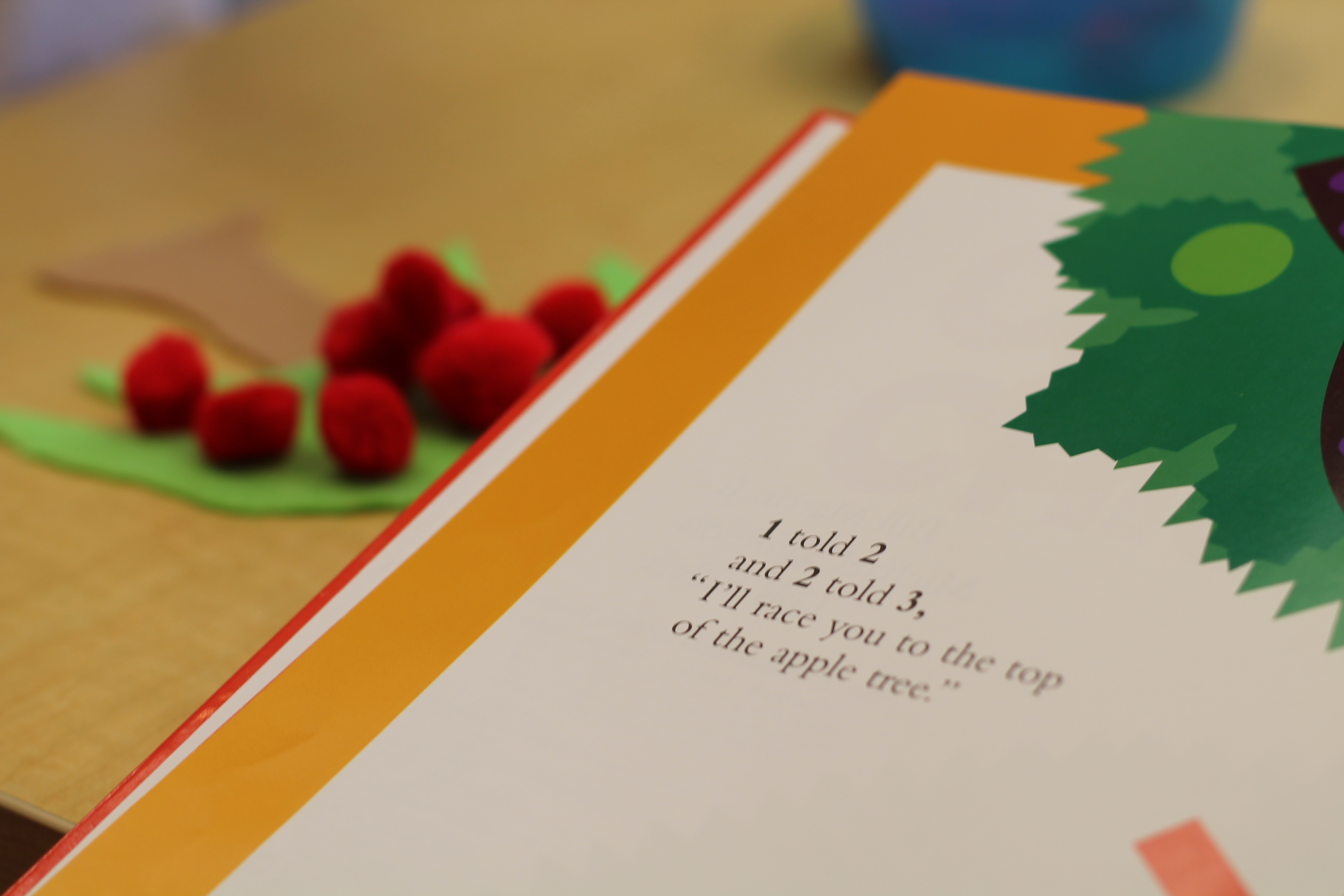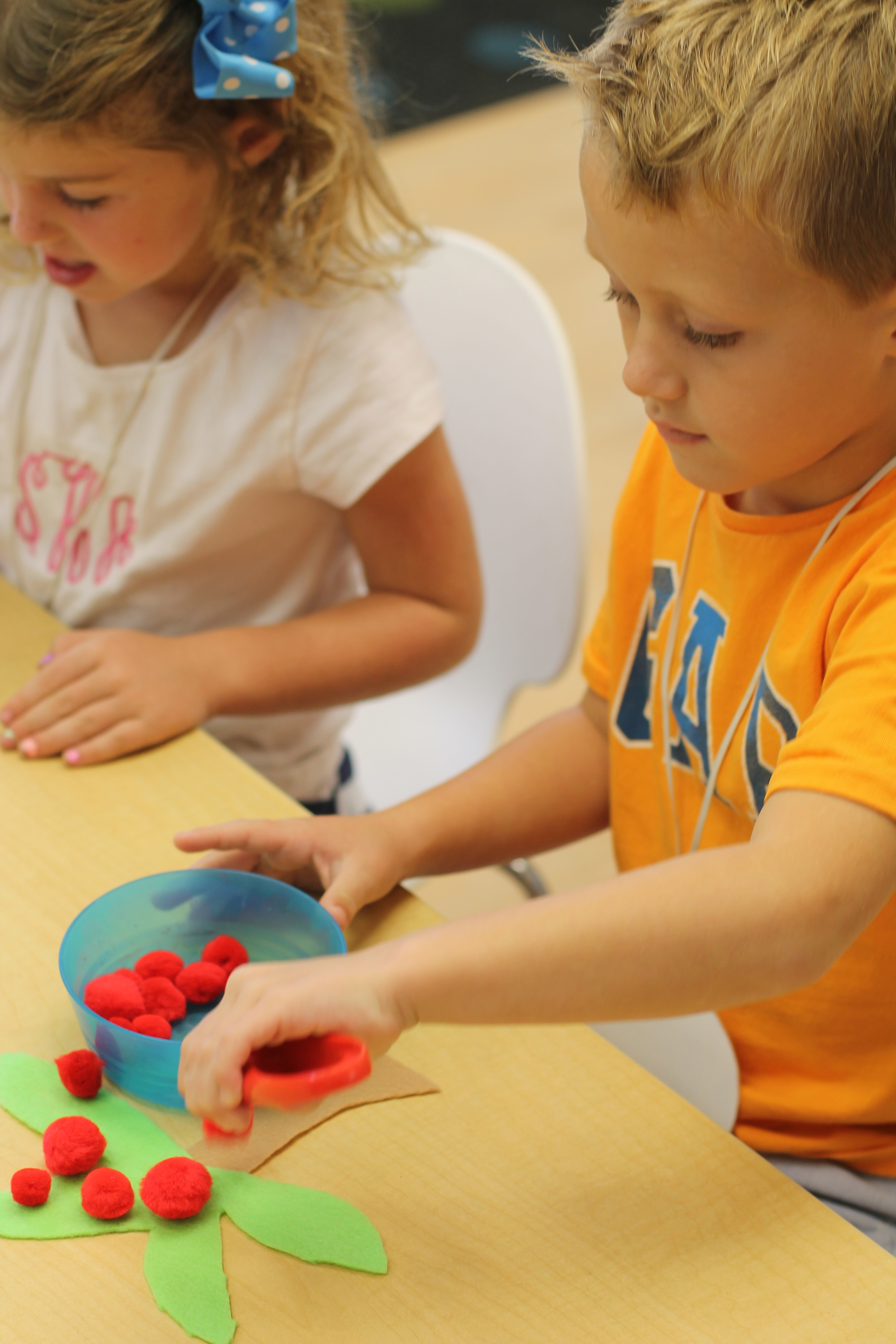 We did a fun math/literacy lesson this week. We read the book, “Chicka, Chicka, 1, 2, 3” as a whole group. The book is about different numbers climbing up an apple tree. It was only fitting that the kids would be able to snack on tasty, sliced apples during the reading! Afterwards, in small groups the students counted certain numbers of “apples” and used tongs to place them onto their felt apple trees! Another good fine motor activity!