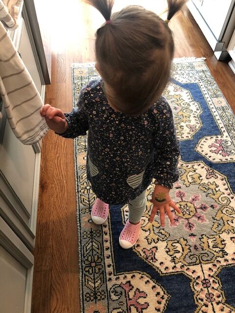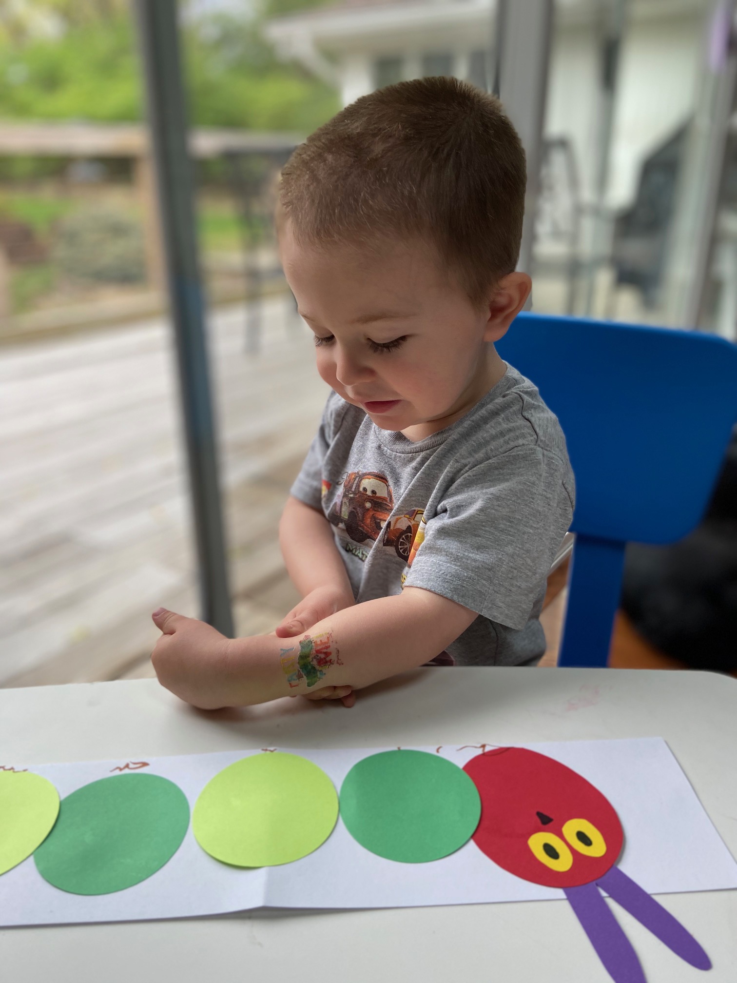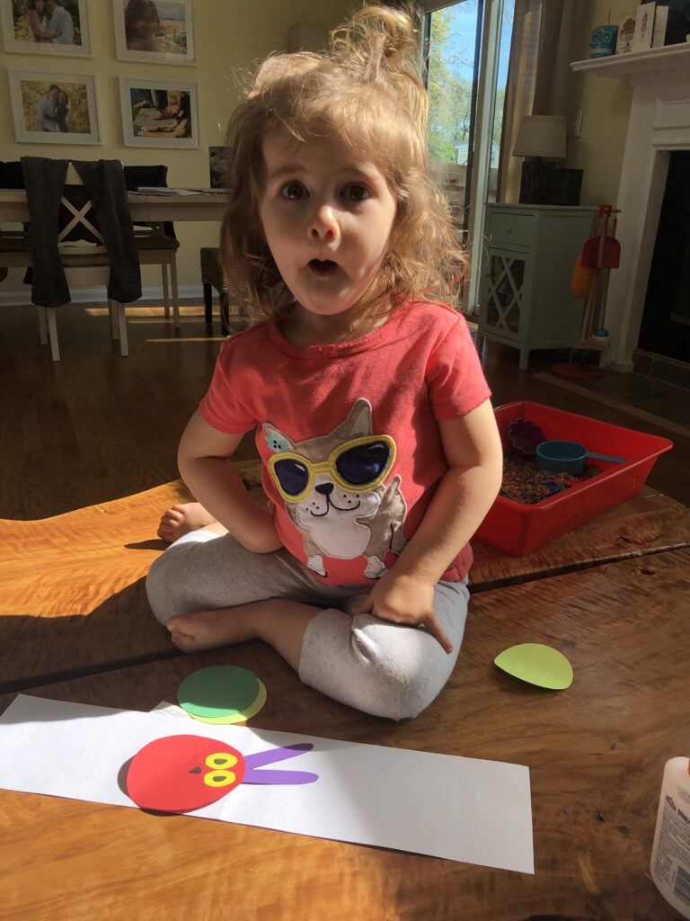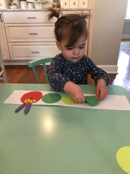 Eric Carle’s The Very Hungry Caterpillar is a classic favorite for all.  I read the story via video and retold the story using magnets.  The toddlers were provided with materials to craft their own caterpillar and fun temporary tattoos too!