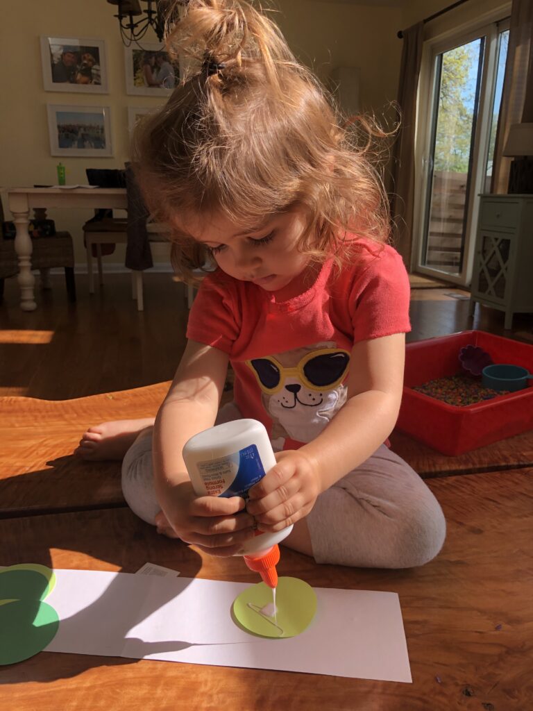 Creating is important for the toddlers.  They improve their fine motor skills, experimenting with materials is the foundation for science, and it provides a sense of pride which boosts self confidence.  We often do crafts in small groups which allows for instruction and discussion of shapes, colors, letters, counting, and theme vocabulary.