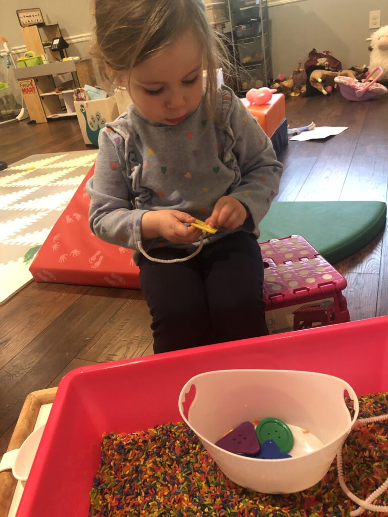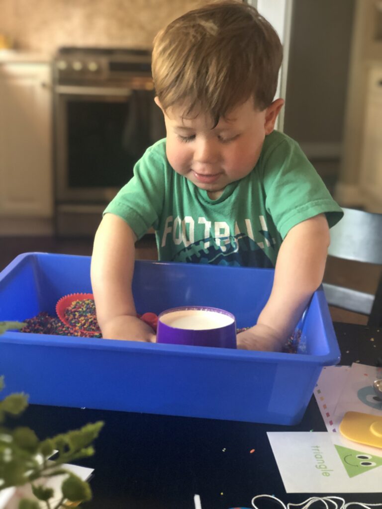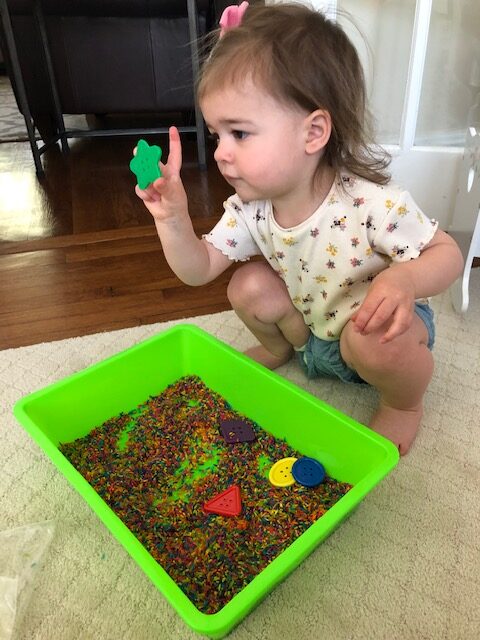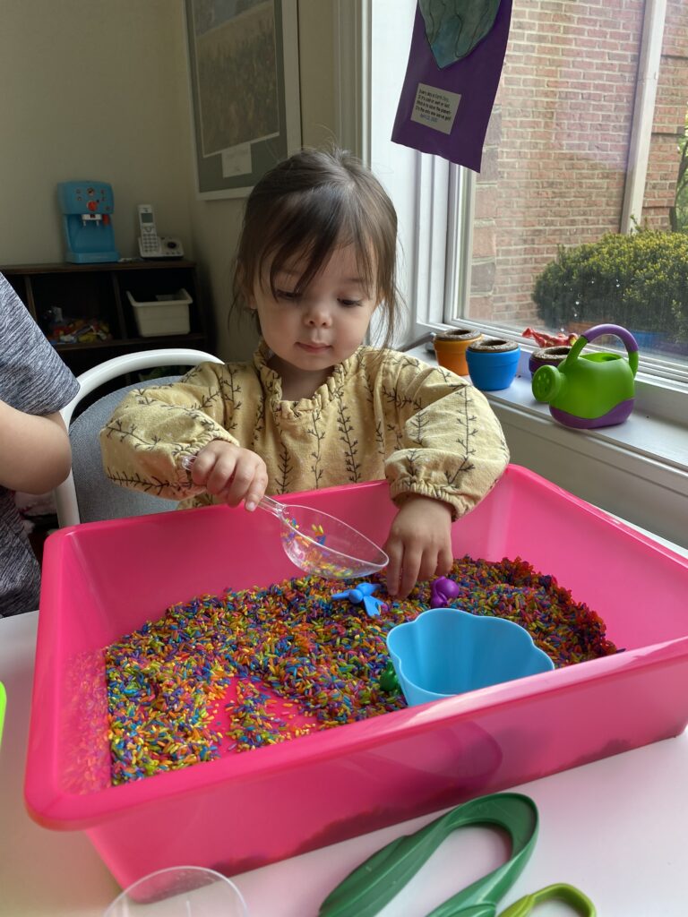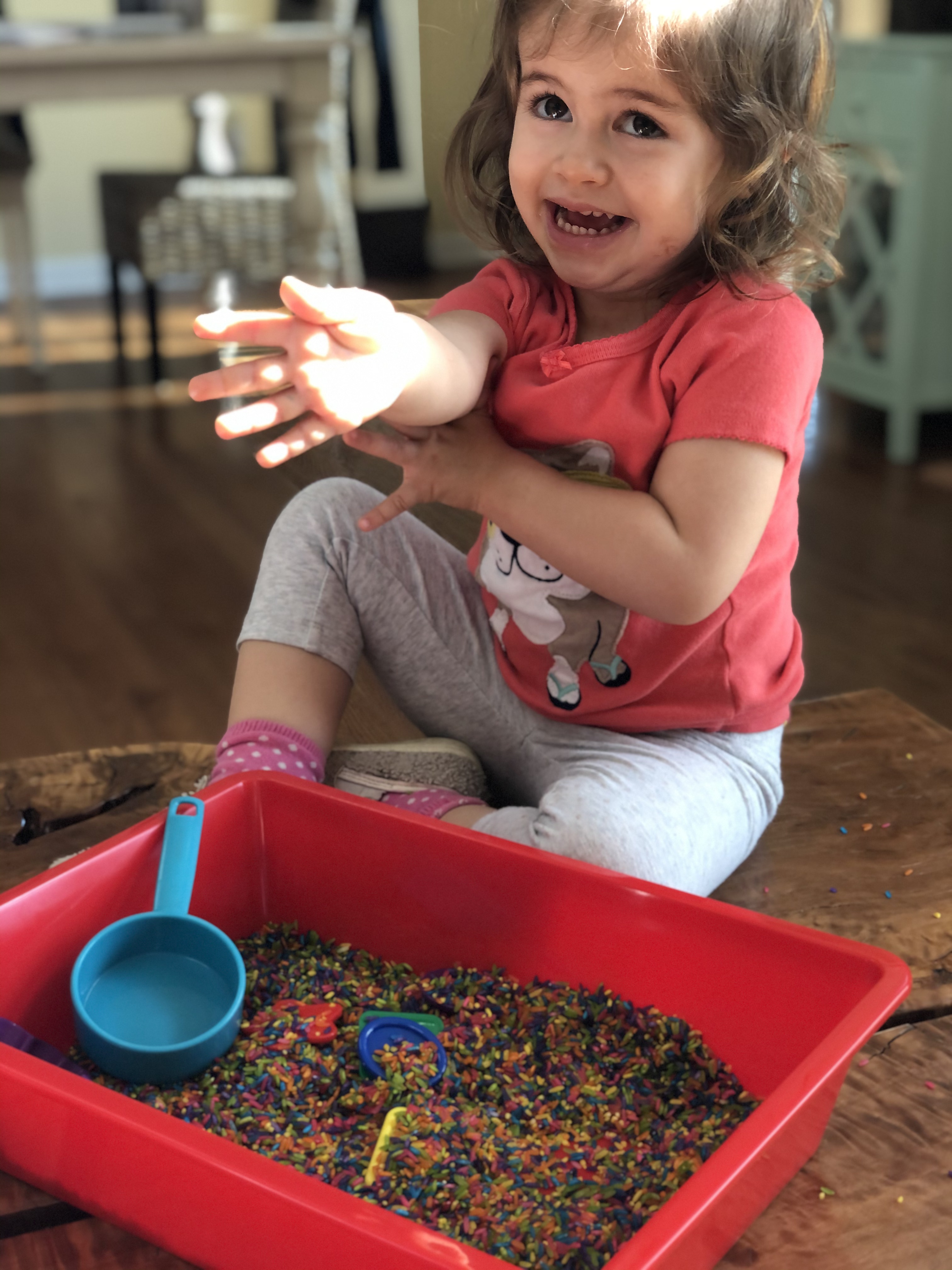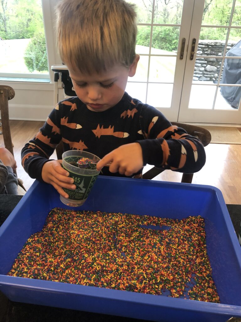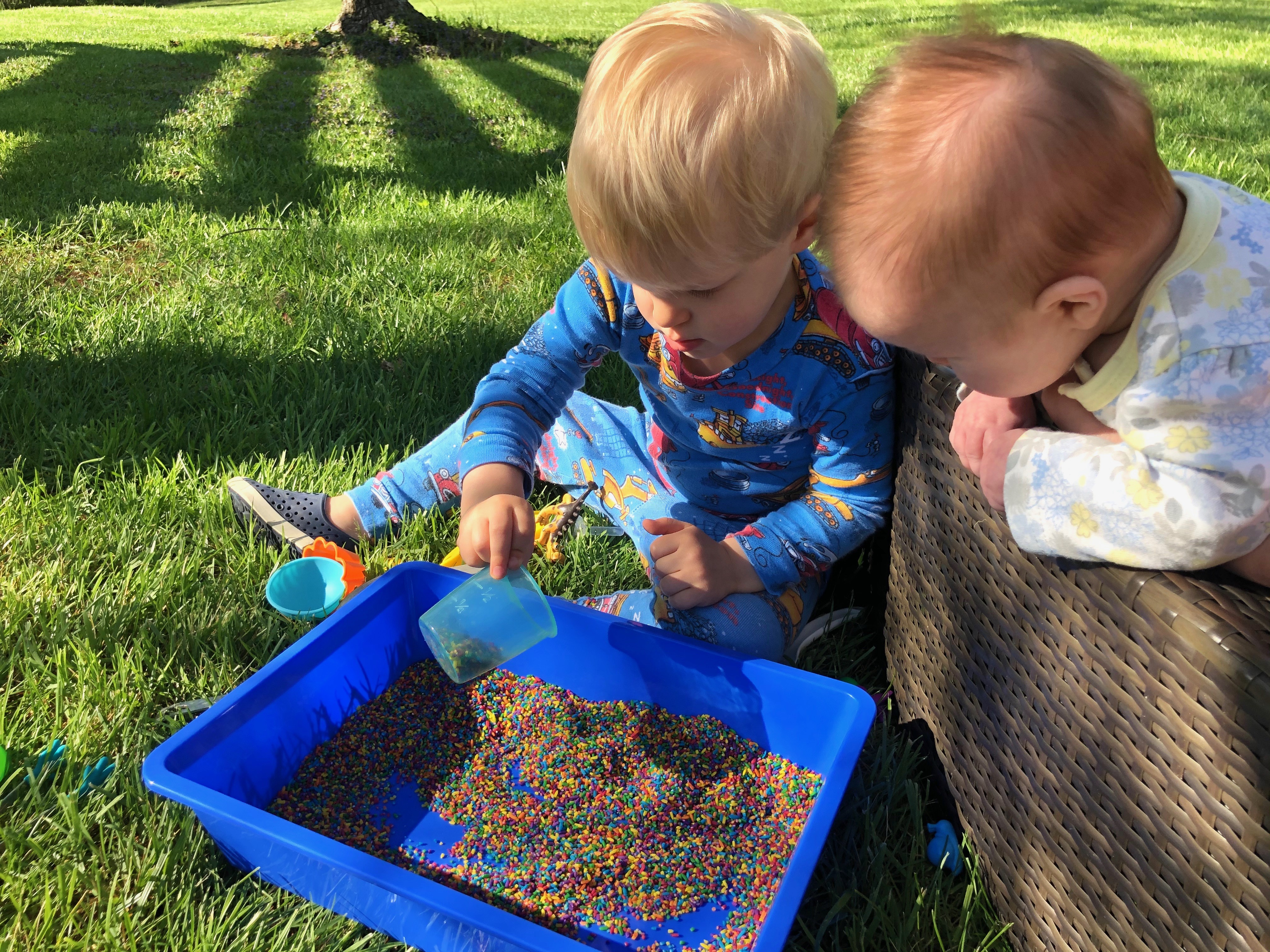 Rainbow rice is the new sensory material for our sensory bins.  Fun exploration for our toddlers (and siblings too)!