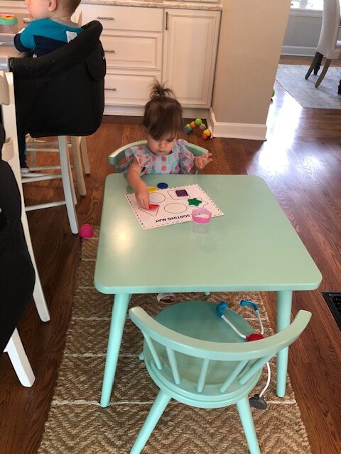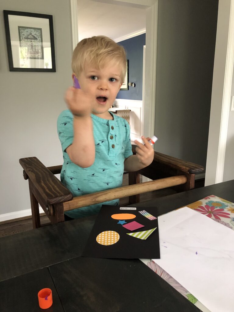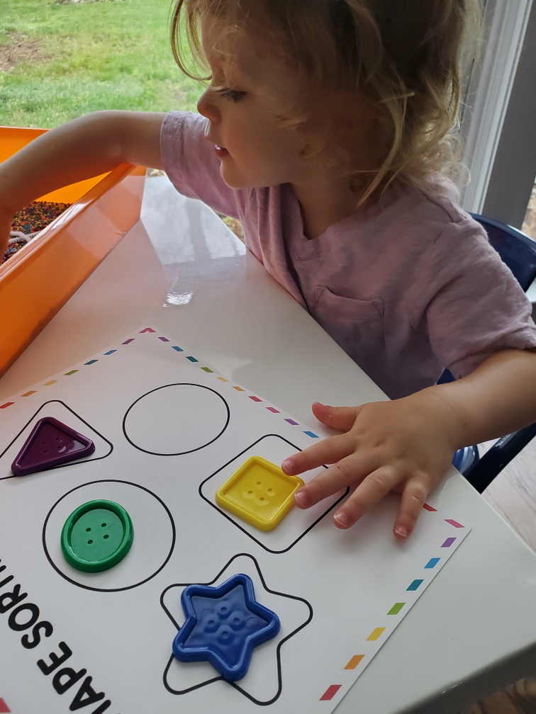 Our Shape Review included lacing button shapes, shape match- up mat, shape collage, shape cards complete with an interactive zoom to give live feedback, shape stories, and more!