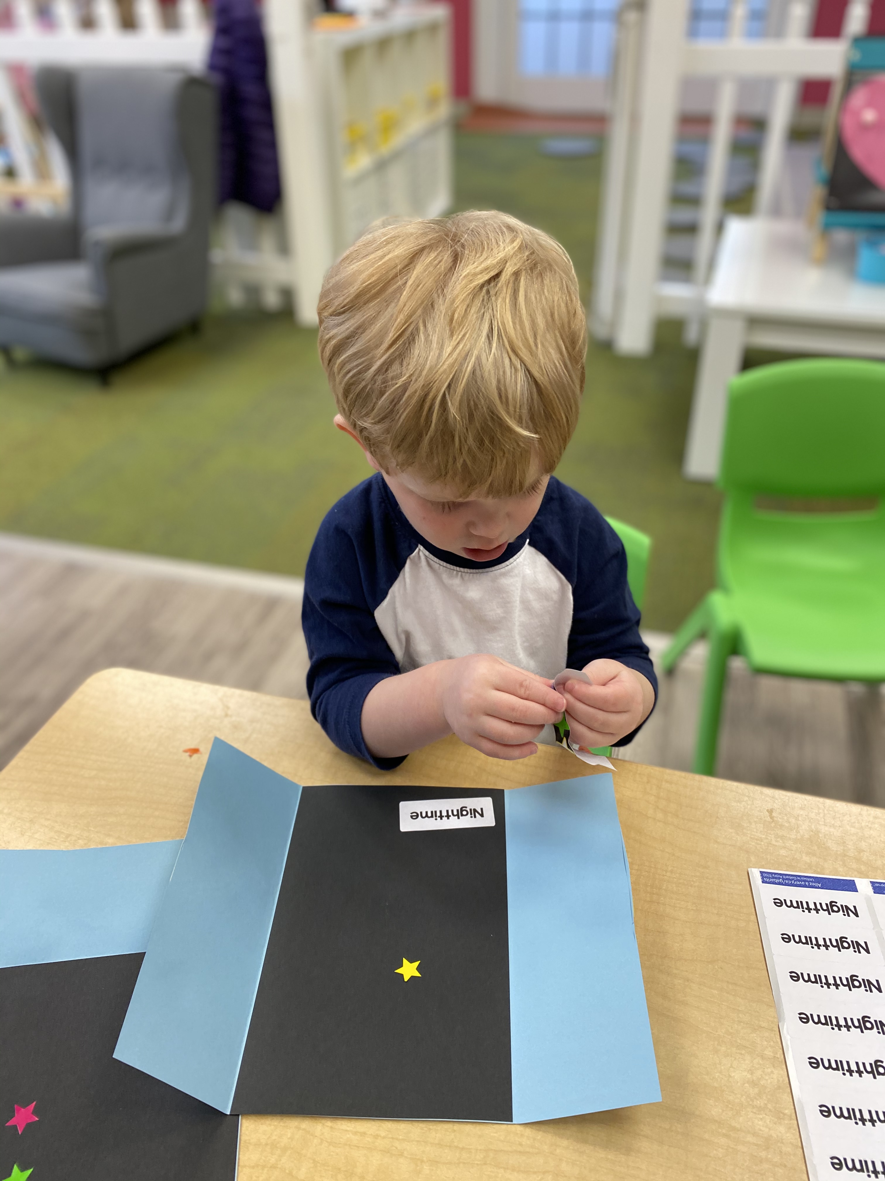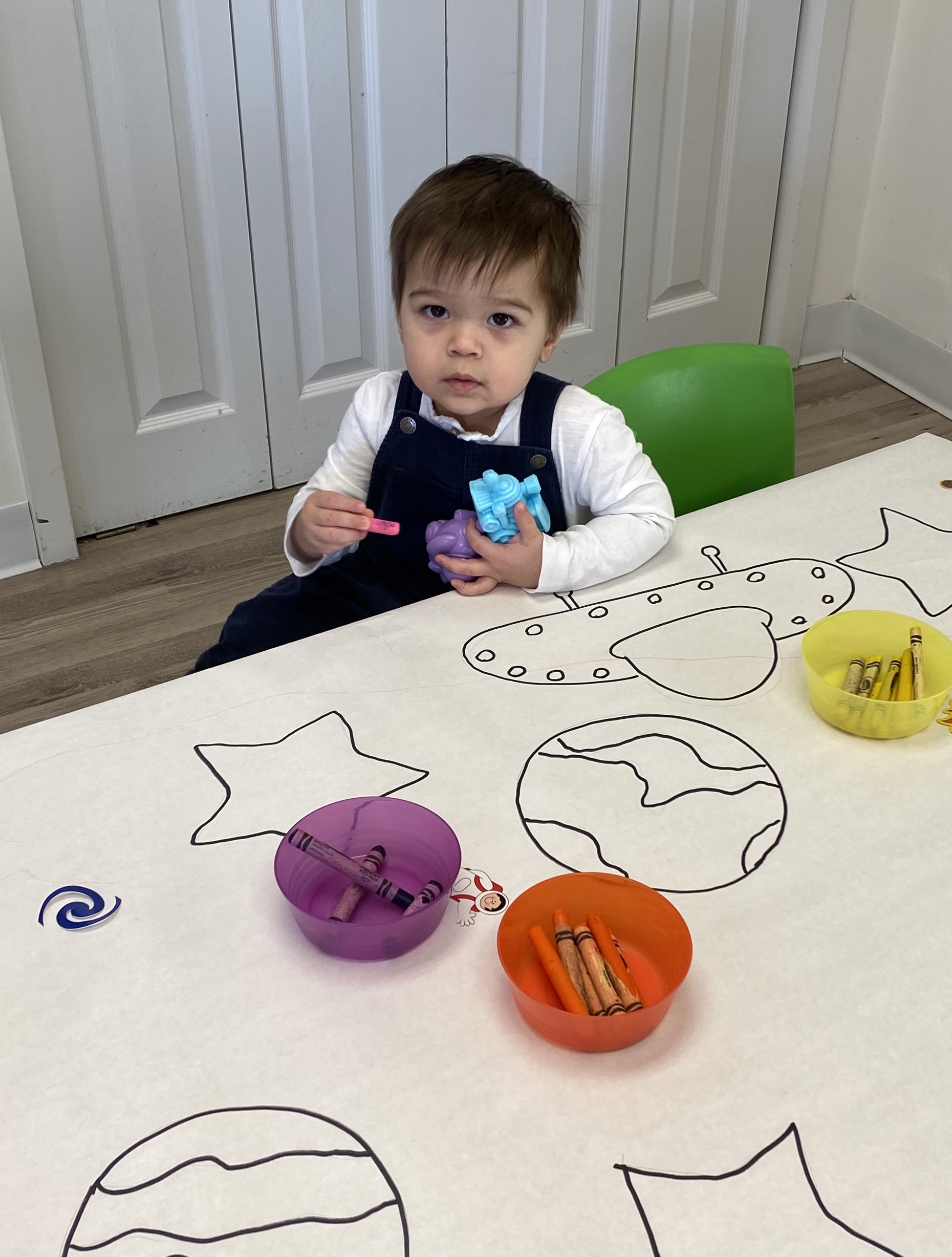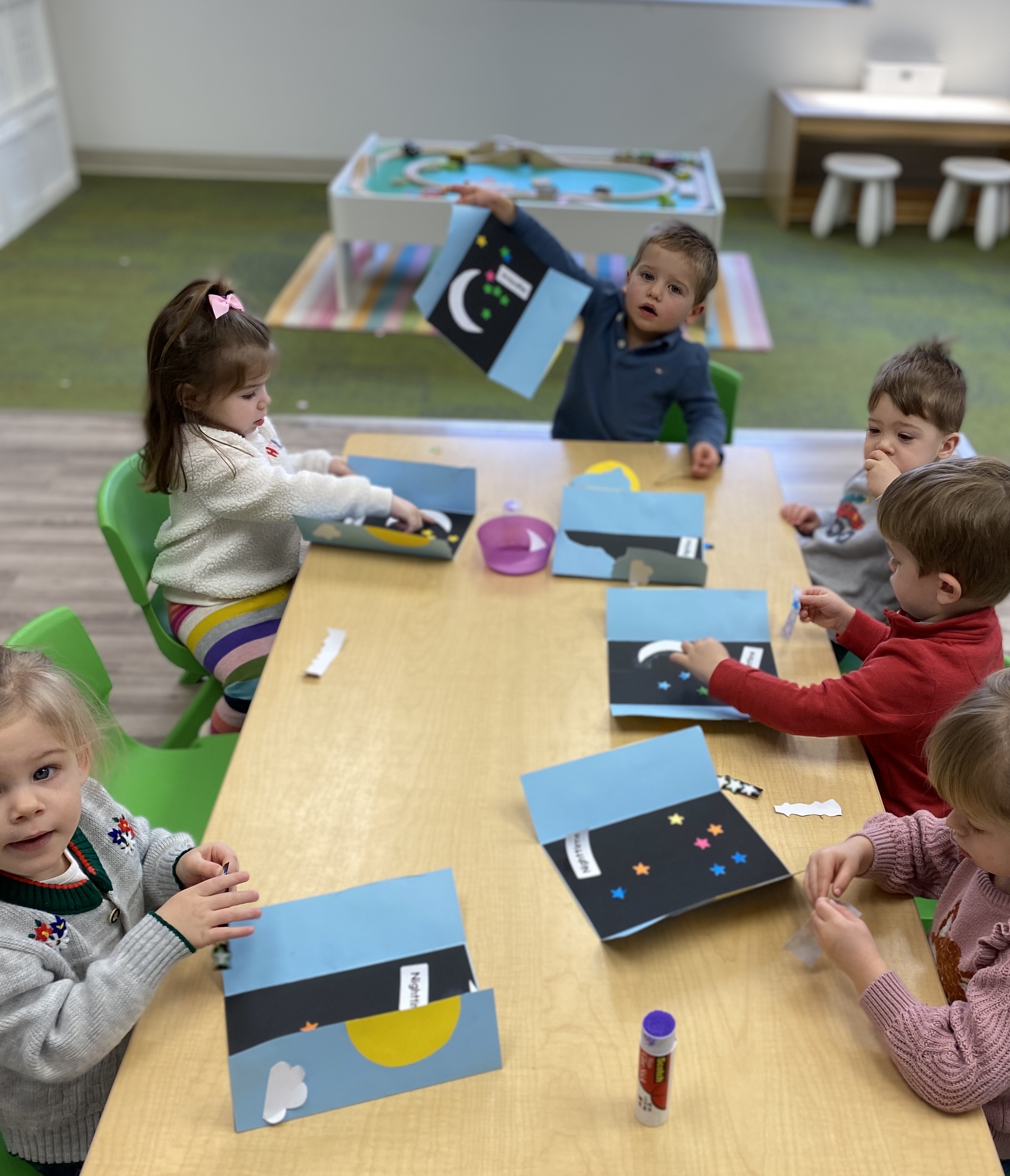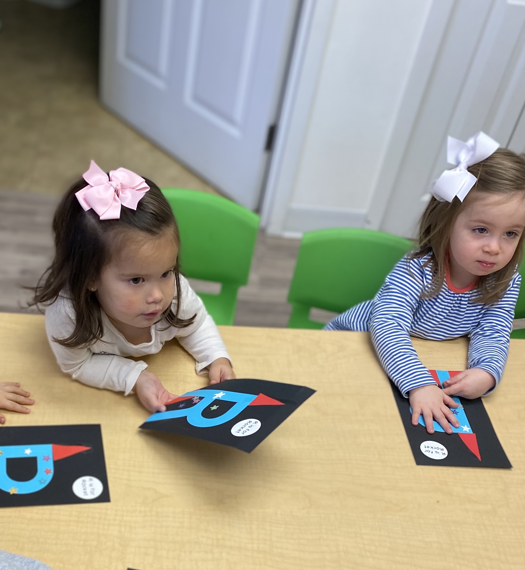 The toddlers have enjoyed our space theme this month.  We have colored planets, had hands on learning with our space discovery bins, pretended to be astronauts and preformed an astronaut obstacle course complete with star jump and black hole, and discussed the concept of daytime versus nighttime. We combined our study of the letter R and space theme to create an R is for Rocket also!