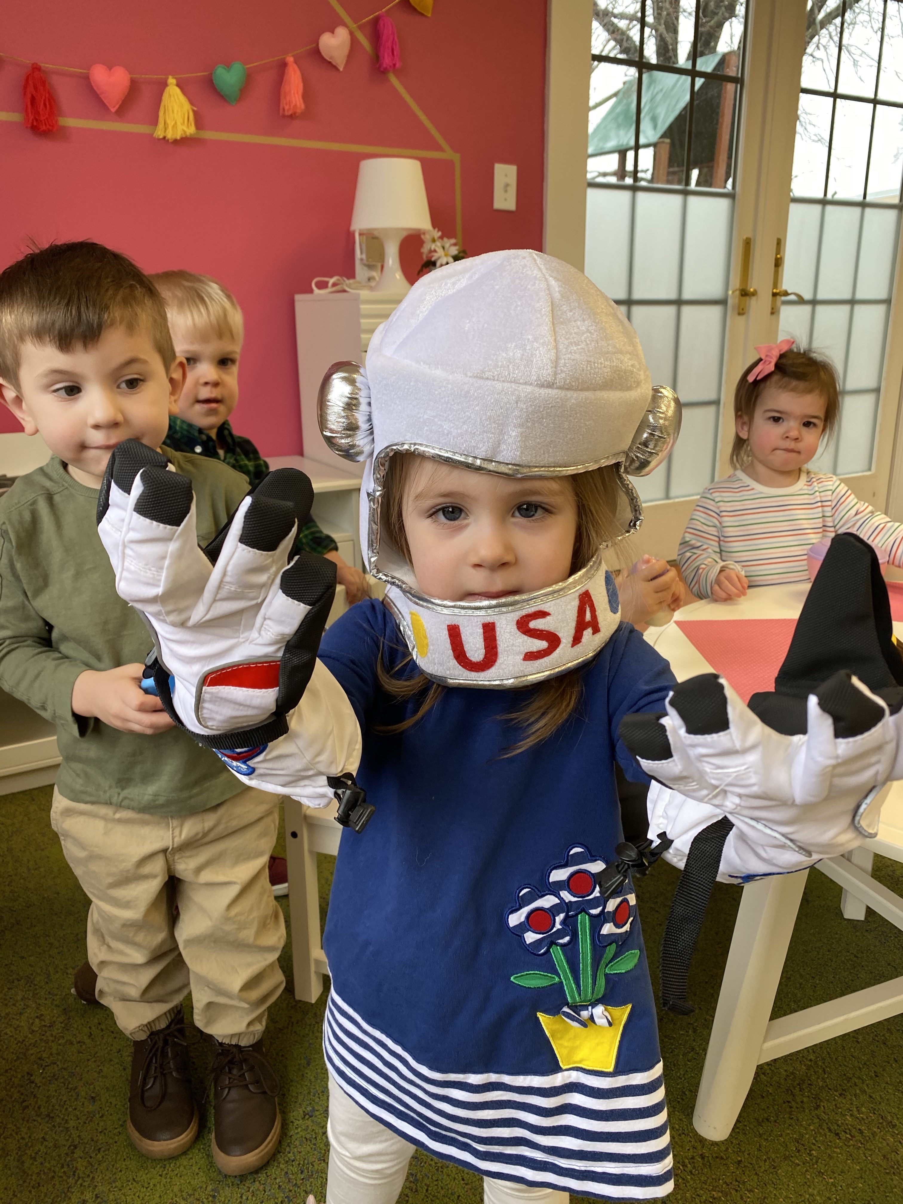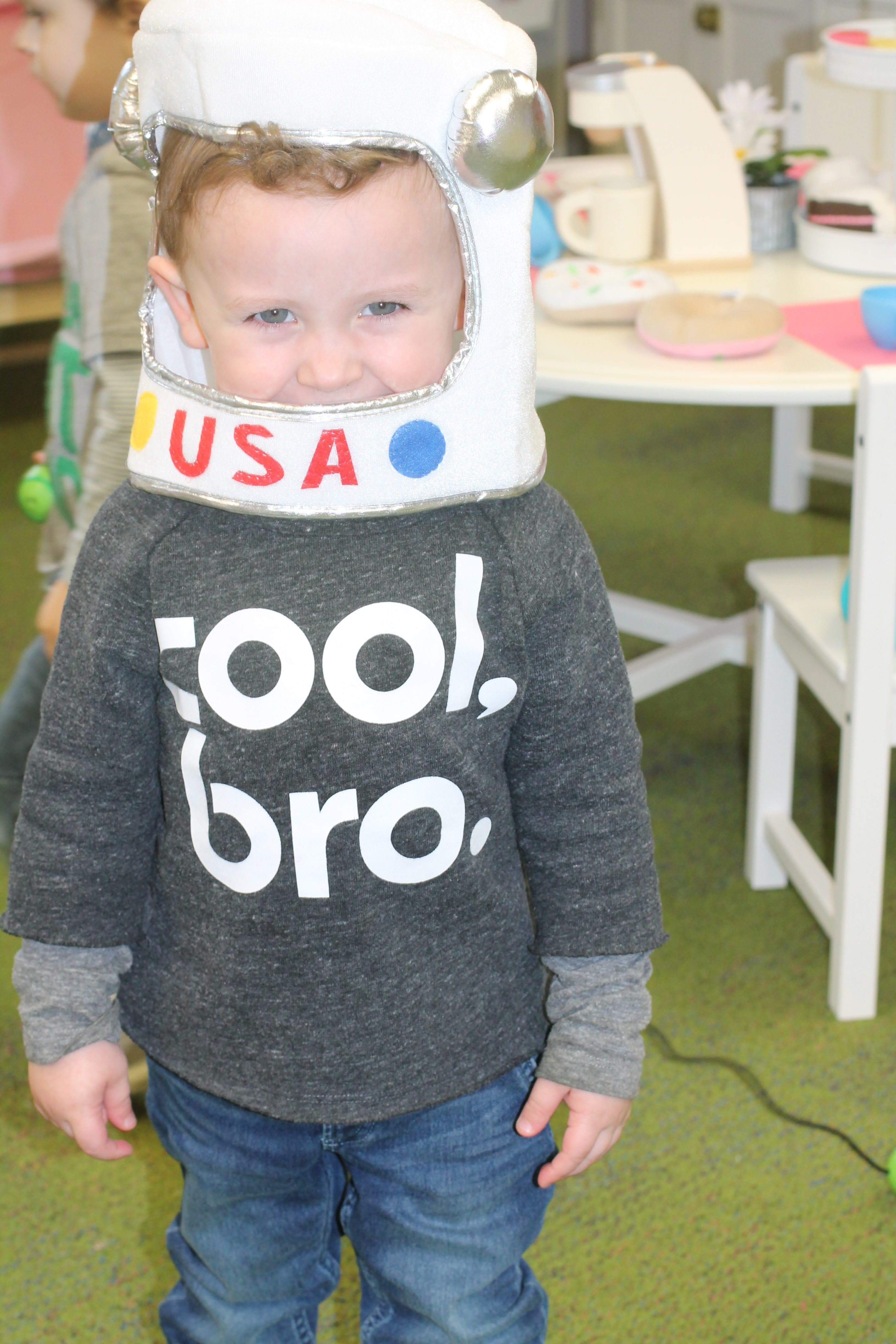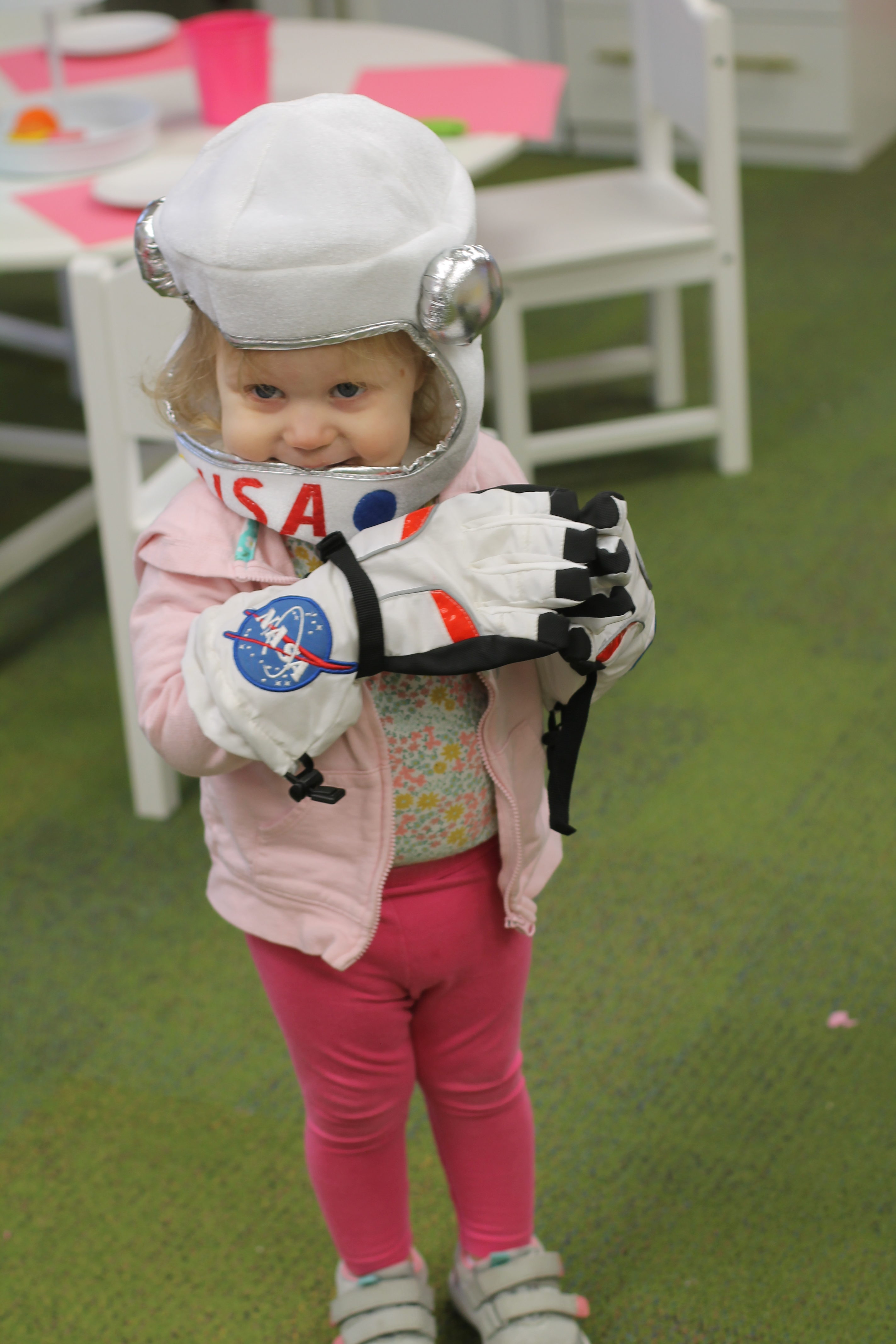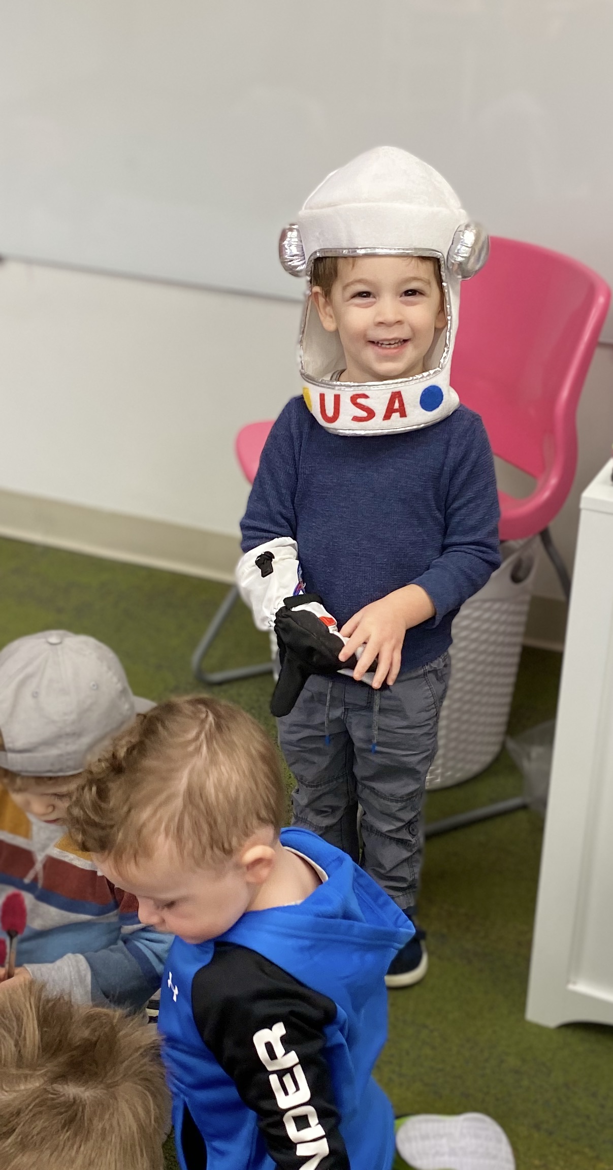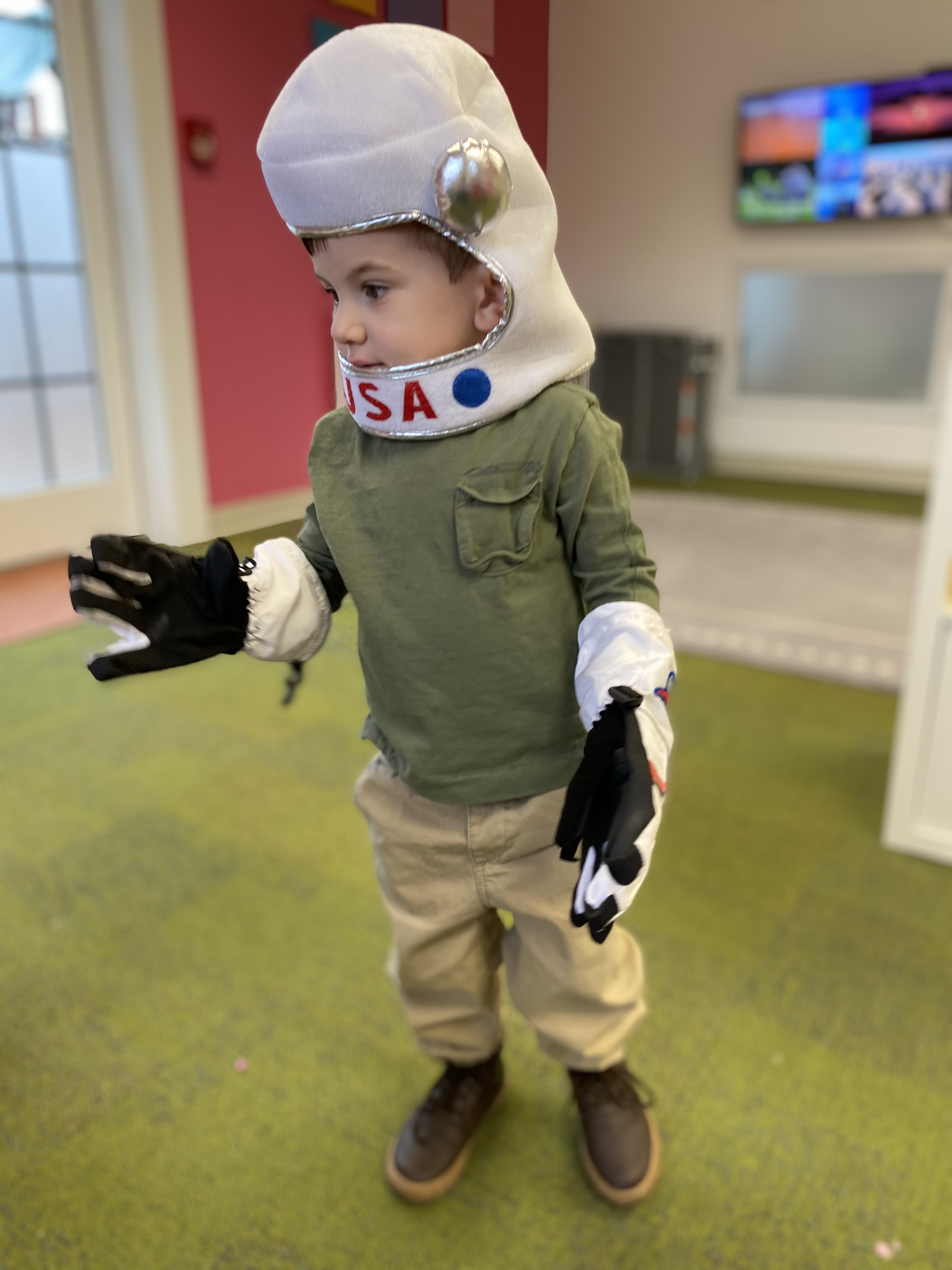 The toddlers have enjoyed our space theme this month.  We have colored planets, had hands on learning with our space discovery bins, pretended to be astronauts and preformed an astronaut obstacle course complete with star jump and black hole, and discussed the concept of daytime versus nighttime. We combined our study of the letter R and space theme to create an R is for Rocket also!