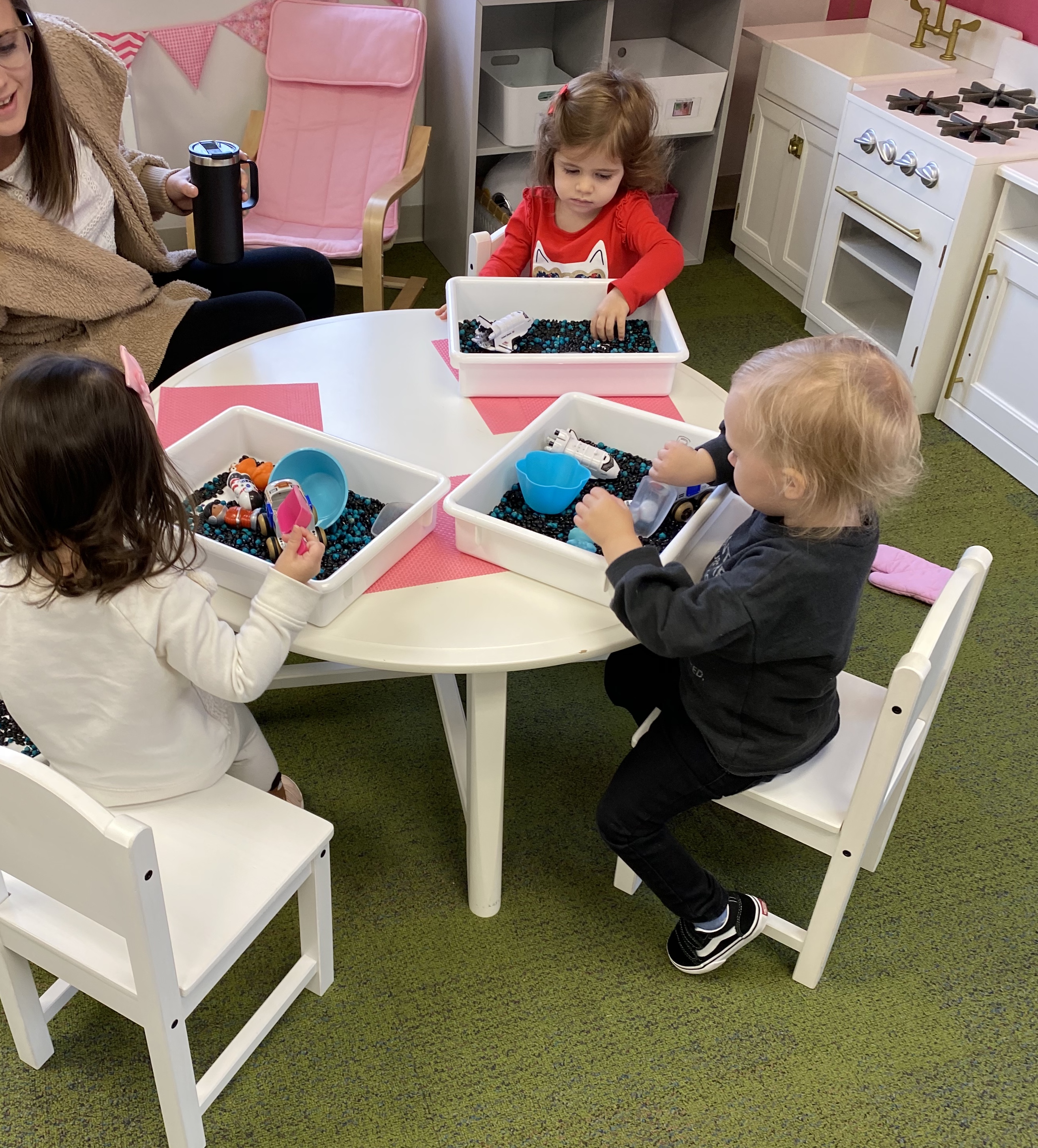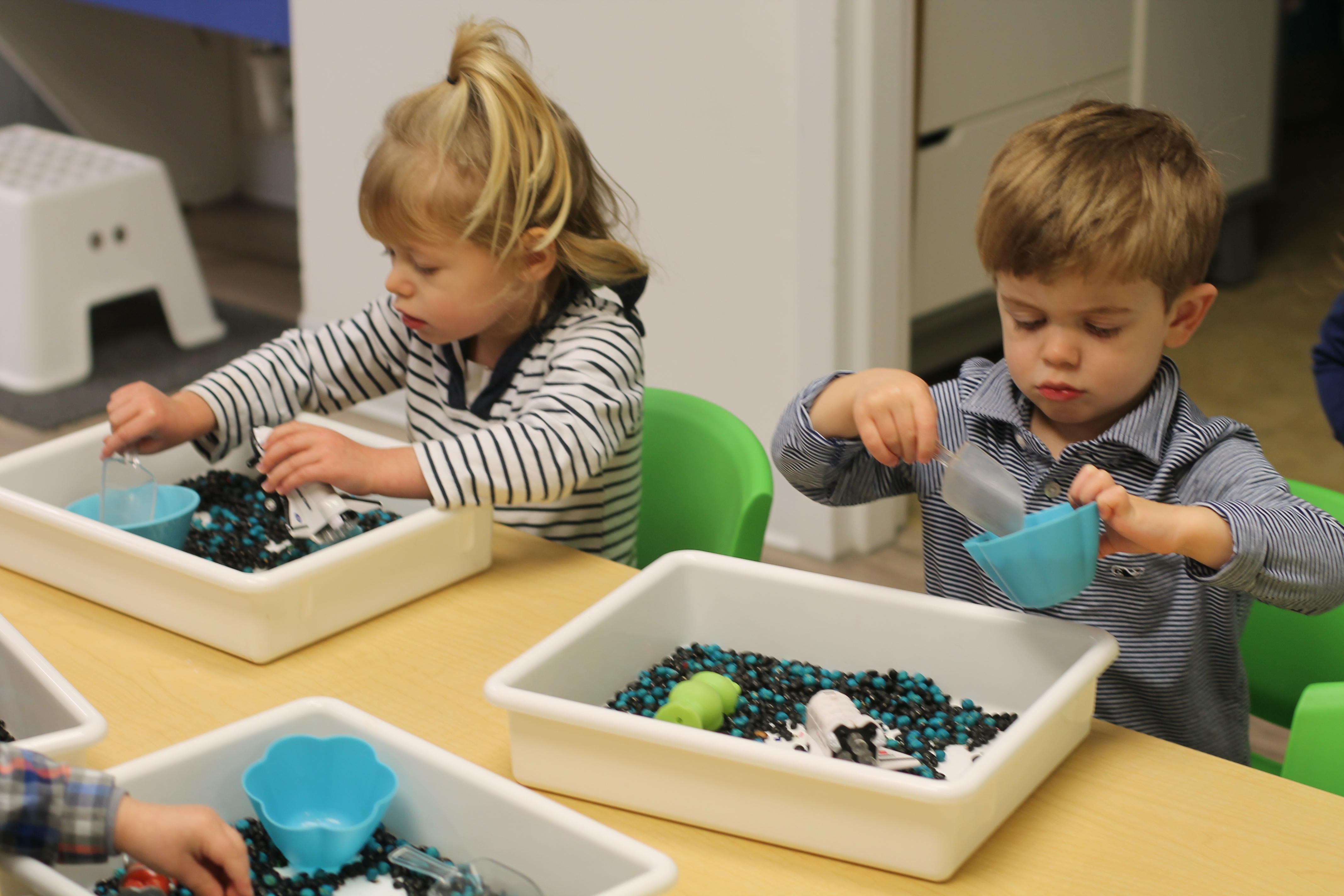 Individual discovery tubs are filled with items to discover by touching, pouring, sorting, and scooping.