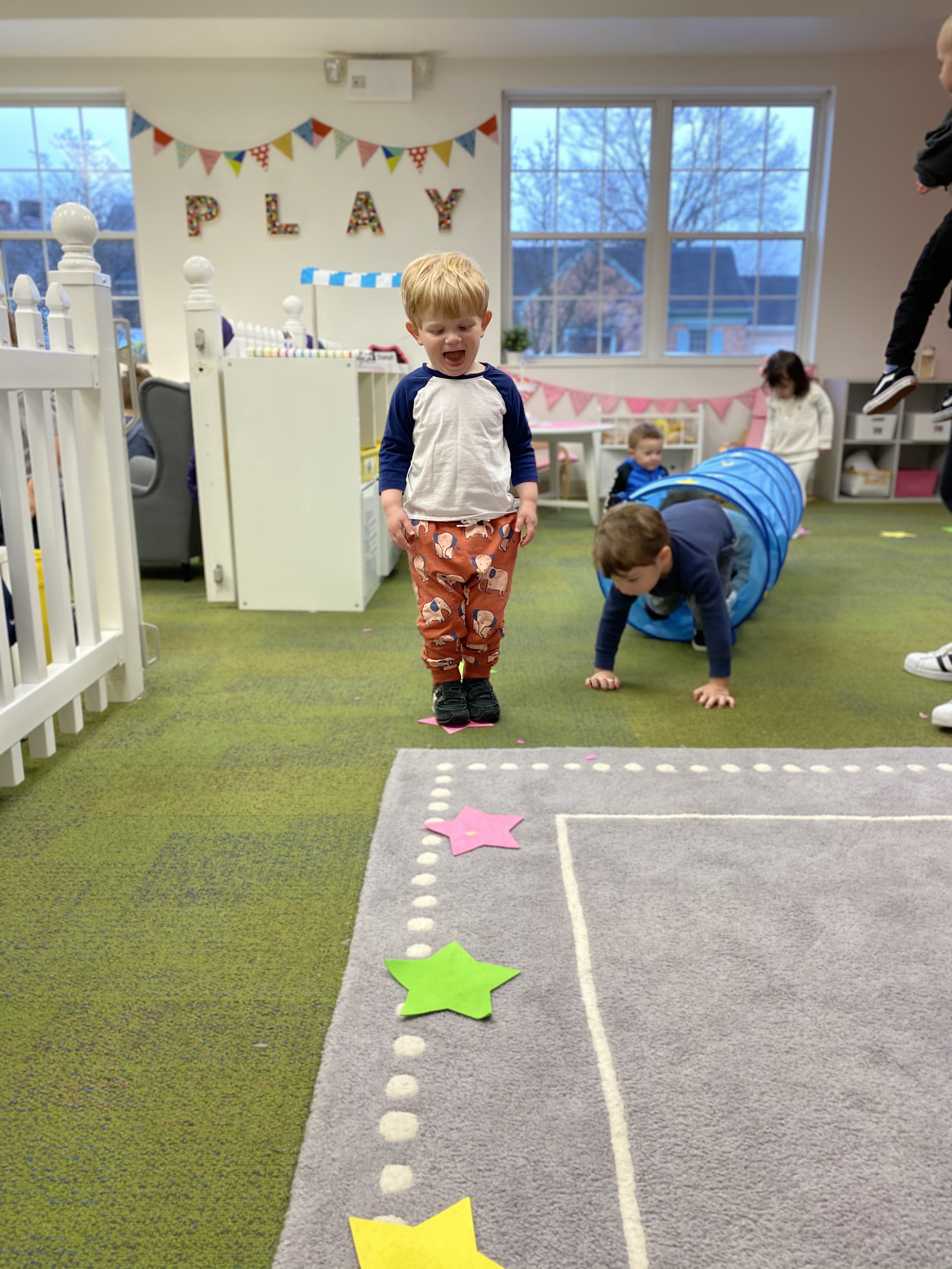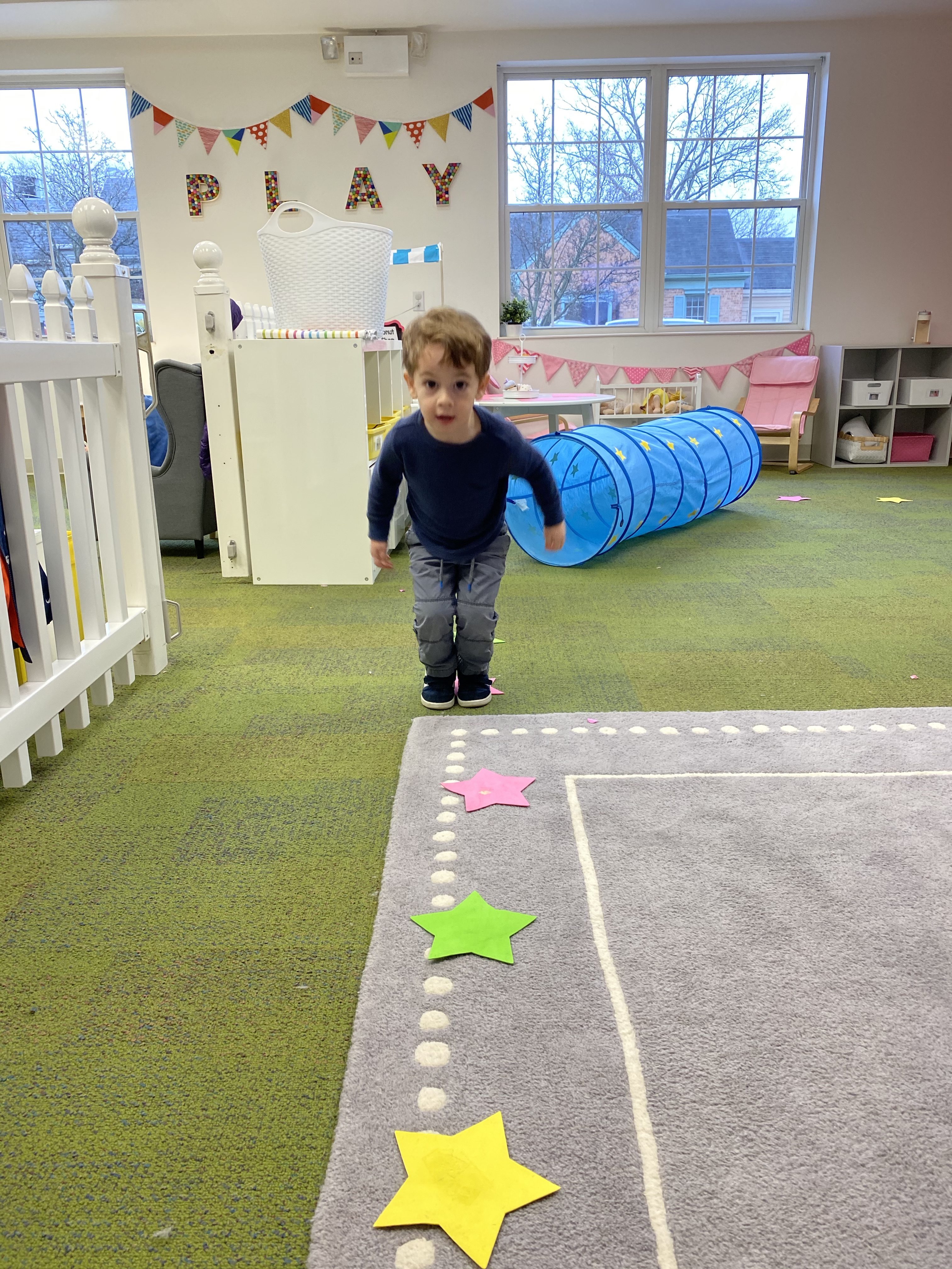 Our toddler classroom is filled with opportunities to explore, problem solve, create, and learn through play.  Our curriculum theme of the month is winter.  We have used this as a guide to introduce and practice new vocabulary, incorporate our focus of shape (rectangle) and color (white) of the month, practice fine and large motor skills, and build on natural curiosity through using our senses to learn and grow.
