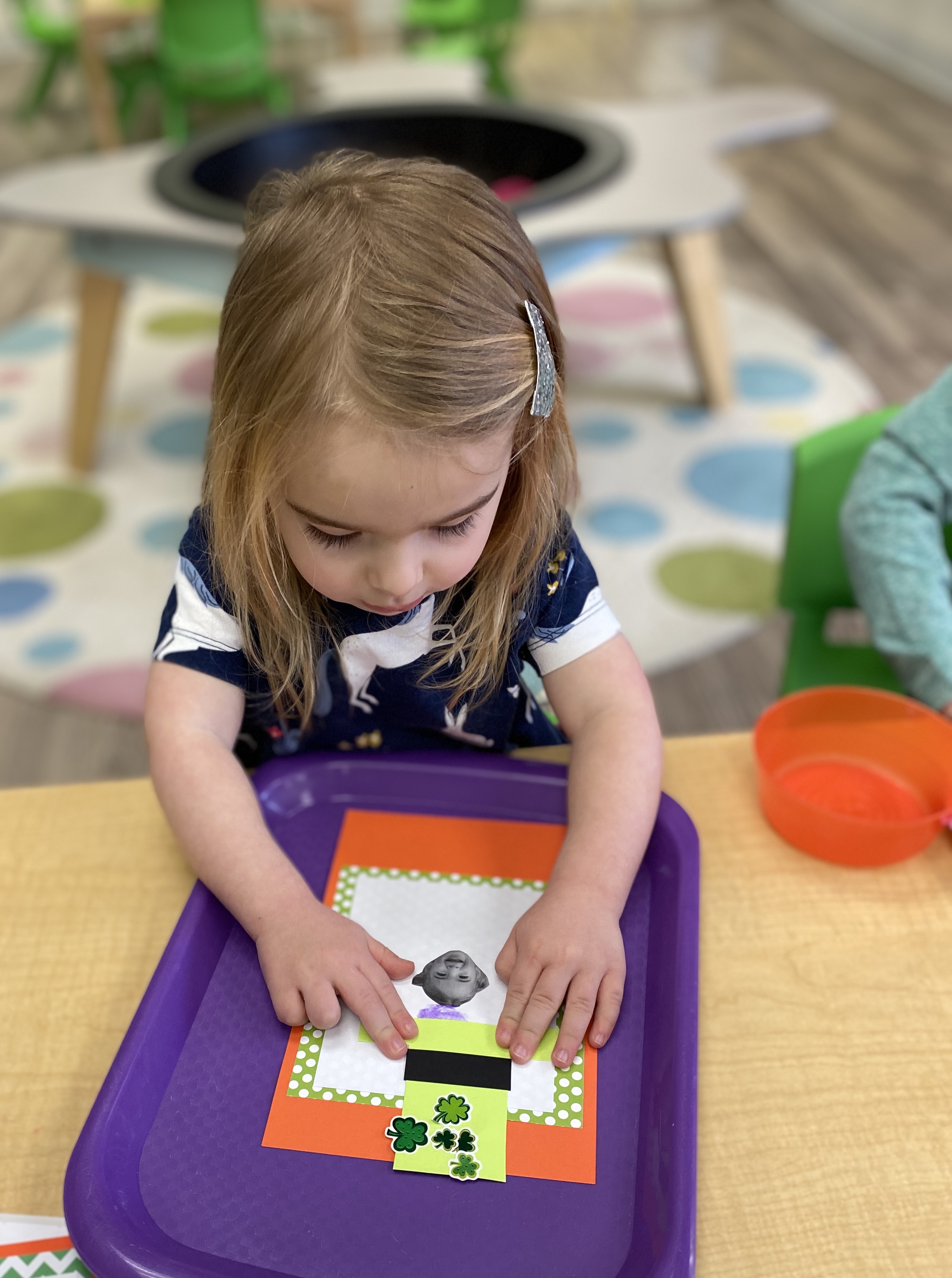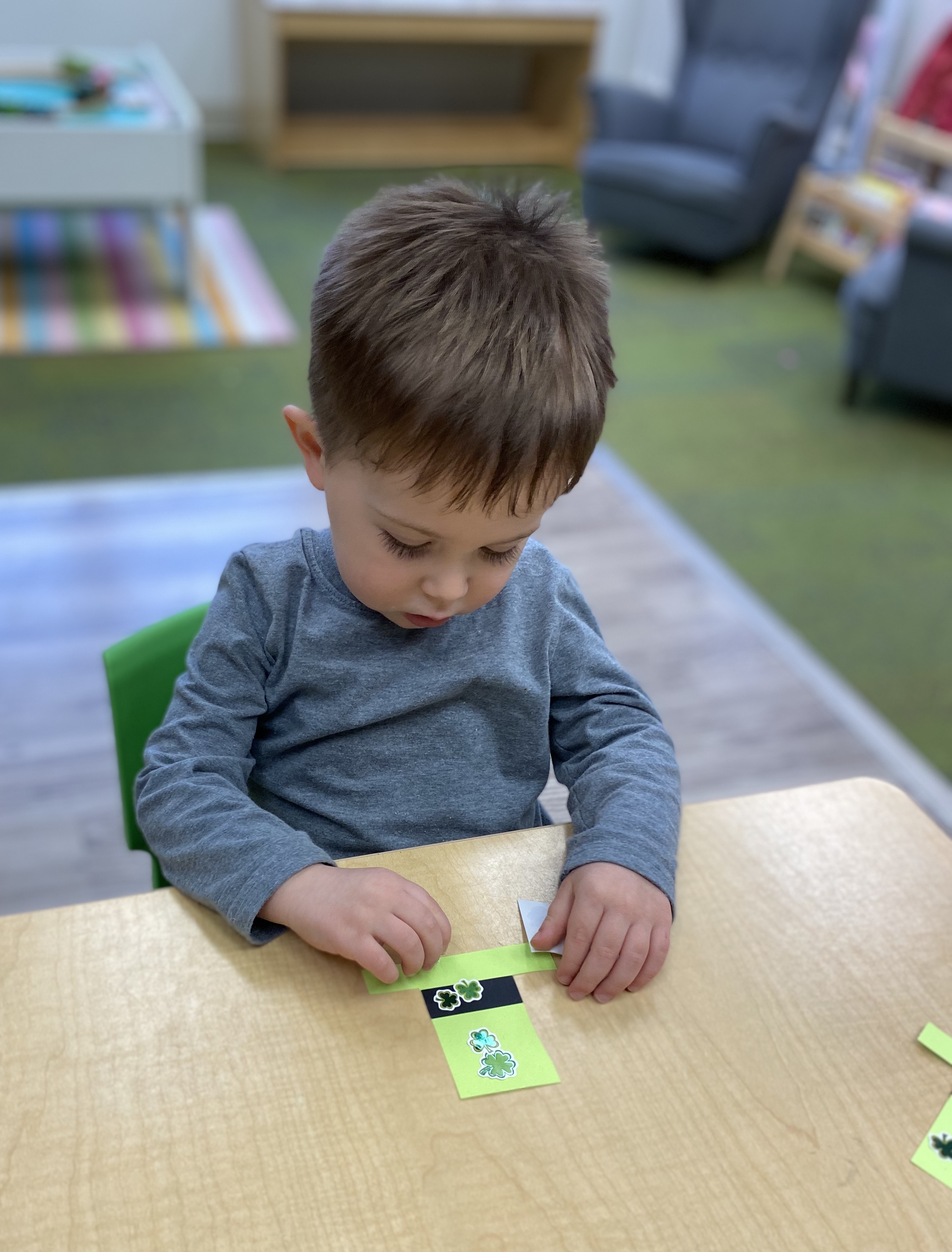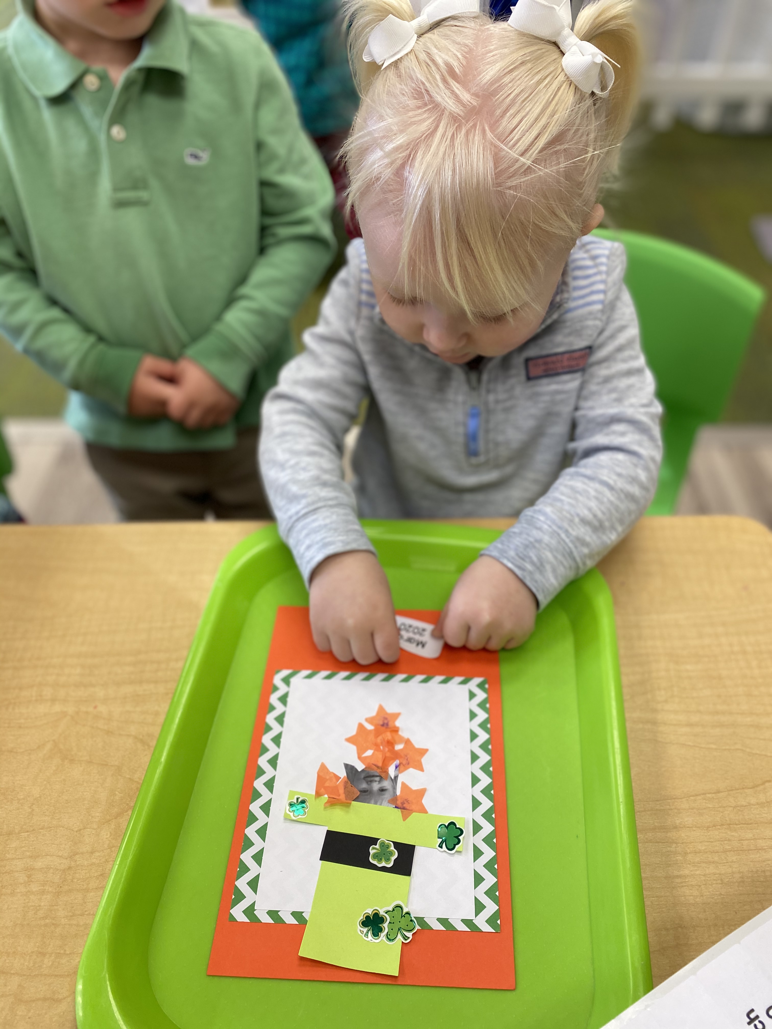 Green play dough, green crafts, green leprechauns, green shamrocks, green paint, green mystery can, etc.