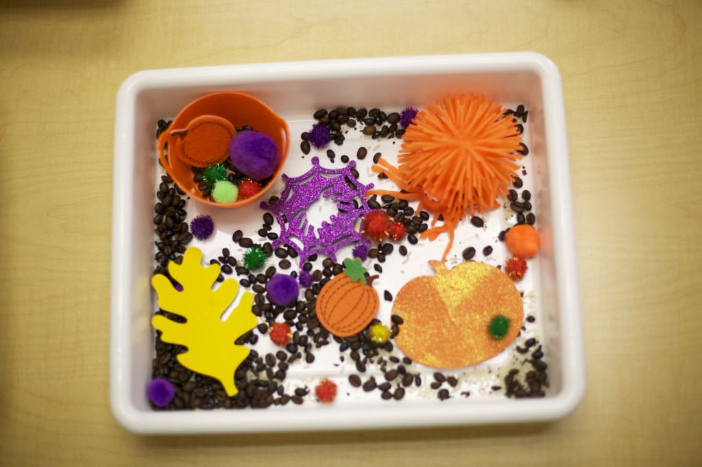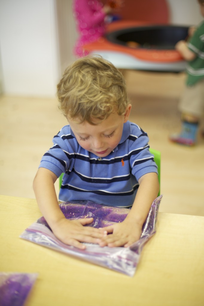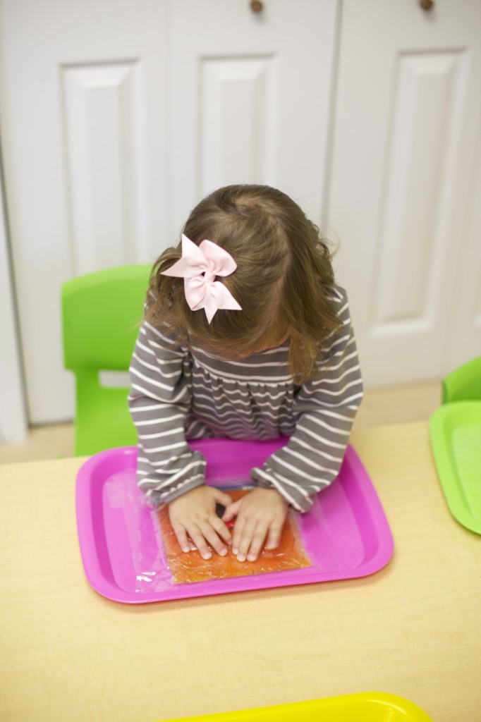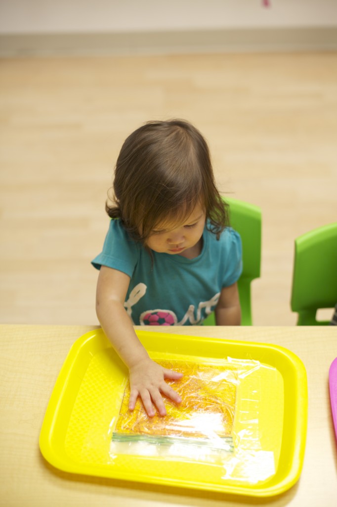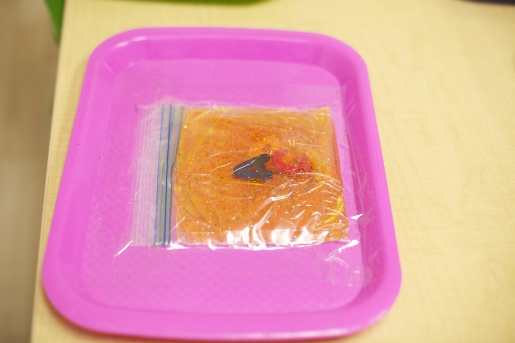 Sensory bags are so easy to make, and the kids love them! These bags are filled with purple gel and spiders to match our spider theme. To make it, you can fill any size sandwich baggie with hair gel then add food coloring and squish it all around. Next, add items of your choice such as glitter, confetti, or small objects. But the fun doesn’t have to stop there. You can make sensory bags with many different materials. For more sensory bag ideas check out http://www.growingajeweledrose.com/2012/07/fun-with-sensory-bags.html.