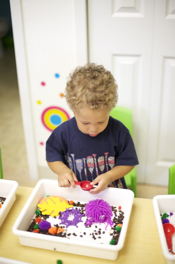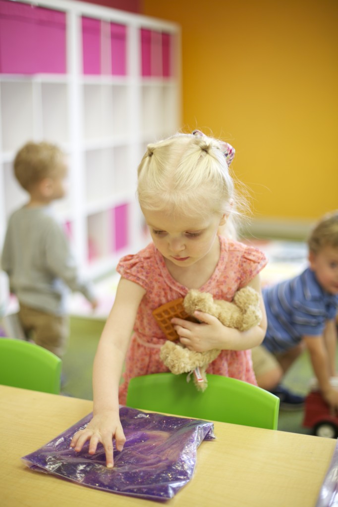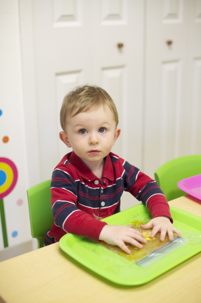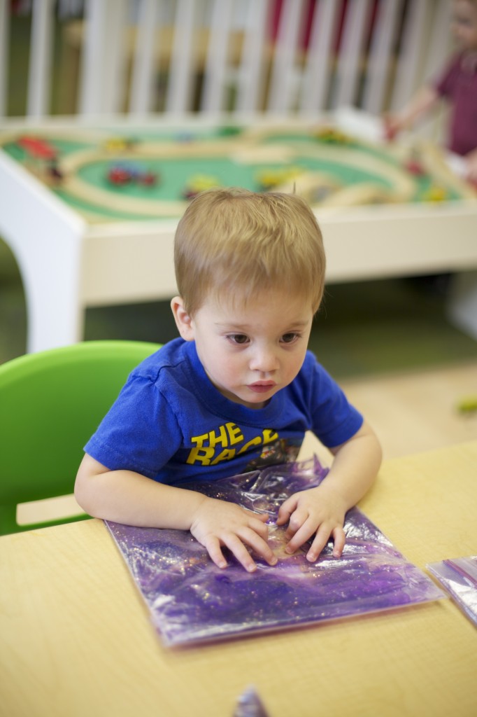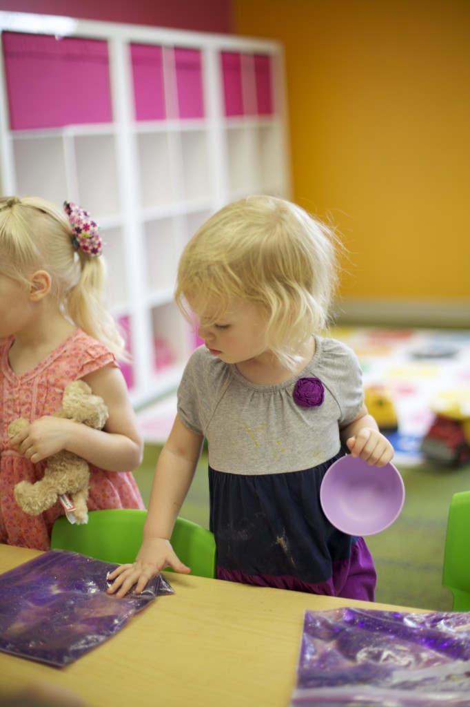 Sensory bags are so easy to make, and the kids love them! These bags are filled with purple gel and spiders to match our spider theme. To make it, you can fill any size sandwich baggie with hair gel then add food coloring and squish it all around. Next, add items of your choice such as glitter, confetti, or small objects. But the fun doesn’t have to stop there. You can make sensory bags with many different materials. For more sensory bag ideas check out http://www.growingajeweledrose.com/2012/07/fun-with-sensory-bags.html.