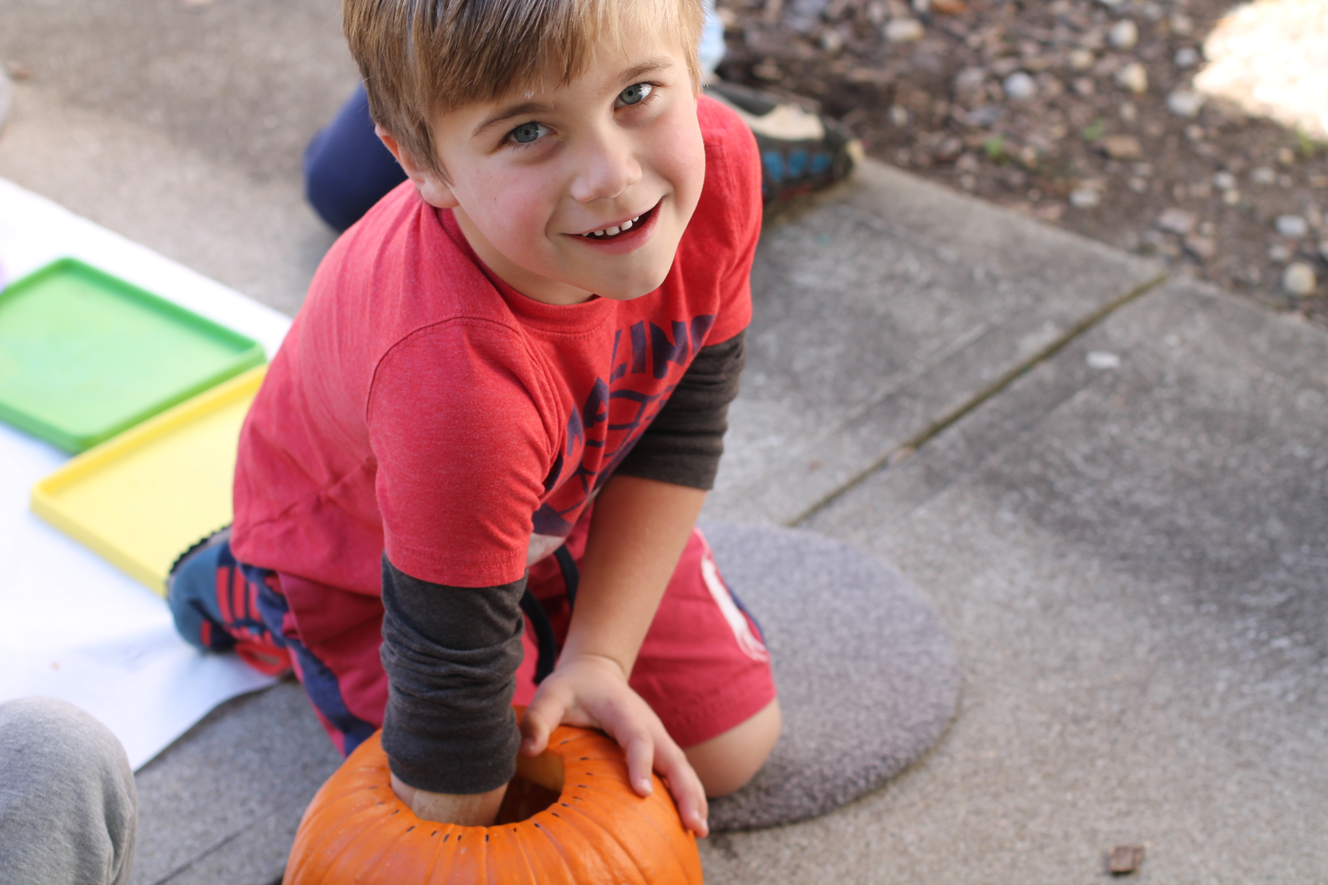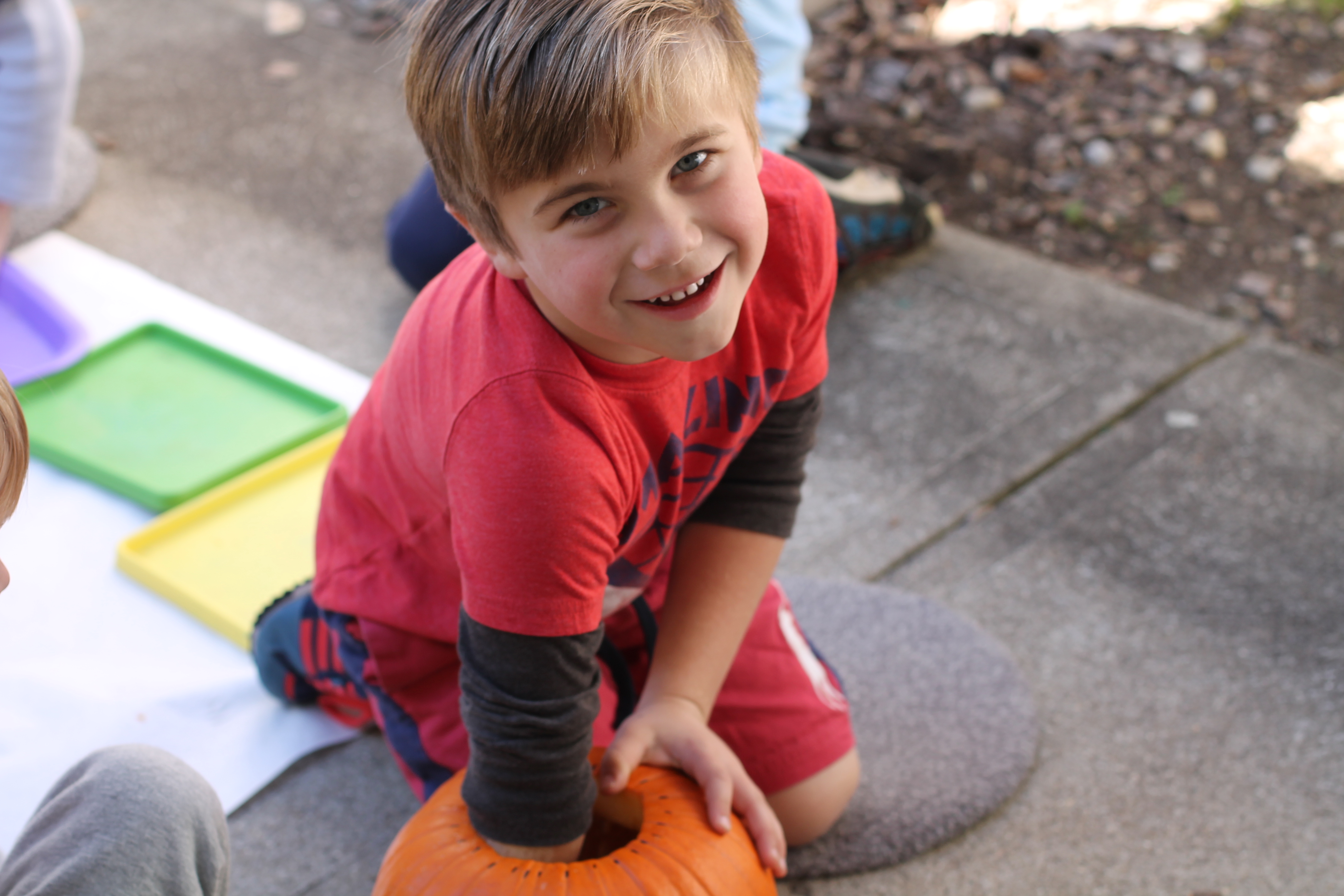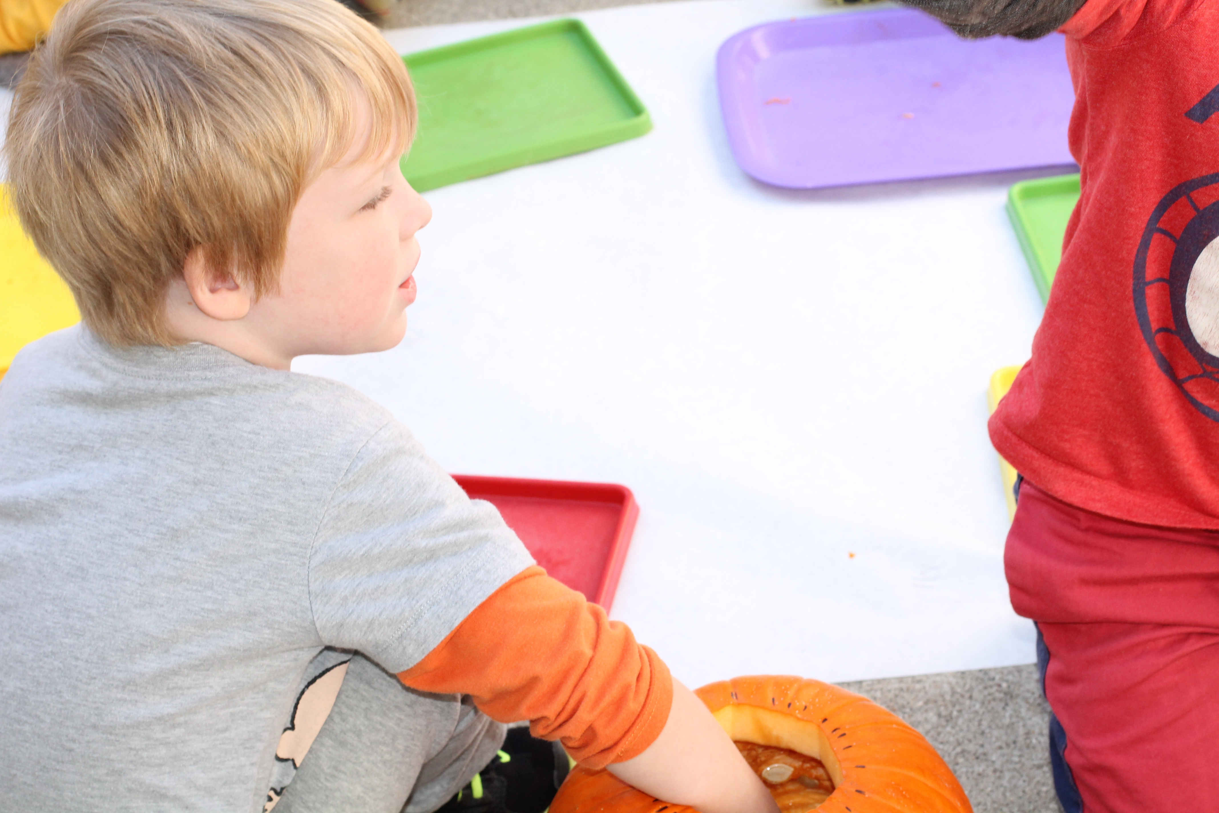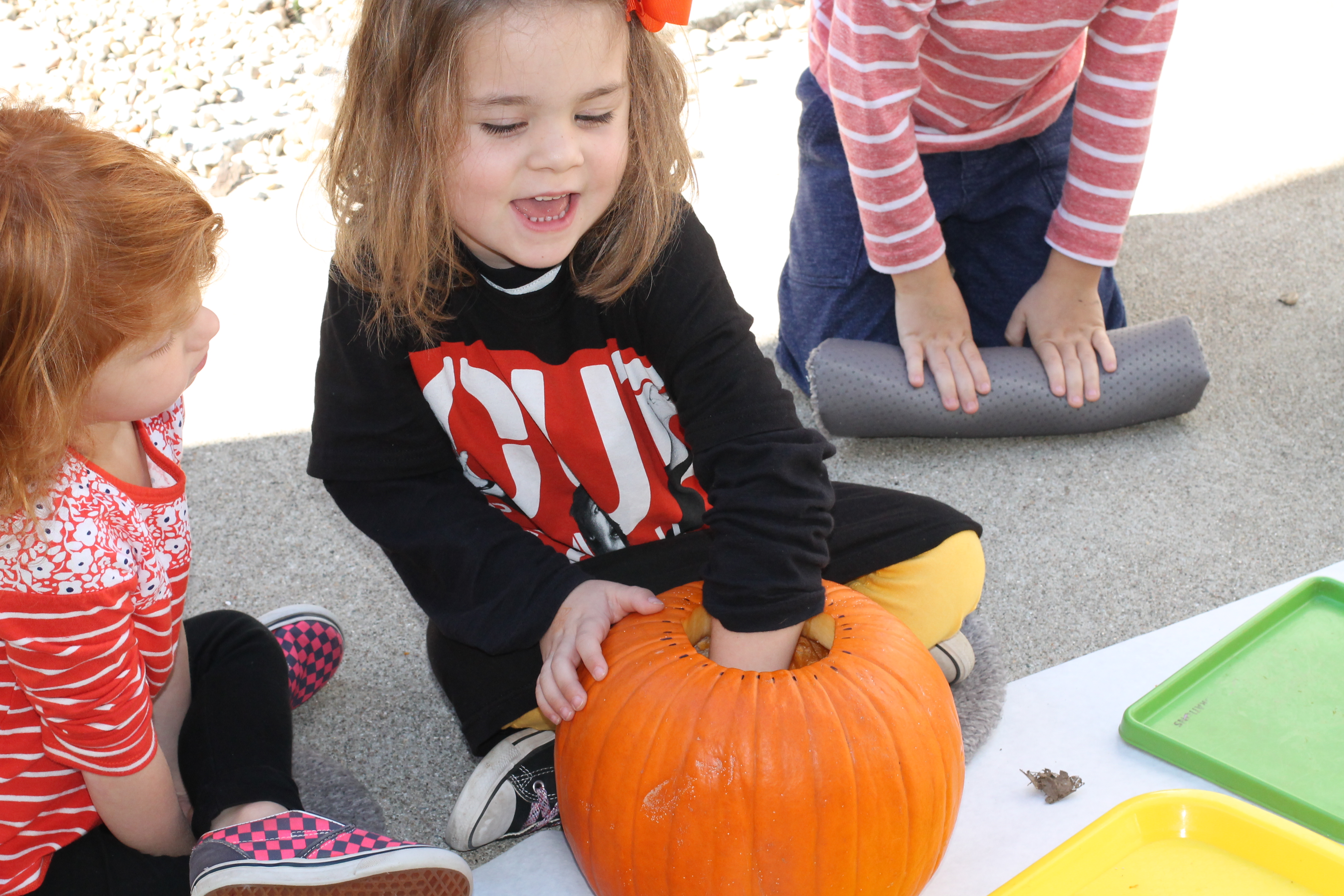 The afternoon preschool class explored a pumpkin this week! We measured it and talked about its characteristics (inside and out) using our 5 senses! The students took turns getting their hands dirty and pulling out some of the pumpkin seeds. We ended up roasting those seeds and eating them for snack!