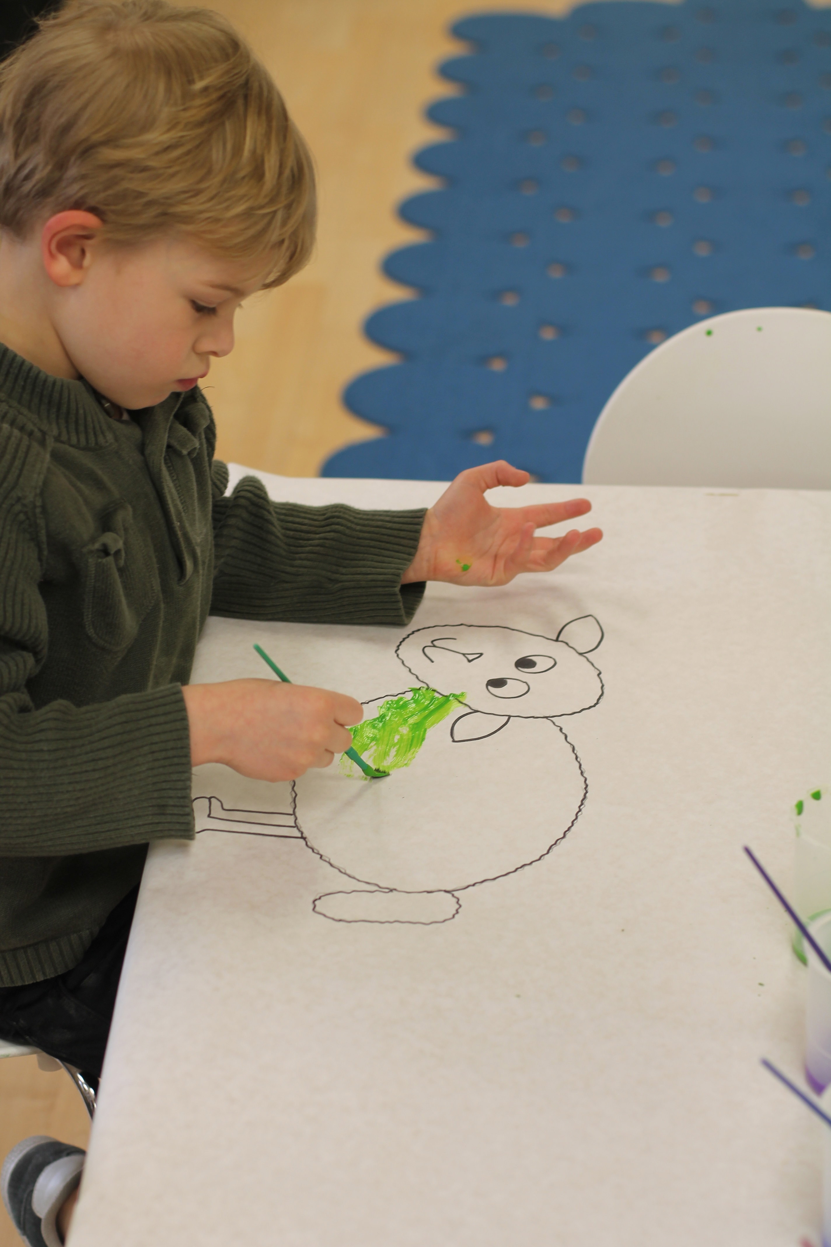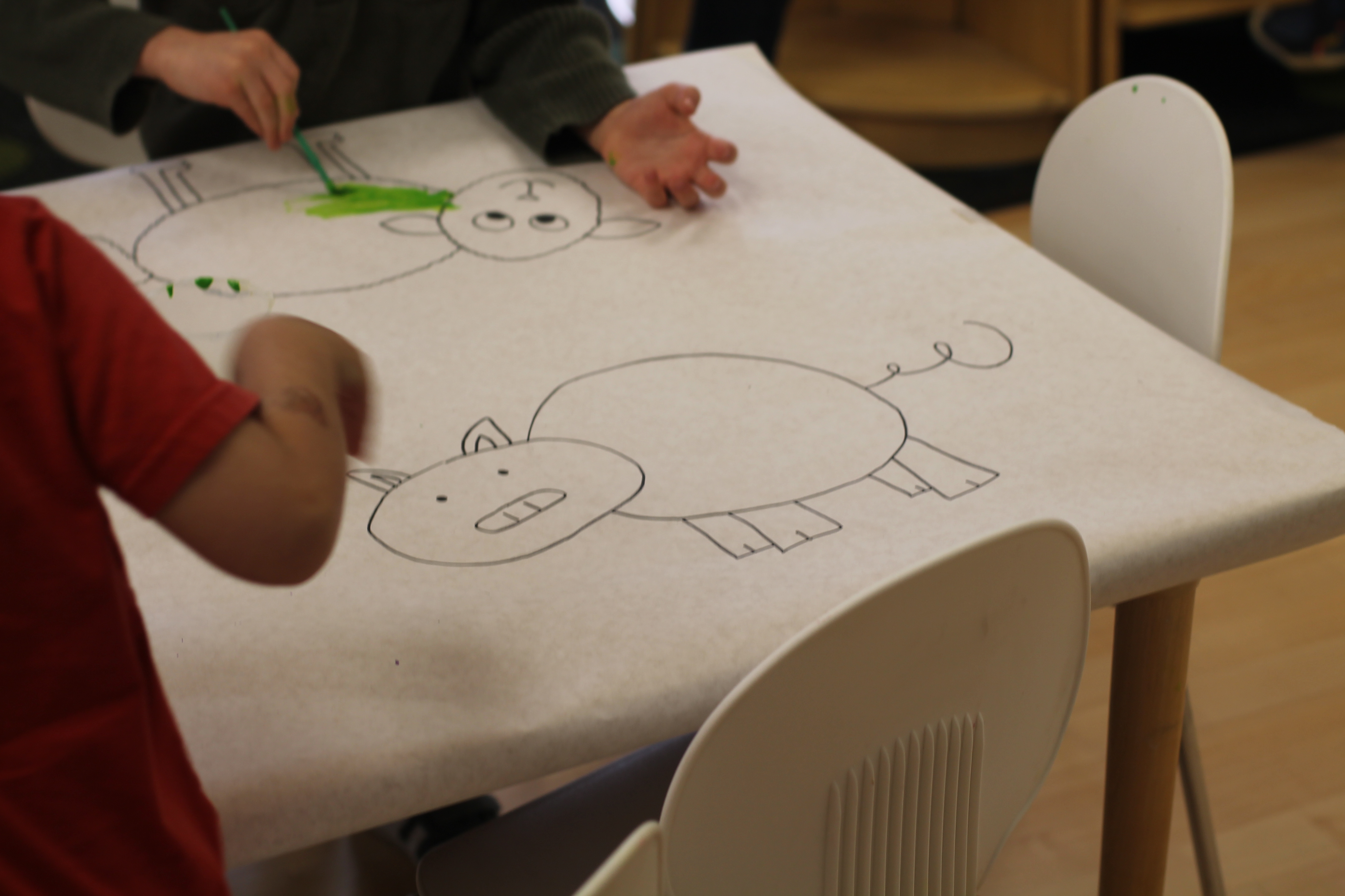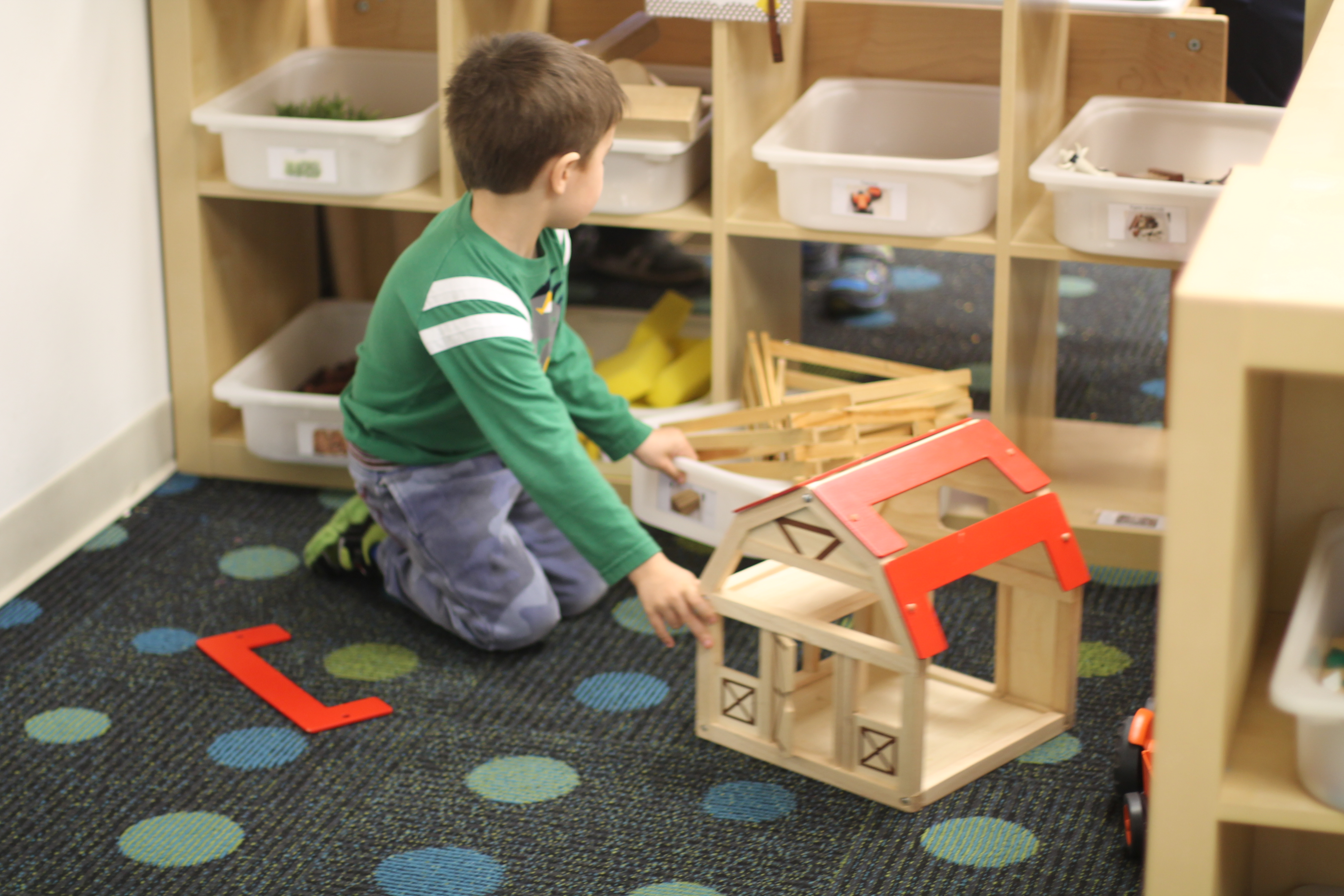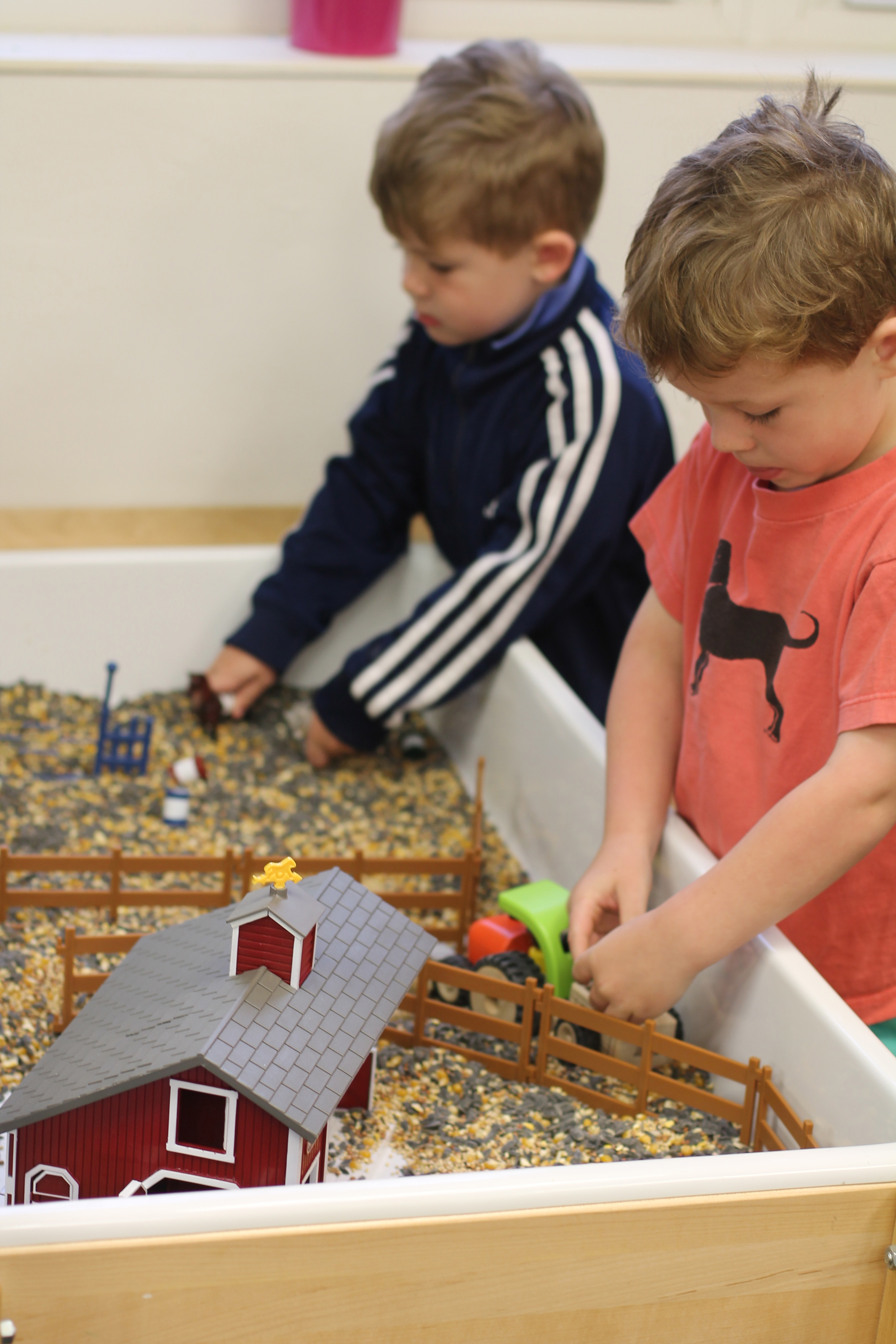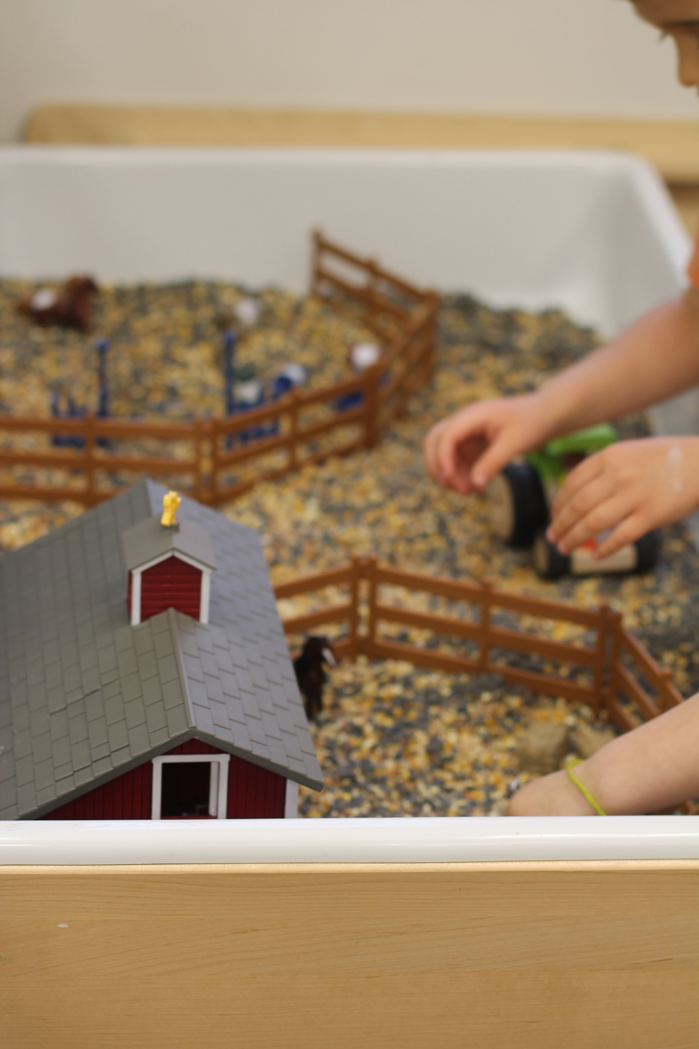 The toddlers utilized the farm theme to reinforce shape, color, counting, fine motor, and vocabulary skills.  We sang Old McDonald and read The Big Red Barn.  Our learning environment this month includes farm puzzles, toys, animals, and even a farmer’s market for pretend play.