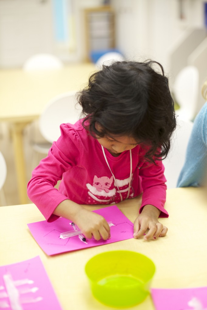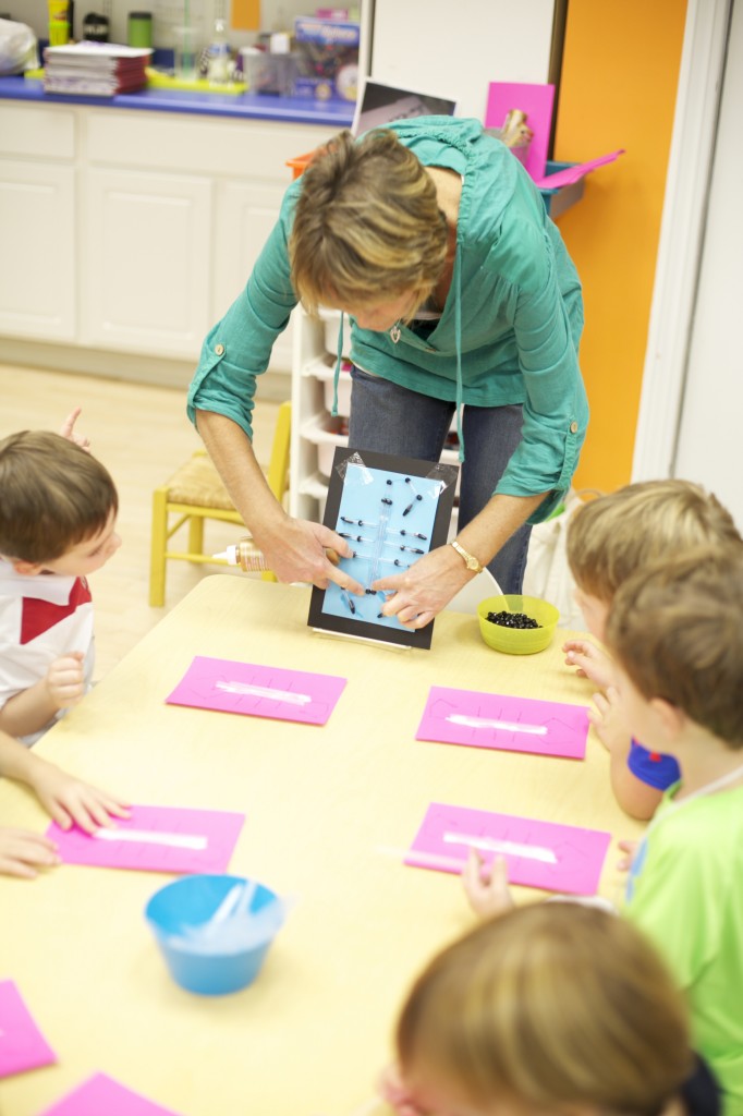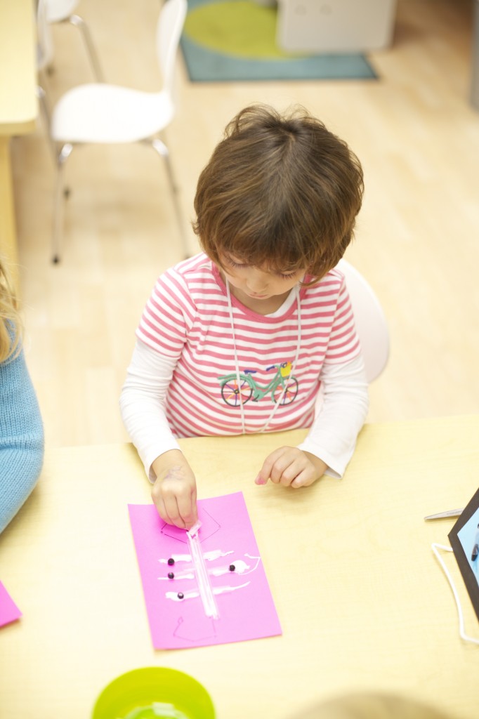 In Ms. Courtney’s group, the preschoolers practiced number recognition. On each gingerbread baby was a number. Their job was to count the right amount of pom poms to decorate the gingerbread baby. This is a great task for hand-eye coordination.