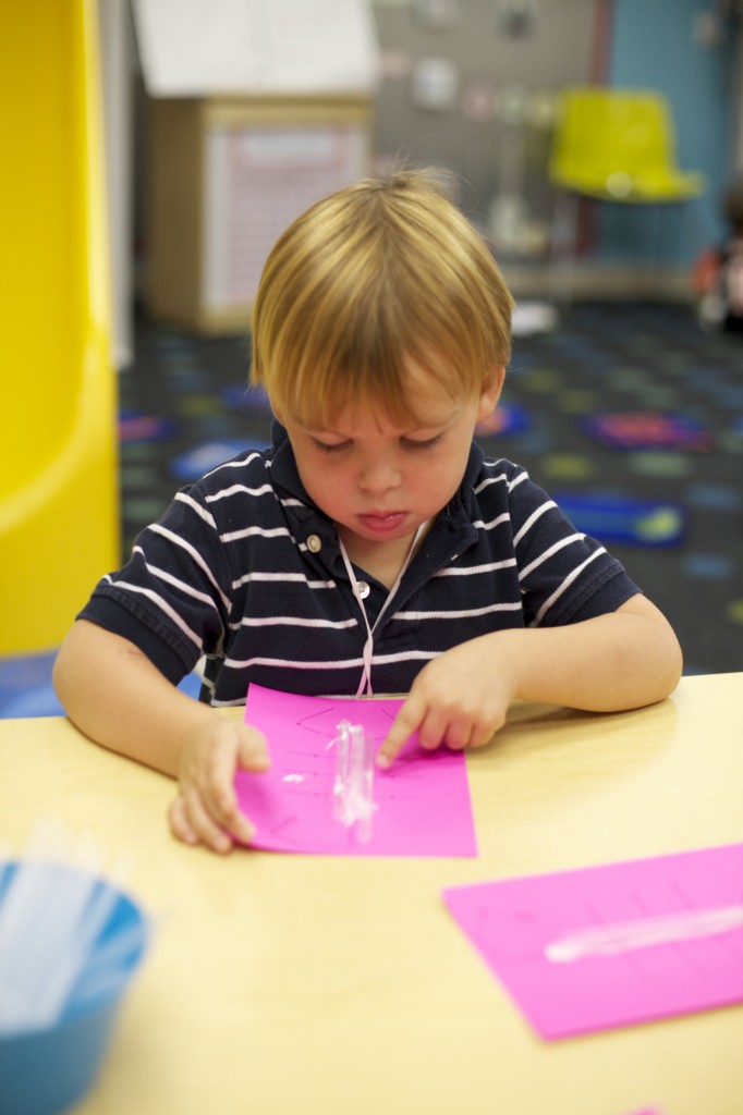 The Early 3’s know what ingredients you need for a good time! They made waves that they can keep forever in a plastic bottle. All you need it a water bottle with blue food coloring, some cool glitter and a little vegetable oil. Oh, and a good strong arm to shake the bottle and make the waves!