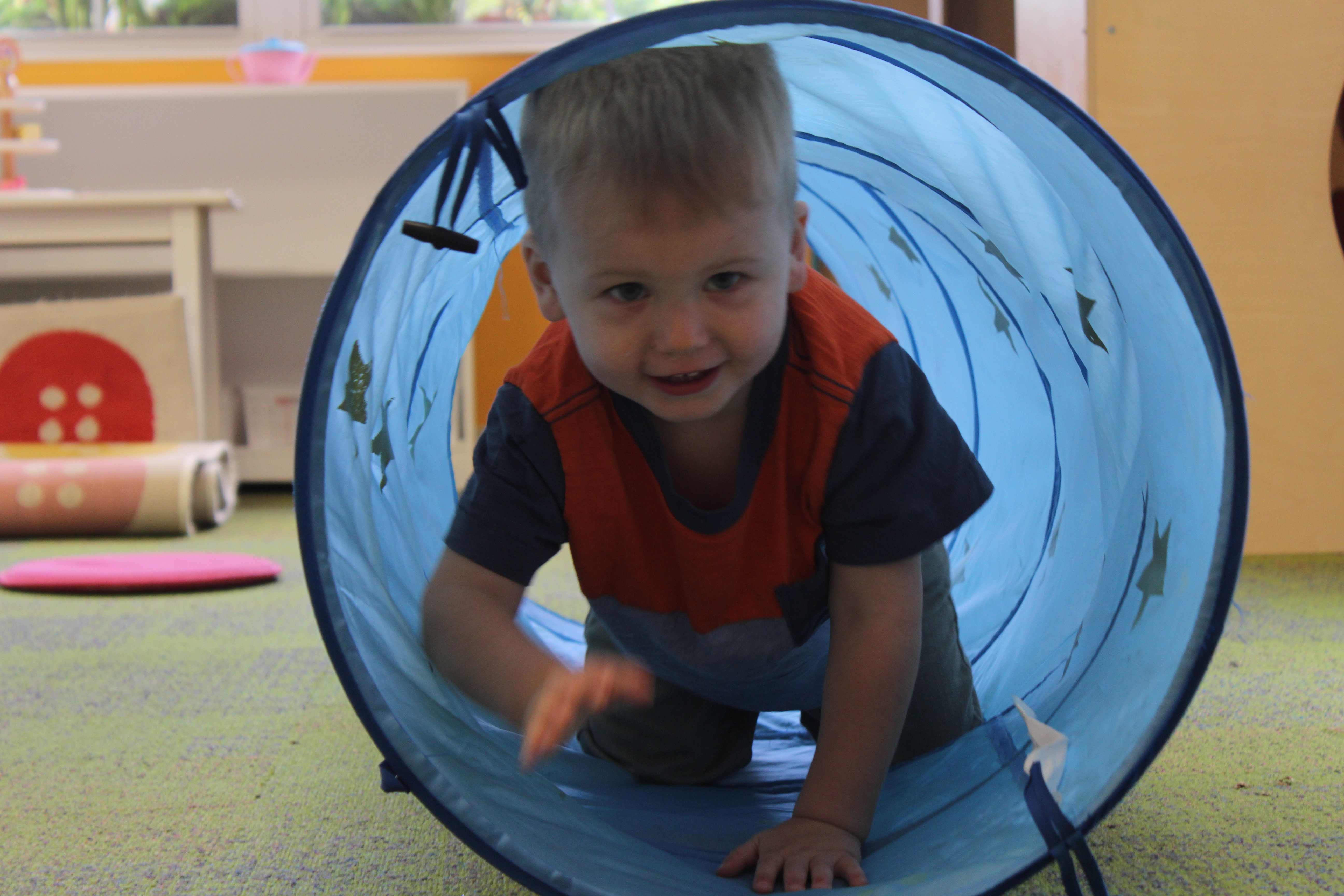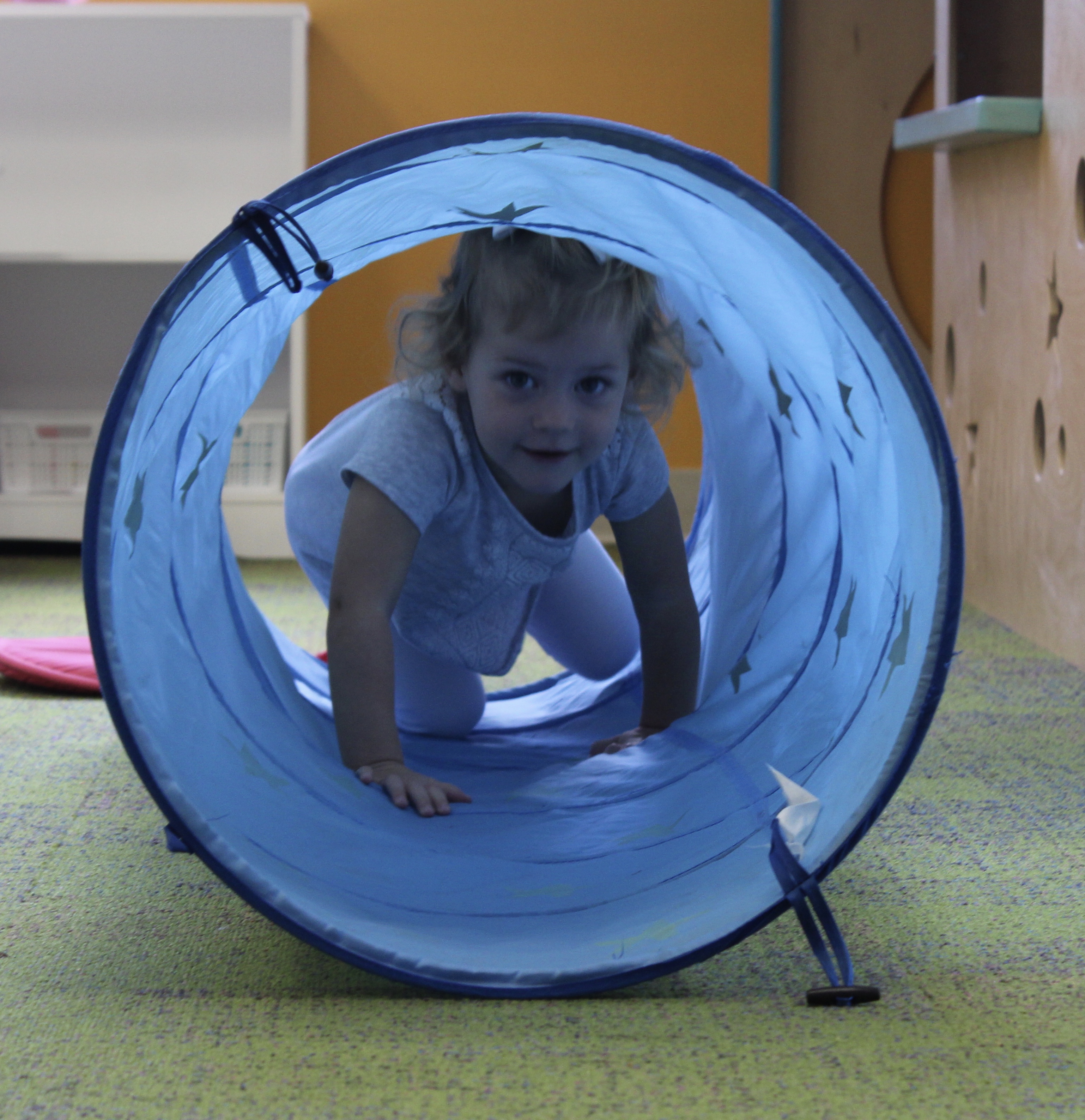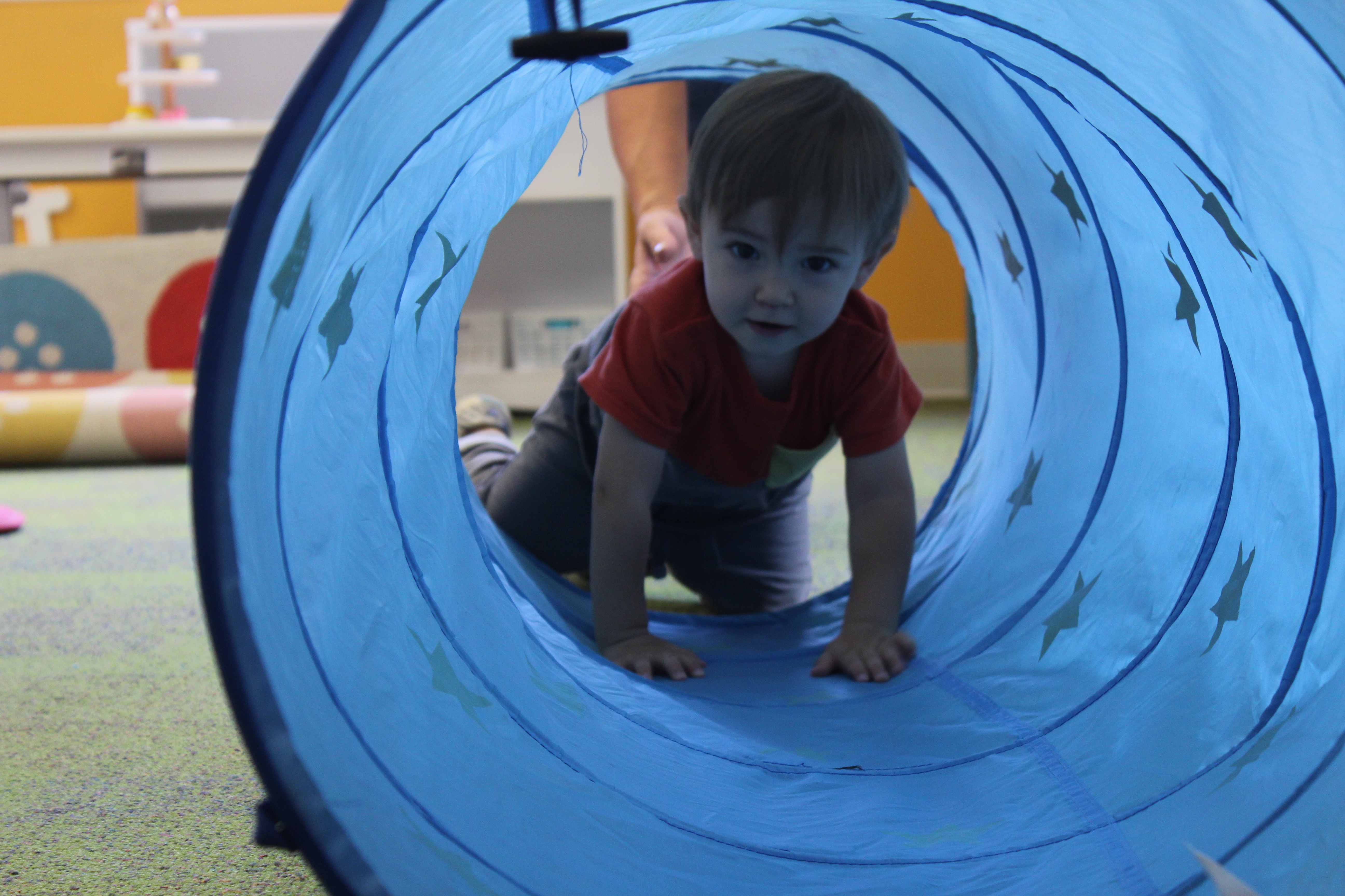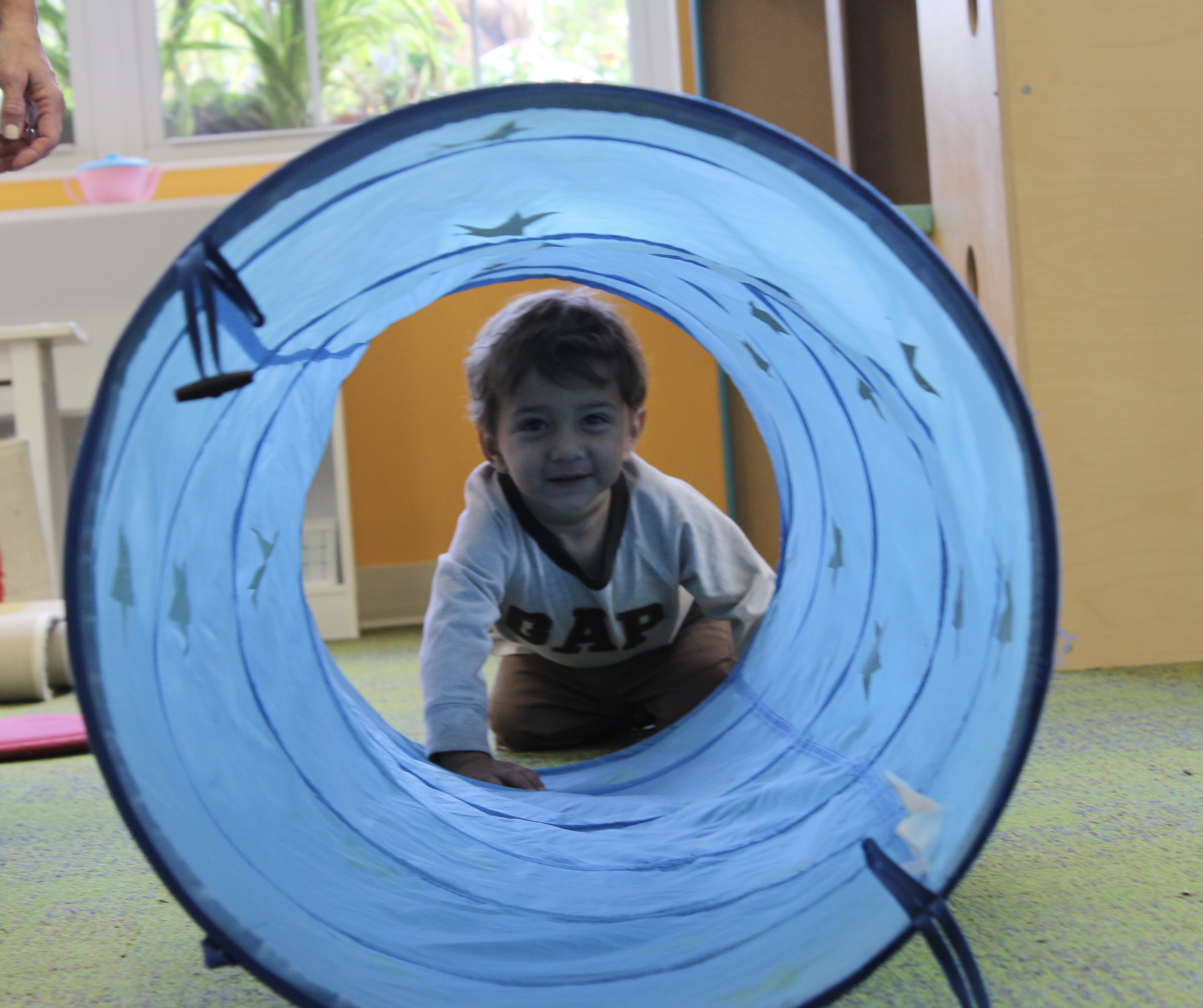 Learning positional words like over/under, on/off, and in/out is an important preschool skill. Not only do children develop spatial awareness by practicing these skills but they are also learning the fundamentals of early math.  Using positional words in connection with concrete objects and situations helps children develop vocabulary.  We had lots of fun this week learning the positional words IN and OUT as we took turns going IN the tunnel and coming OUT.