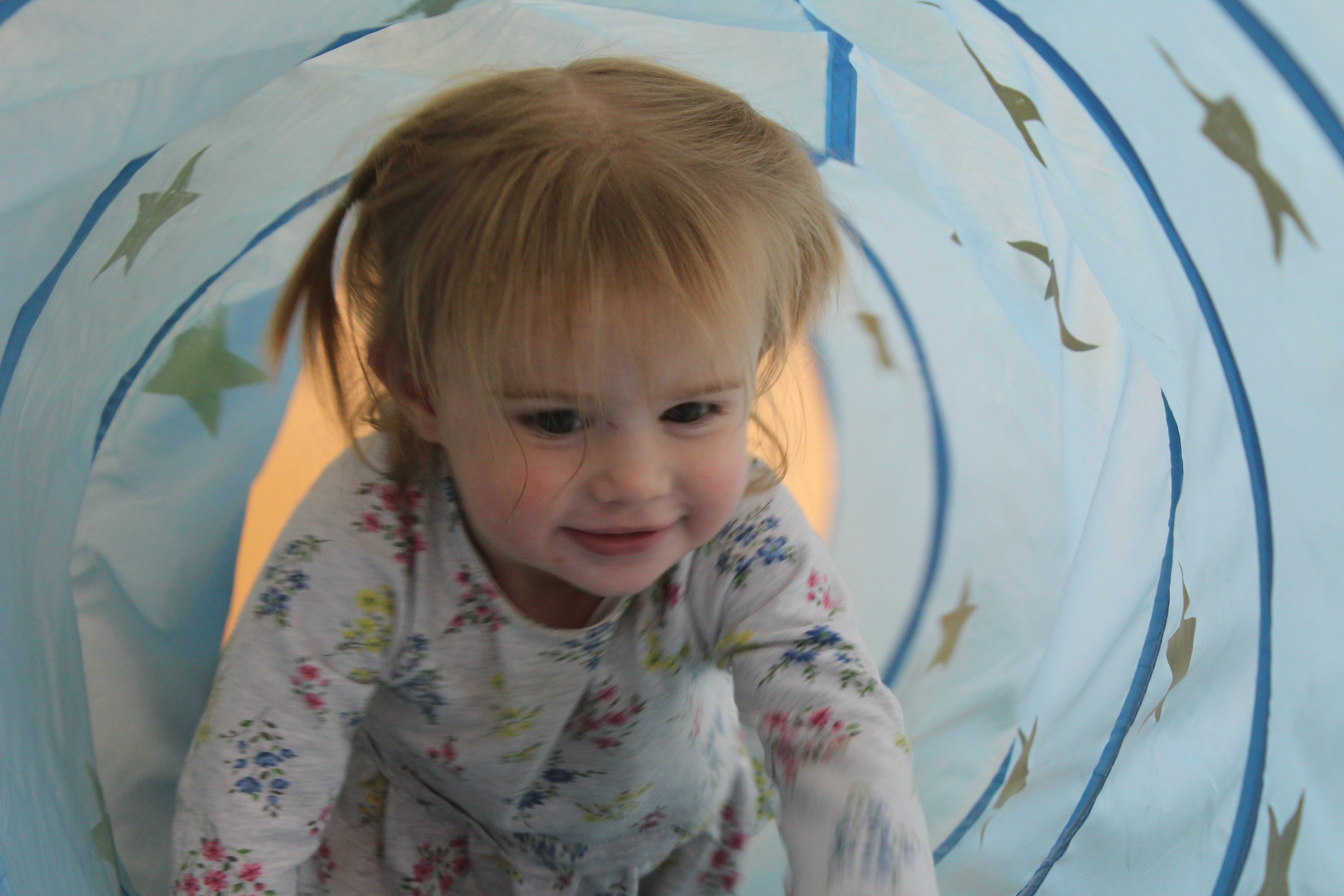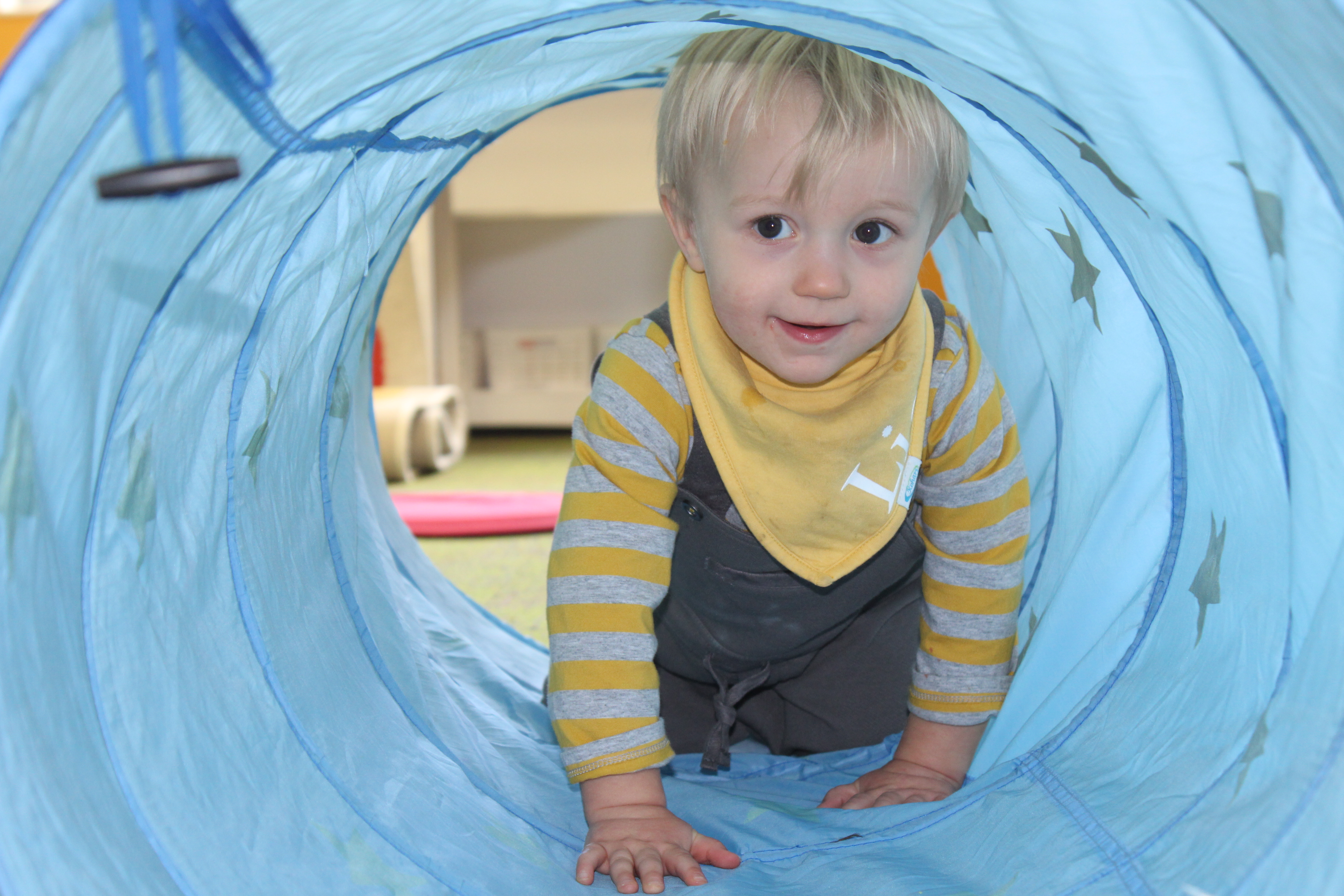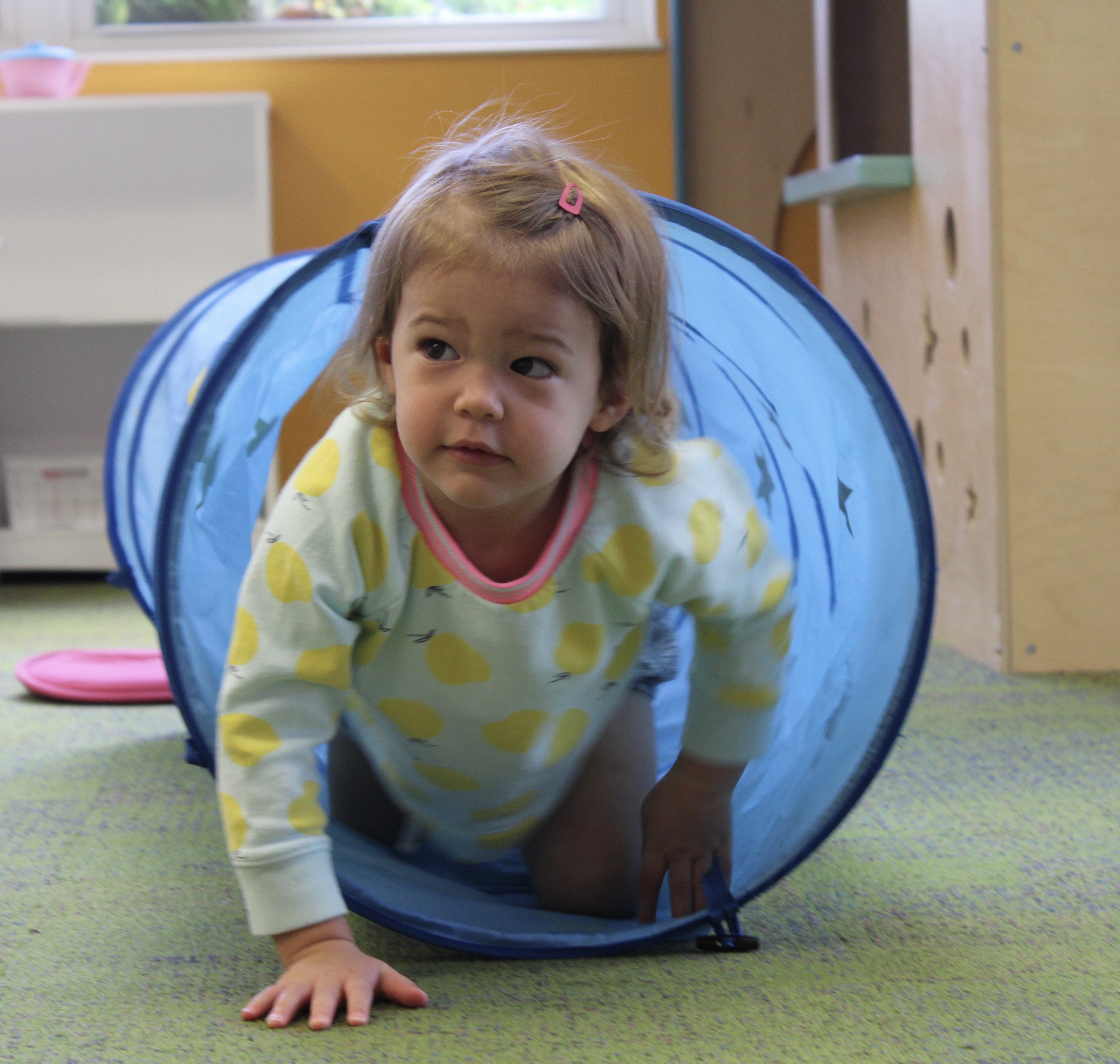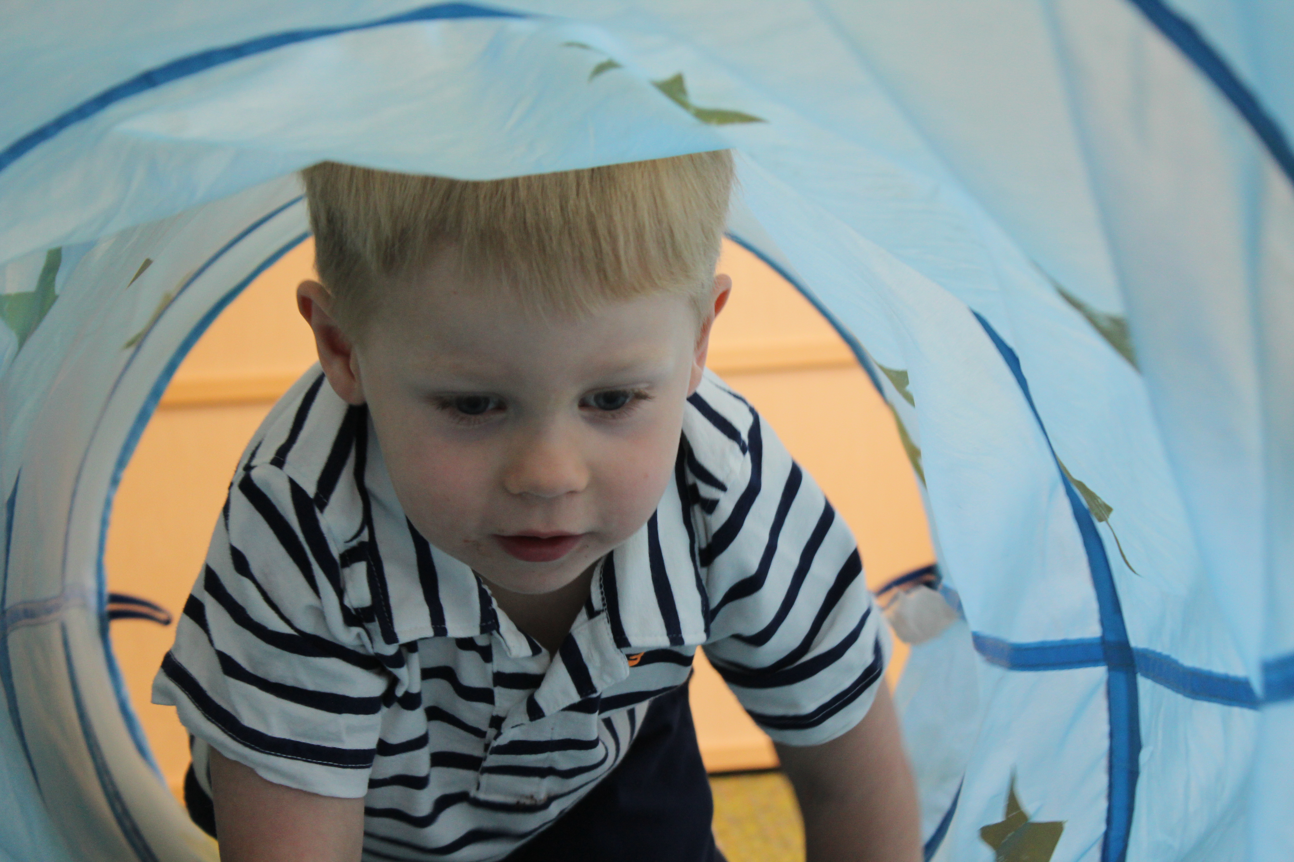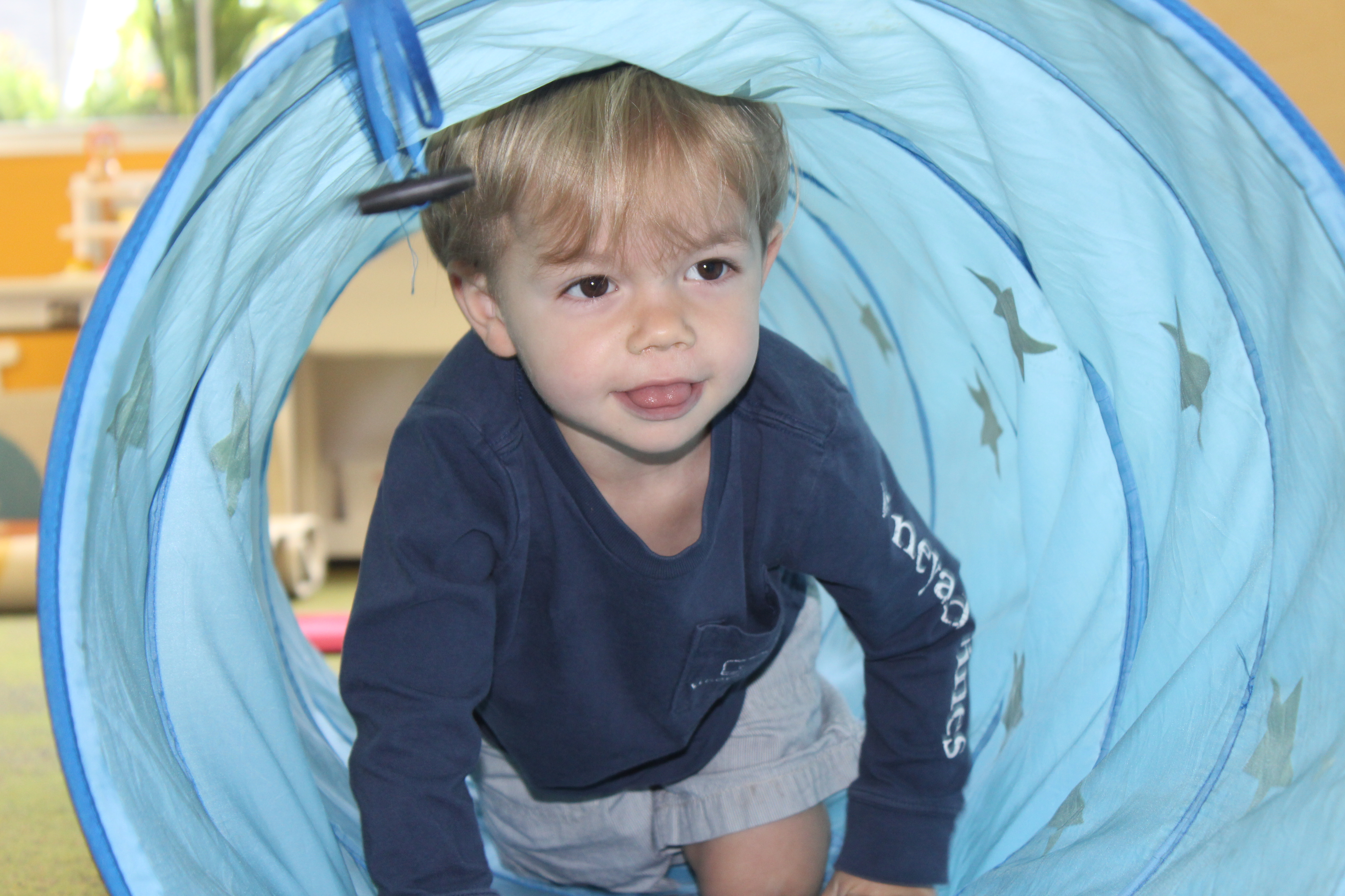 Learning positional words like over/under, on/off, and in/out is an important preschool skill. Not only do children develop spatial awareness by practicing these skills but they are also learning the fundamentals of early math.  Using positional words in connection with concrete objects and situations helps children develop vocabulary.  We had lots of fun this week learning the positional words IN and OUT as we took turns going IN the tunnel and coming OUT.