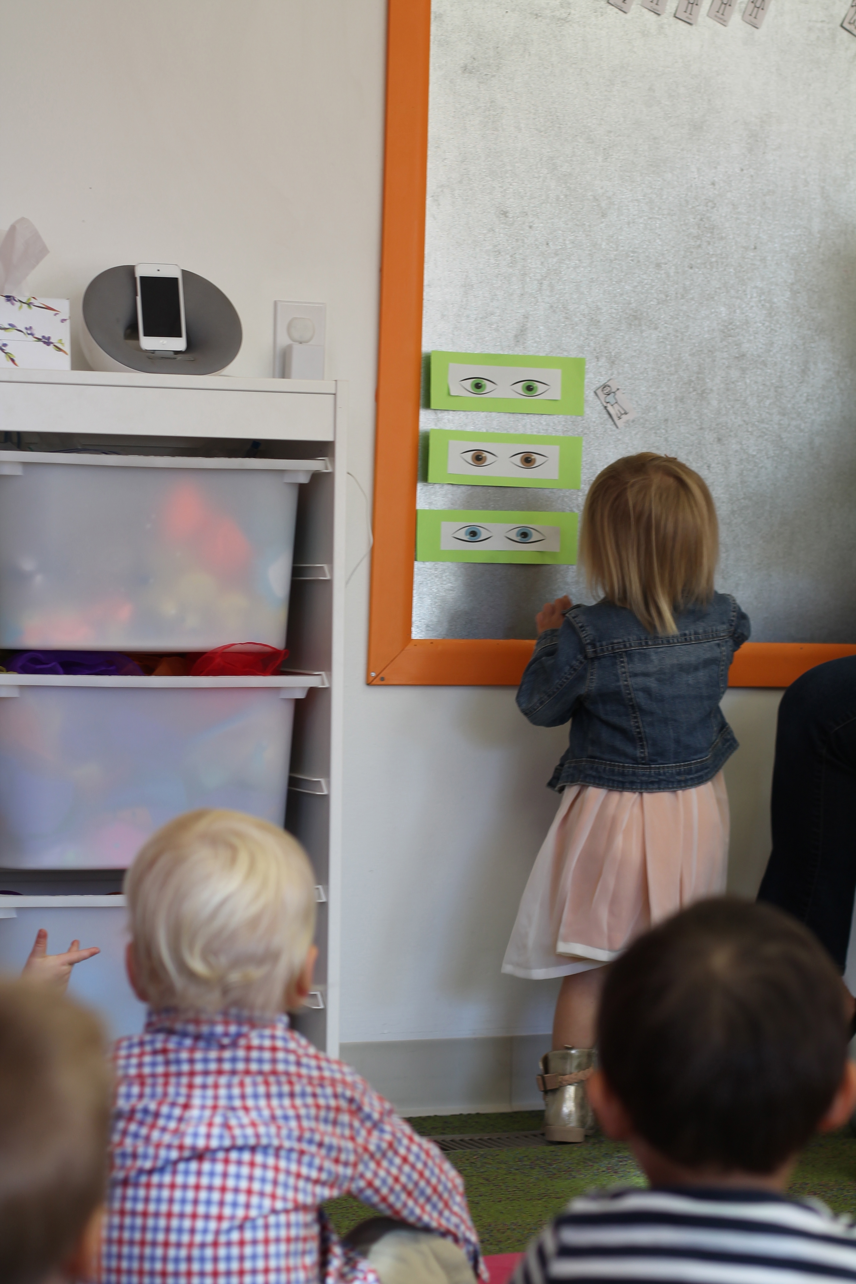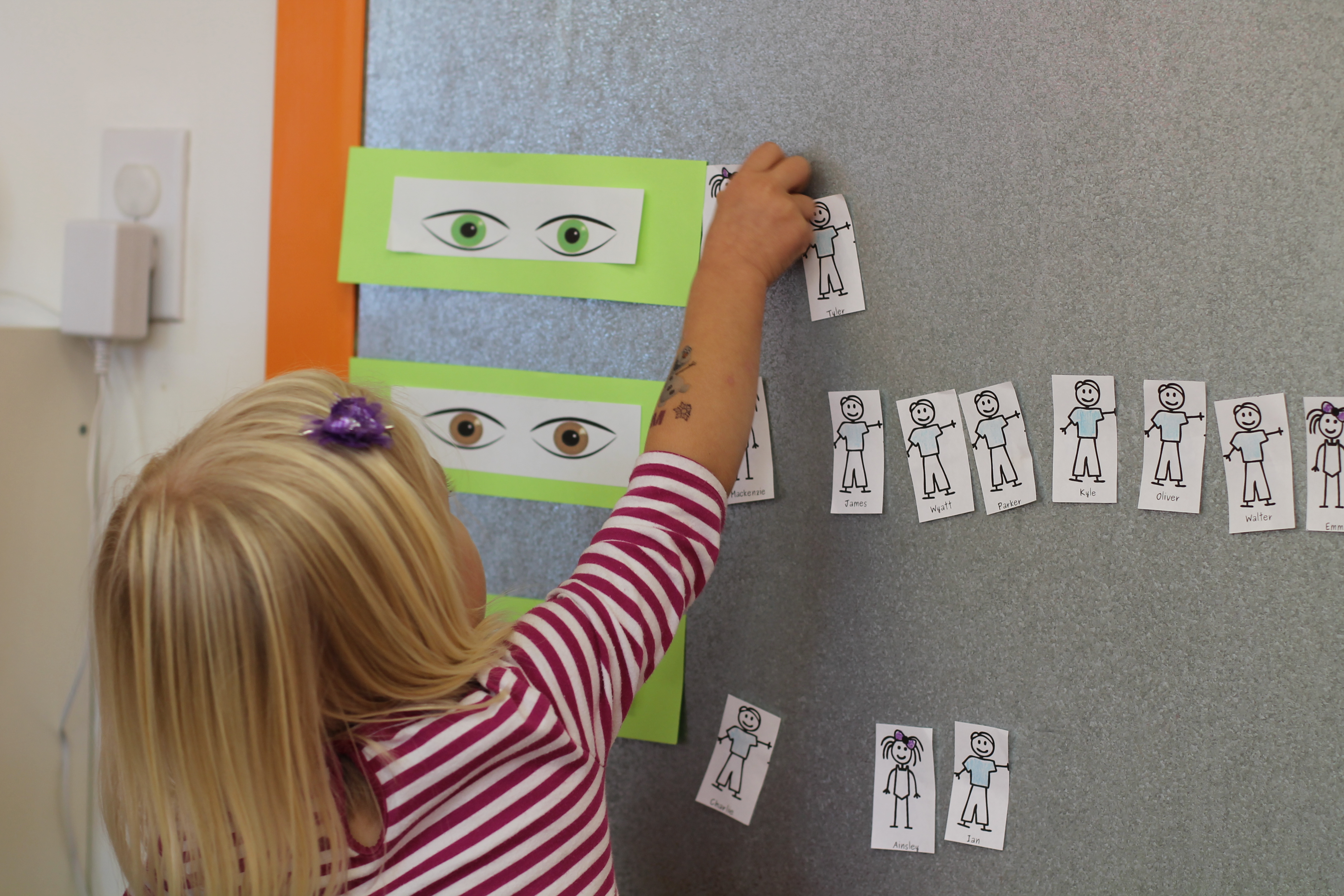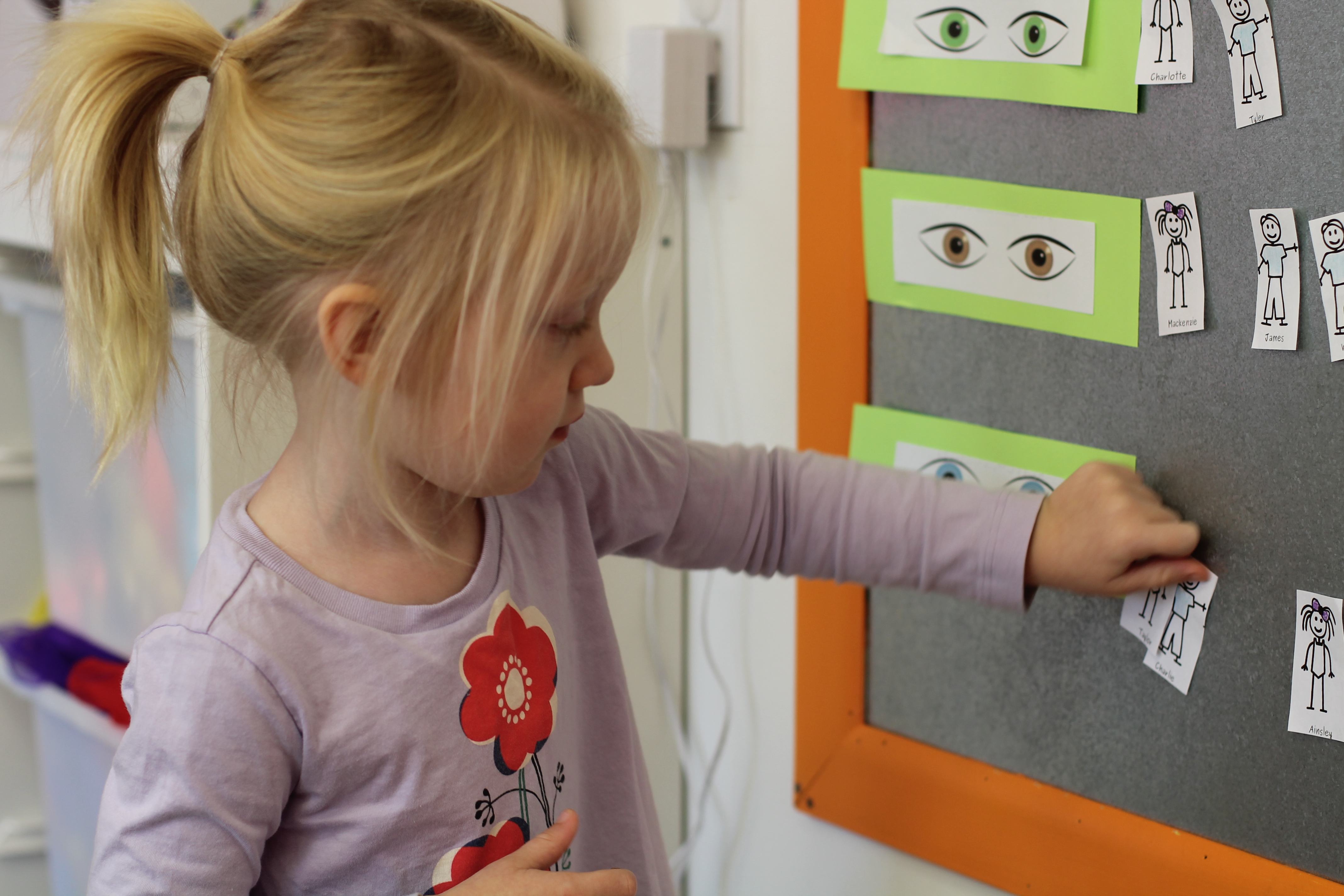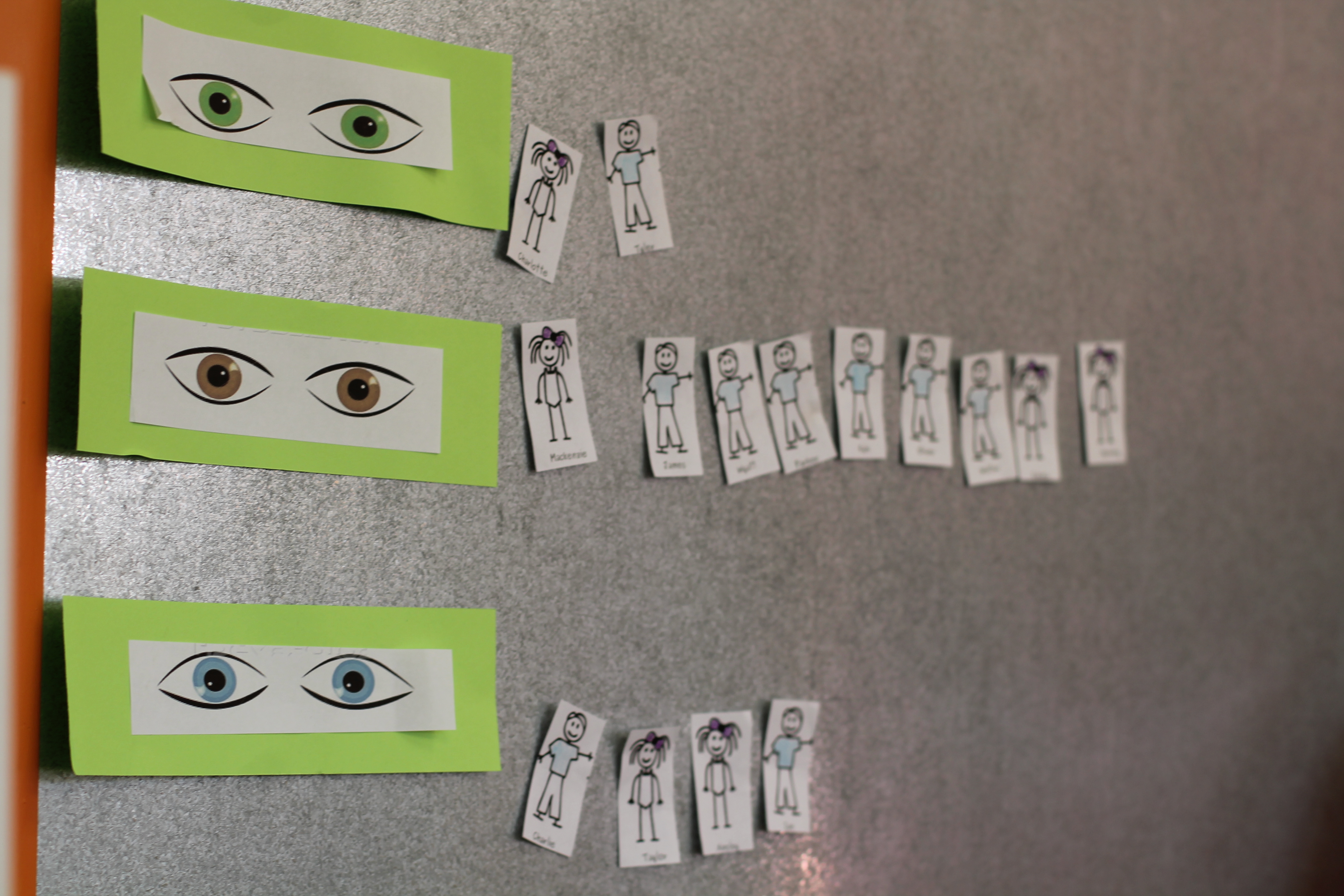 During group time we are reading We are all alike…We are all different by the Cheltenham Elementary School Kindergartners. Today we talked about how we are all alike because we all have eyes but we are also different because are eyes are different colors. The children had a chance to come up to the board and put their name next to brown eyes, green eyes or blue eyes.