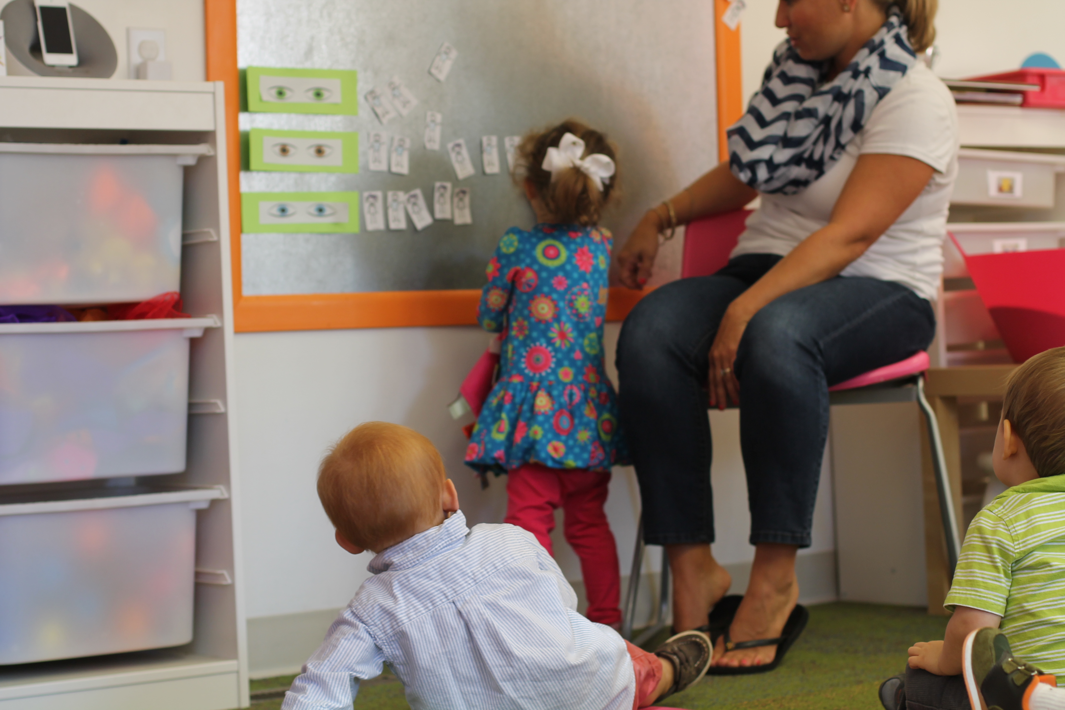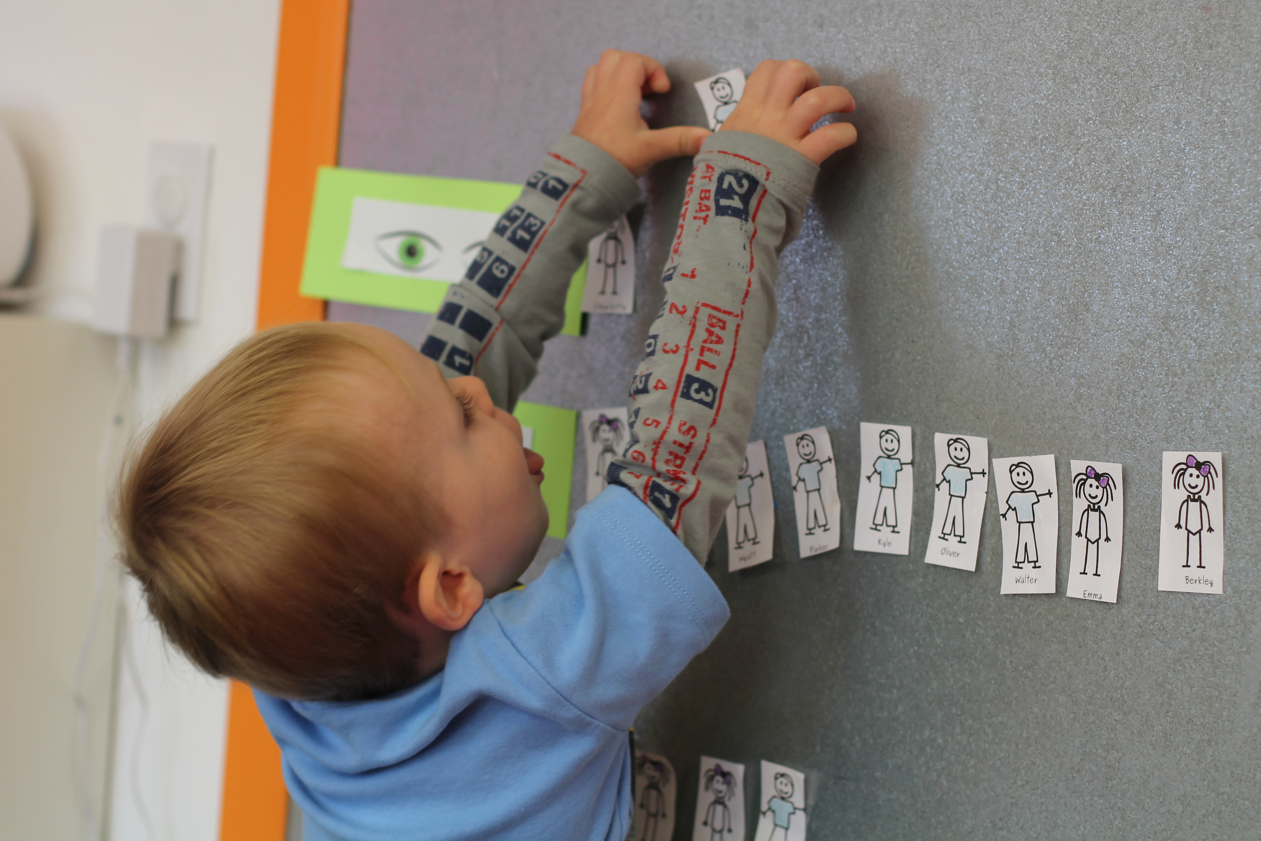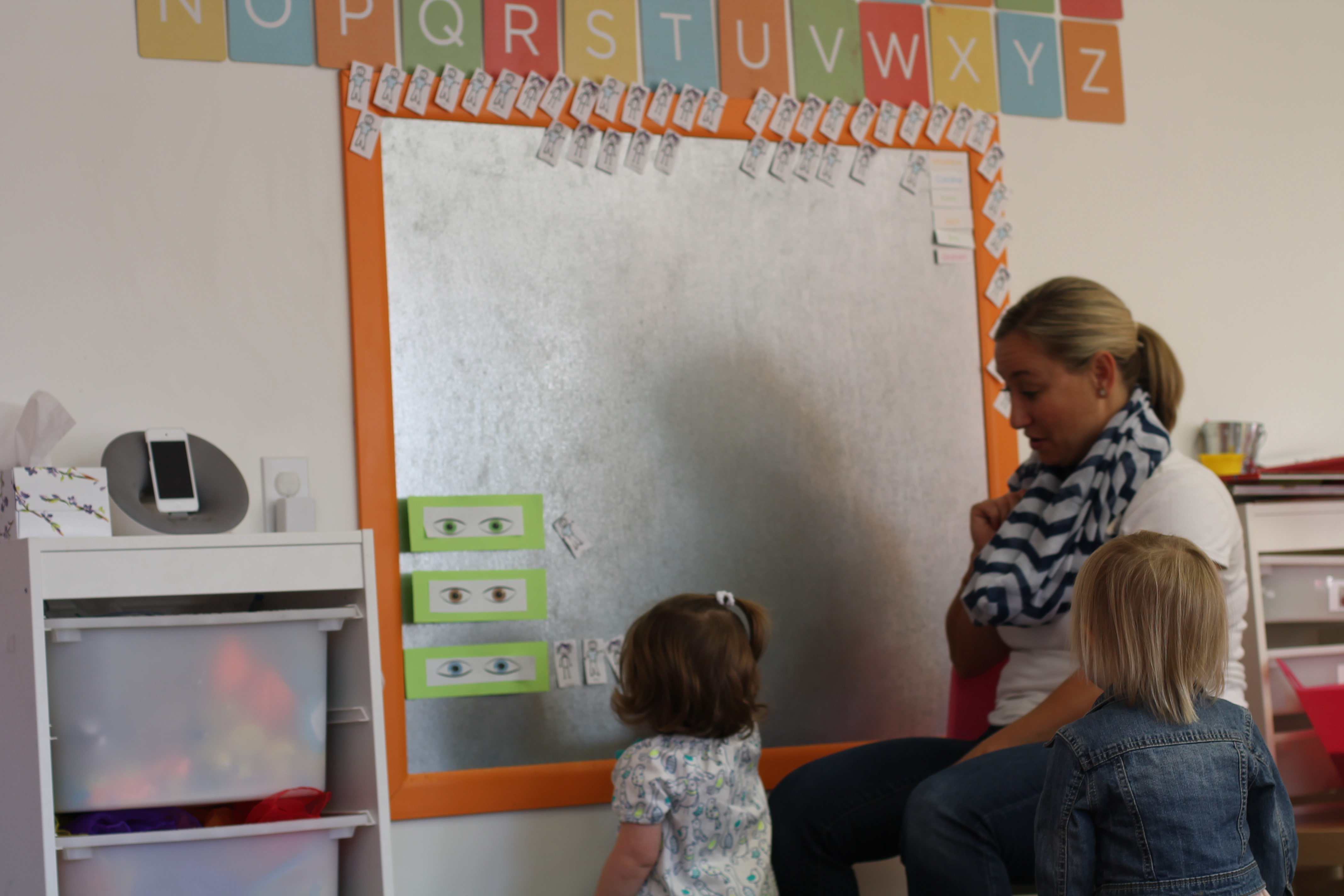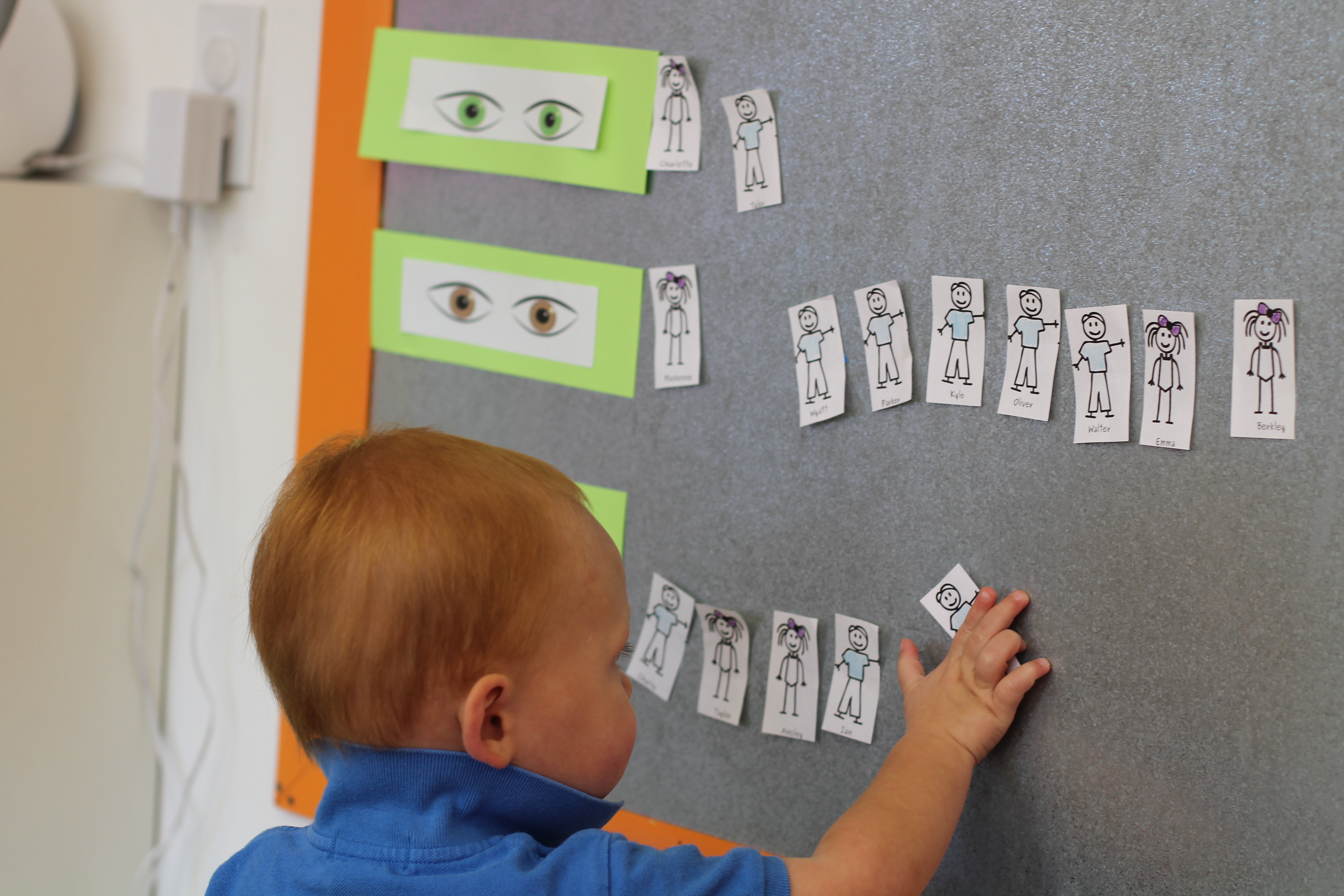 During group time we are reading We are all alike…We are all different by the Cheltenham Elementary School Kindergartners. Today we talked about how we are all alike because we all have eyes but we are also different because are eyes are different colors. The children had a chance to come up to the board and put their name next to brown eyes, green eyes or blue eyes.