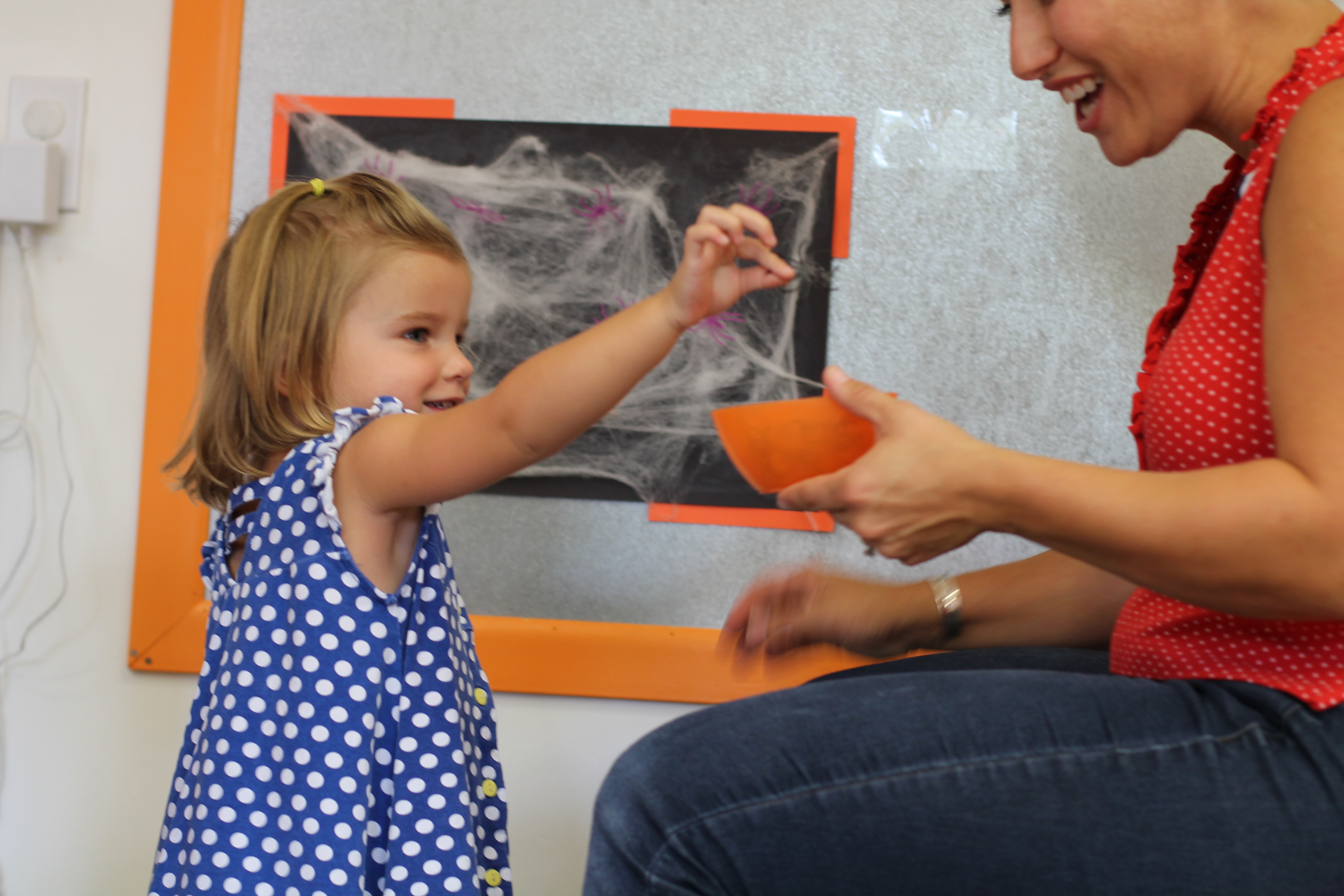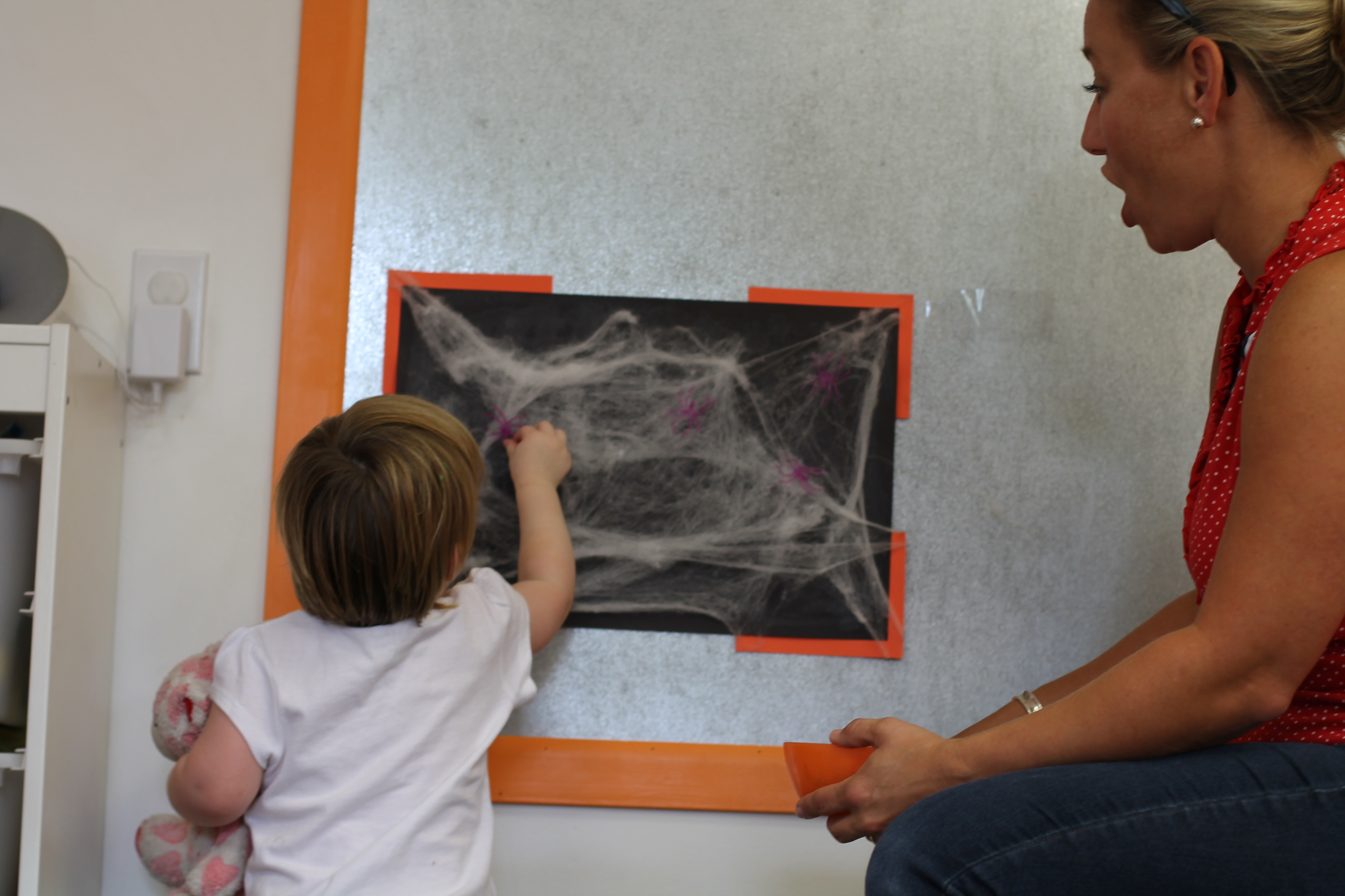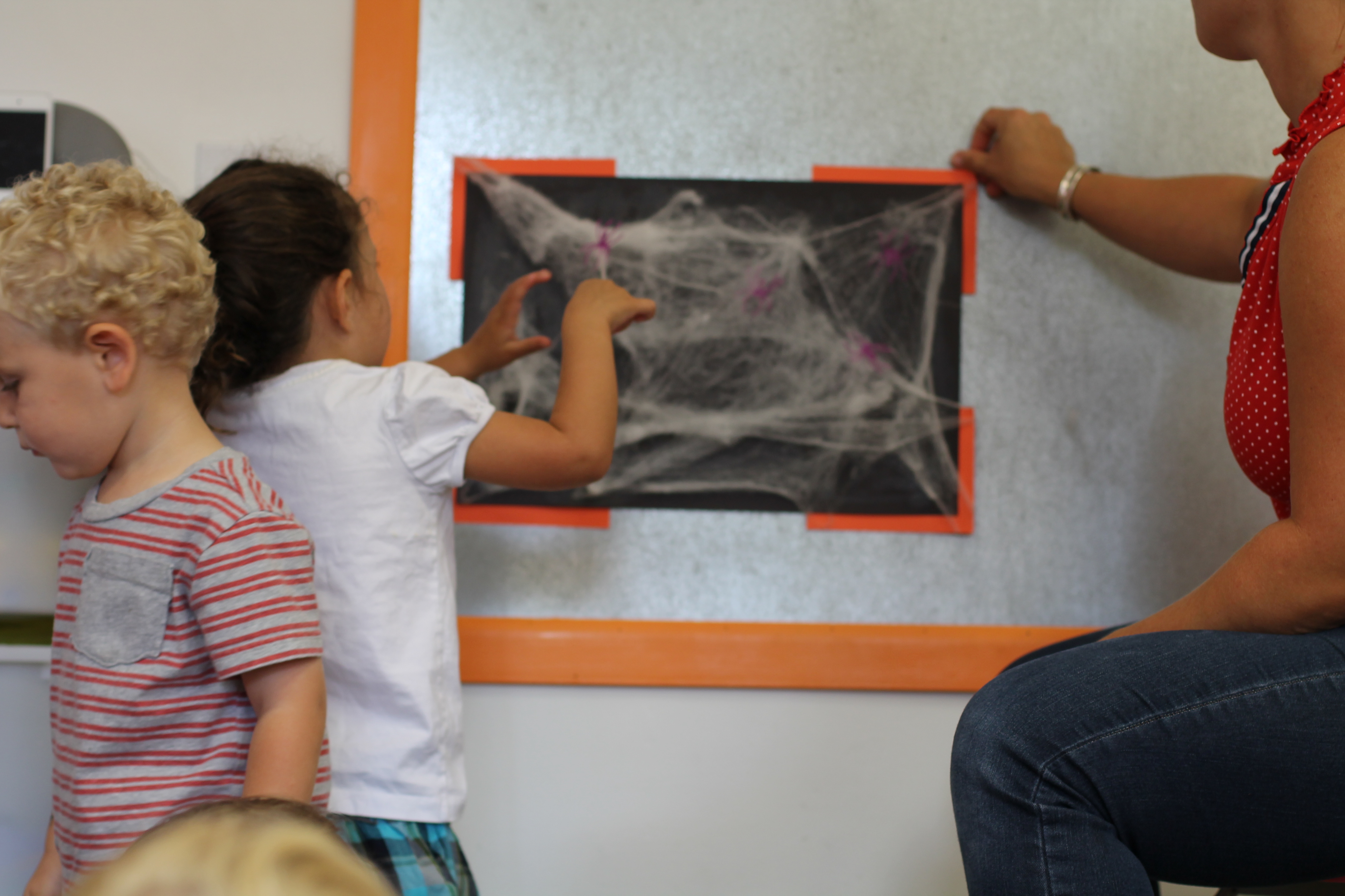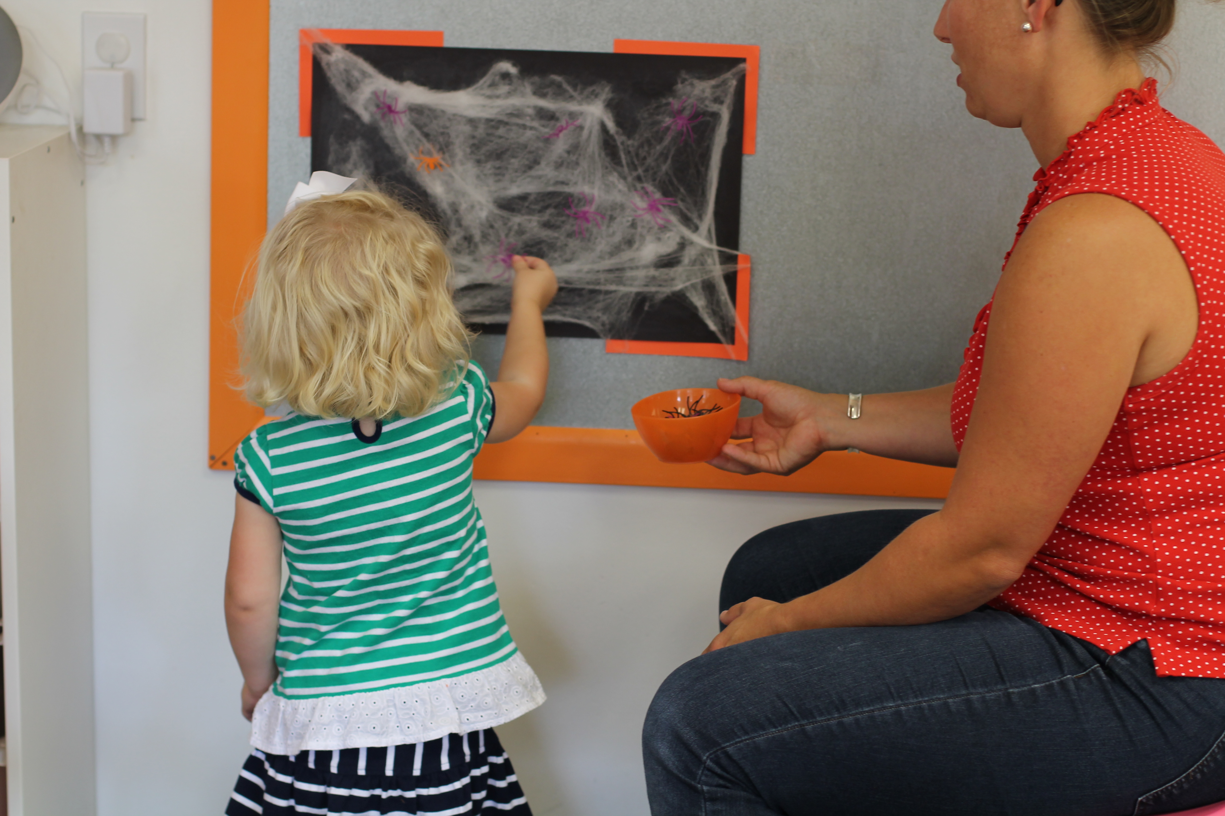 We are introducing spiders this month! In the toddler room, we have fun doing activities that engage the boys and girls with developing their fine motor skills. With this activity the children had a chance to put the spiders on the web and take them off. Some of the boys and girls did not even want to touch the spiders! It was a very sticky web!