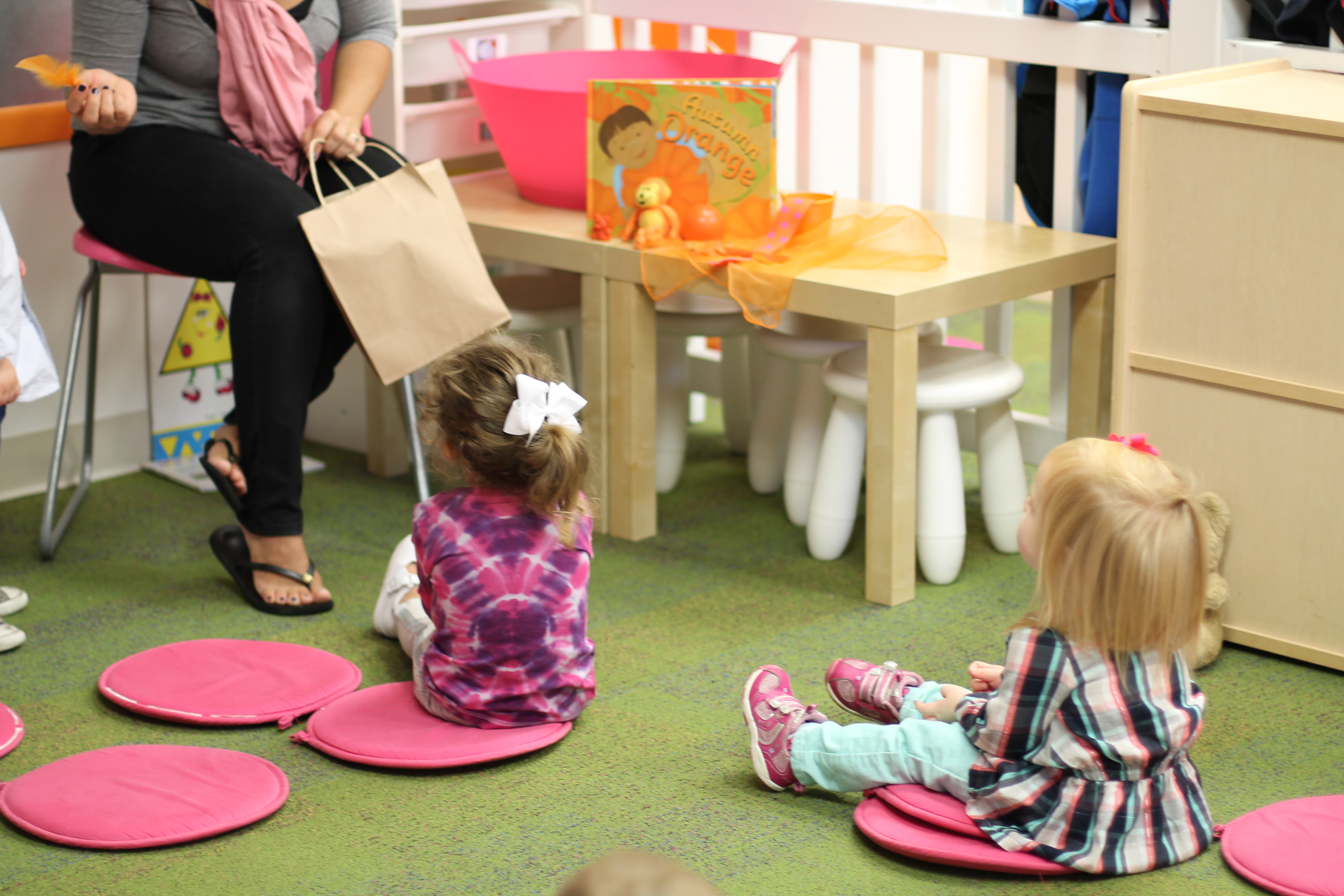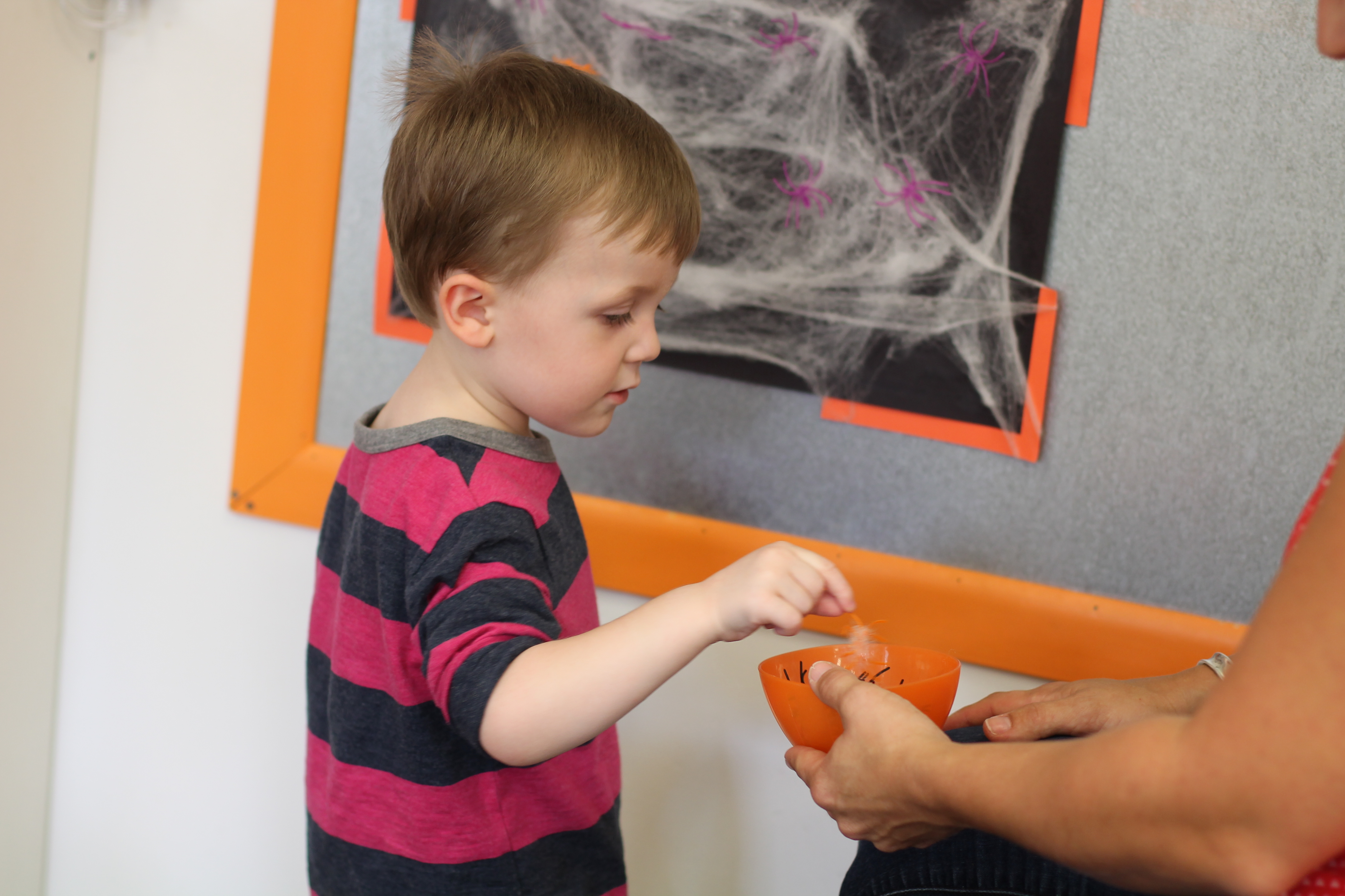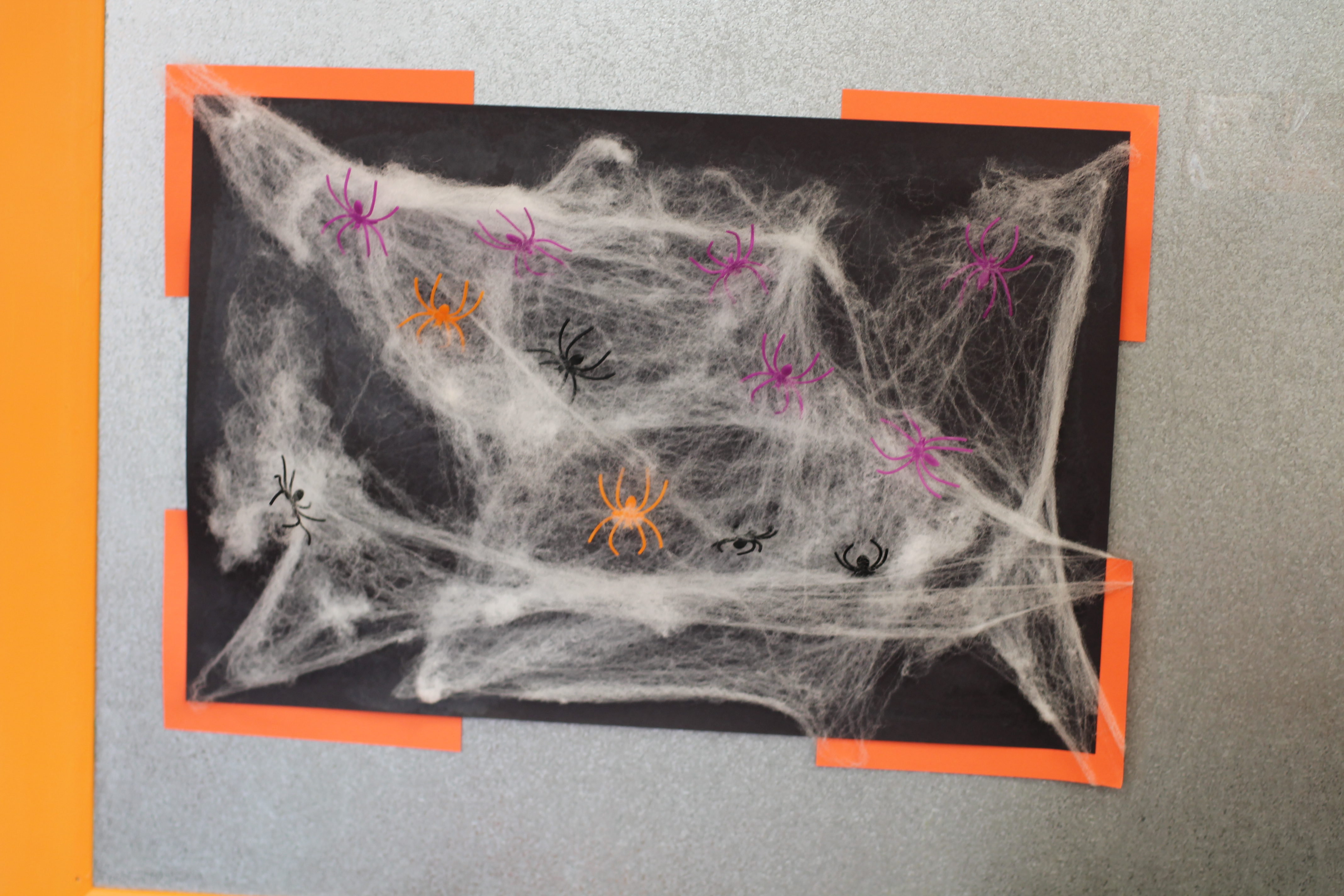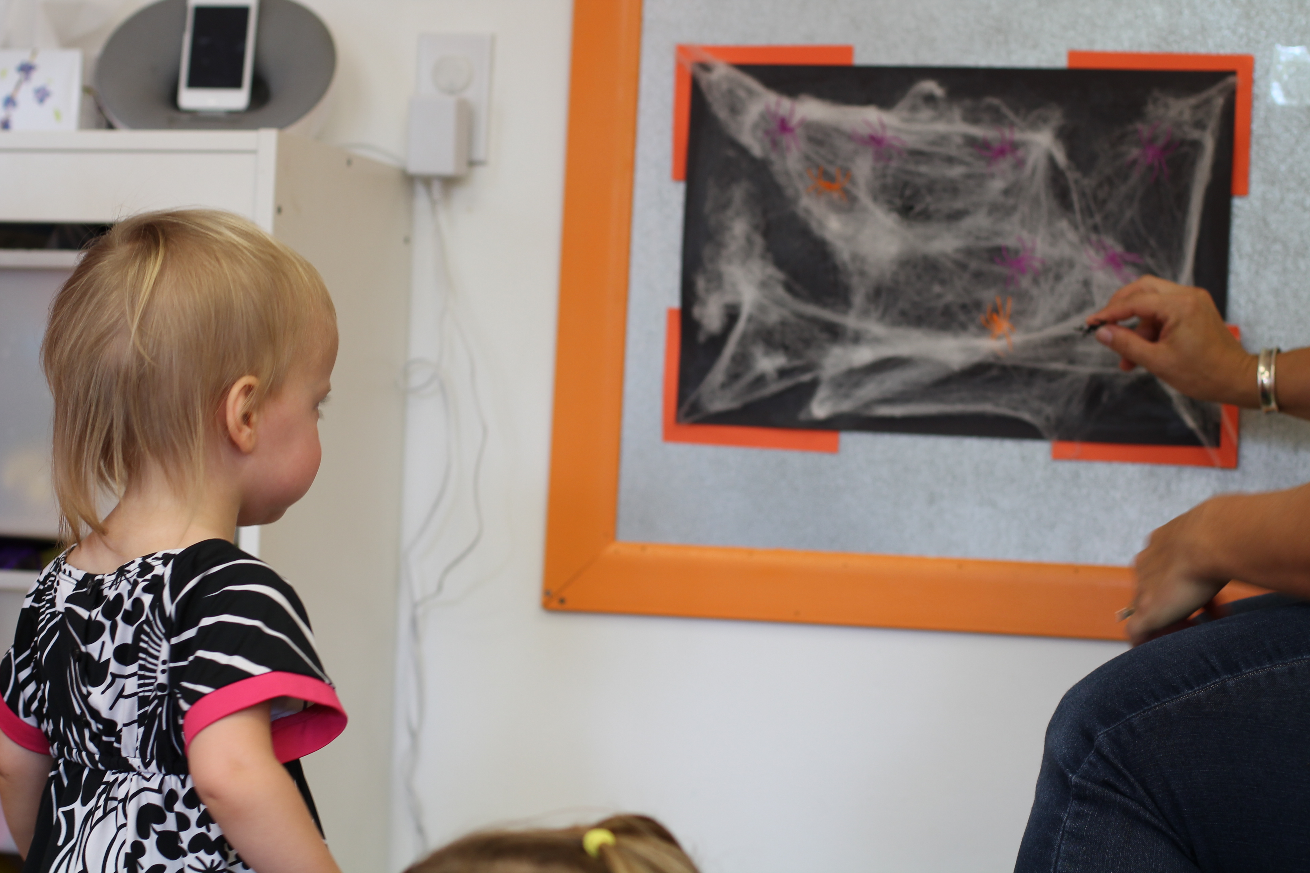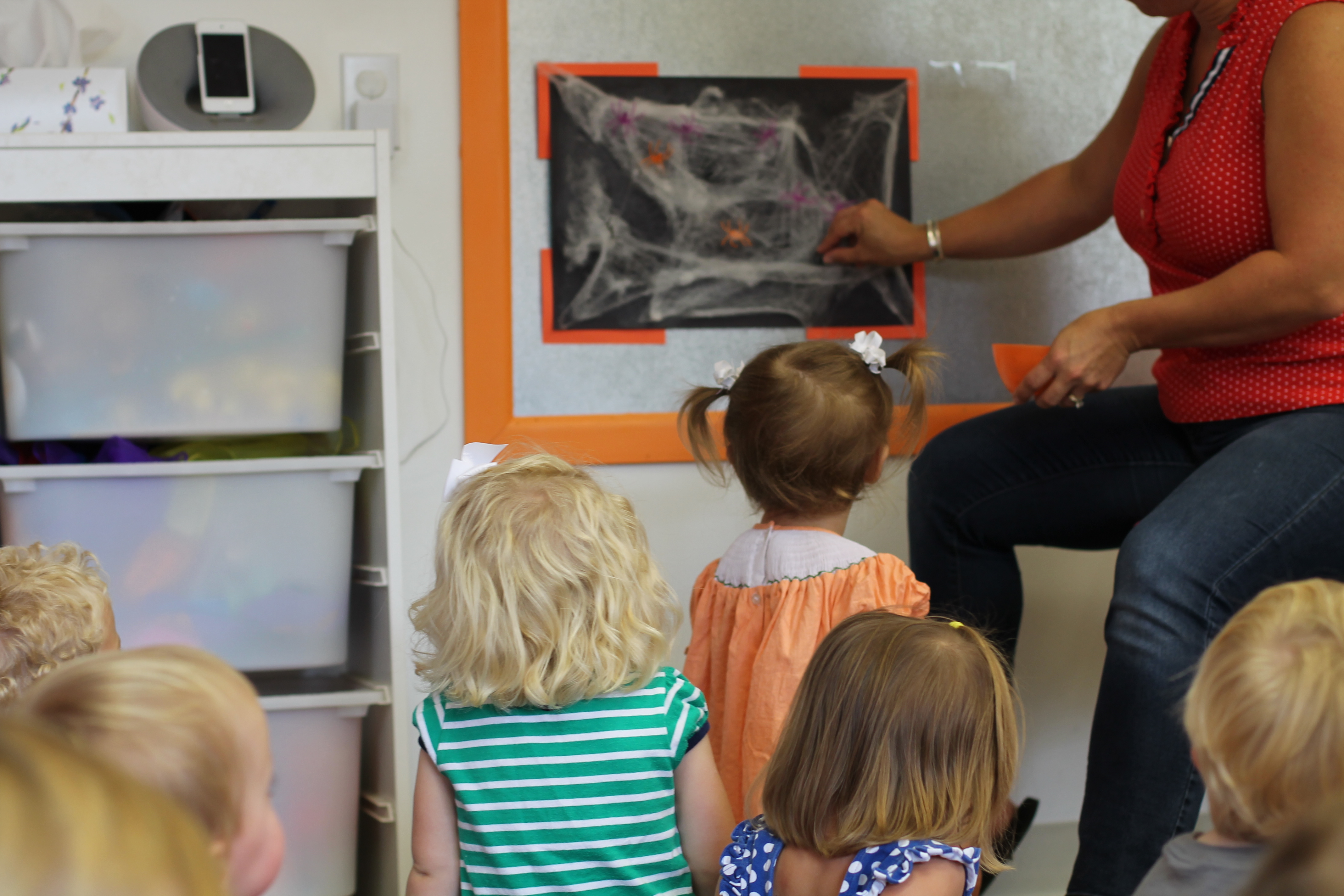 We are introducing spiders this month! In the toddler room, we have fun doing activities that engage the boys and girls with developing their fine motor skills. With this activity the children had a chance to put the spiders on the web and take them off. Some of the boys and girls did not even want to touch the spiders! It was a very sticky web!