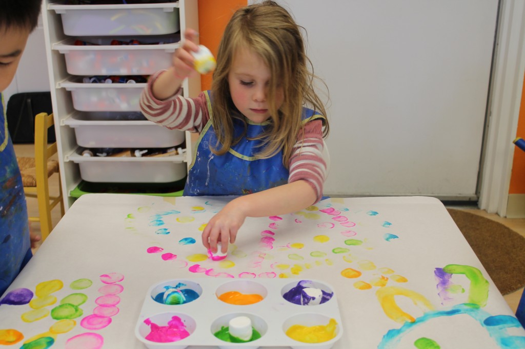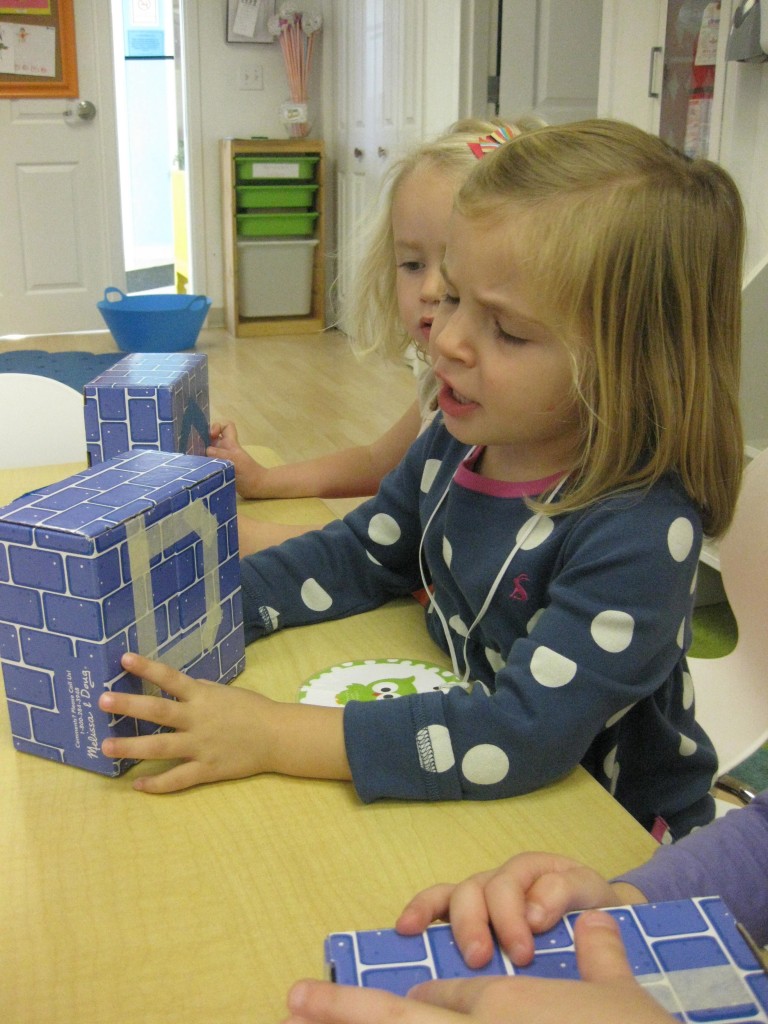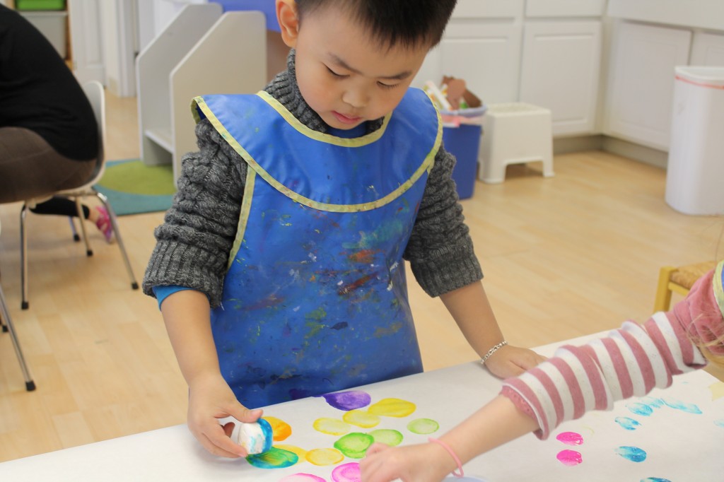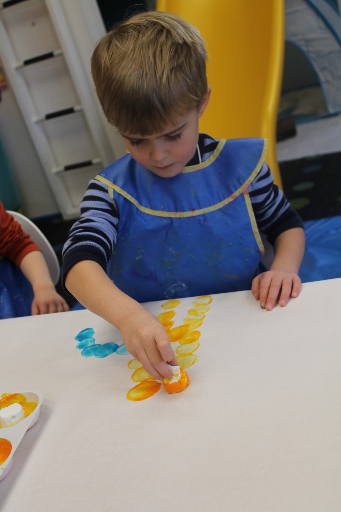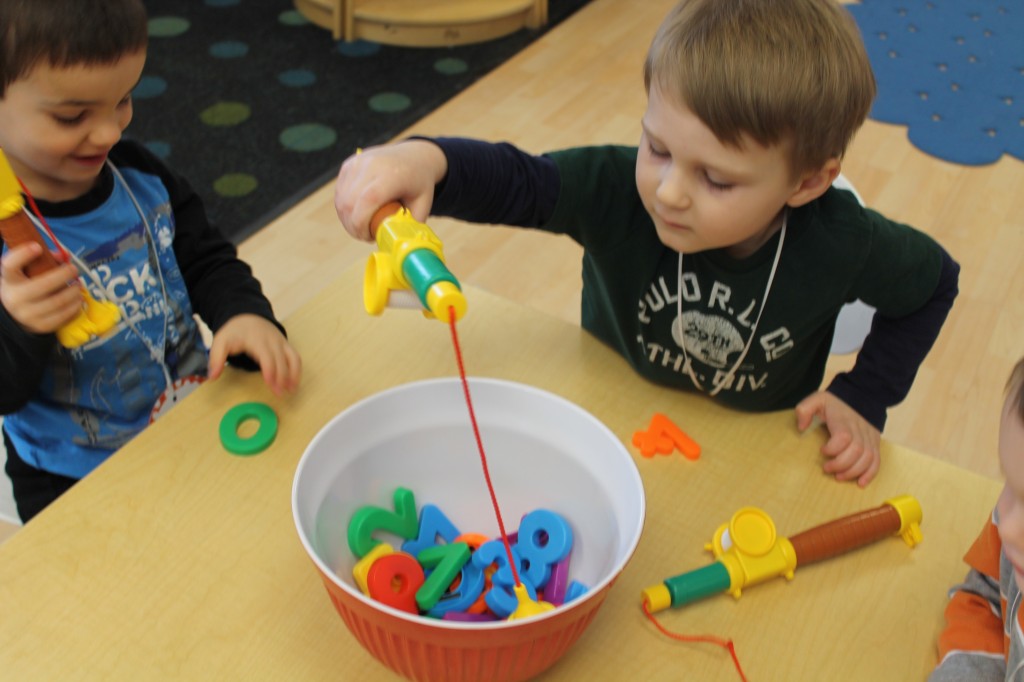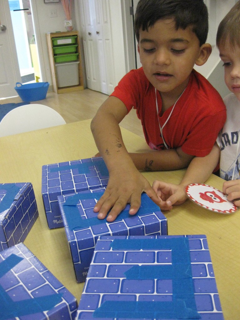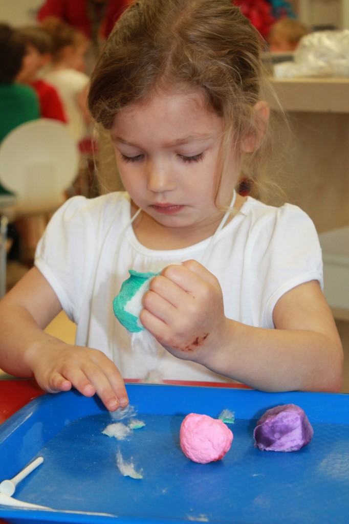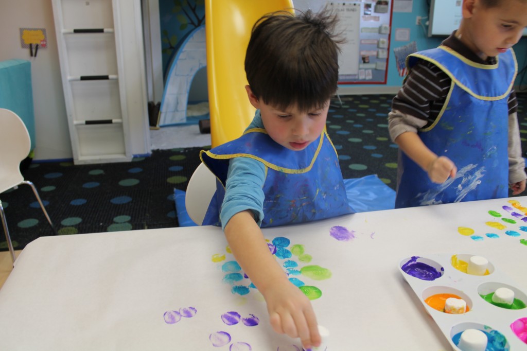 In Ms. Courtney’s group, the preschoolers practiced number recognition. On each gingerbread baby was a number. Their job was to count the right amount of pom poms to decorate the gingerbread baby. This is a great task for hand-eye coordination.