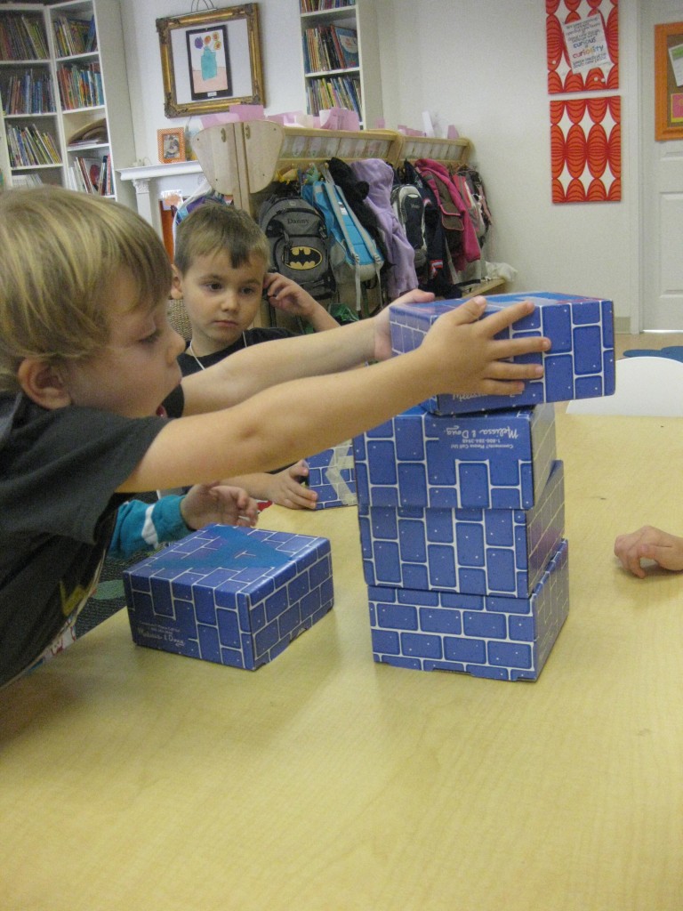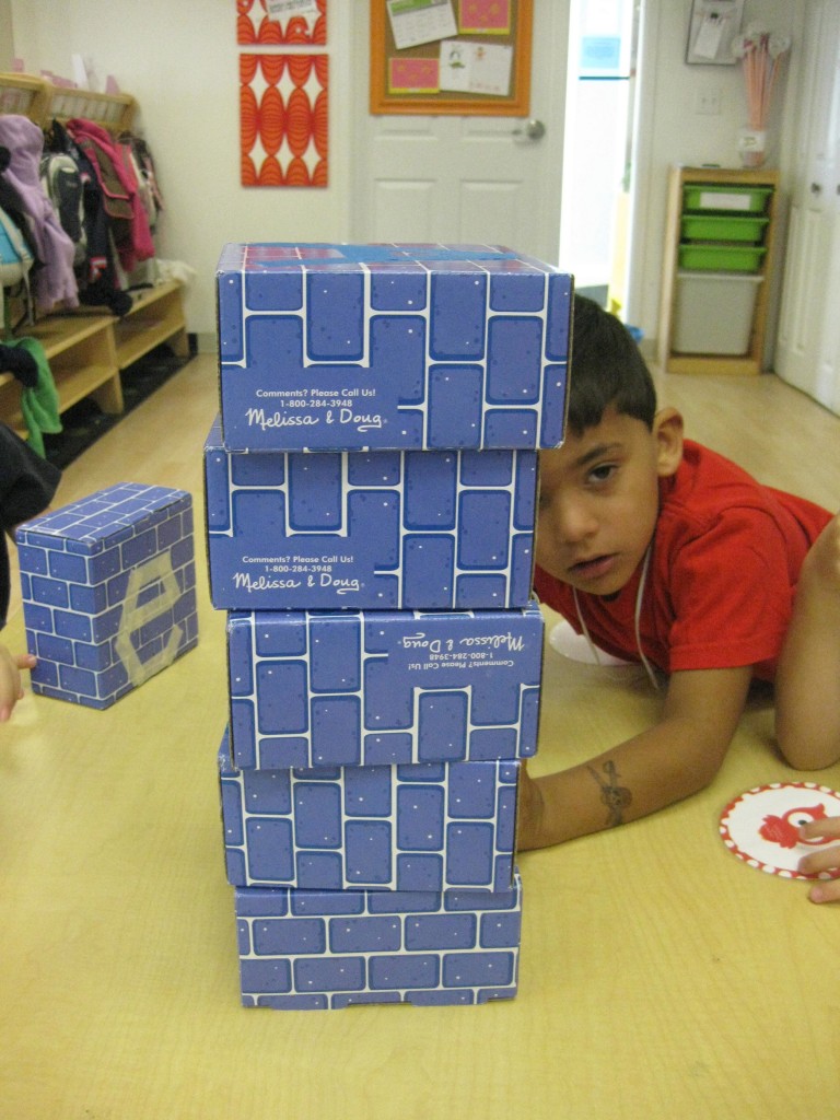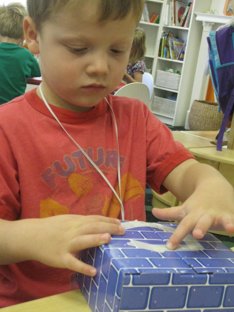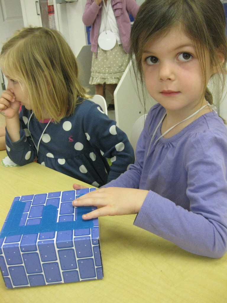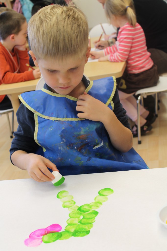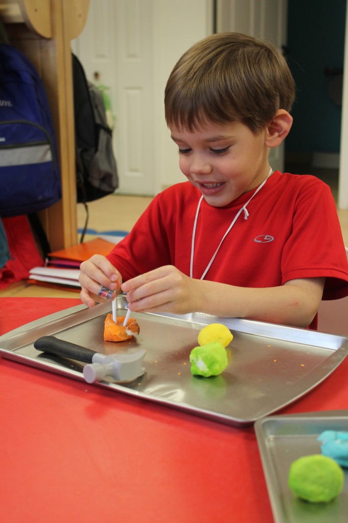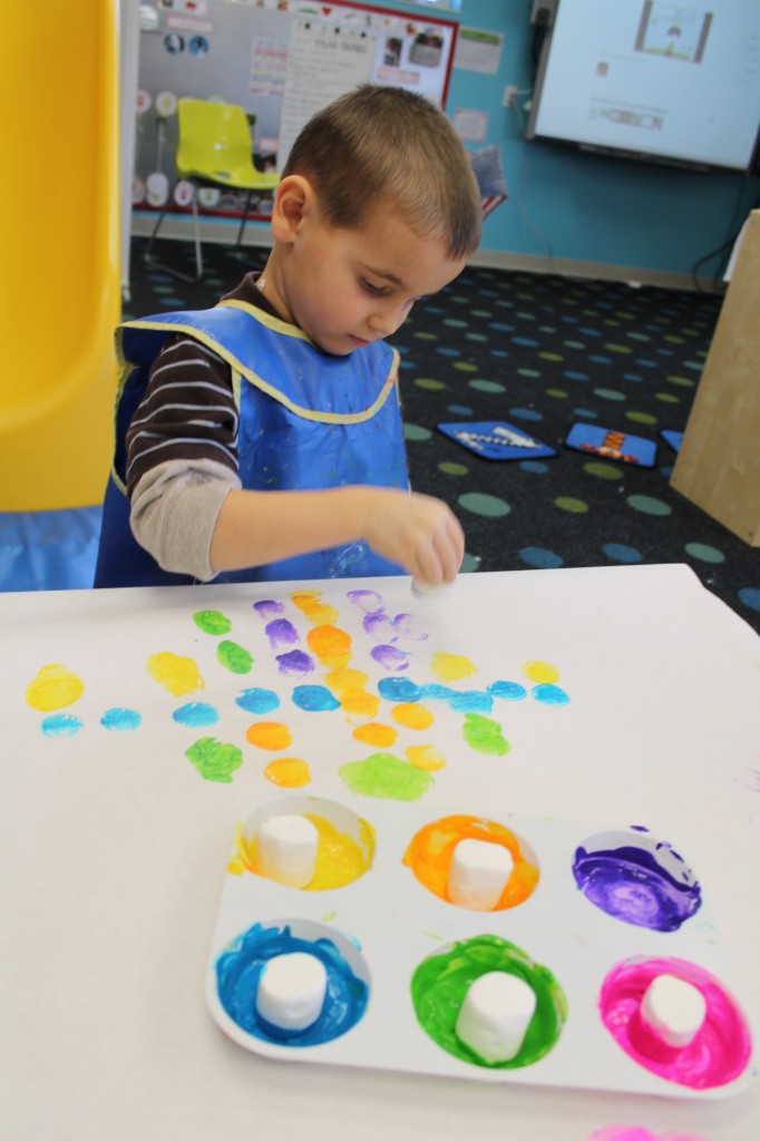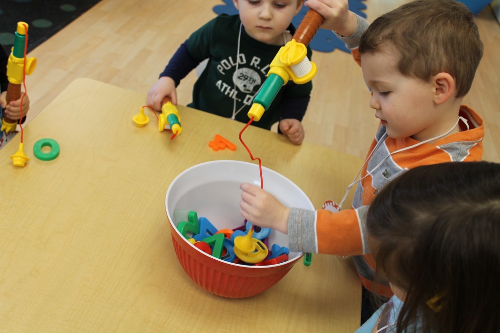 In Ms. Courtney’s group, the preschoolers practiced number recognition. On each gingerbread baby was a number. Their job was to count the right amount of pom poms to decorate the gingerbread baby. This is a great task for hand-eye coordination.
