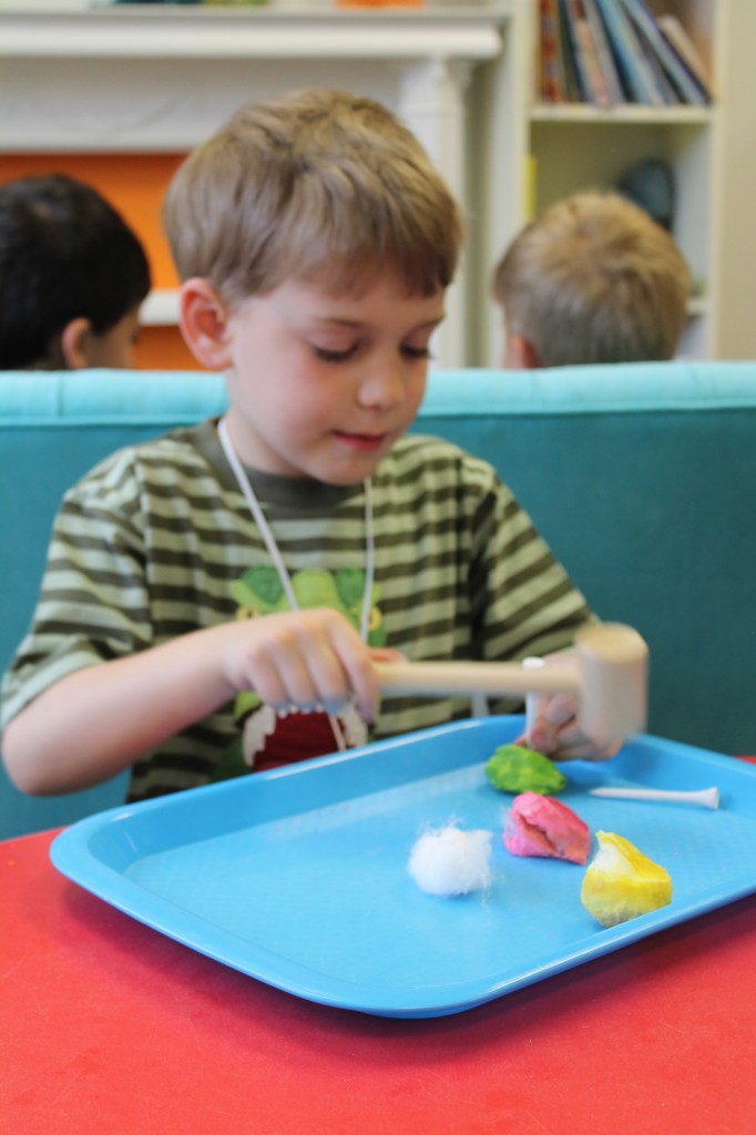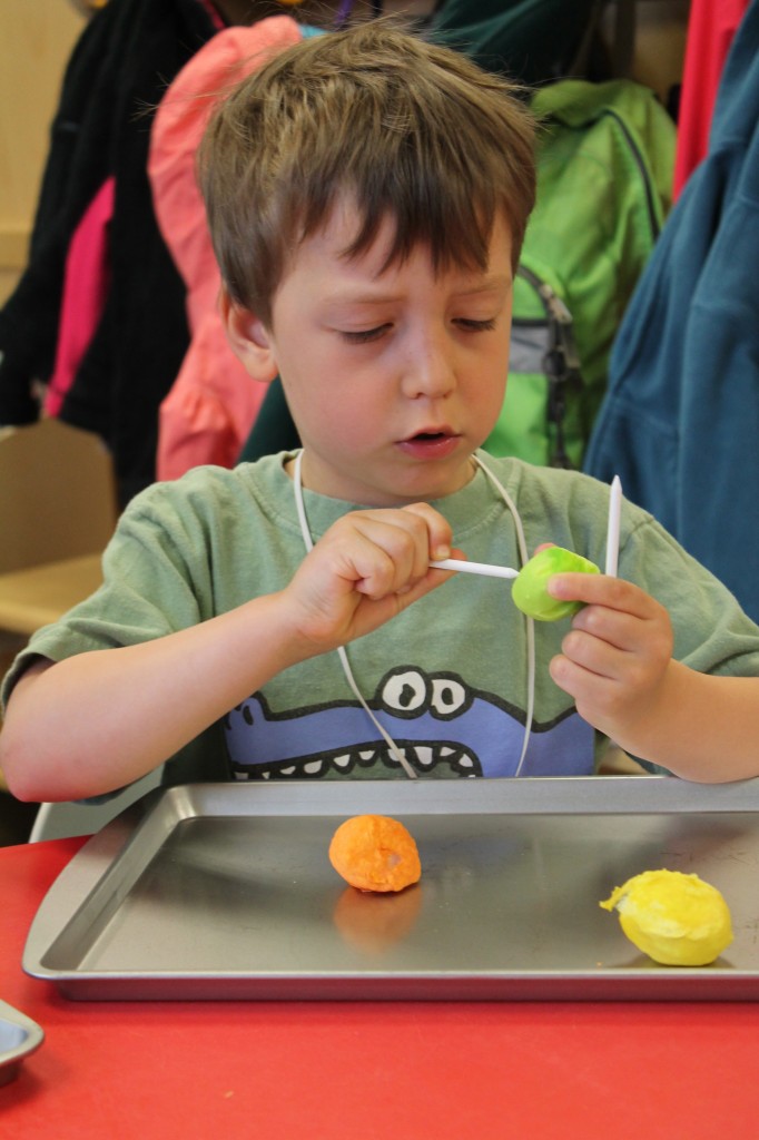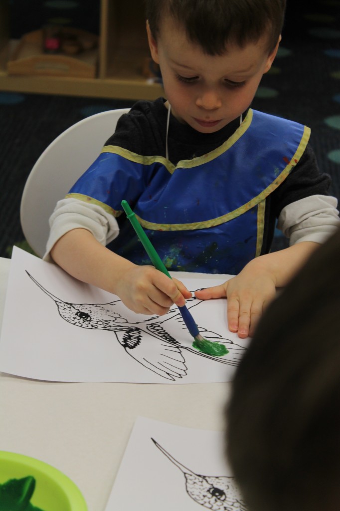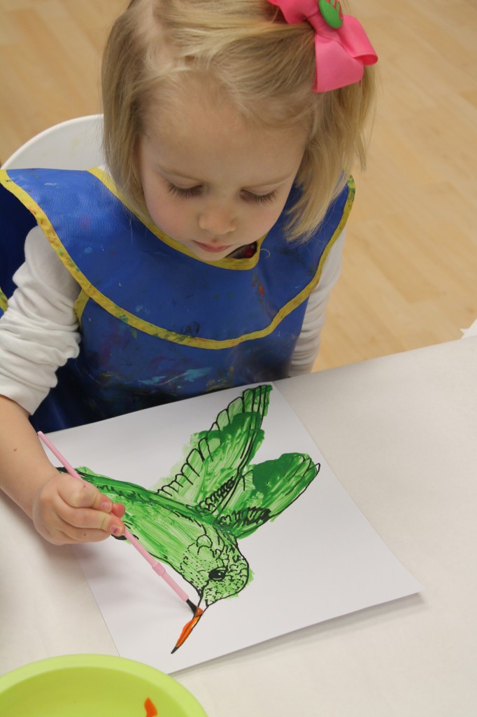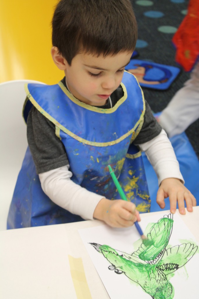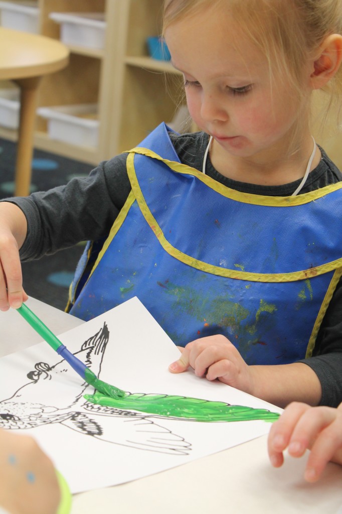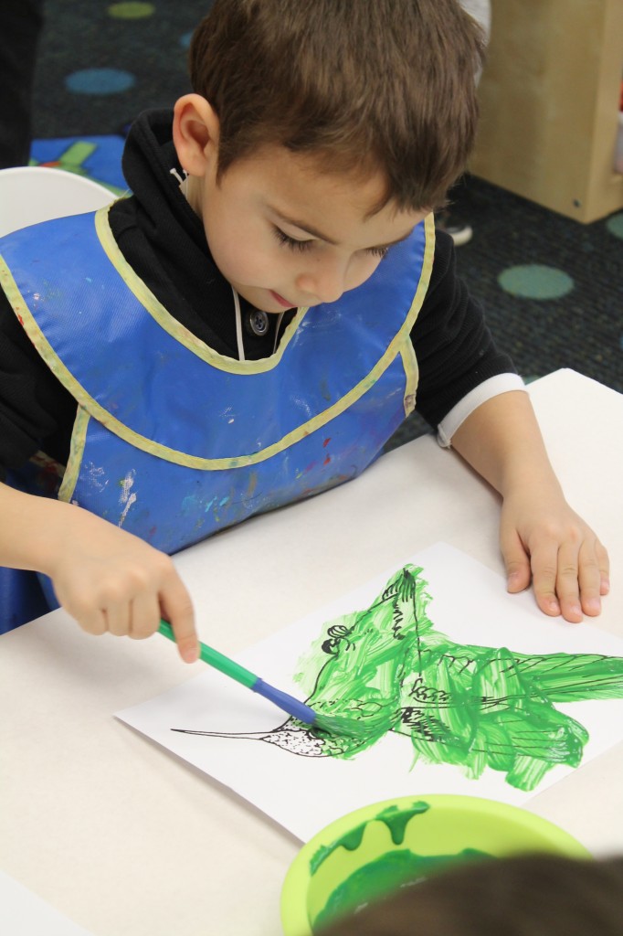 Ms. Cally played “Listen & Color” and helped the preschoolers practice their listening skills. This is great prep for following directions and understanding classroom dynamic. So much of traditional schooling is based on auditory learning. Preschoolers need to practice being able to listen not only to directions, but for directions as well. We structure our classroom to give cues to call attention such as flashing the lights or clapping our hands. This helps create awareness for what is happening around us in the classroom. Ms. Cally instructed the preschoolers to ‘color the star orange’ or ‘find the spoon and color it purple’. This is a great activity to do at home with your little one!