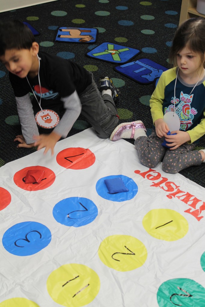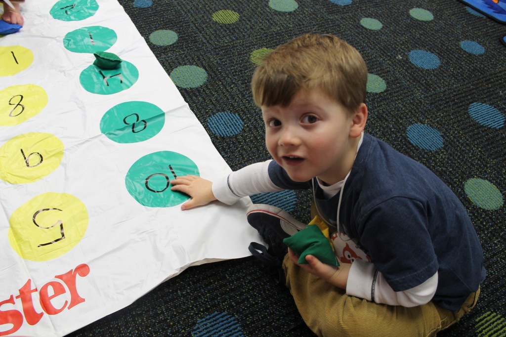 Next with Ms. Lori we practiced our counting skills. Each child had a turn to roll the dice and count how many dots they had. Then we colored the spot on the gingerbread baby that had the matching number on it. This was a fun way to count, work on number recognition and strengthen fine motor muscles!