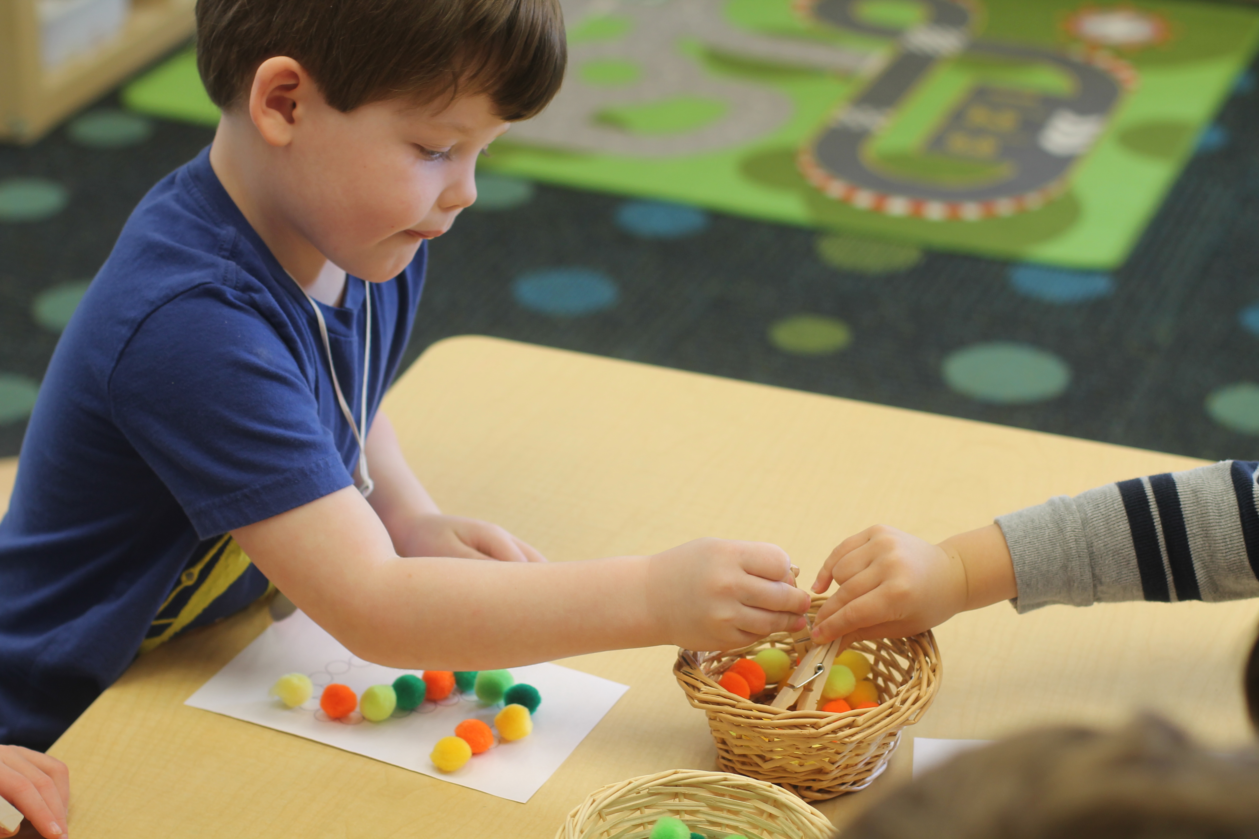 Young children function best when working in small groups due to the fact that their social and cognitive skills are still developing. The bulk of our day is devoted to small group activities to help children grow both socially and cognitively. When children work with only a few other children, in a small group setting, they learn important lessons about cooperation, compromise and the give and take of conversation. Also, when working in small groups with a teacher, children are able to receive the more focused attention they need for completing complex tasks and activities.