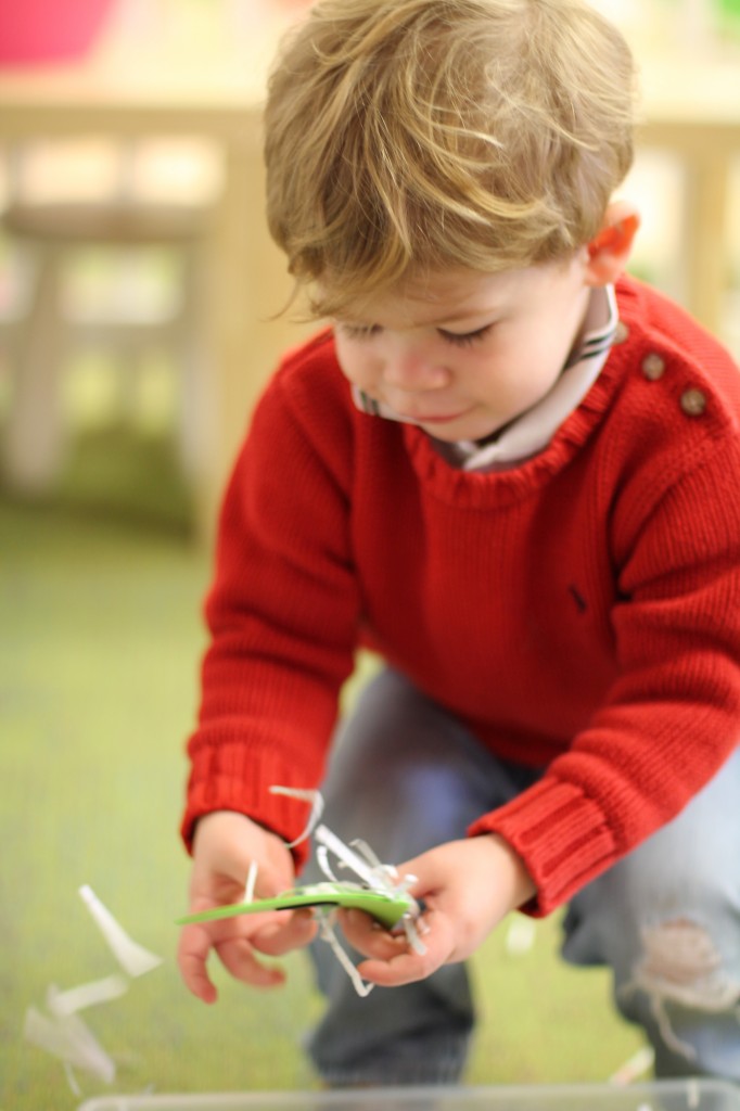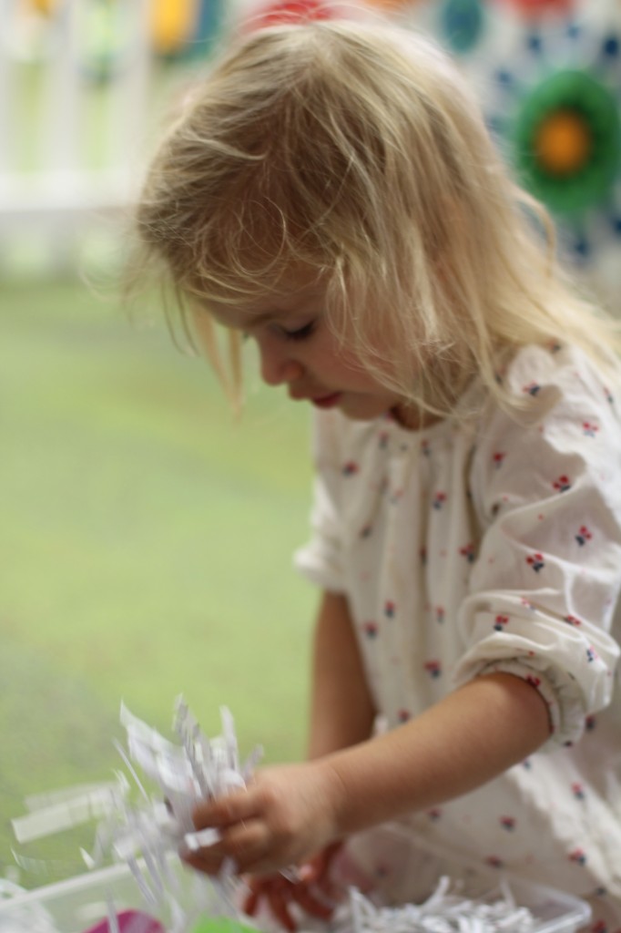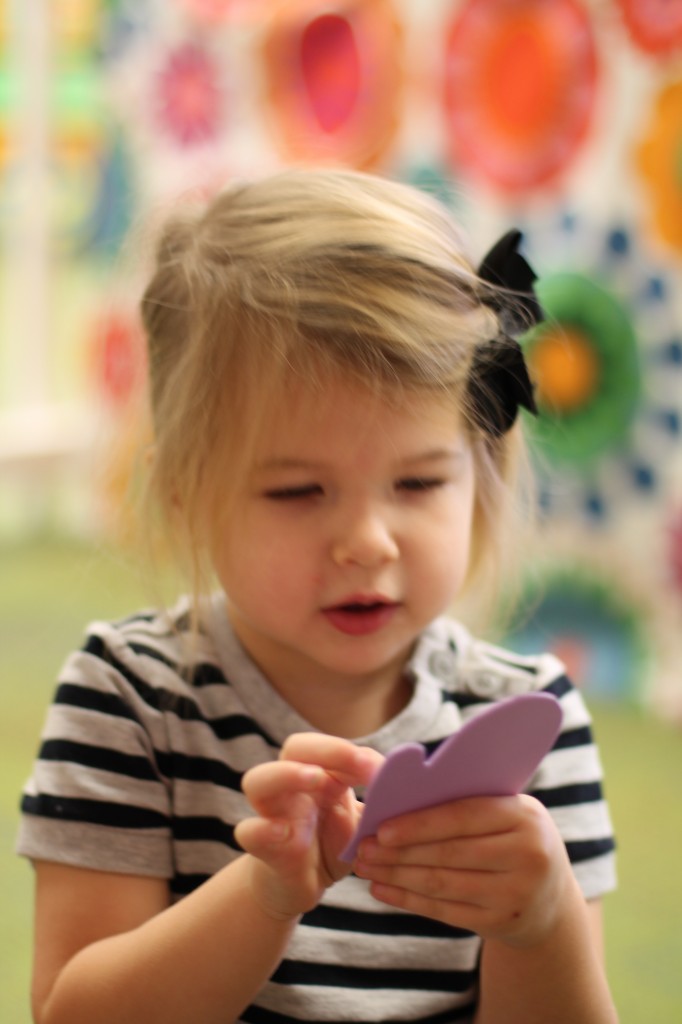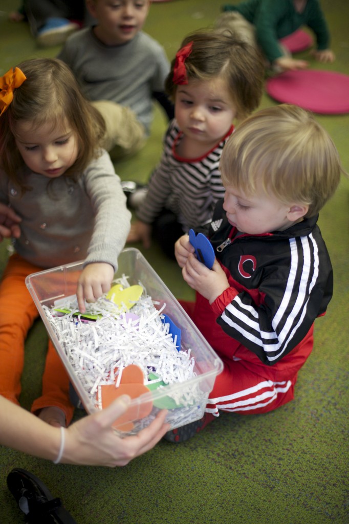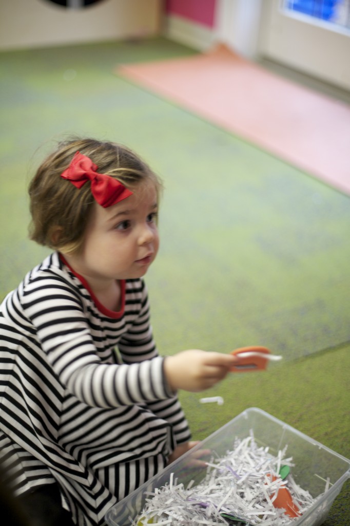 Moving into spring with a sensory bin filled with eggs, butterflies, bunnies, and flowers.  Some children practiced scooping while others sorted by color or type.  The older children began to make patterns (a pre-literacy and math skill).