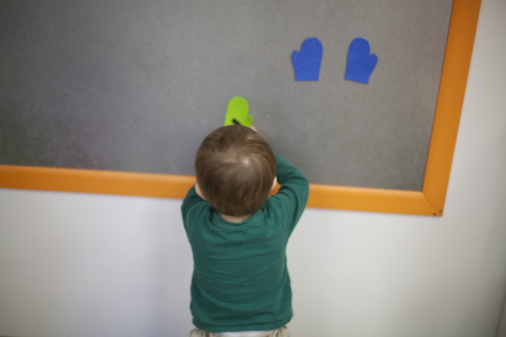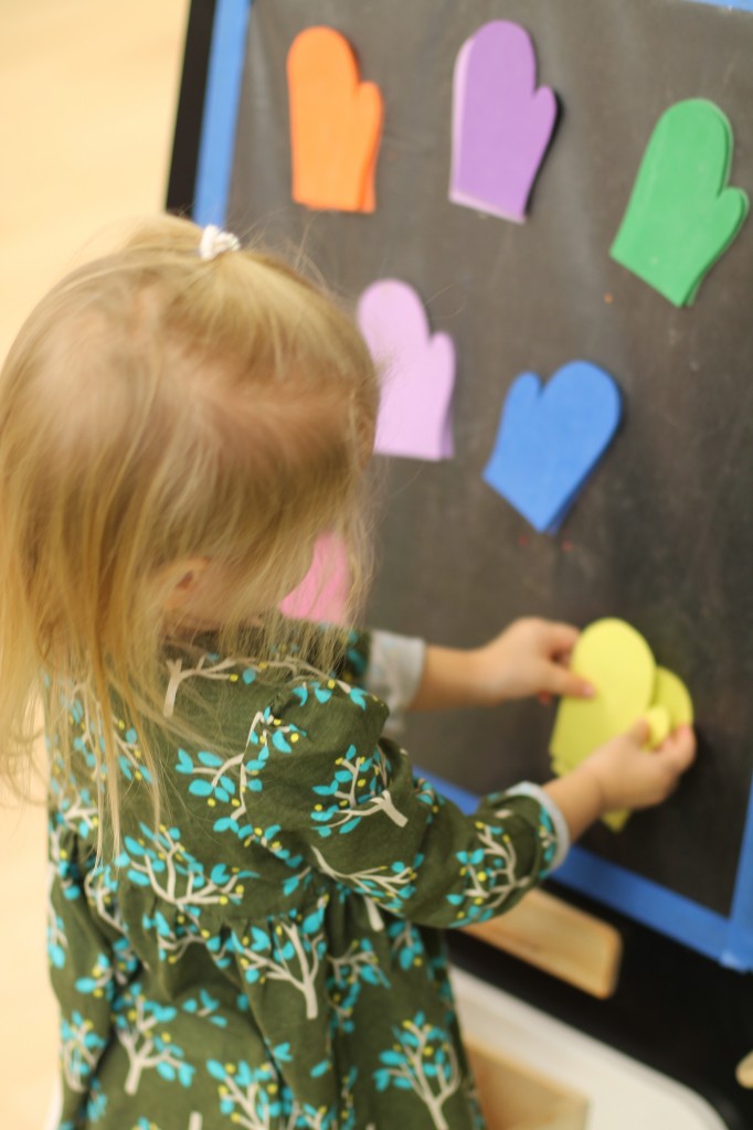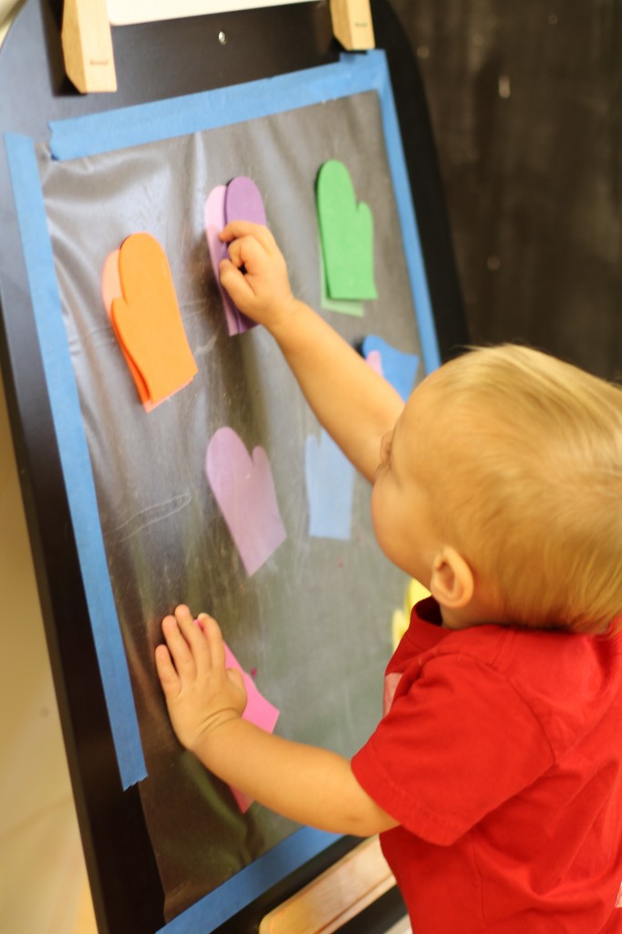 We’ve been talking about the nursery rhyme “Three Little Kittens” and how the kittens lost their mittens.  So, today we helped the kittens find their mittens in the snow.  As the toddlers found a mitten we talked about it’s color and placed it on the board looking for it’s match.