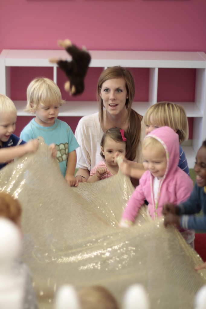 Today, Ms. Joanie visited our morning and afternoon classes!! We had so much fun playing instruments and singing along with her! We also got to “act out” the “5 Little Monkeys Jumping on the Bed” by bouncing a stuffed monkey on a gold sheet.