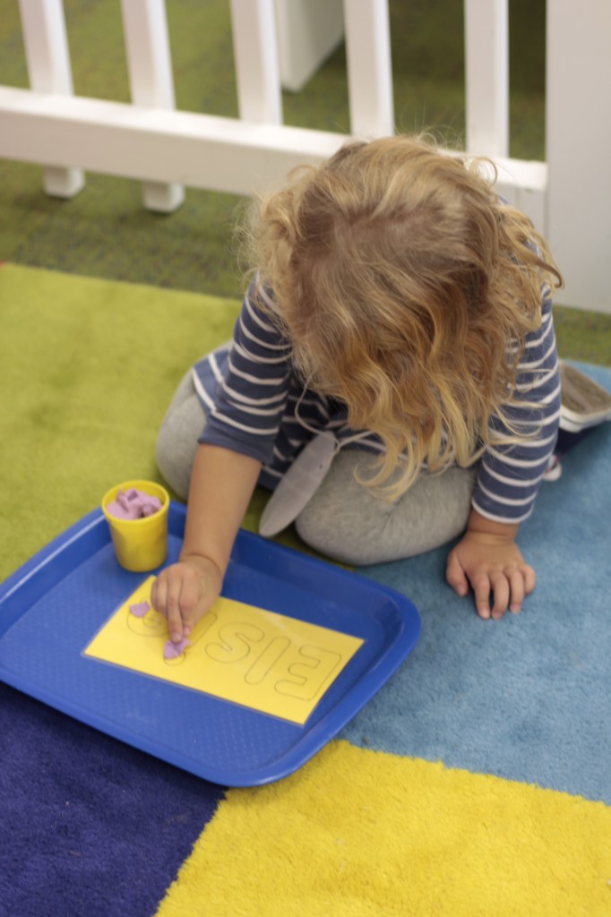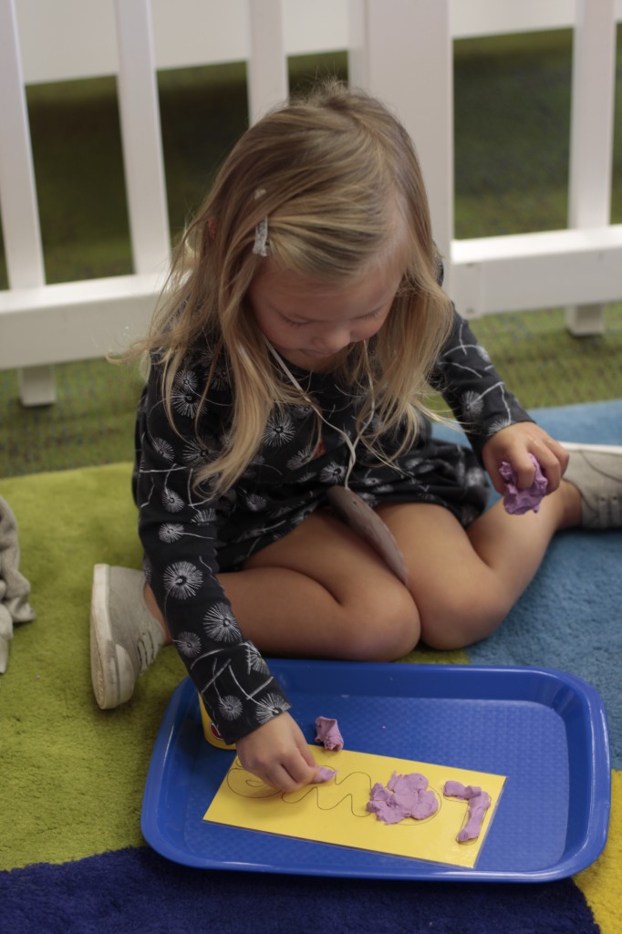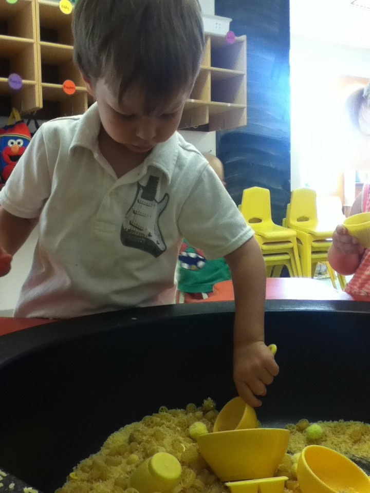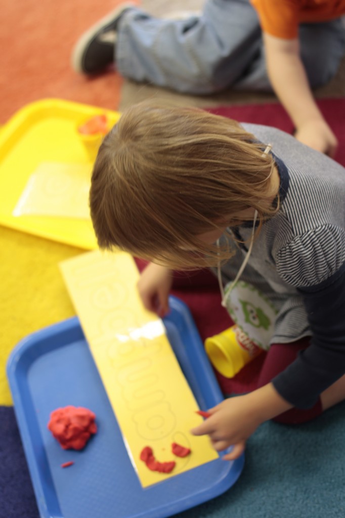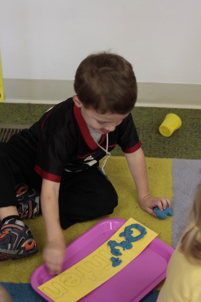 Today Ms. Joanie came to our class to sing and play instruments with us! We always love having her in our class! She even brought her special gold sheet for “5 Little Monkeys Jumping on the Bed.” Today we practiced holding a large crayon to draw and build our pre-writing skills. In small groups today we had fun with an “I Spy Alphabet Bag” –hair gel in a ziplock bag with foam letters. The children had to look for the first letter of their name, as well as the letter of the week (“Z”). We worked on our one-to-one correspondence by taking turns passing out sparkly pom-poms for each friend to put in their bowls. We are continuing to practice recognizing our names and the letters in our names. Today we molded play dough into the letters in our name. Hope you have a fantastic weekend! See you Monday!!