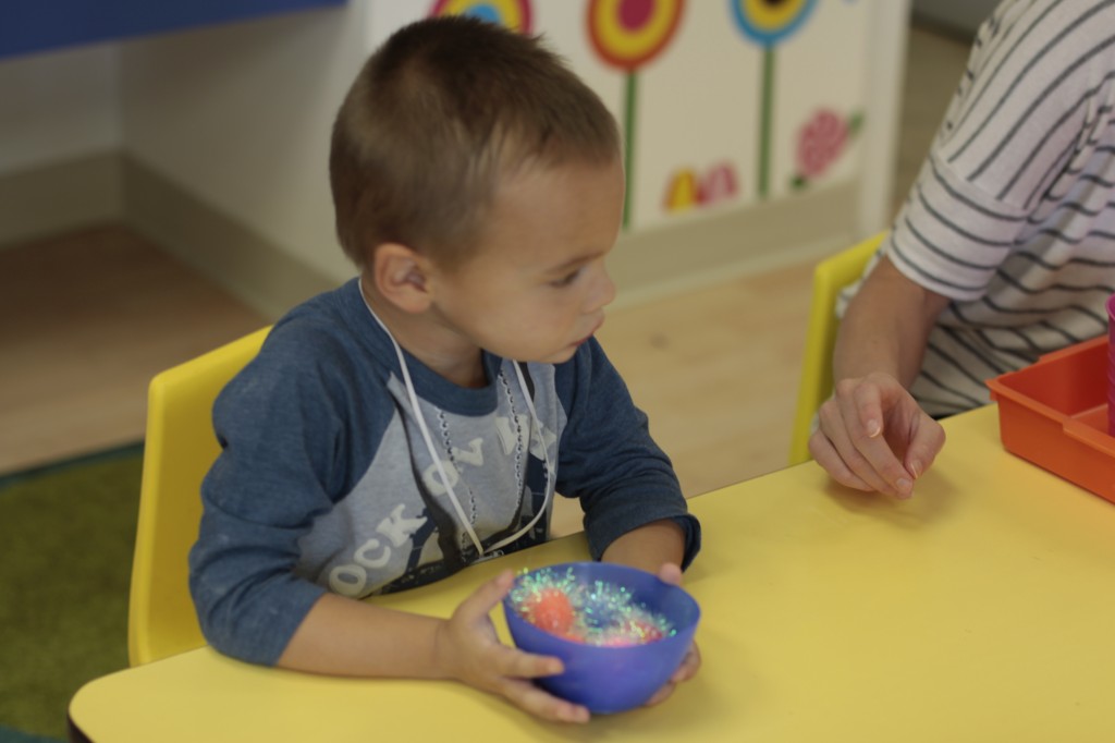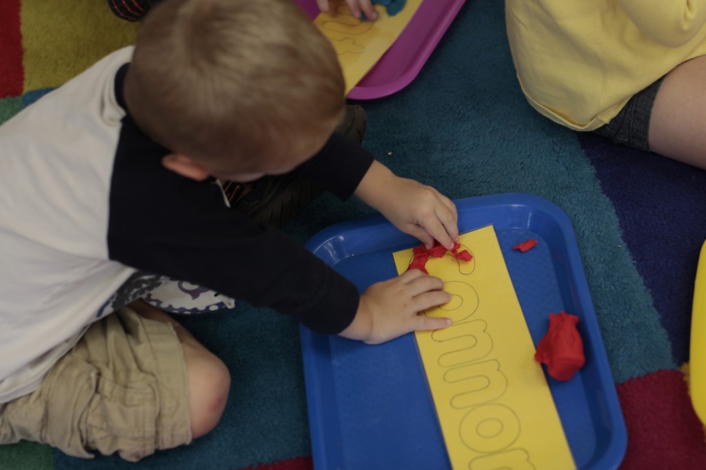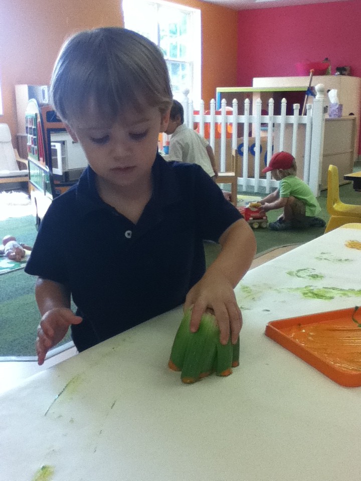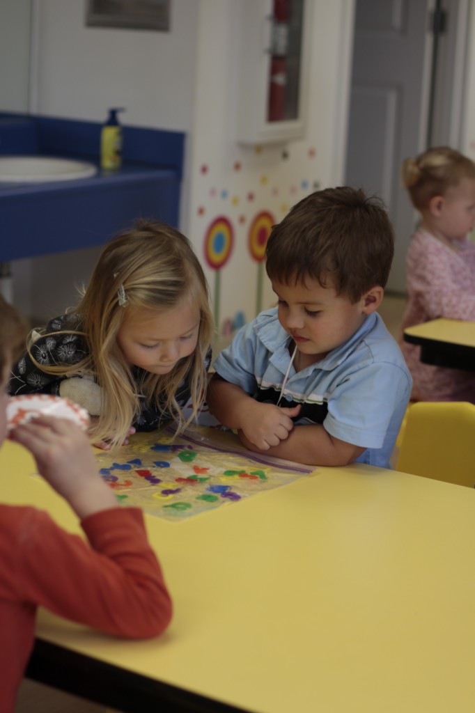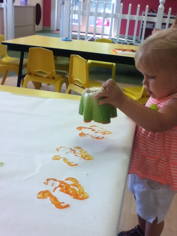 Today Ms. Joanie came to our class to sing and play instruments with us! We always love having her in our class! She even brought her special gold sheet for “5 Little Monkeys Jumping on the Bed.” Today we practiced holding a large crayon to draw and build our pre-writing skills. In small groups today we had fun with an “I Spy Alphabet Bag” –hair gel in a ziplock bag with foam letters. The children had to look for the first letter of their name, as well as the letter of the week (“Z”). We worked on our one-to-one correspondence by taking turns passing out sparkly pom-poms for each friend to put in their bowls. We are continuing to practice recognizing our names and the letters in our names. Today we molded play dough into the letters in our name. Hope you have a fantastic weekend! See you Monday!!