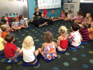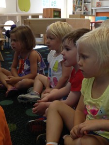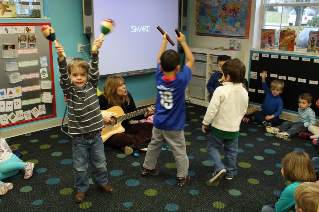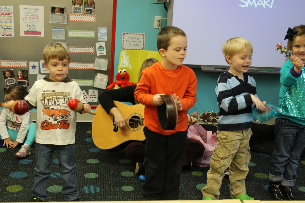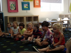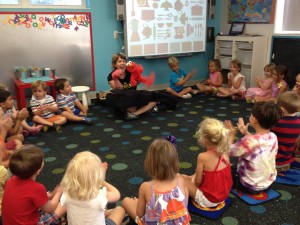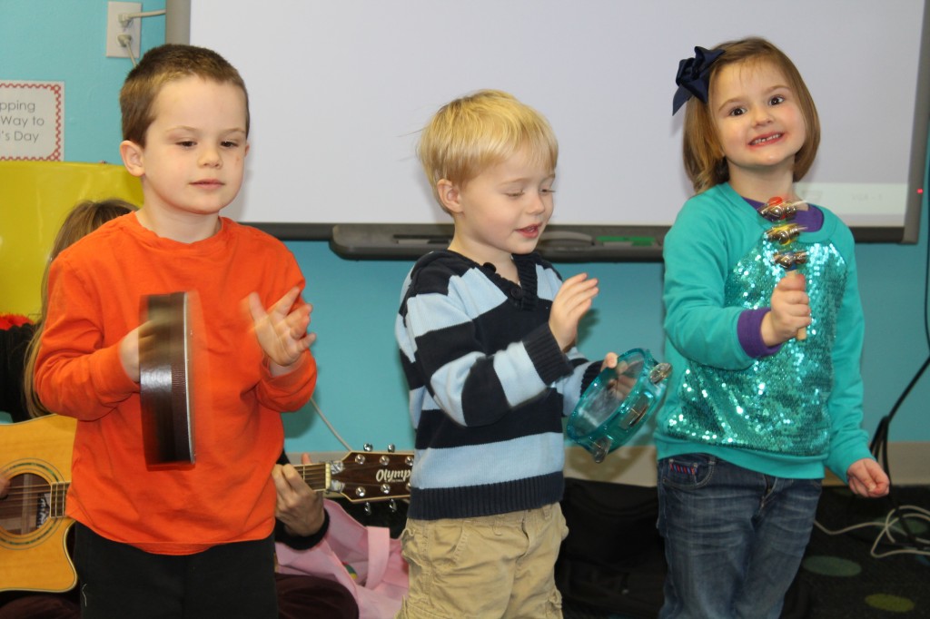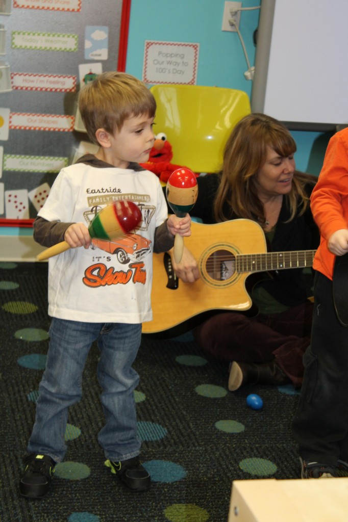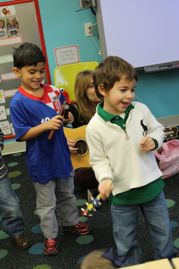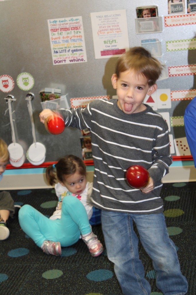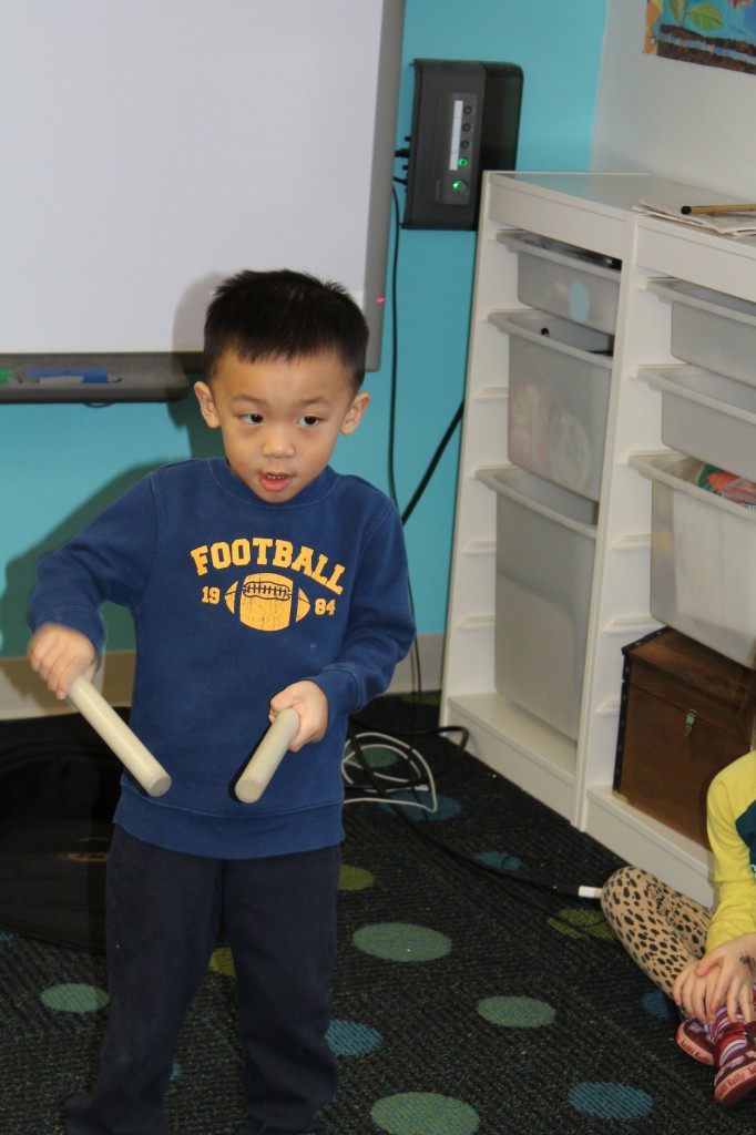 Jumping, stretching, dancing and ribbon twirling helps build muscle strength throughout the entire body. We also tapped wooden sticks to the tempo of Miss Joanie’s guitar, working on rhythm as we danced to “We are the Dinosaurs,” a classroom favorite!