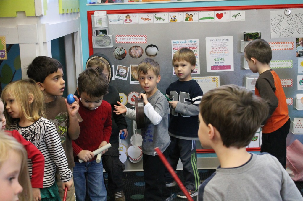 Today, Ms. Joanie visited our morning and afternoon classes!! We had so much fun playing instruments and singing along with her! We also got to “act out” the “5 Little Monkeys Jumping on the Bed” by bouncing a stuffed monkey on a gold sheet.