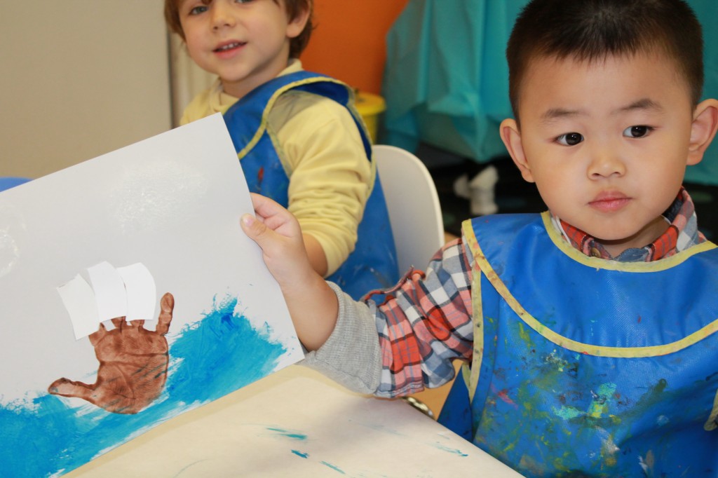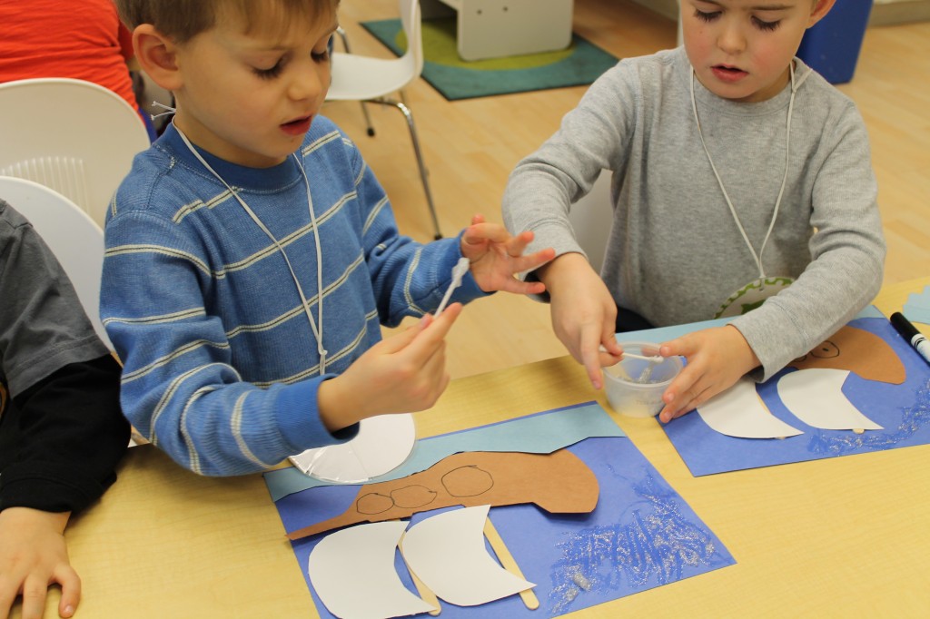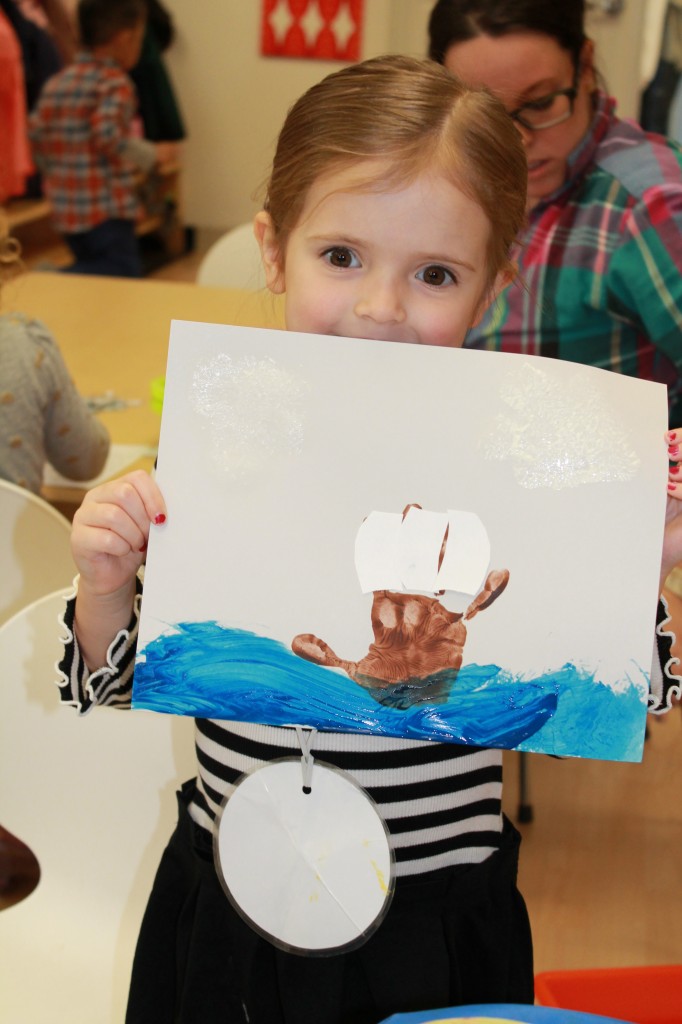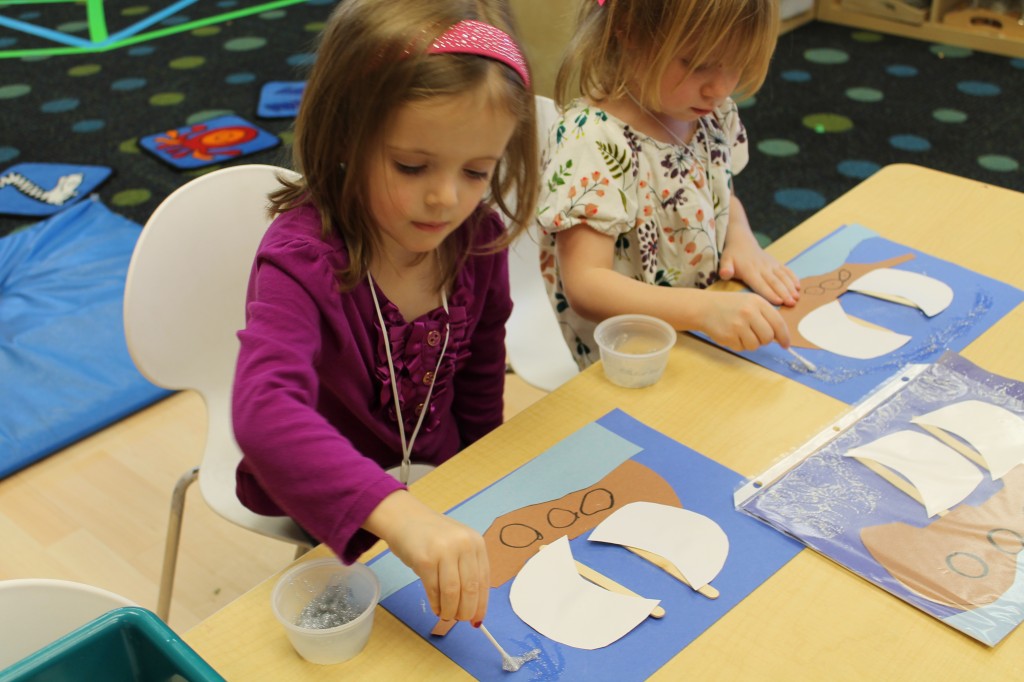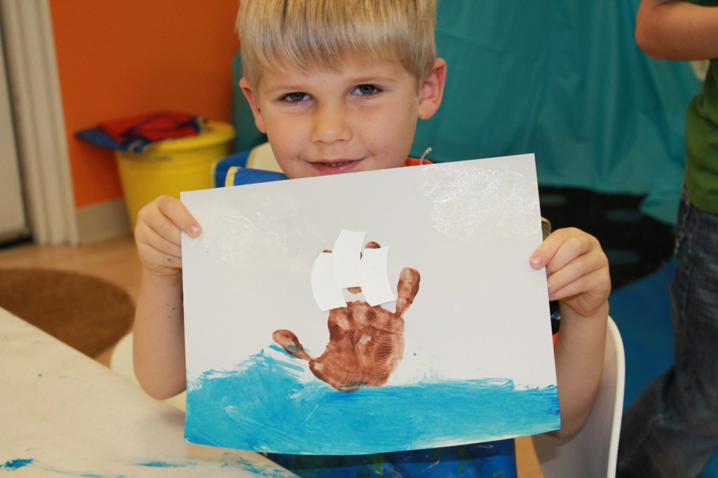 Our Discovery bins were filled with beans, leaves, mini pumpkins and scoops and bowls to practice pouring and scooping. These bins also foster discussion of colors, letters, and shapes.