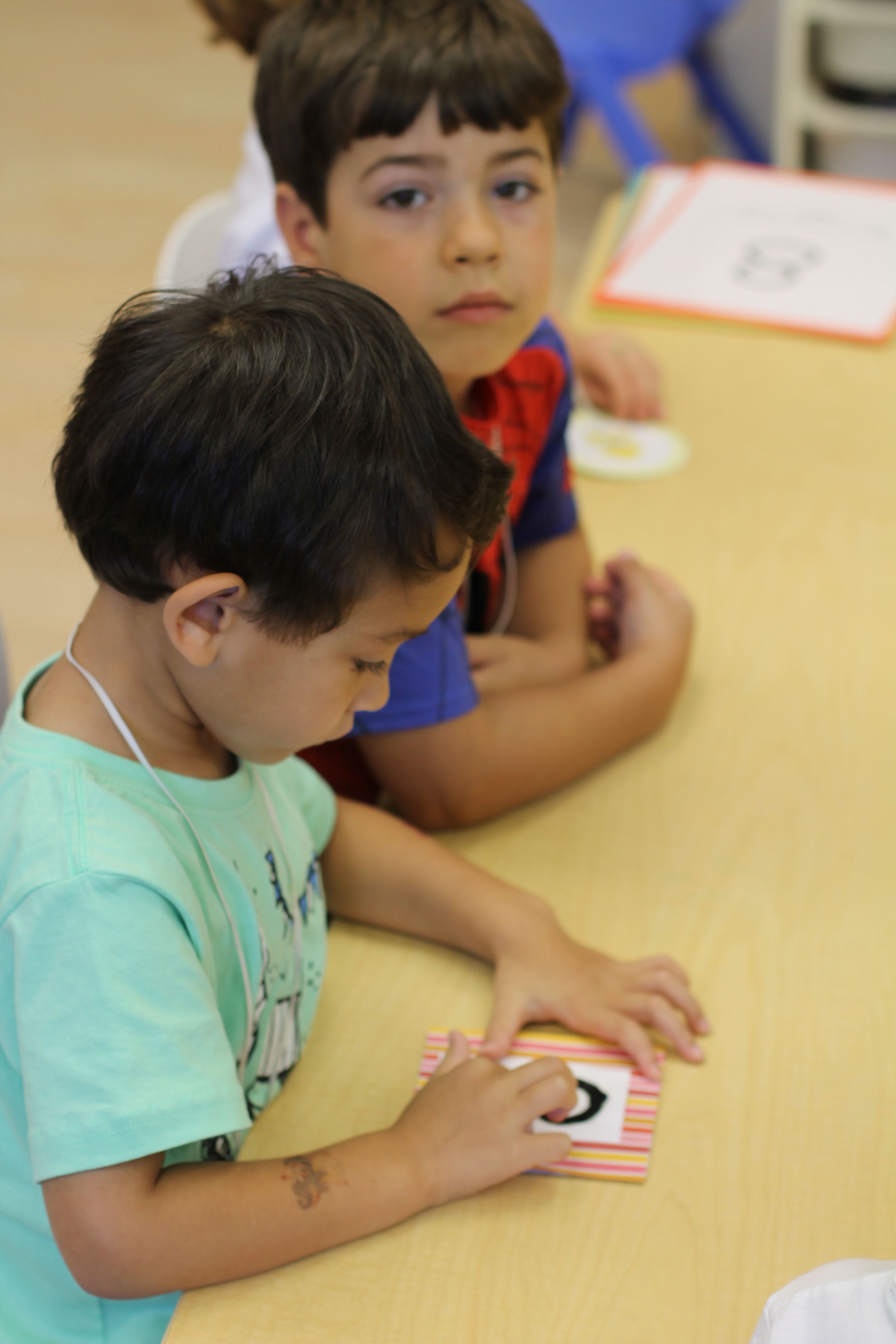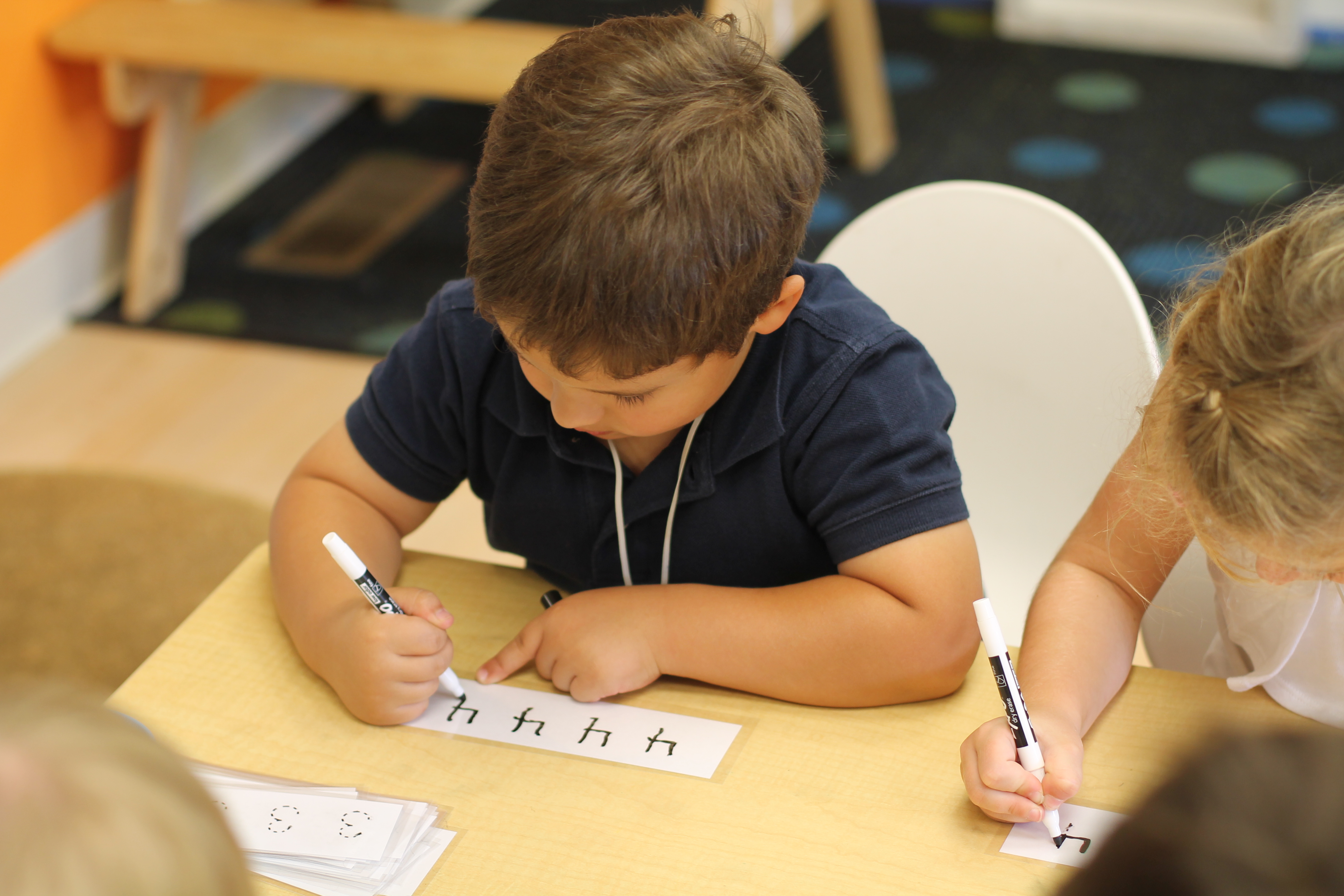 We started our “Handwriting Without Tears” curriculum this week! Our first activity was introduced in whole group time and practiced in small groups. The children had to practice forming the letters “A” and “B” with magnetic wood pieces. We talked about “big lines” “curved lines” “small lines” etc. This helps the children break down writing out a letter into simple steps. For an “A” we say: “Big Line, Big Line, Little Line!”