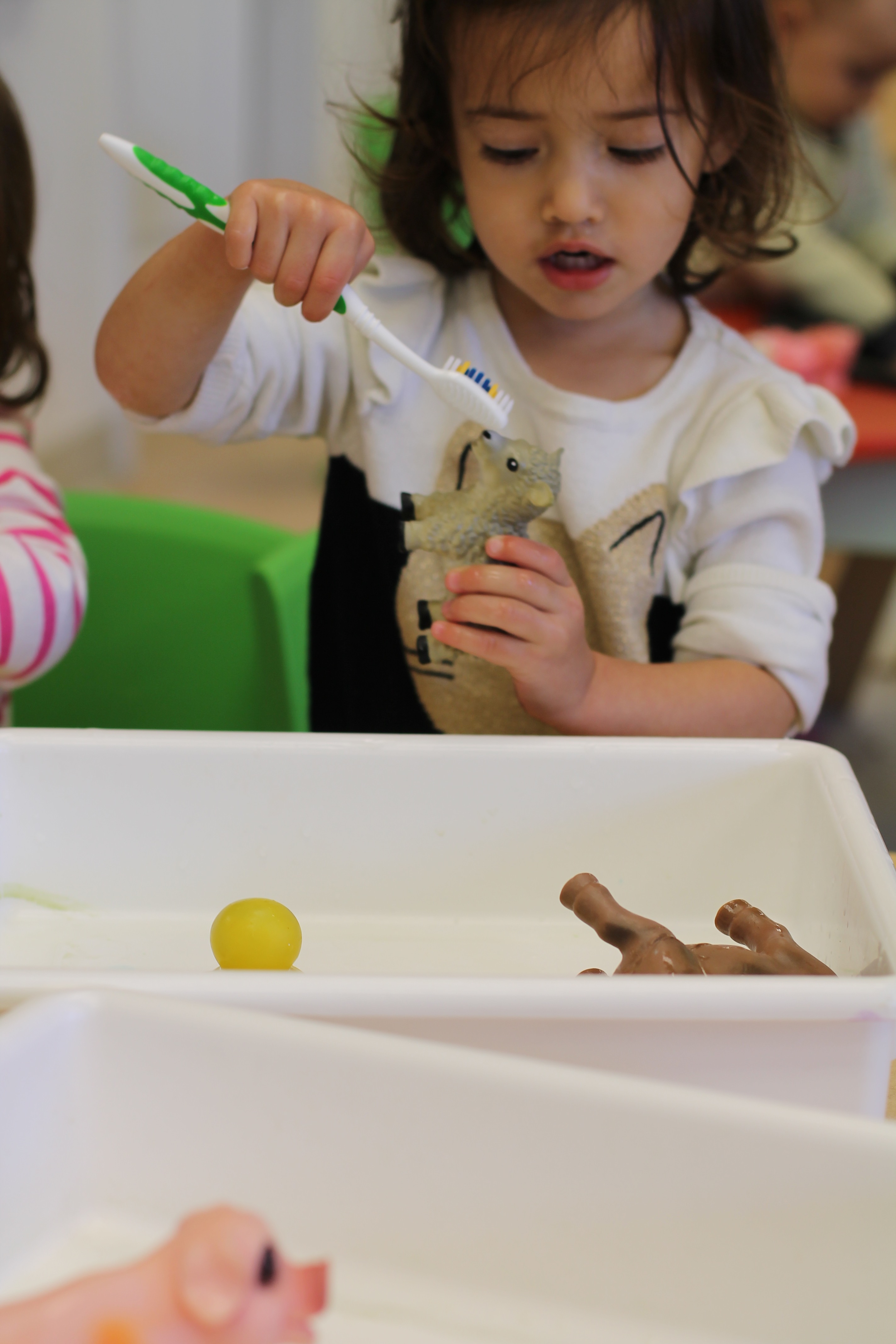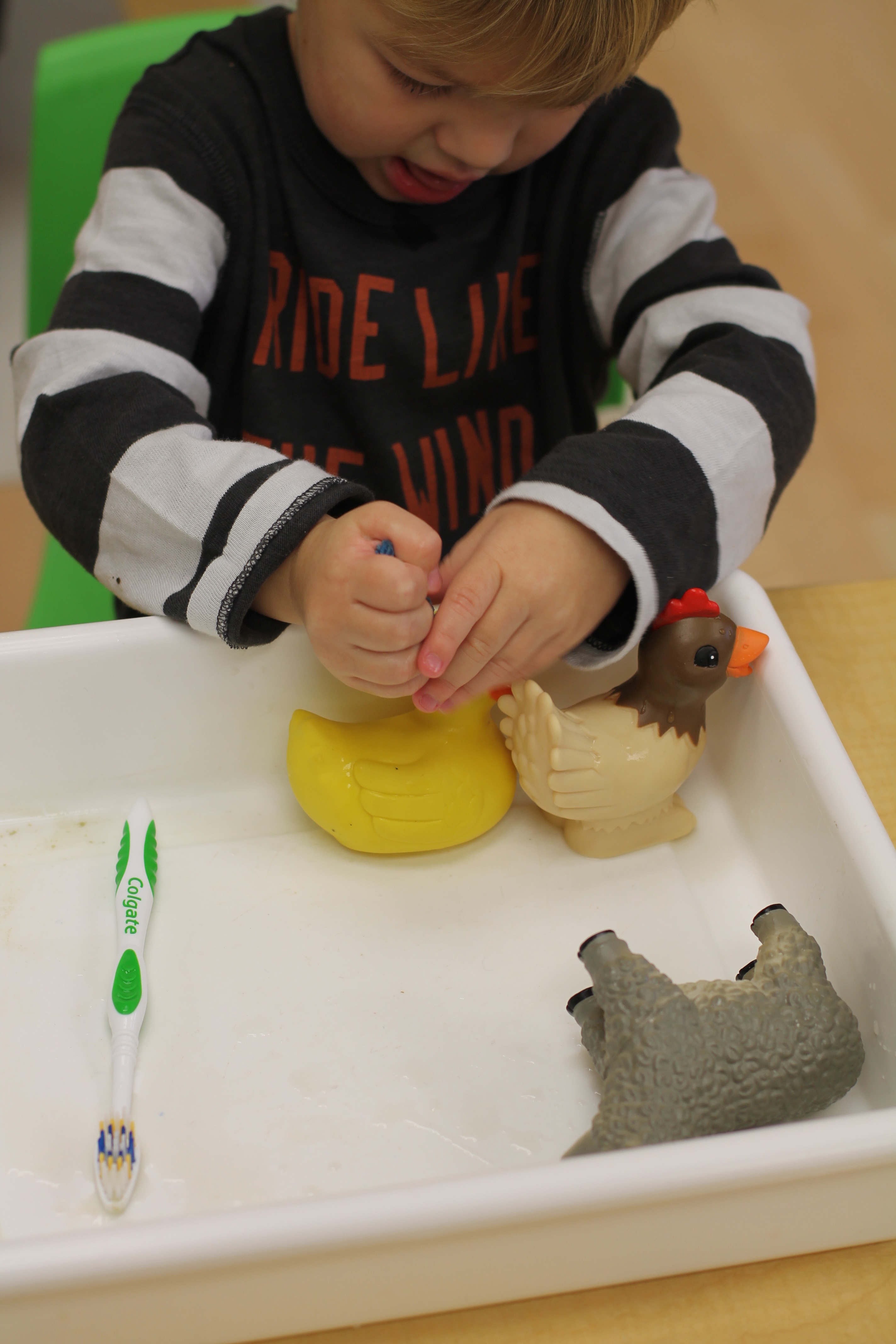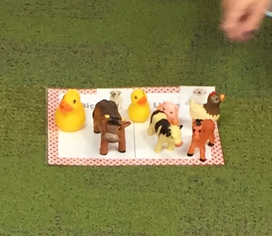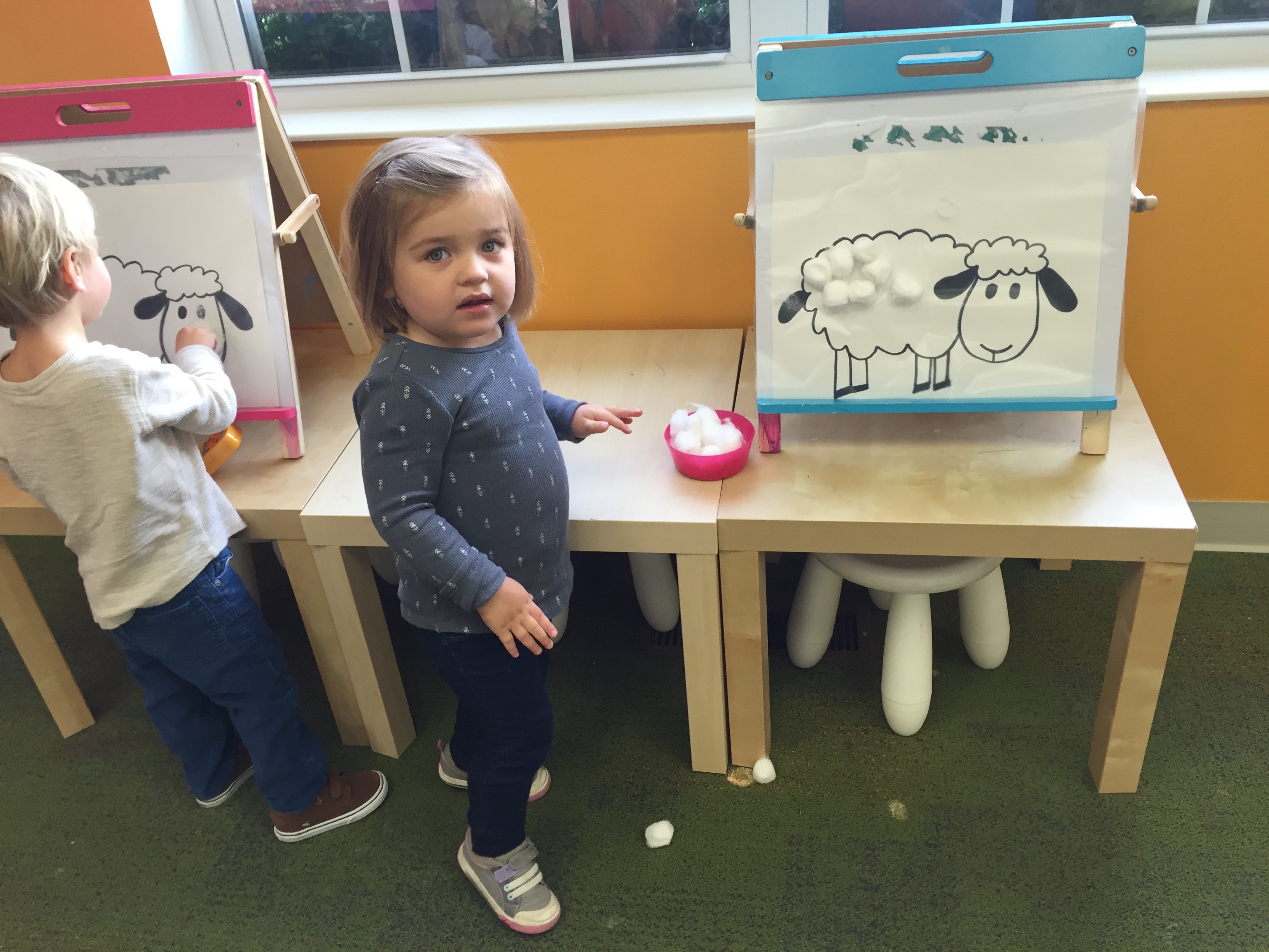 We had fun learning about different farm animals! We listened to the sounds they make, their colors, and sorted between the big animals and little animals. In art, we did “H” is for “horse” and put cotton balls onto sticky paper to make fluffy sheep. We also cleaned our animals with toothbrushes and sponges to practice fine motor skills.