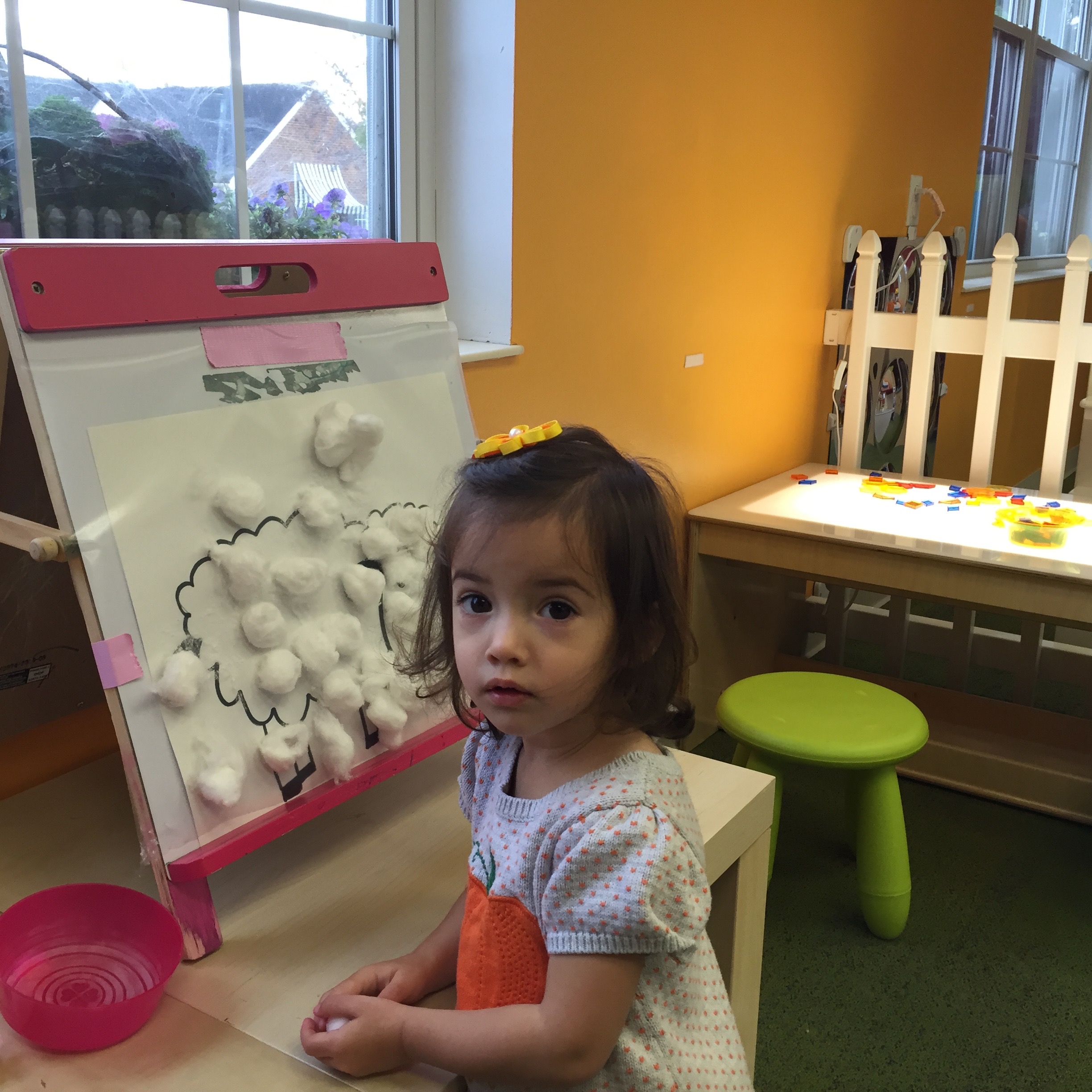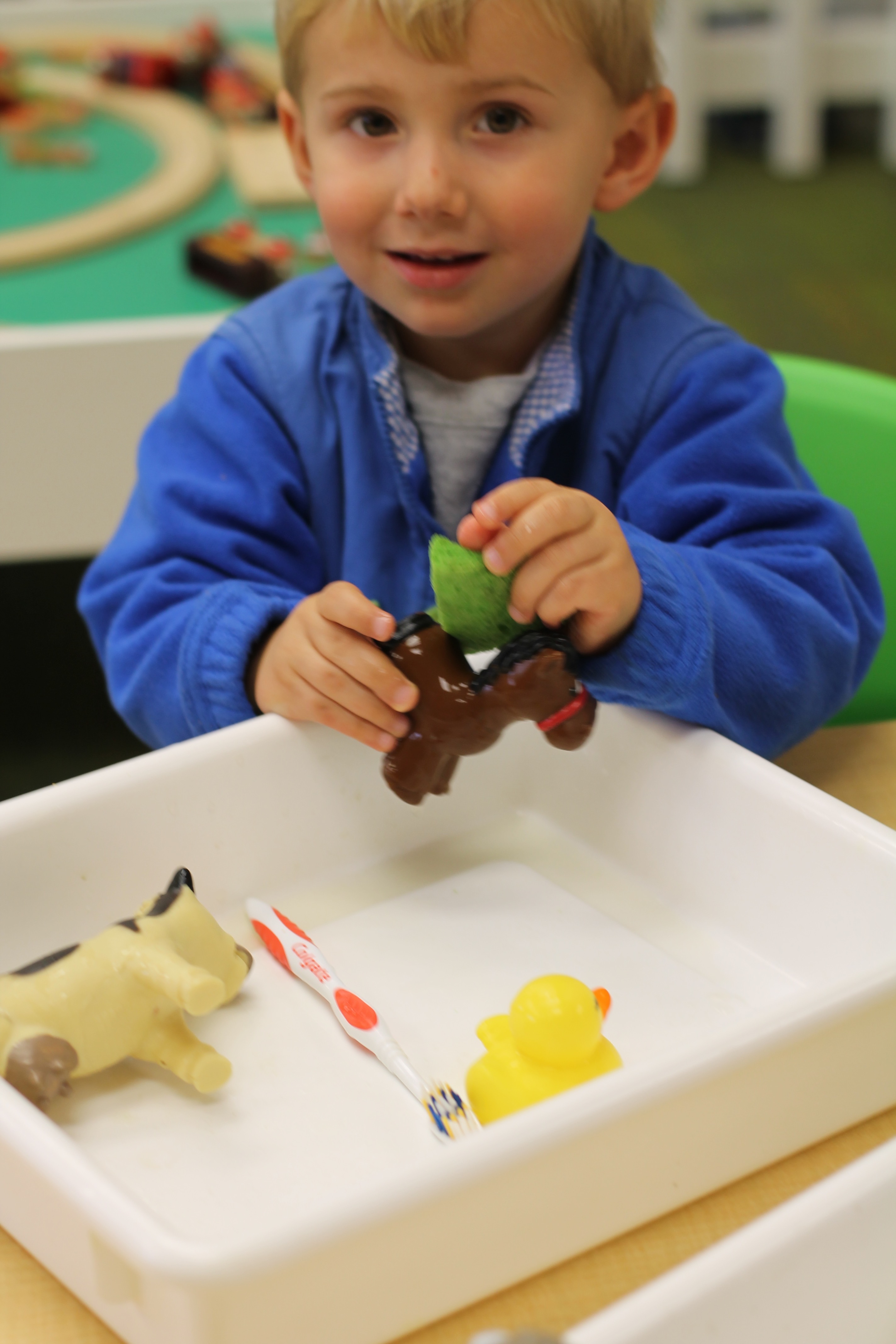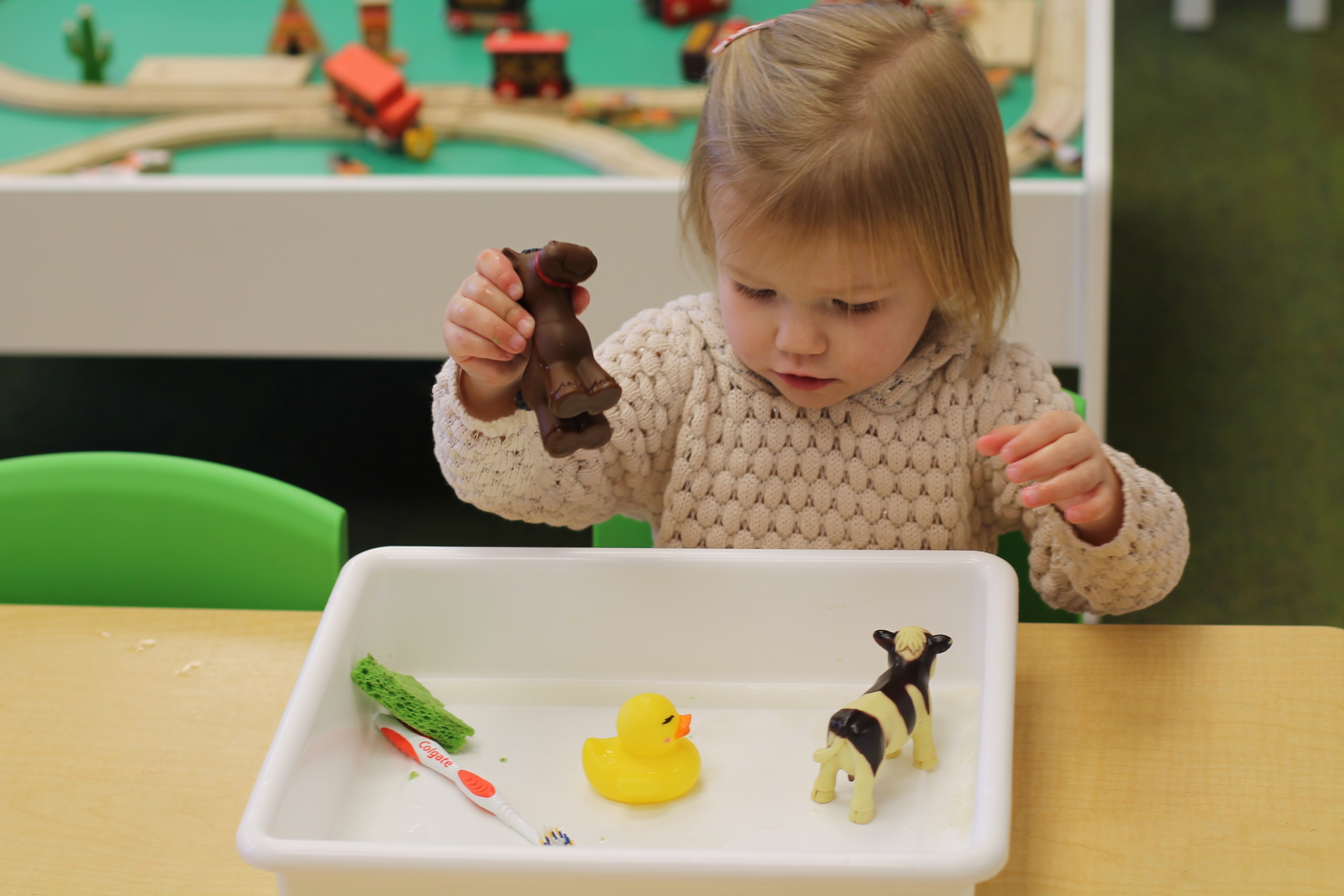 We had fun learning about different farm animals! We listened to the sounds they make, their colors, and sorted between the big animals and little animals. In art, we did “H” is for “horse” and put cotton balls onto sticky paper to make fluffy sheep. We also cleaned our animals with toothbrushes and sponges to practice fine motor skills.