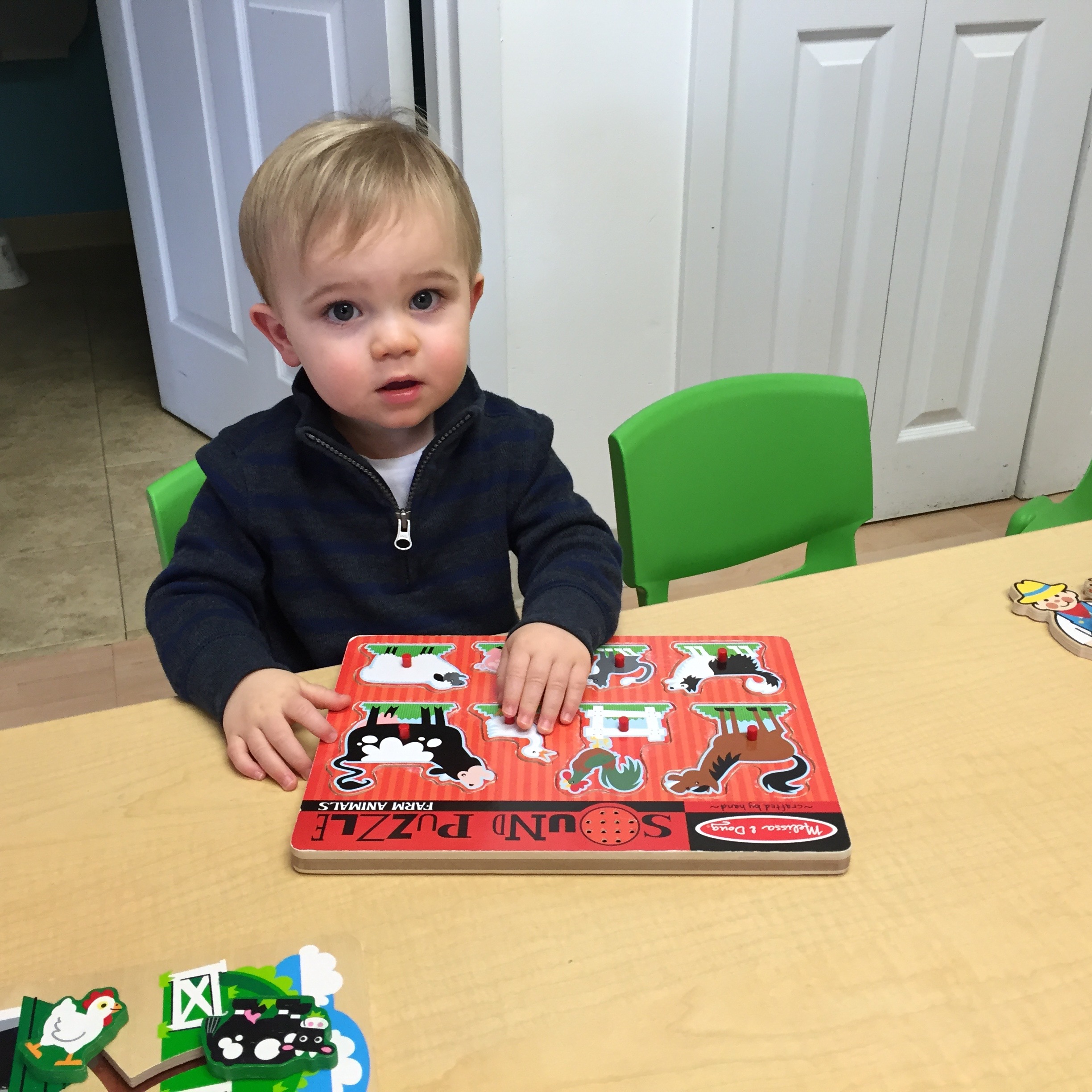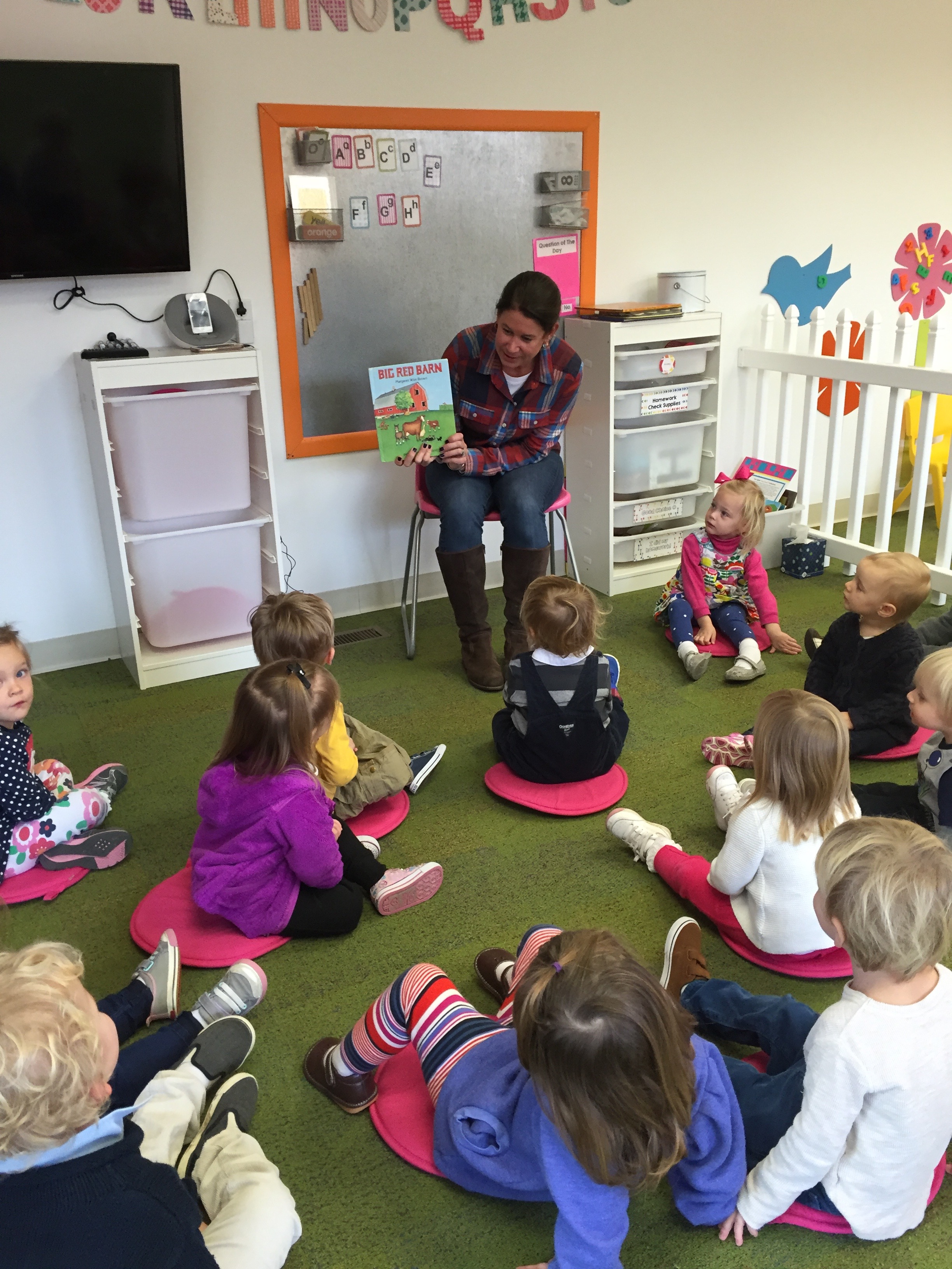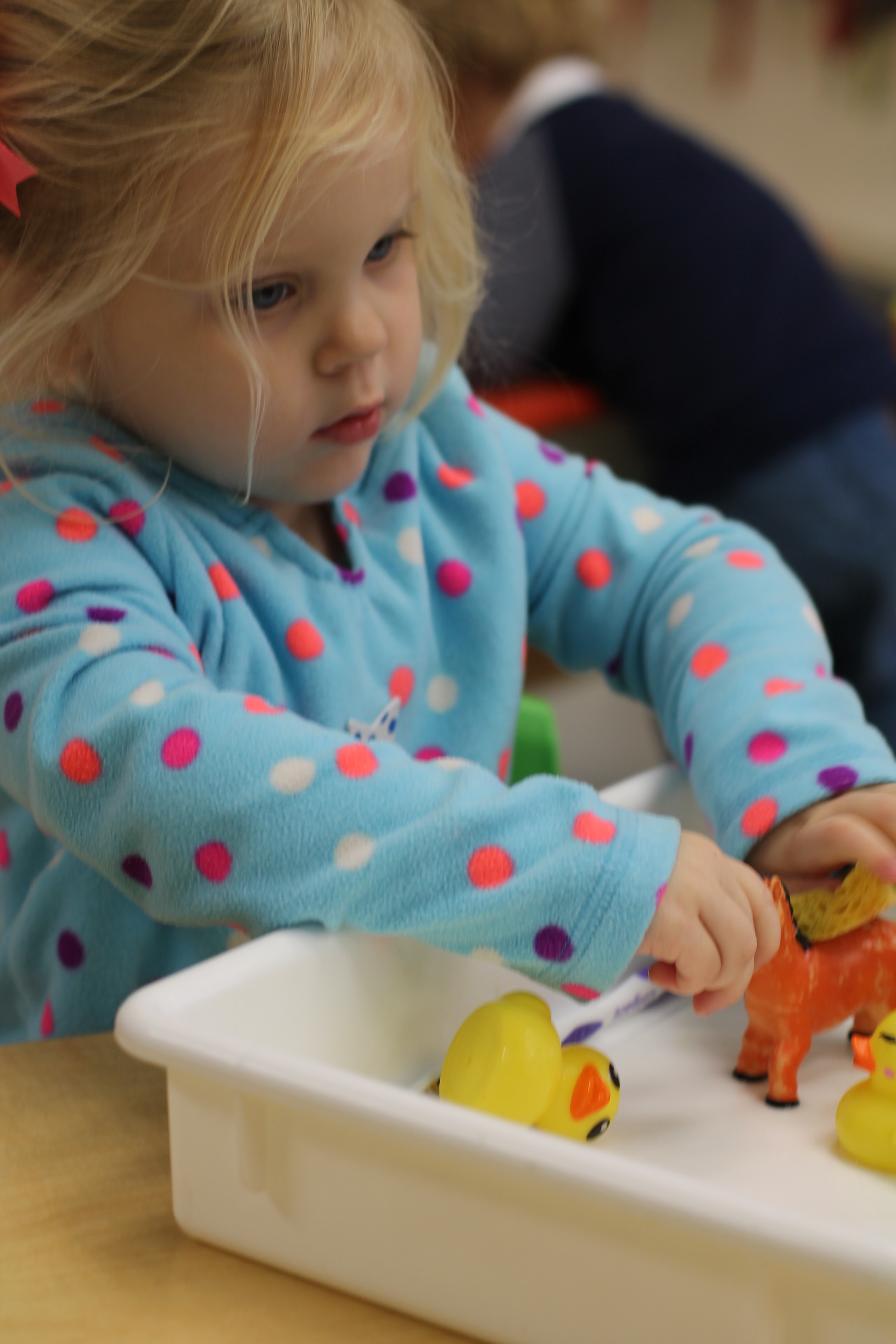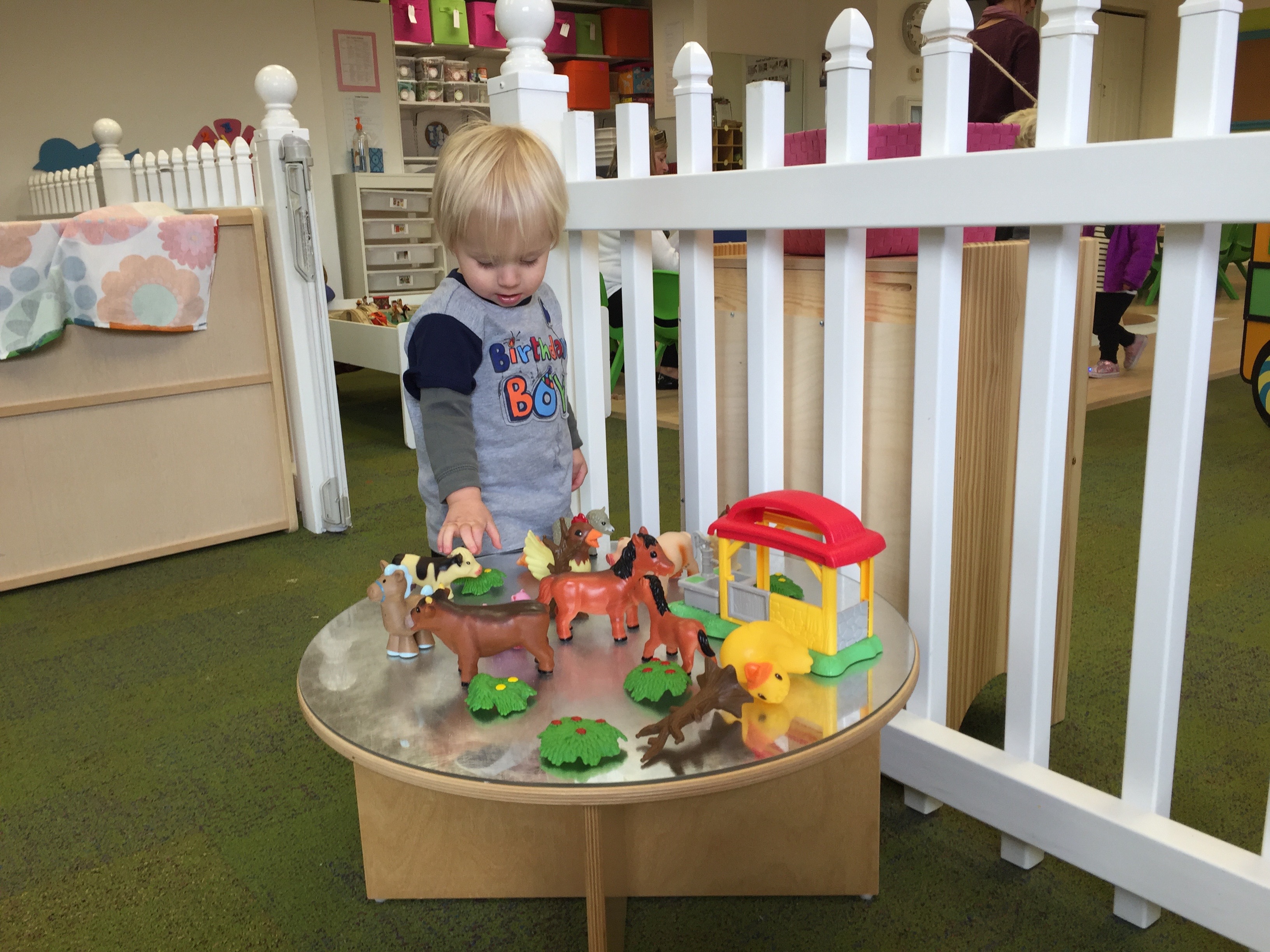 The toddlers utilized the farm theme to reinforce shape, color, counting, fine motor, and vocabulary skills.  We sang Old McDonald and read The Big Red Barn.  Our learning environment this month includes farm puzzles, toys, animals, and even a farmer’s market for pretend play.