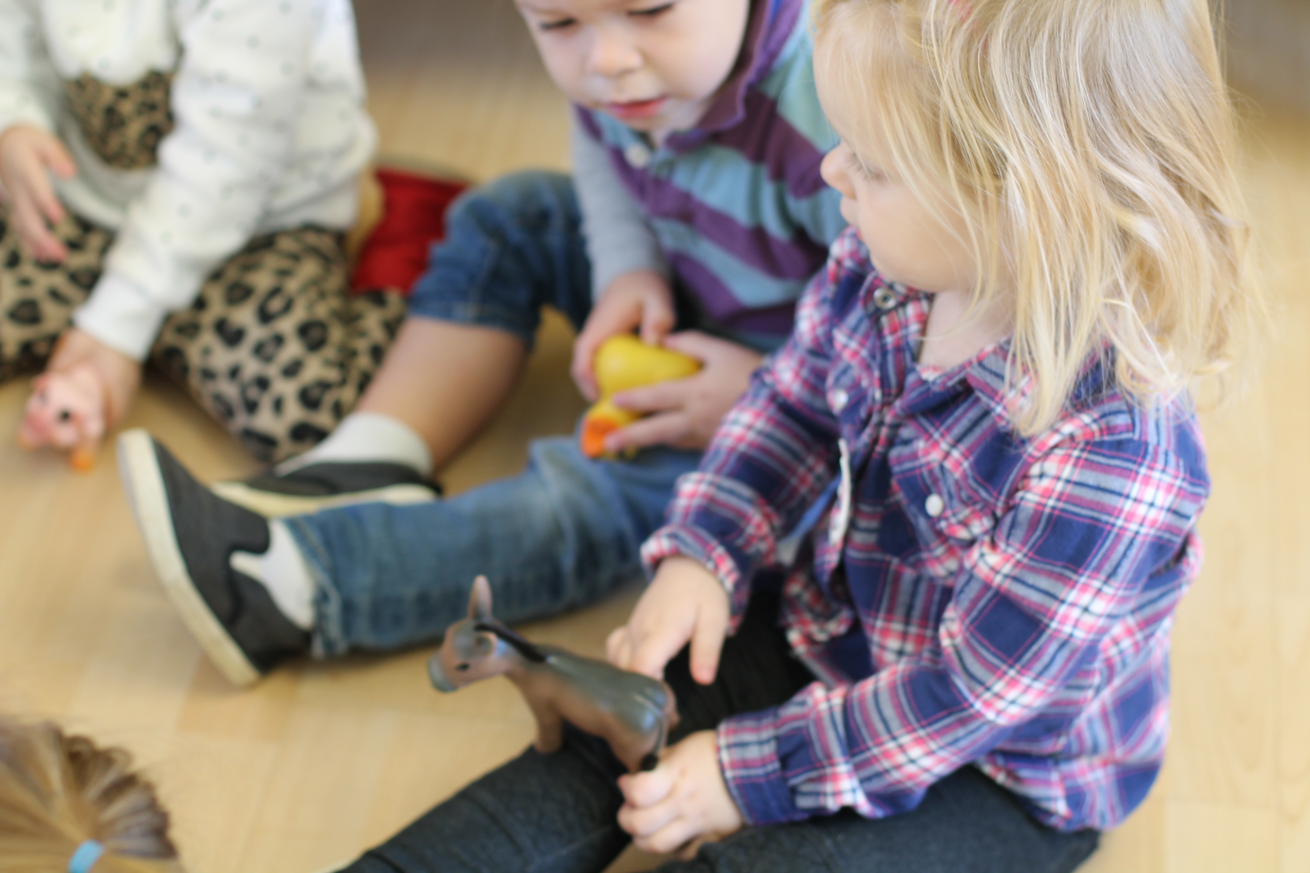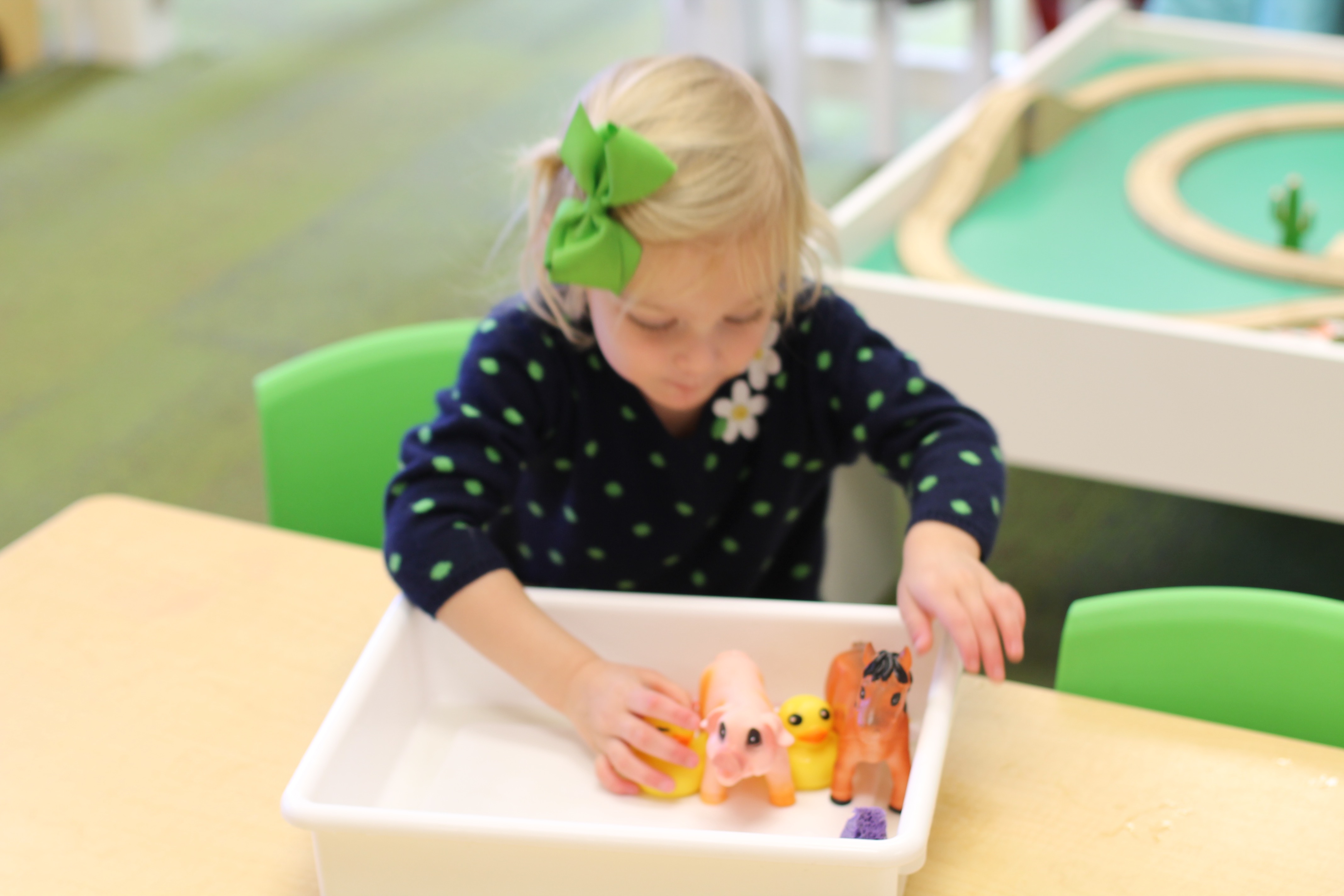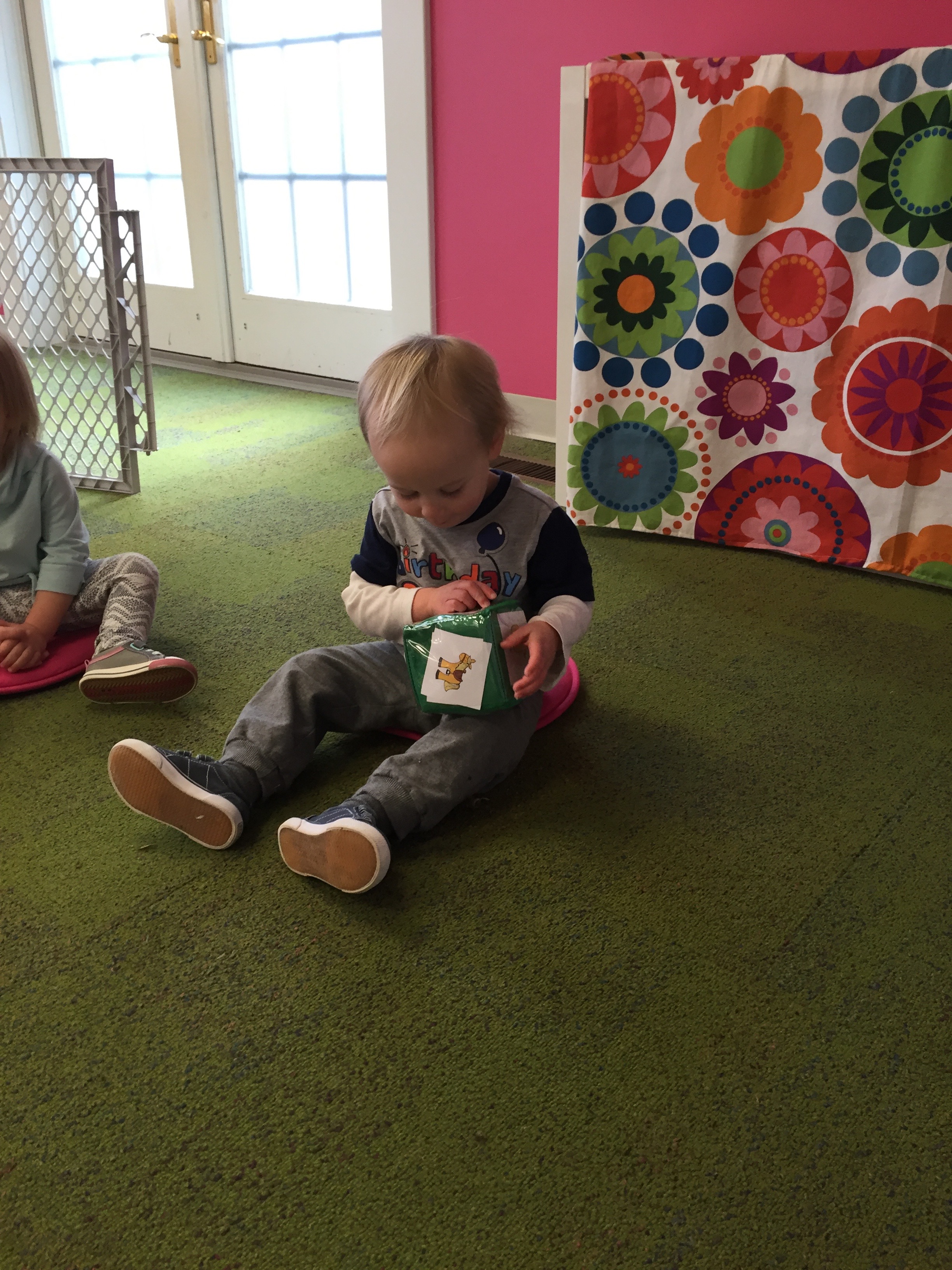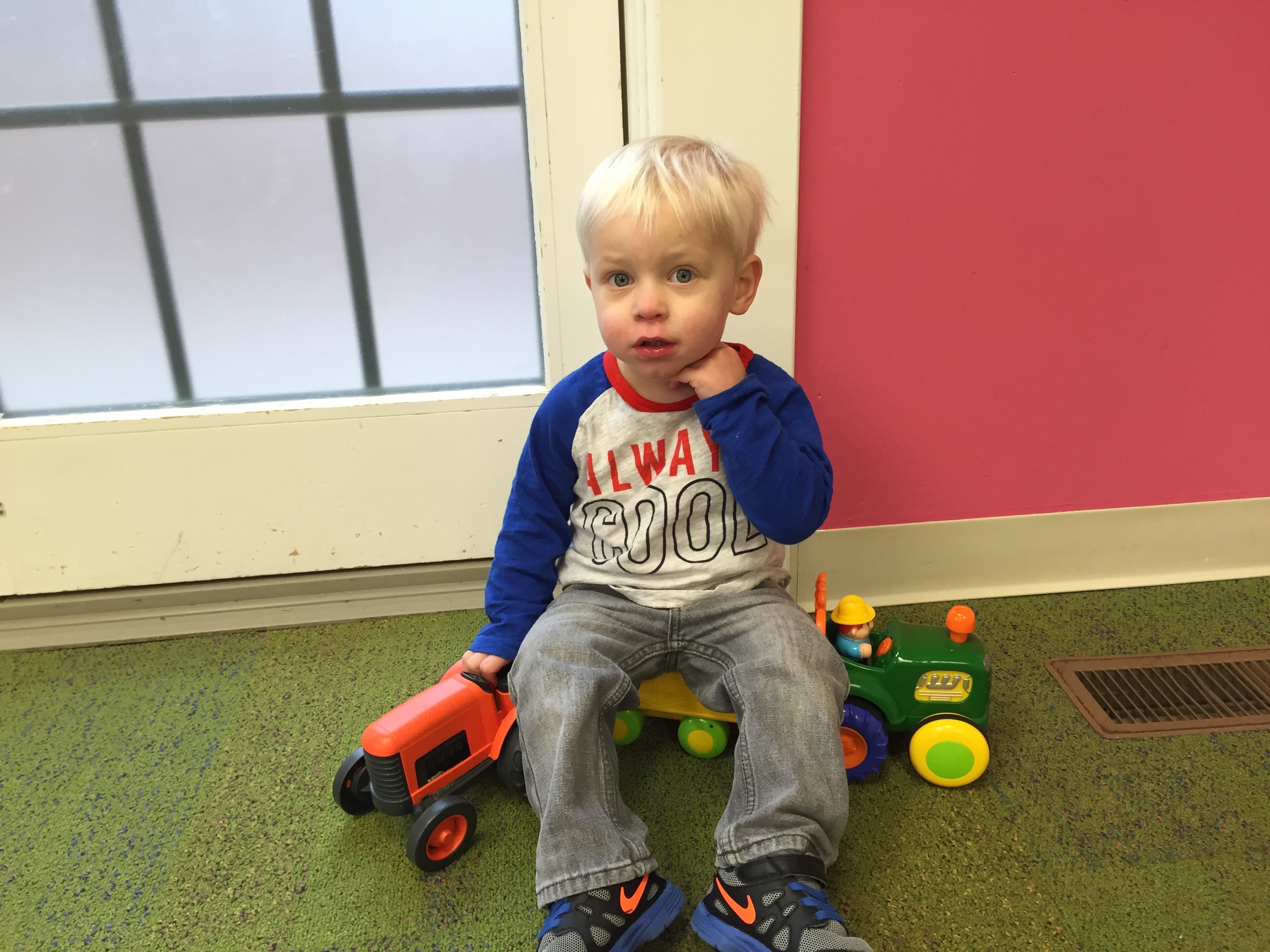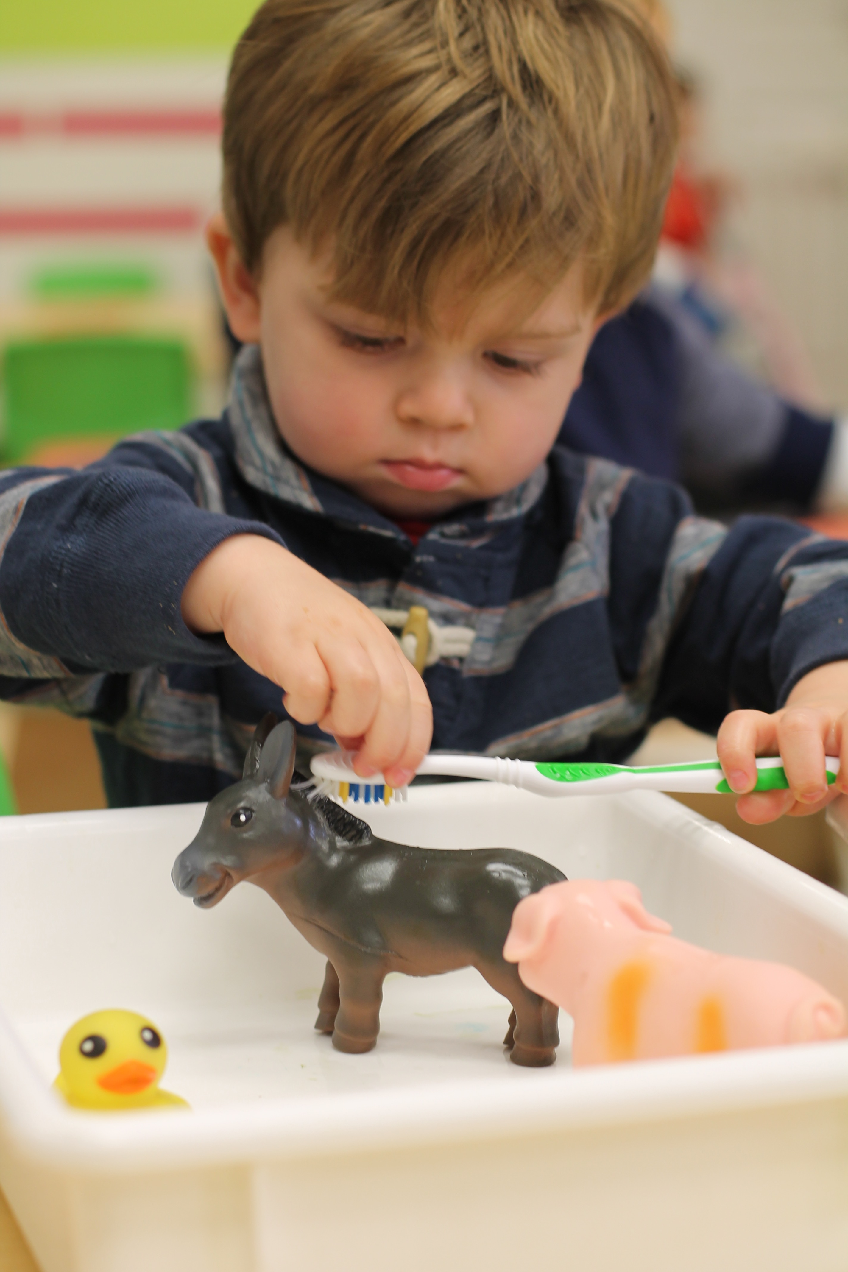 The toddlers utilized the farm theme to reinforce shape, color, counting, fine motor, and vocabulary skills.  We sang Old McDonald and read The Big Red Barn.  Our learning environment this month includes farm puzzles, toys, animals, and even a farmer’s market for pretend play.