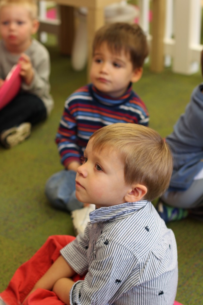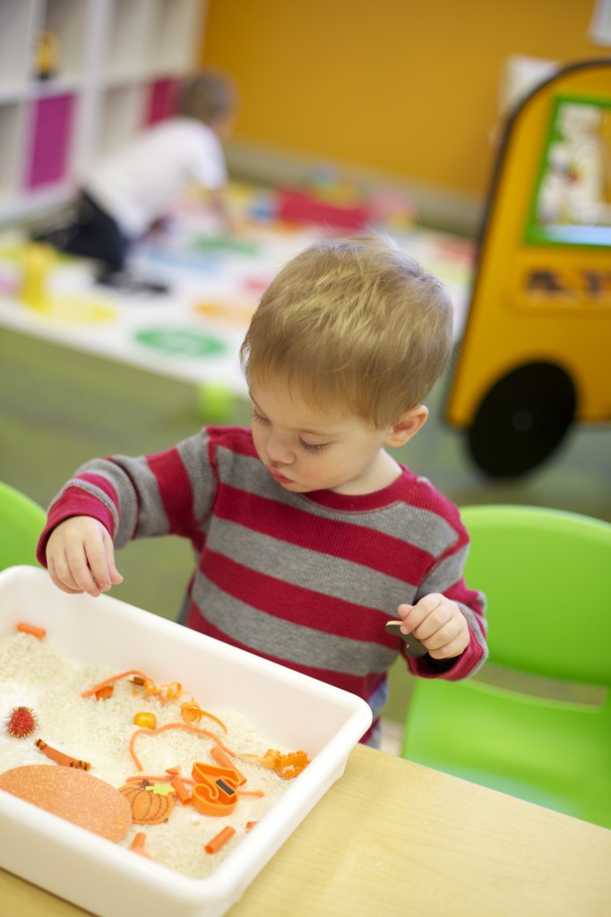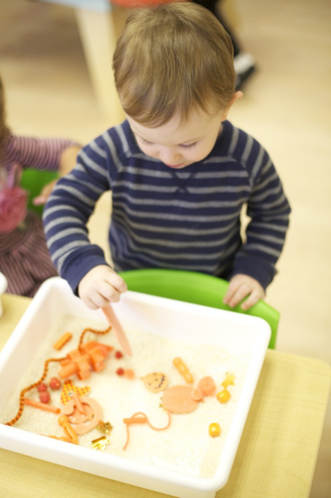 Baking in the toddler classroom is a fun way to learn through our senses.  We made simple pumpkin muffins with mini chocolate chips.  The toddlers used their eyes and noses to experience the orange pumpkin that we added to our batter.  We put together all the ingredients to a big plastic bag and took turns “mixing”.  Each child took a turn scooping a teaspoon of mini chocolate chips.  The result:  yummy pumpkin muffins for snack!