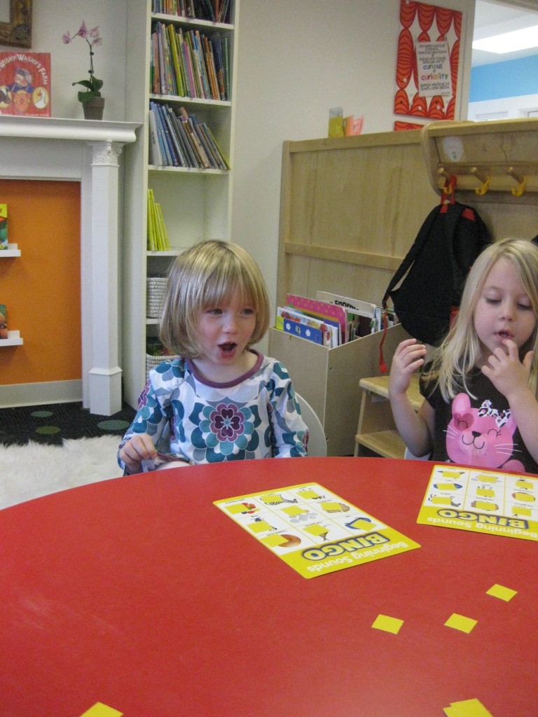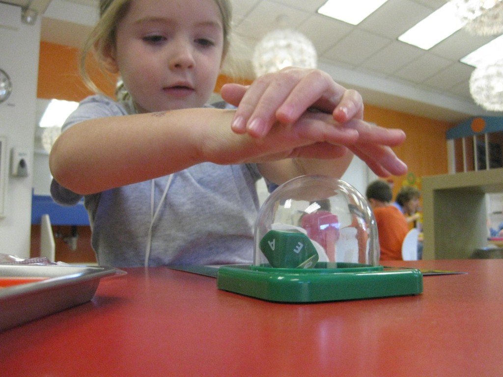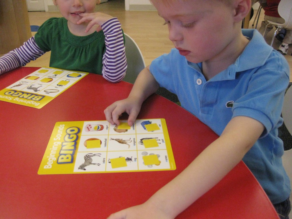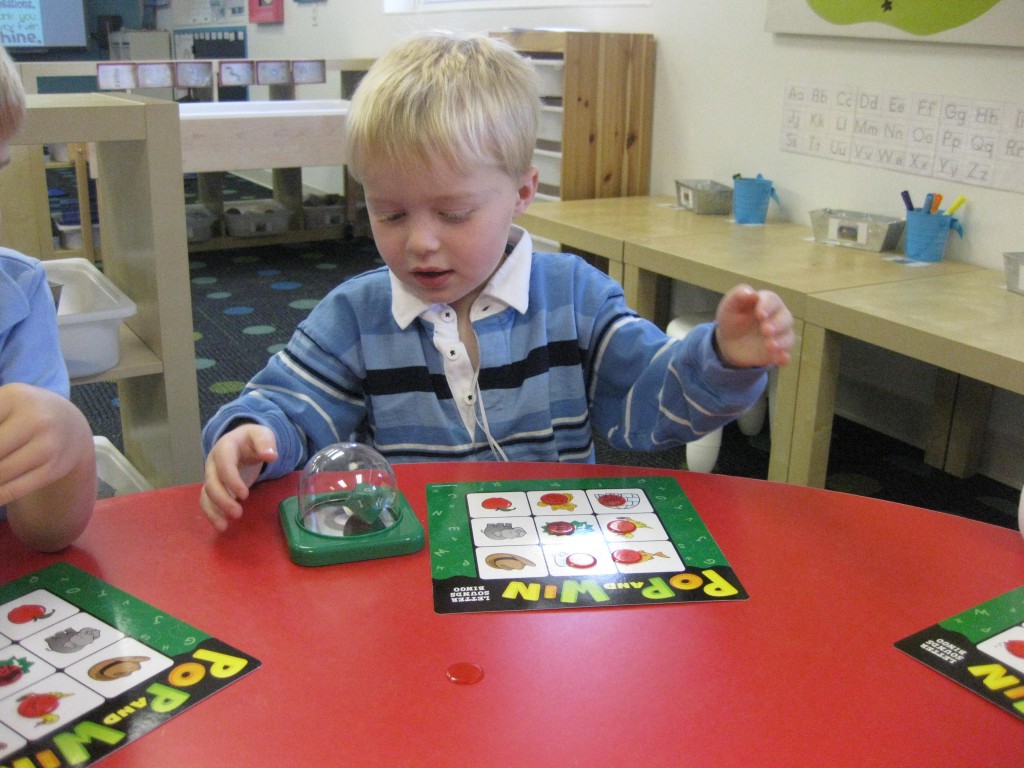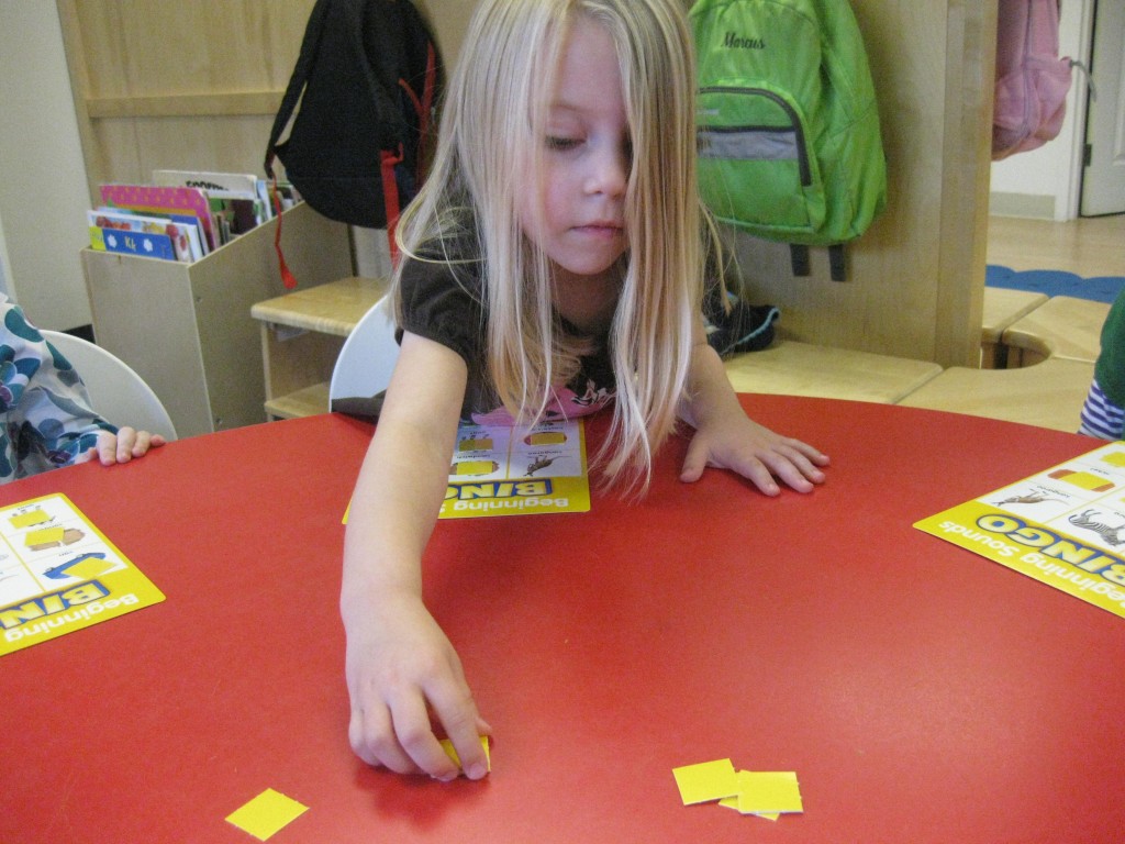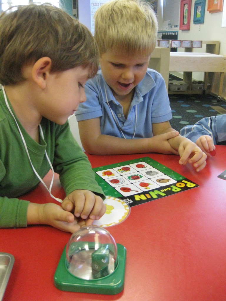 We focused on beginning sounds during our phonics study today. We popped a sound and found a picture that started with that sound. First person to cover the board was the winner!