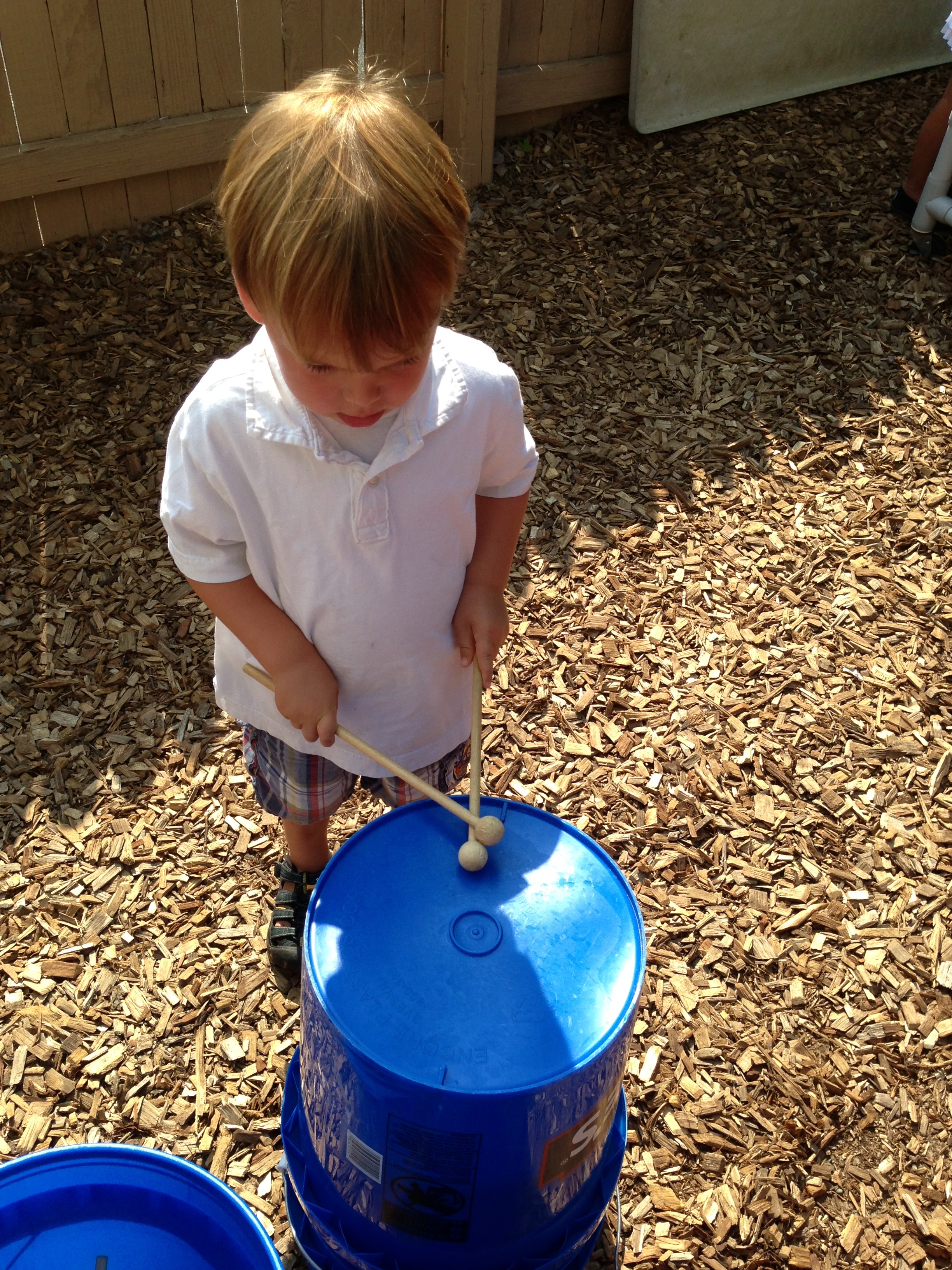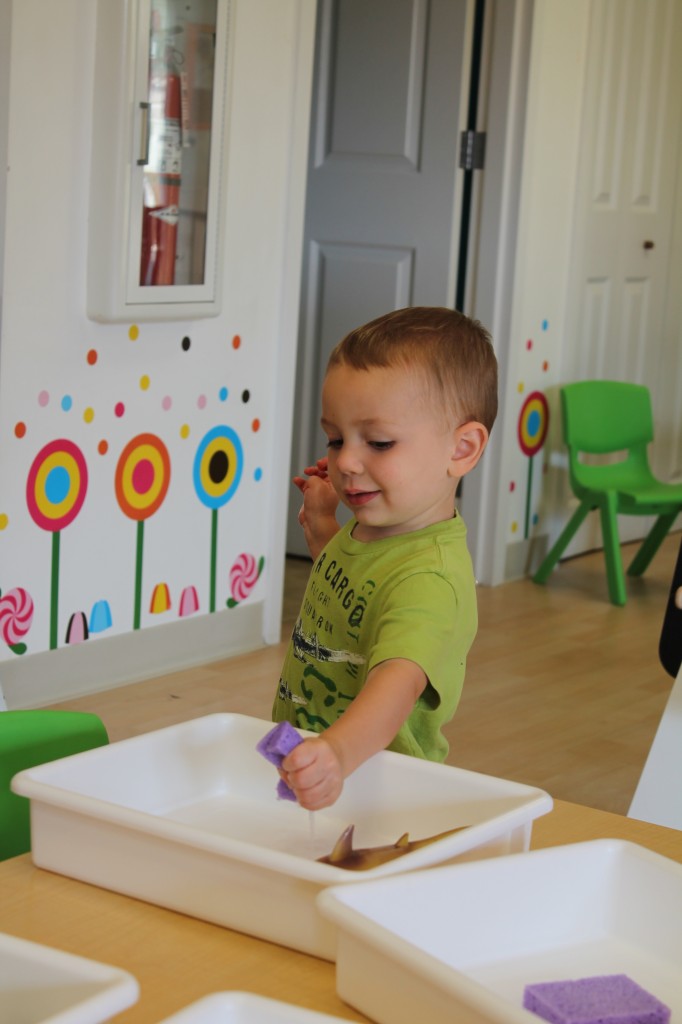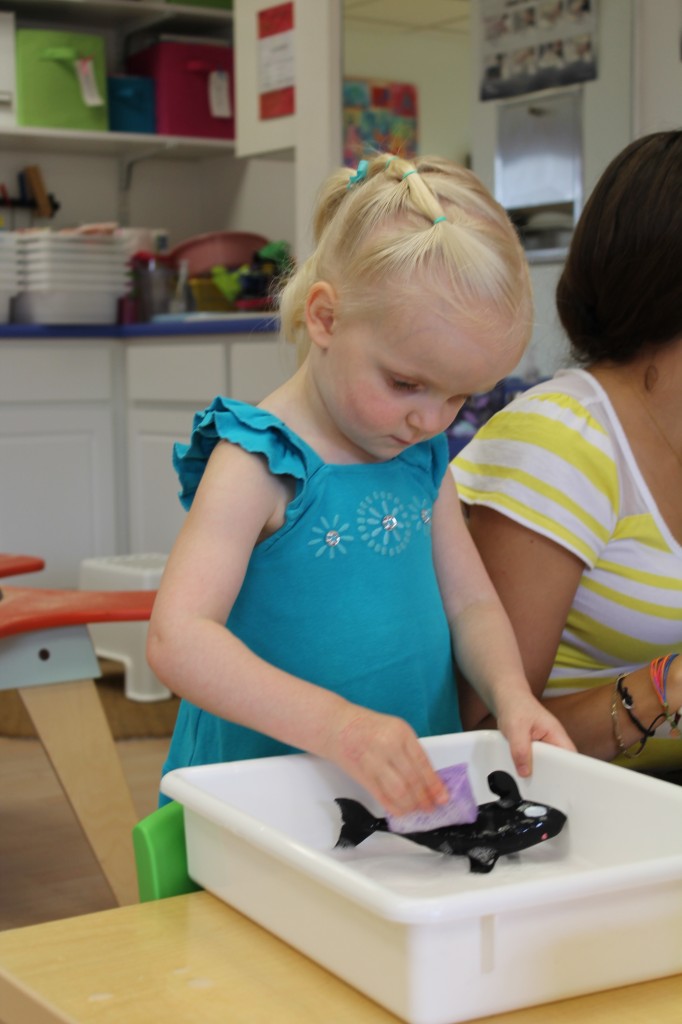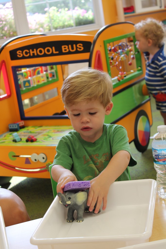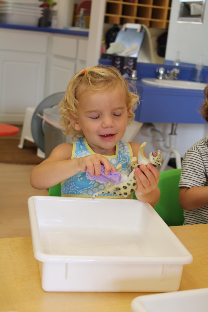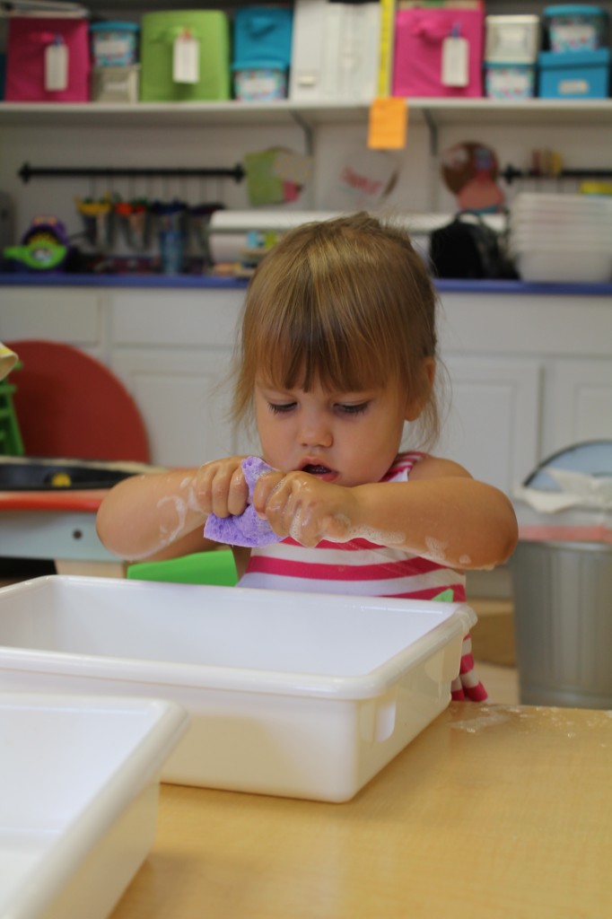 Warm weather means more fun on the playground. Ms. Cally fills the outdoor sensory tub with all kinds of fun for exploring and discovering. This week she microwaved bars of ivory soap to make big fluffy clouds. Then the children had fun experimenting with different shape cutters and tools. It made our playground smell nice and clean too!