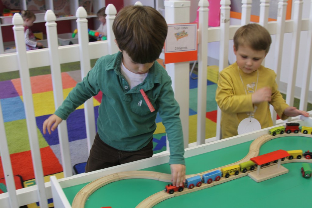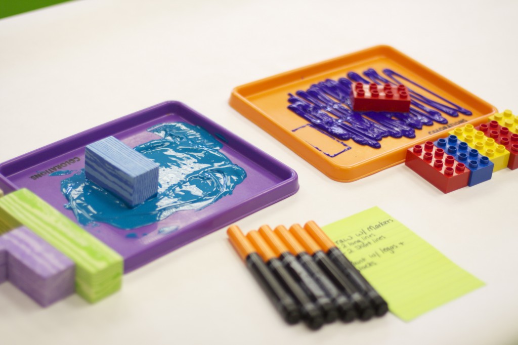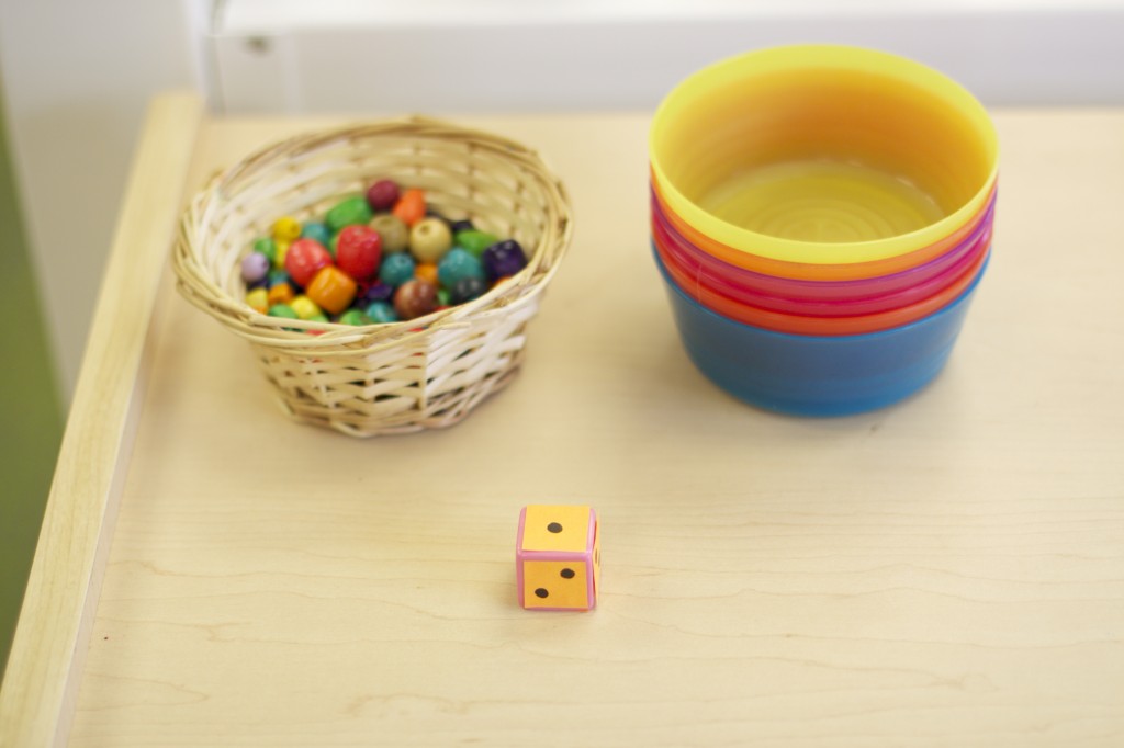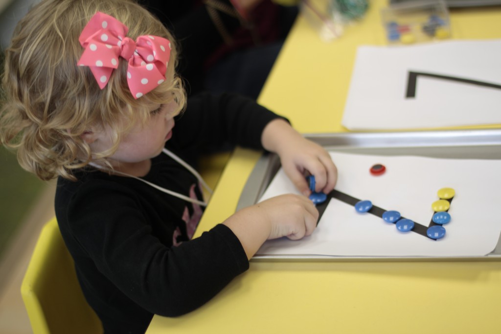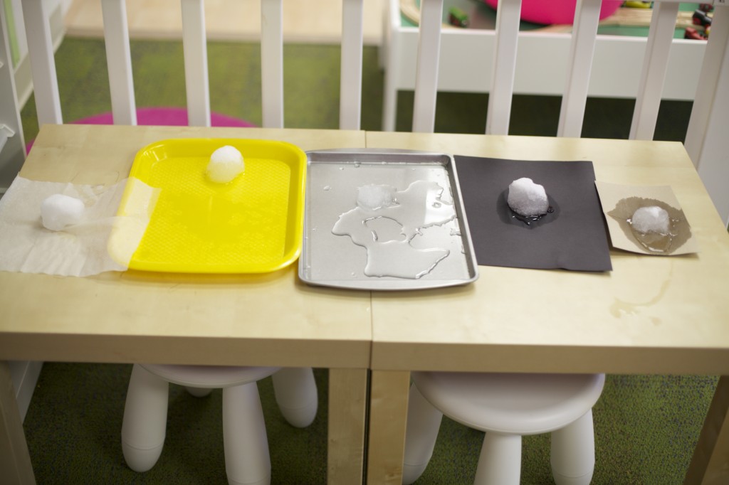 Since we could not go outside to play in the snow, I brought the snow in to the children for a snow science day. I laid out five surfaces to put snowballs on so we could see which one would melt the snowball the fastest. I put out a piece of cardboard, a paper towel, a piece of black paper, a plastic tray, and a cookie sheet.