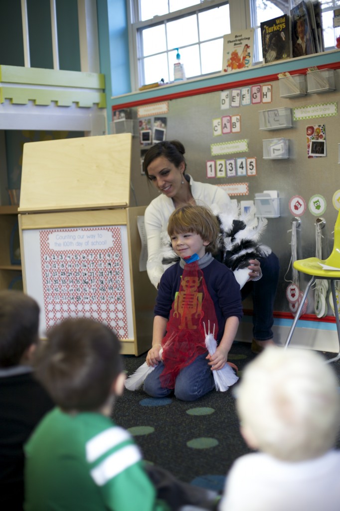 This week we learned about turkeys during our science day! We had a child dress up as a turkey, and we talked about the various parts of the turkey. We taped a red scarf on the child’s chin to represent the “wattle” and talked about how the male turkey changes colors when he is scared, happy, or sick.