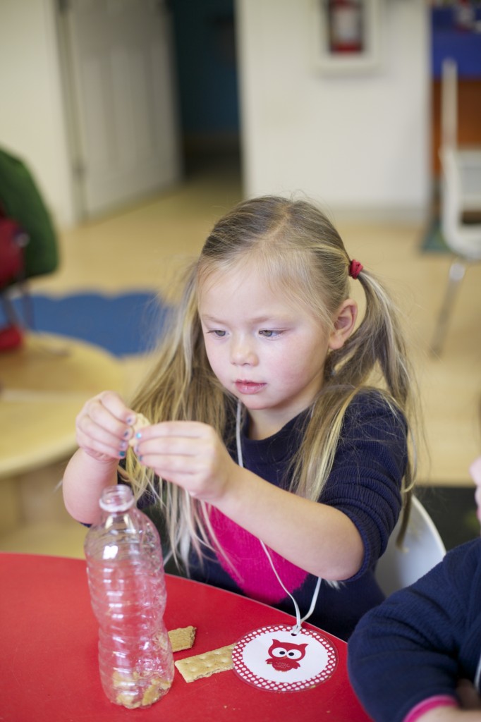 In one of our small groups, we talked about turkeys having 2 stomachs. We used water bottles to represent a turkey’s stomachs. We broke up graham crackers and put berries in the bottle, then poured water into the bottle (pretending it was the “gastric juice” breaking down the food)….