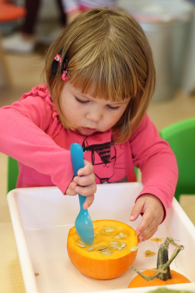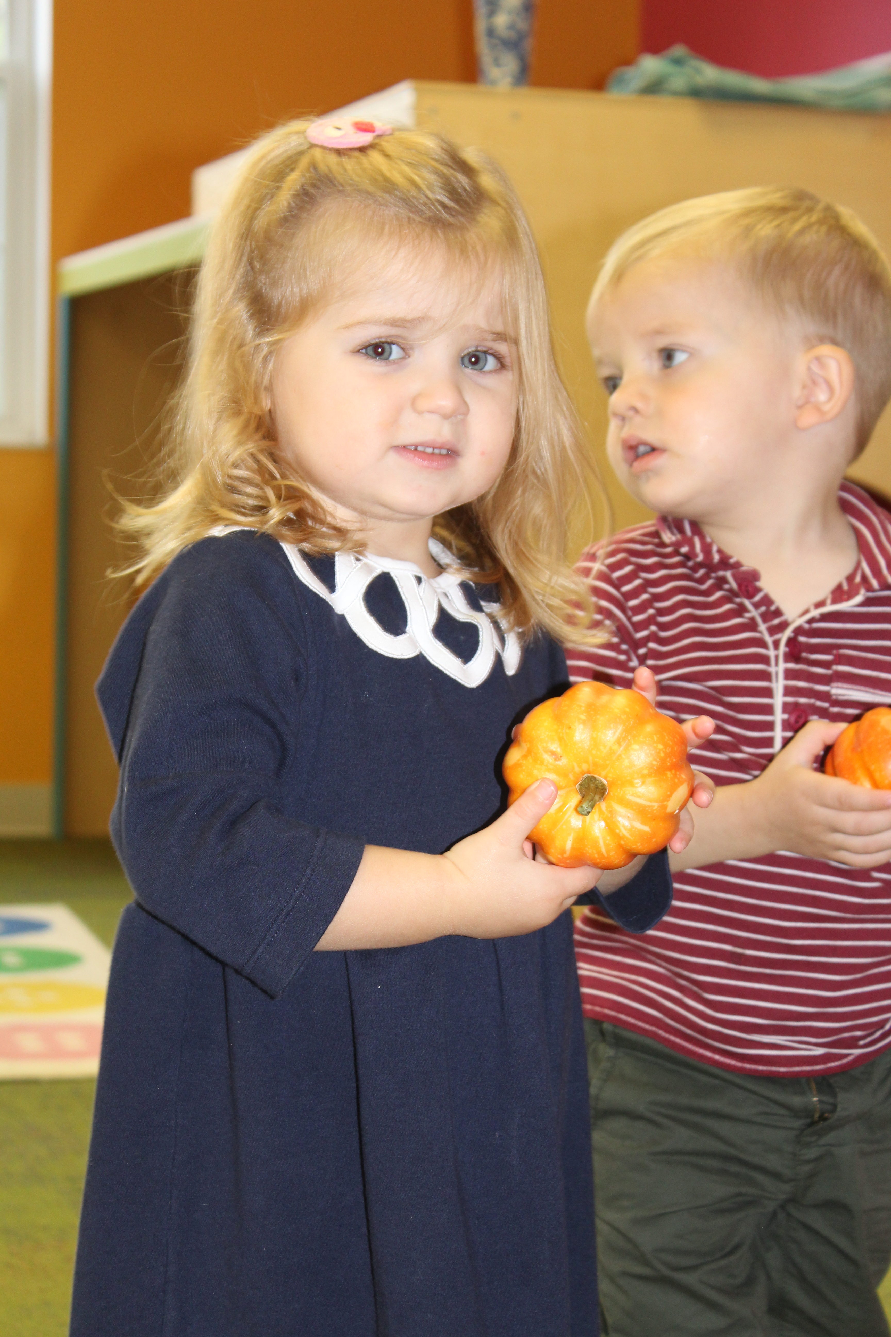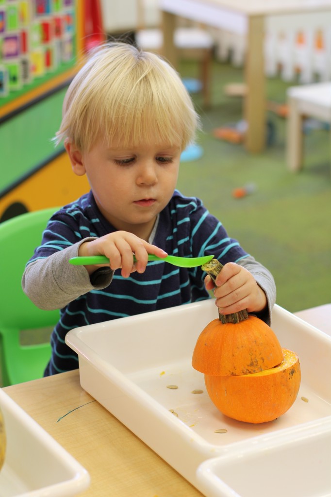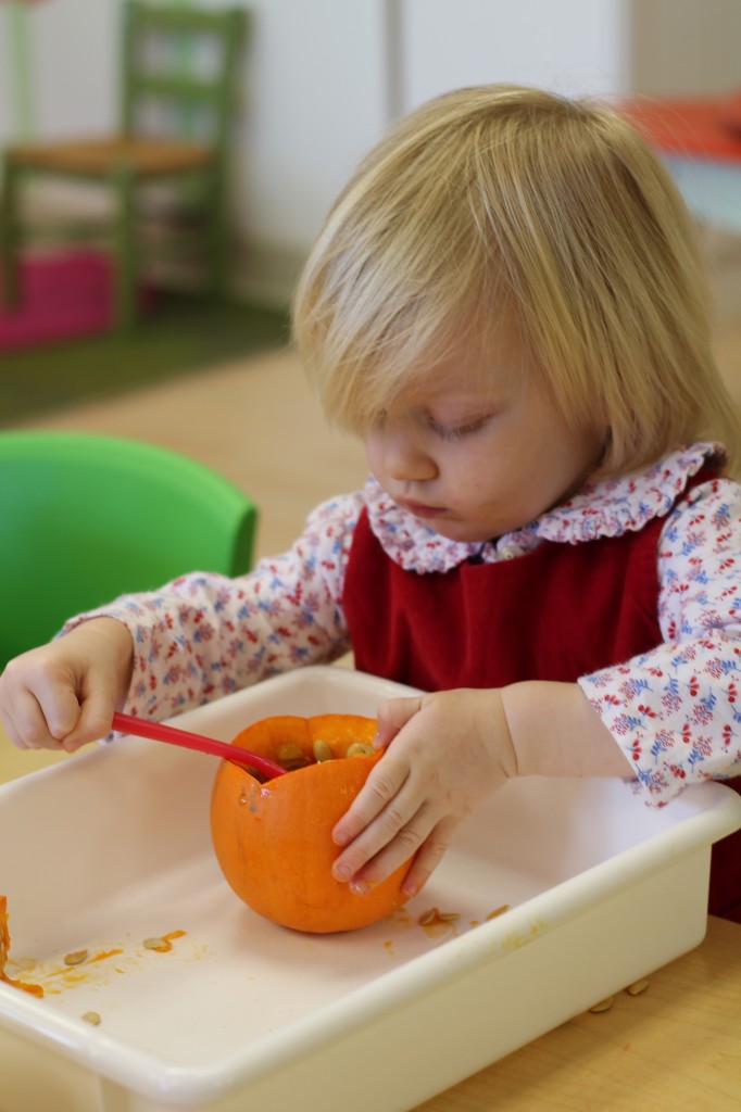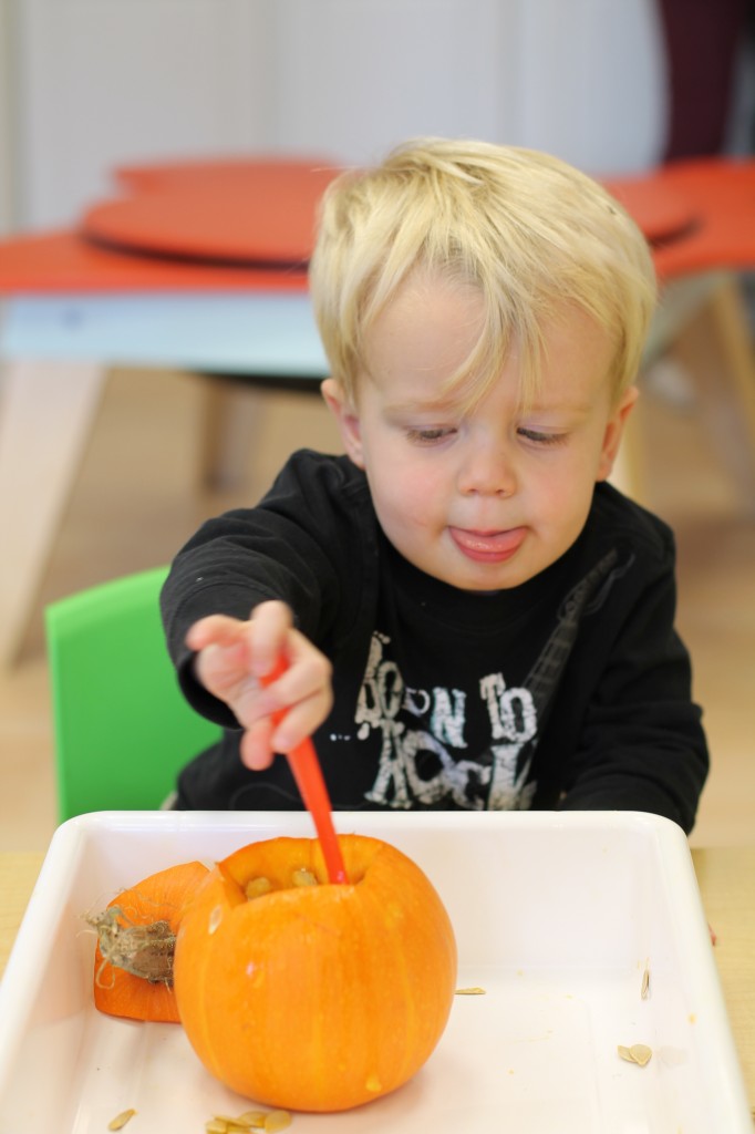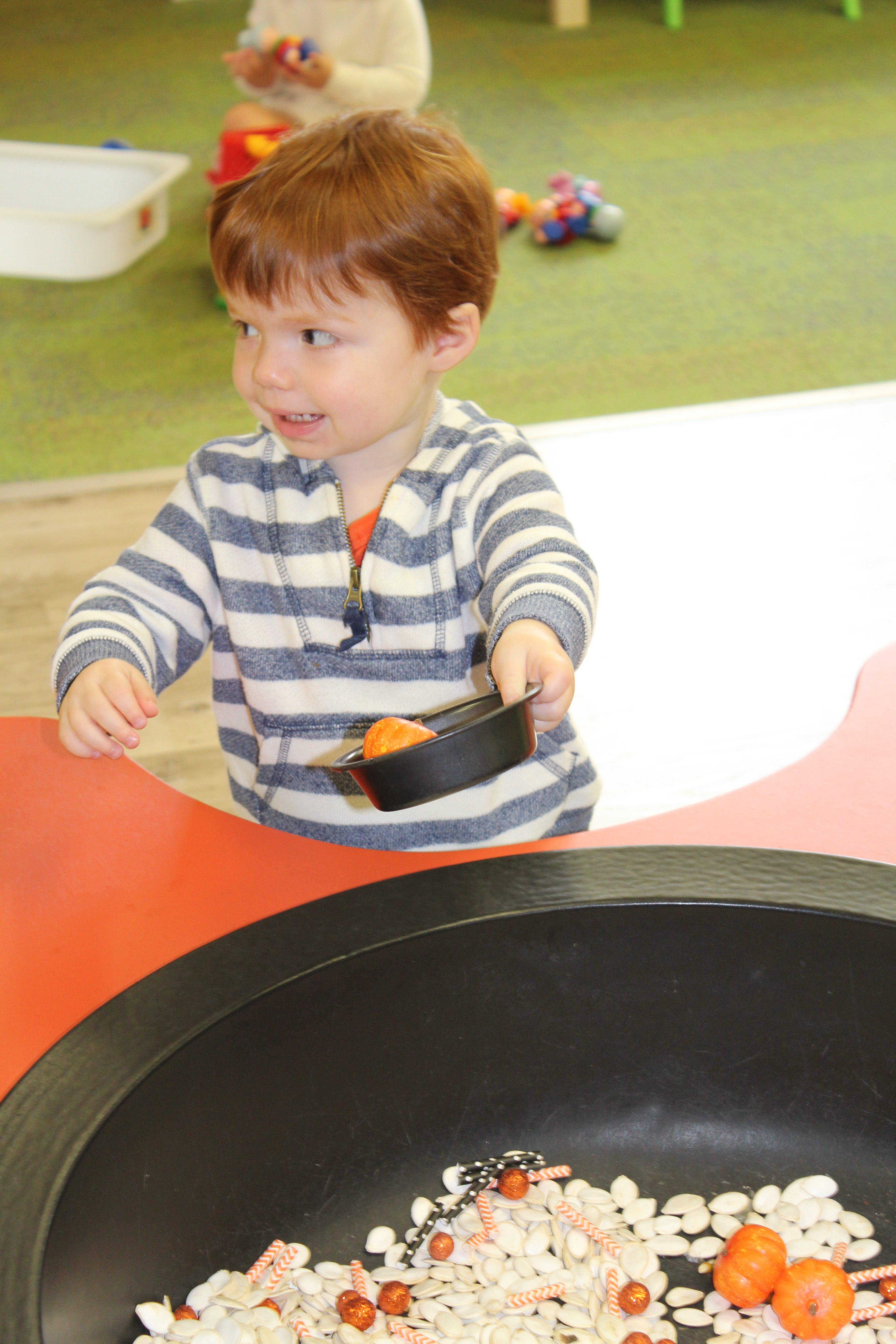 Orange is the focus color for the month of October!  So many fun purposeful play experiences to immerse the toddlers in all things orange.  Pumpkins, paint, playdough, discovery bins, fine motor skills, large motor skills, new vocabulary, songs, games, and more have kept our class busy learning through play.