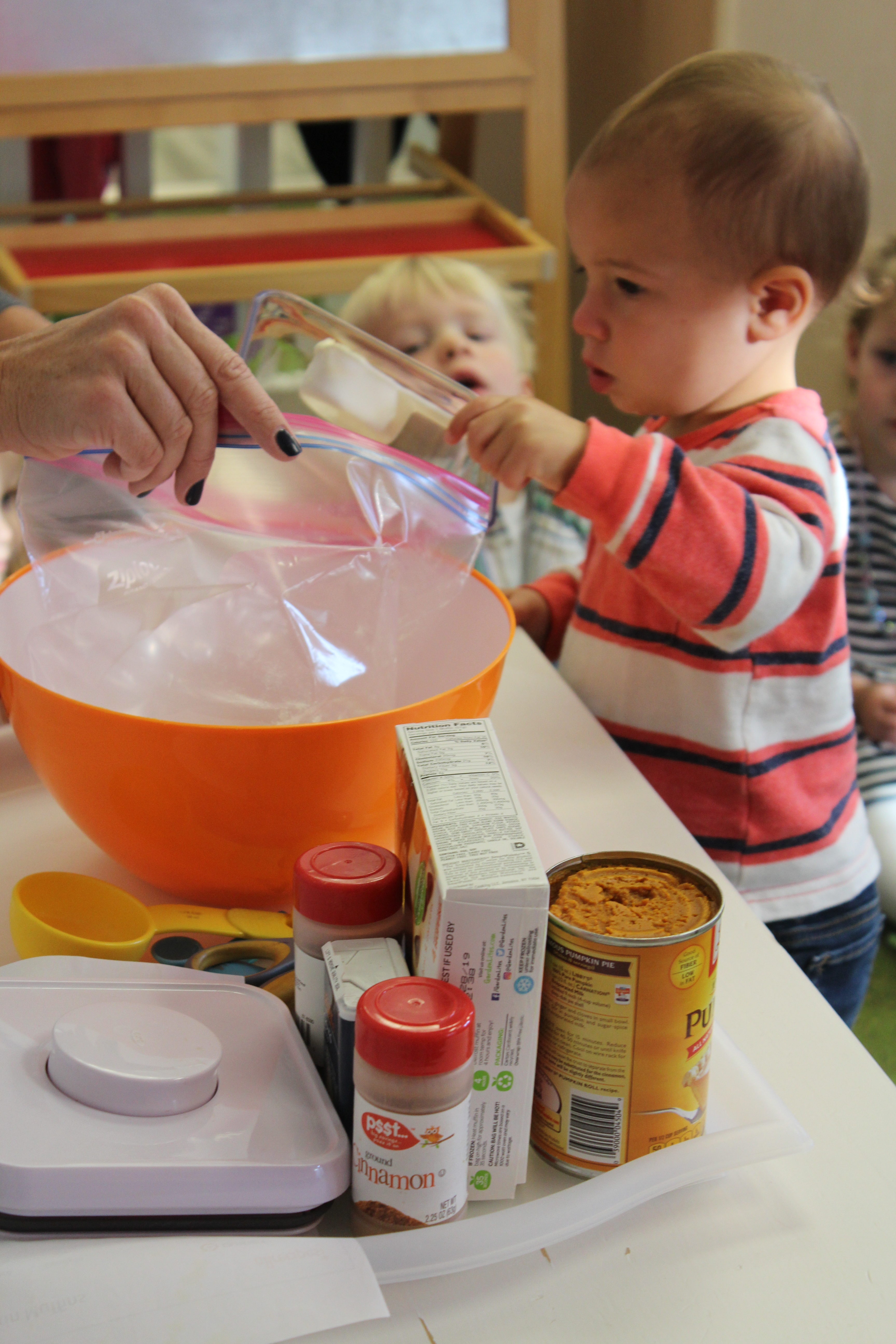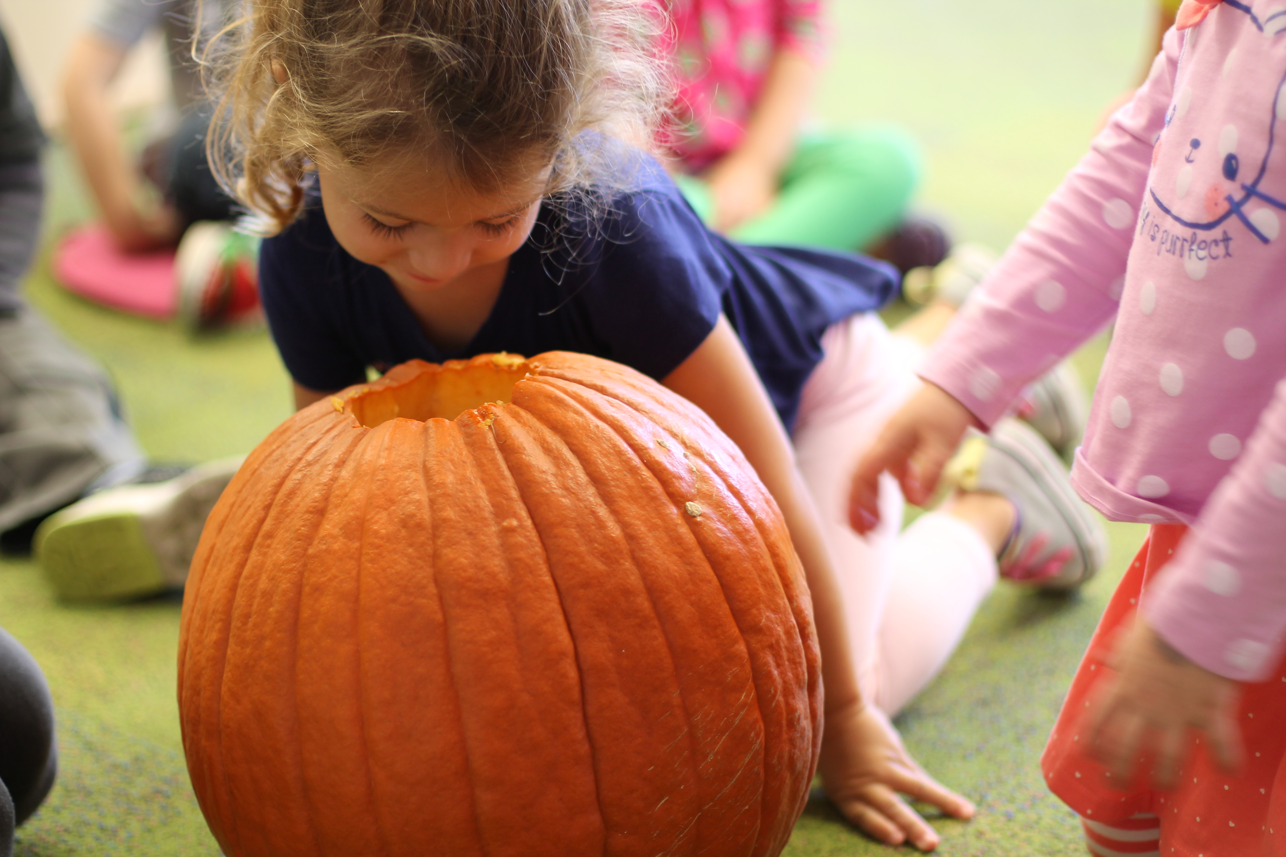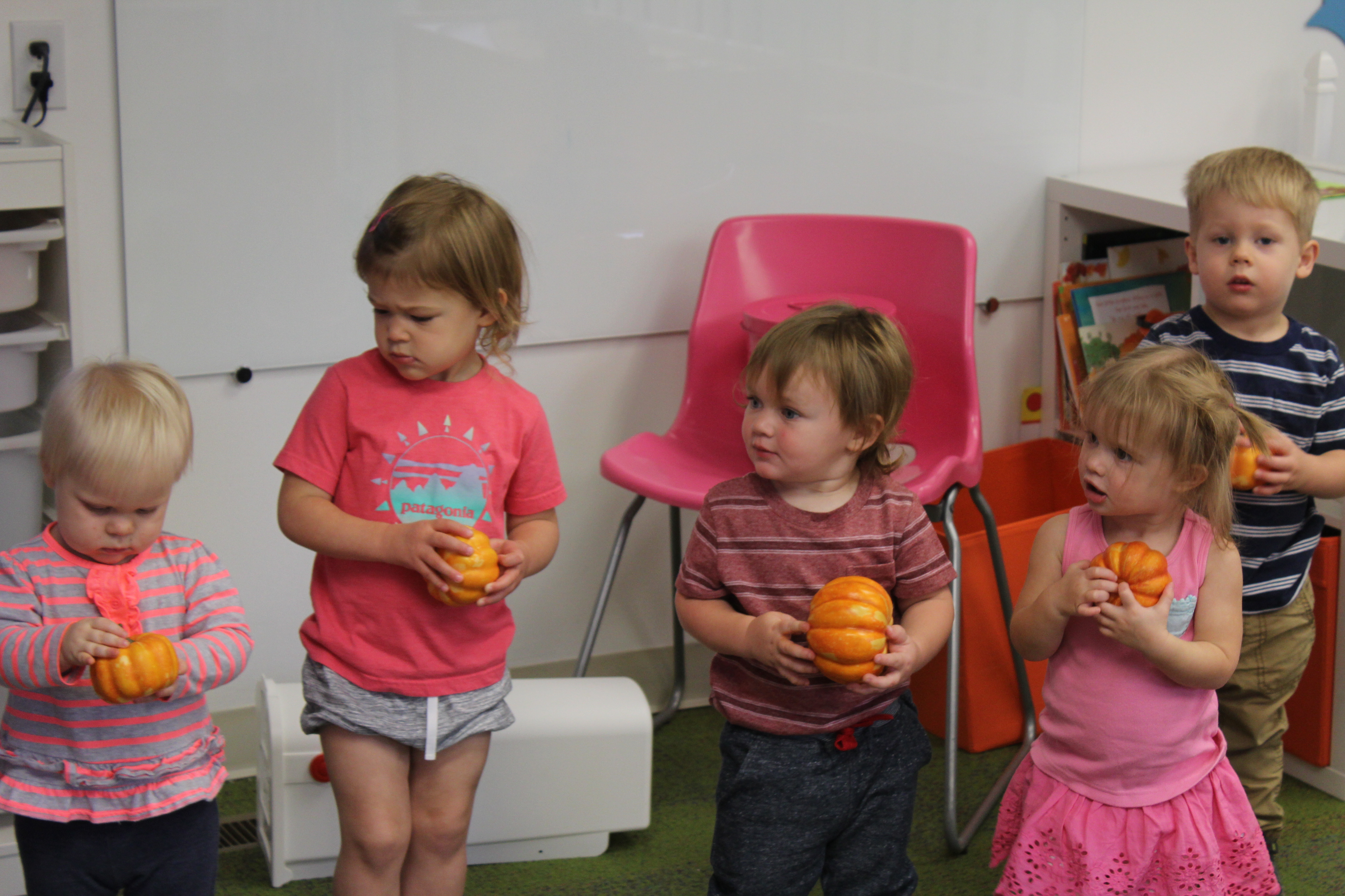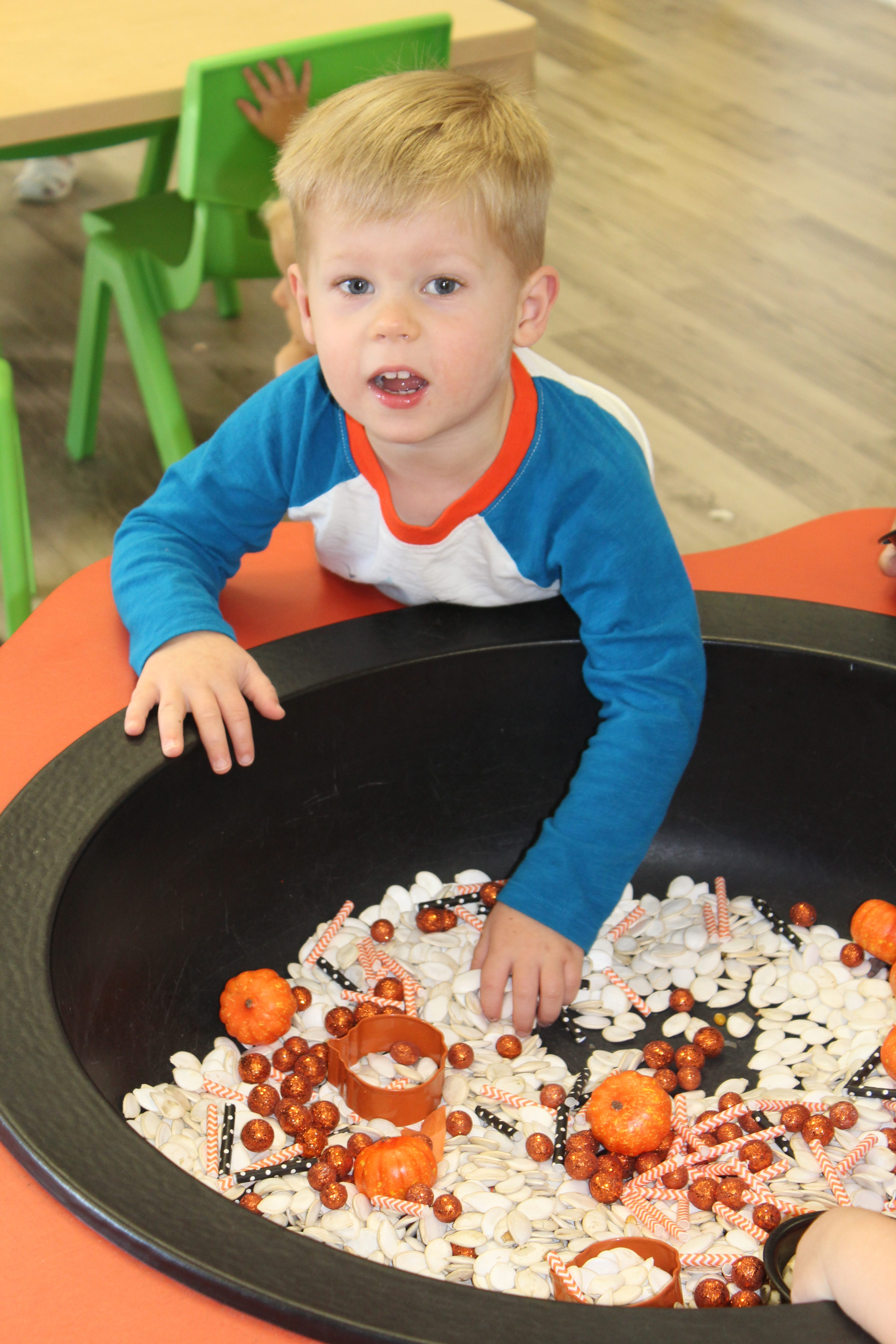 Orange is the focus color for the month of October!  So many fun purposeful play experiences to immerse the toddlers in all things orange.  Pumpkins, paint, playdough, discovery bins, fine motor skills, large motor skills, new vocabulary, songs, games, and more have kept our class busy learning through play.