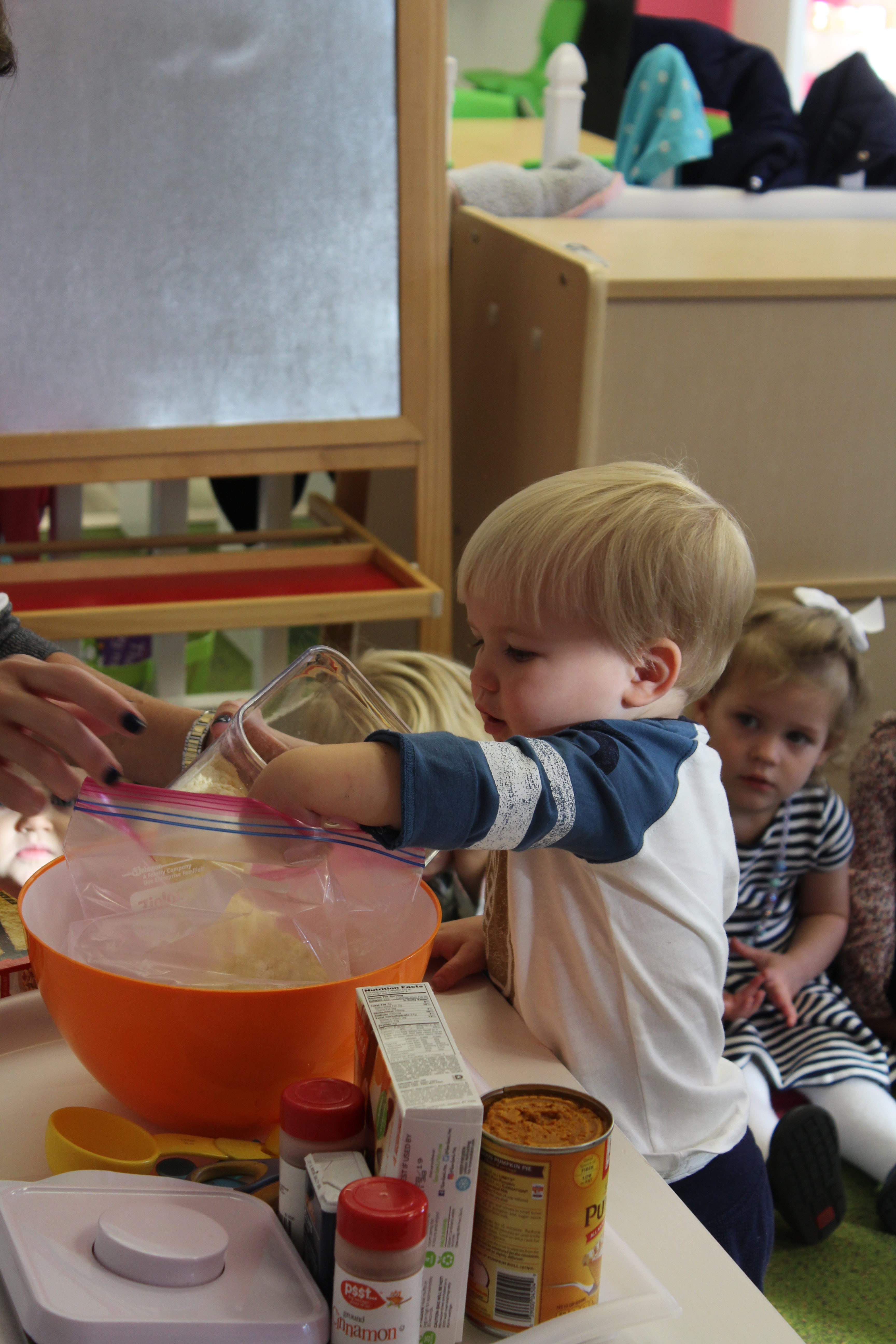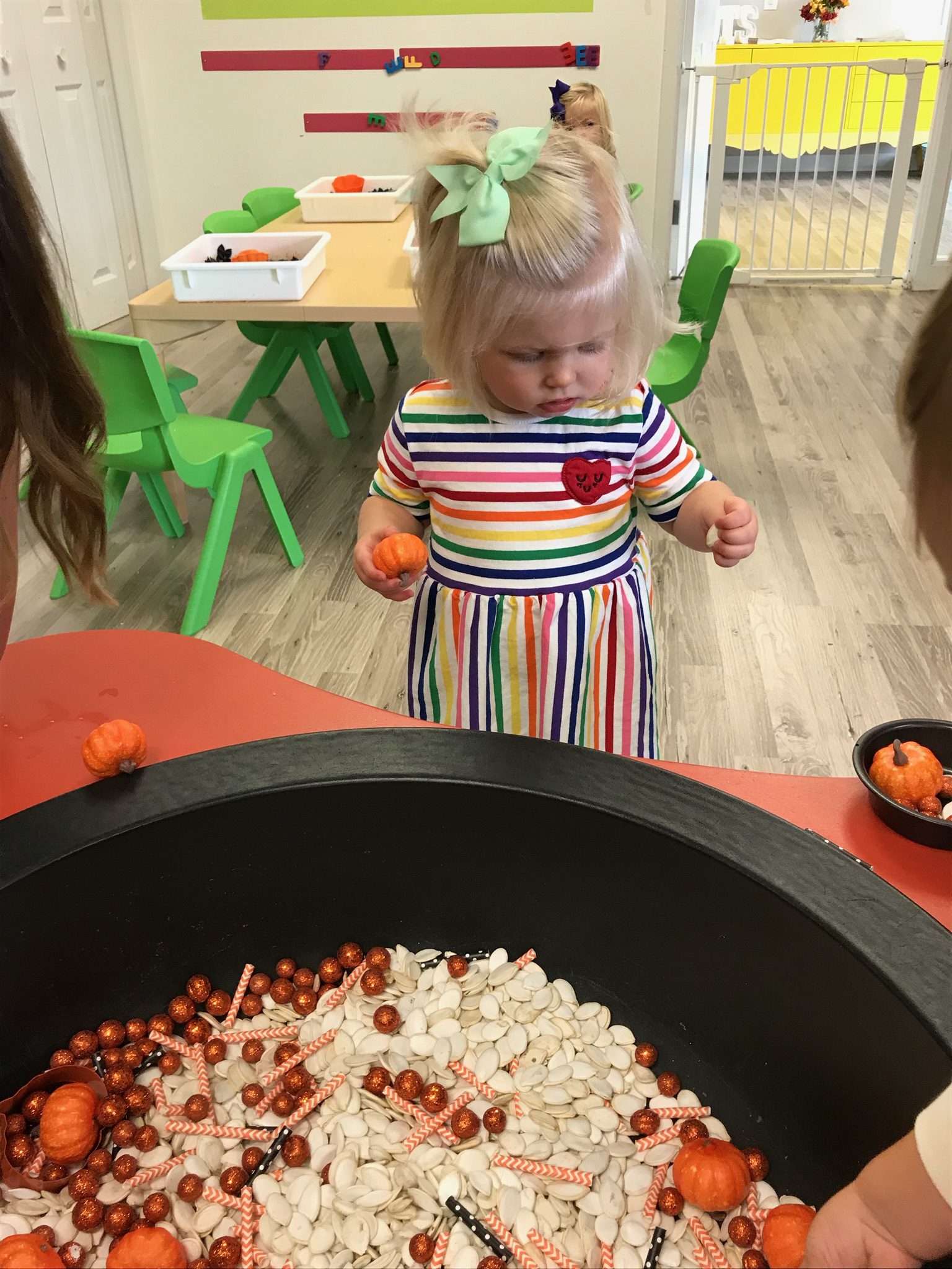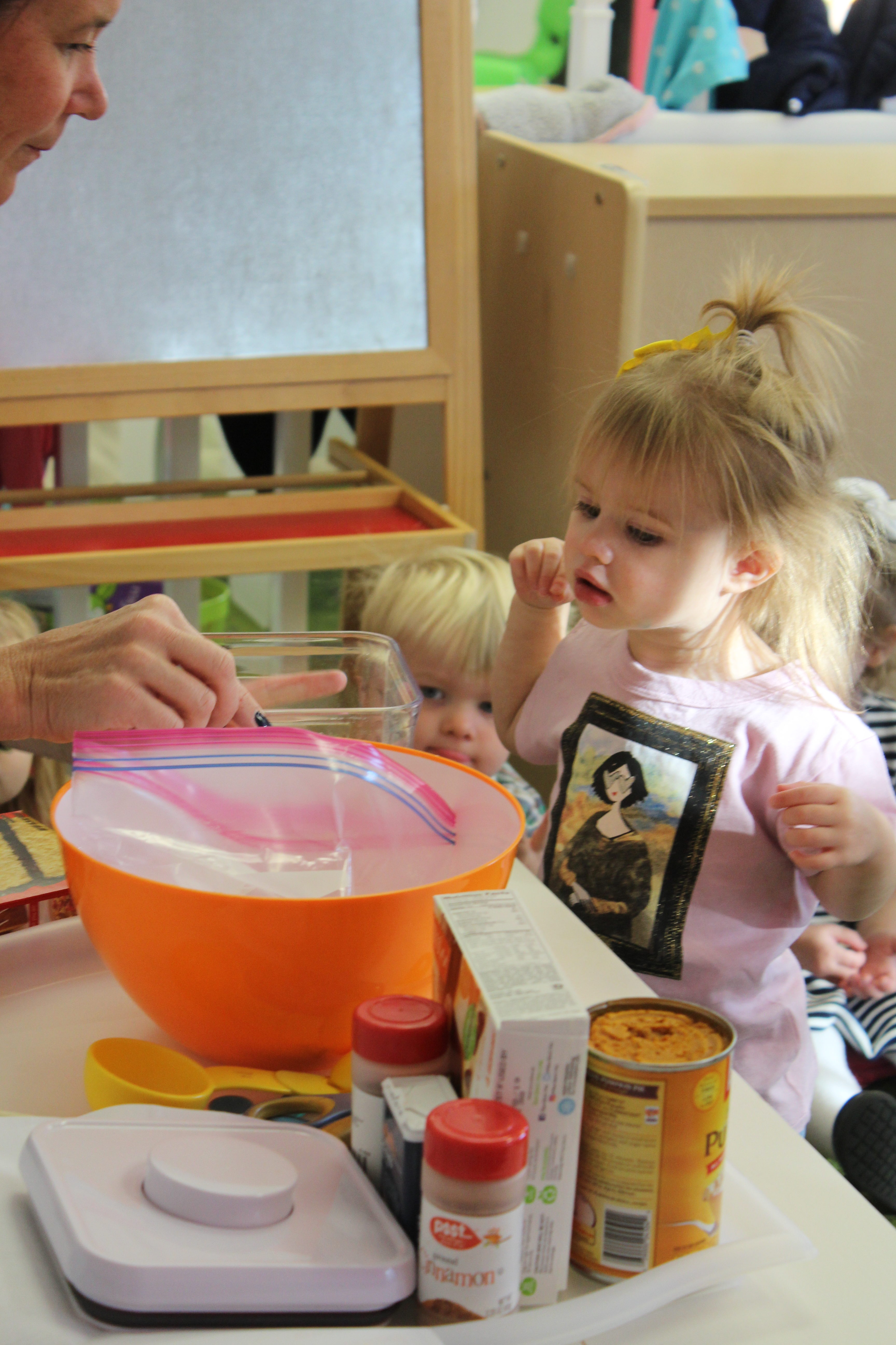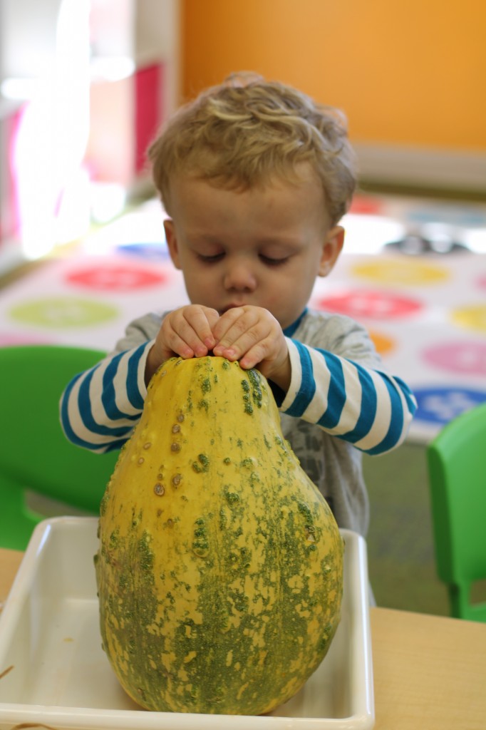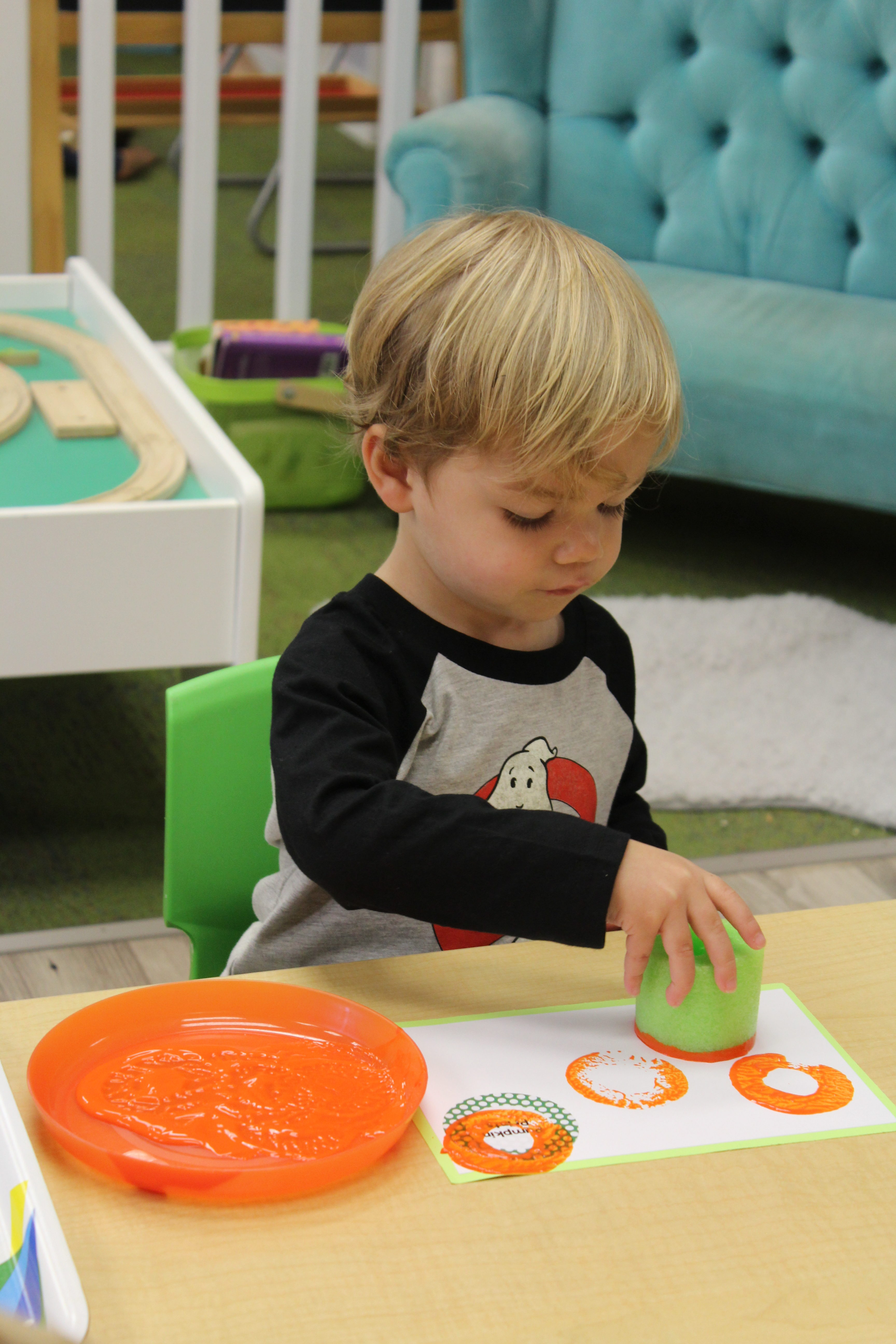 Orange is the focus color for the month of October!  So many fun purposeful play experiences to immerse the toddlers in all things orange.  Pumpkins, paint, playdough, discovery bins, fine motor skills, large motor skills, new vocabulary, songs, games, and more have kept our class busy learning through play.